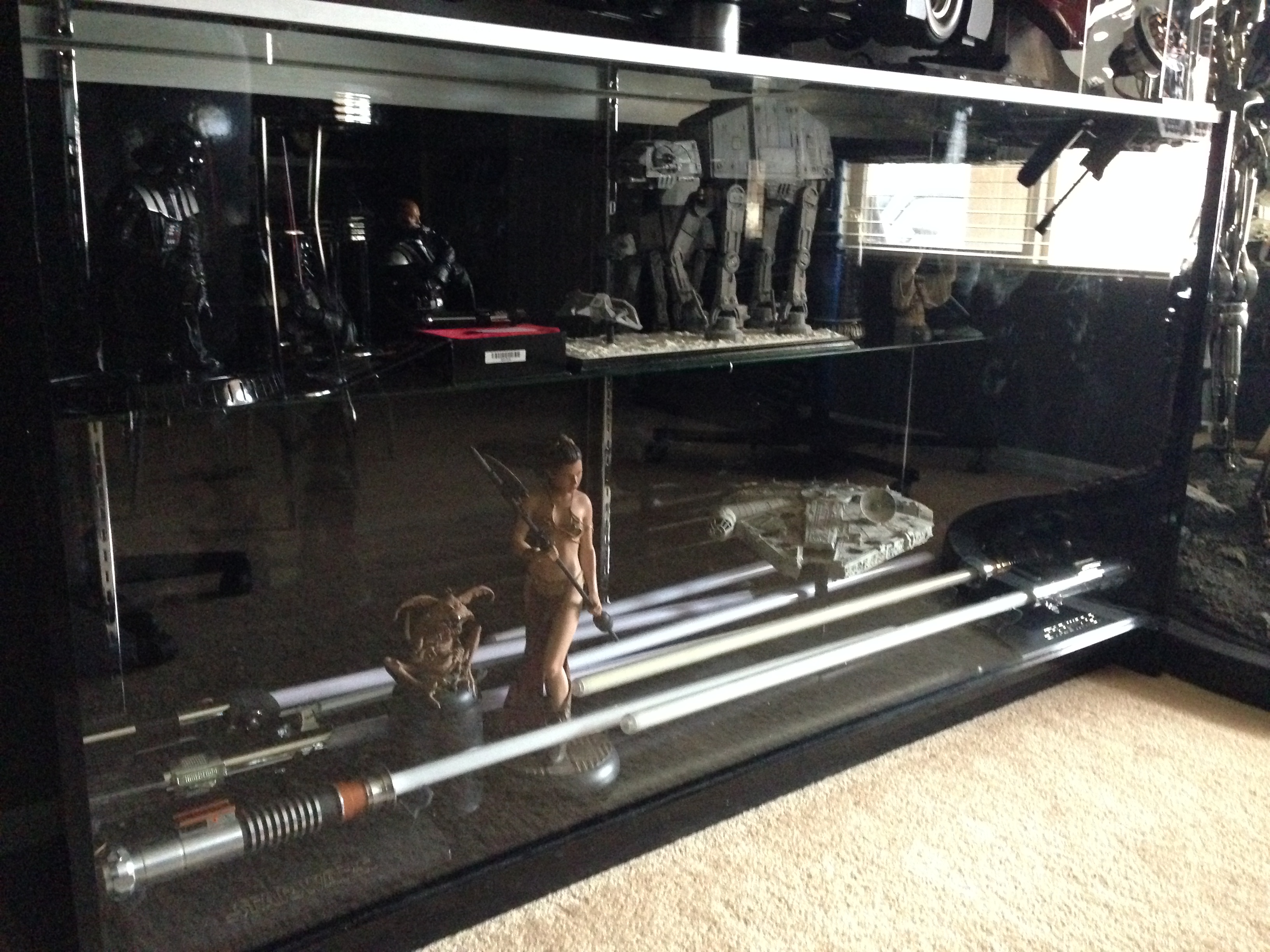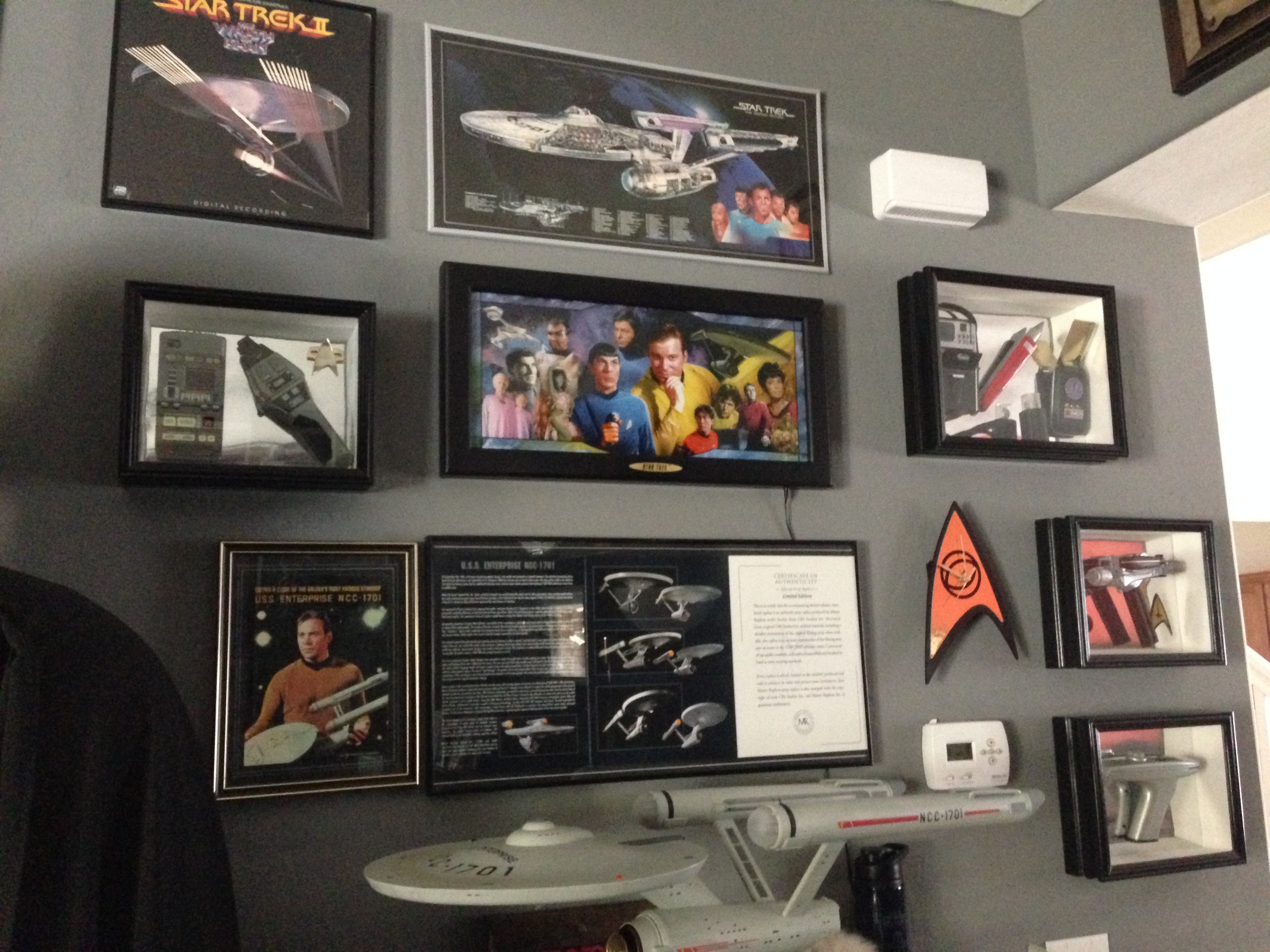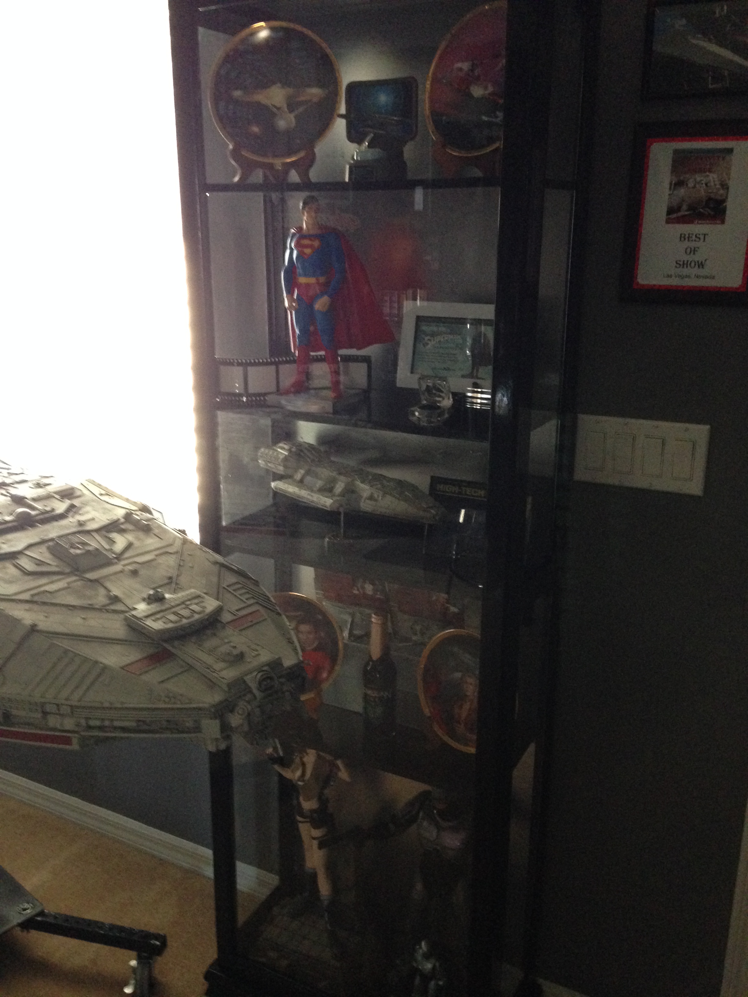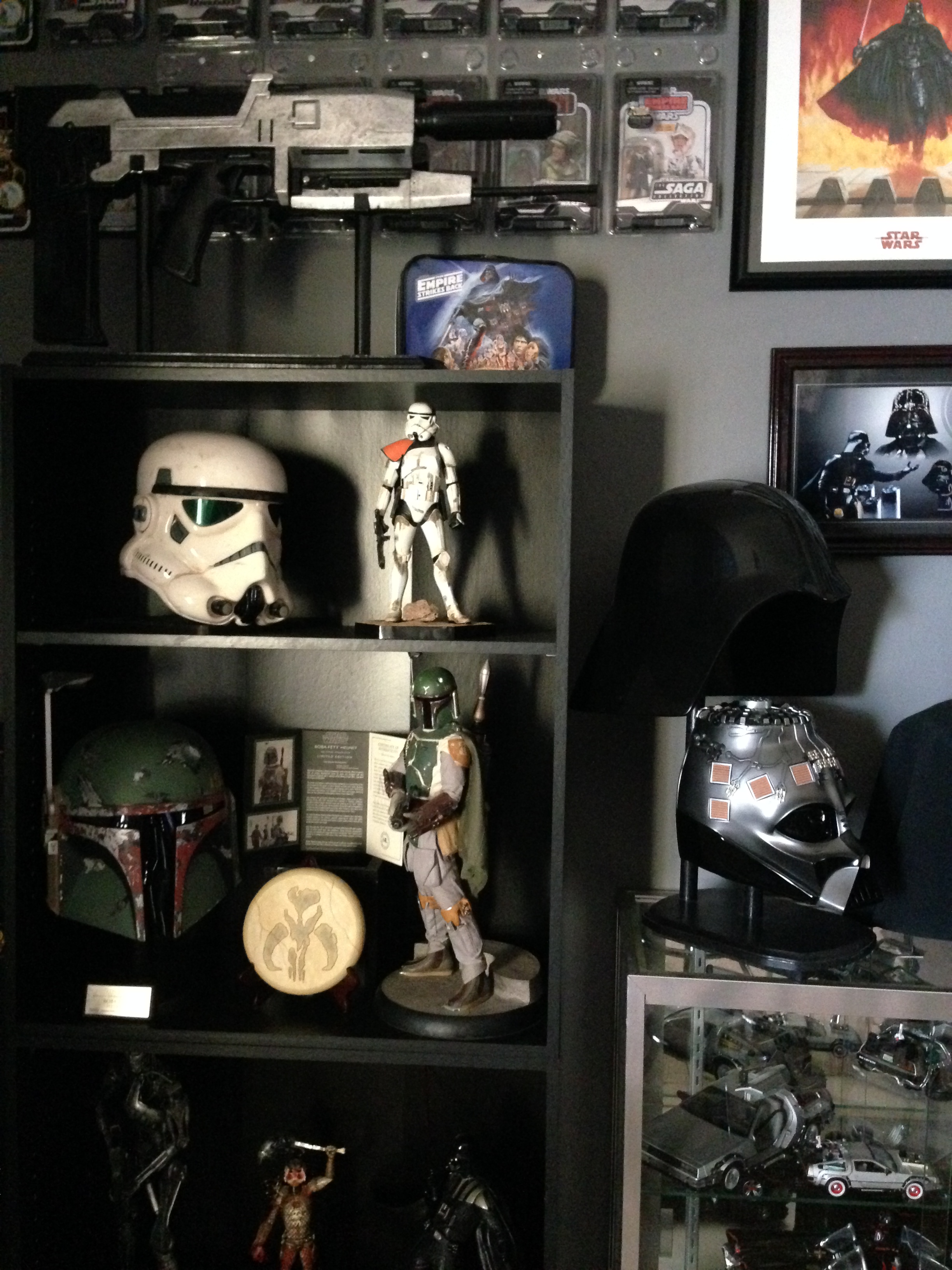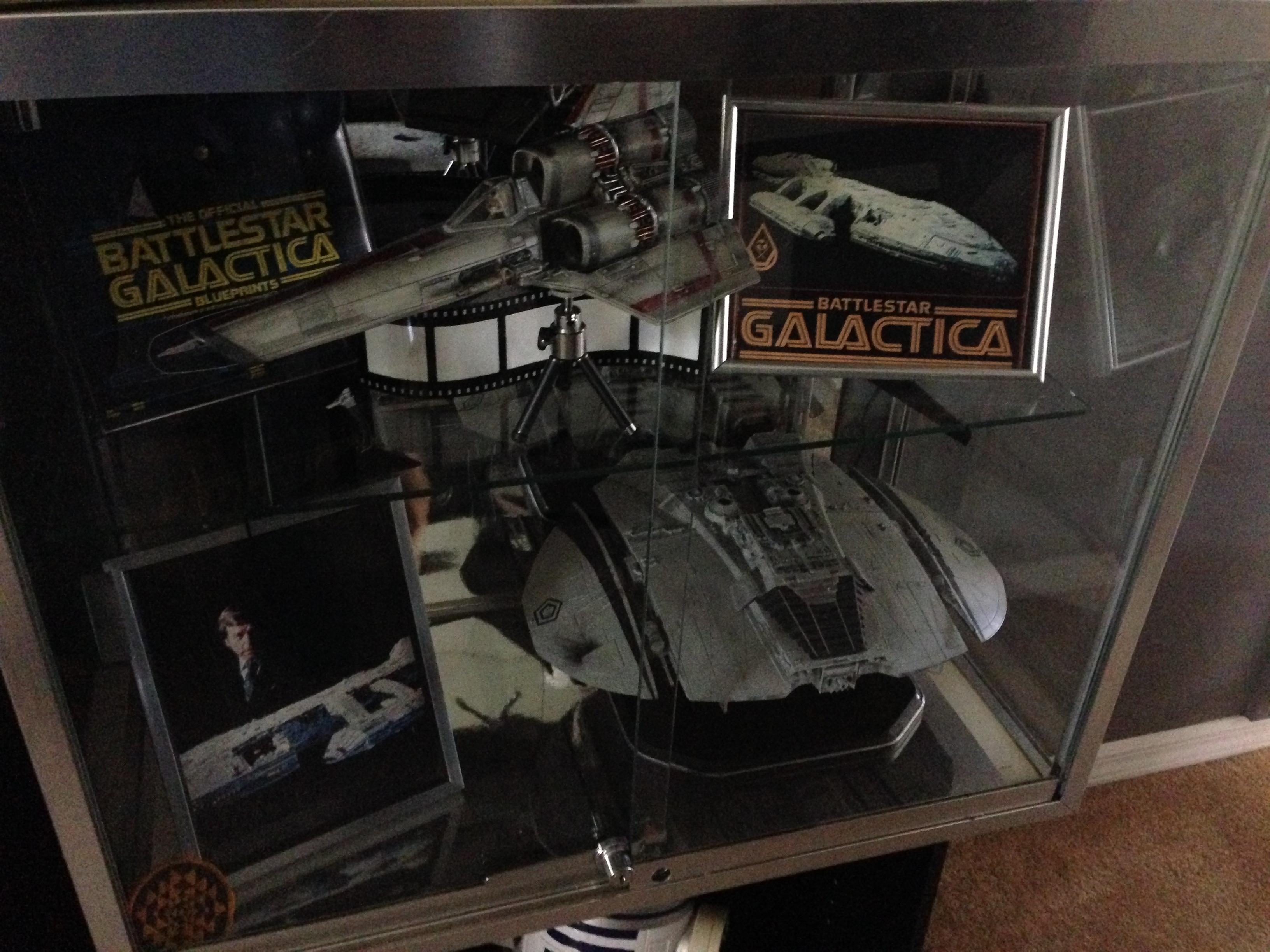 I always love to show different man caves. This one of Marc’s, in his new home, is marvelous! Still adorning the world’s largest scaled replica (7 feet long) of the Battlestar Galactica, and a full sized Terminator…this room will cause any male to drool!
