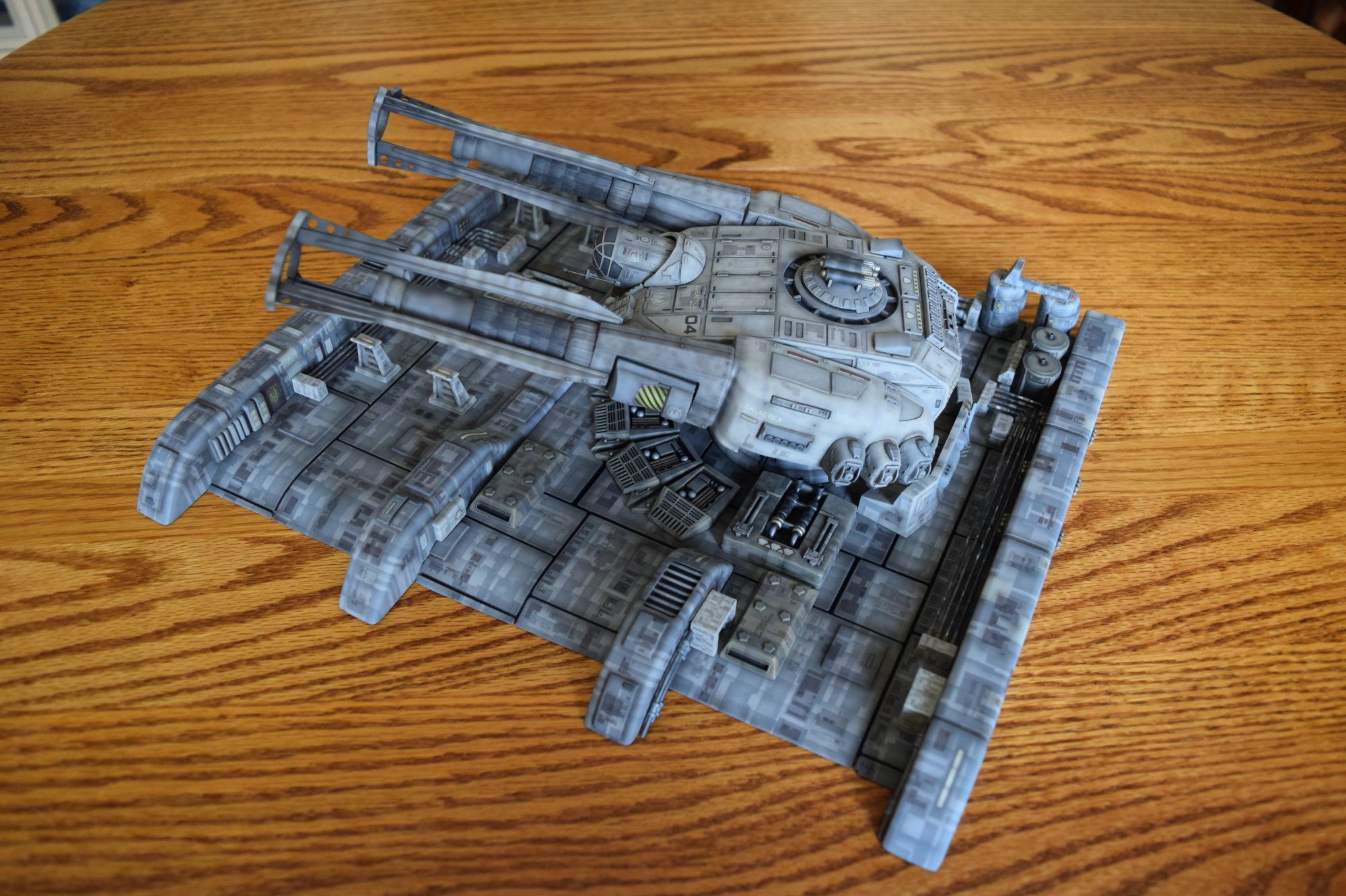 This is the Bad Azz 1/144 Battlestar Galactica Flak Canon. I spent most of the time on the painting and weathering. The base has multiple shades of gray masked to create panel line texture – then it was supplemented with select panel decals from PNT to create sporadic rows of panels across the base. My kit was missing the 6 “pods” (3 per side) that go on each arm of the gun. I used references to create a “master” (shaped from a chunk of resin and detailed with spare parts), then I used Alumilite to create a mold and cast 6 replacements. (My first time casting replacement parts). I also created the “pipes” from tubing; and, added the ladders to the back of the gun (from 1/144 scale building supplies). Finally, I used spare decals to provide supplemental “Galactica” markings to the base and Gun. This model picked up a gold award at the recent Wonderfest show that was held in Louisville KY June 4 & 5, 2016.