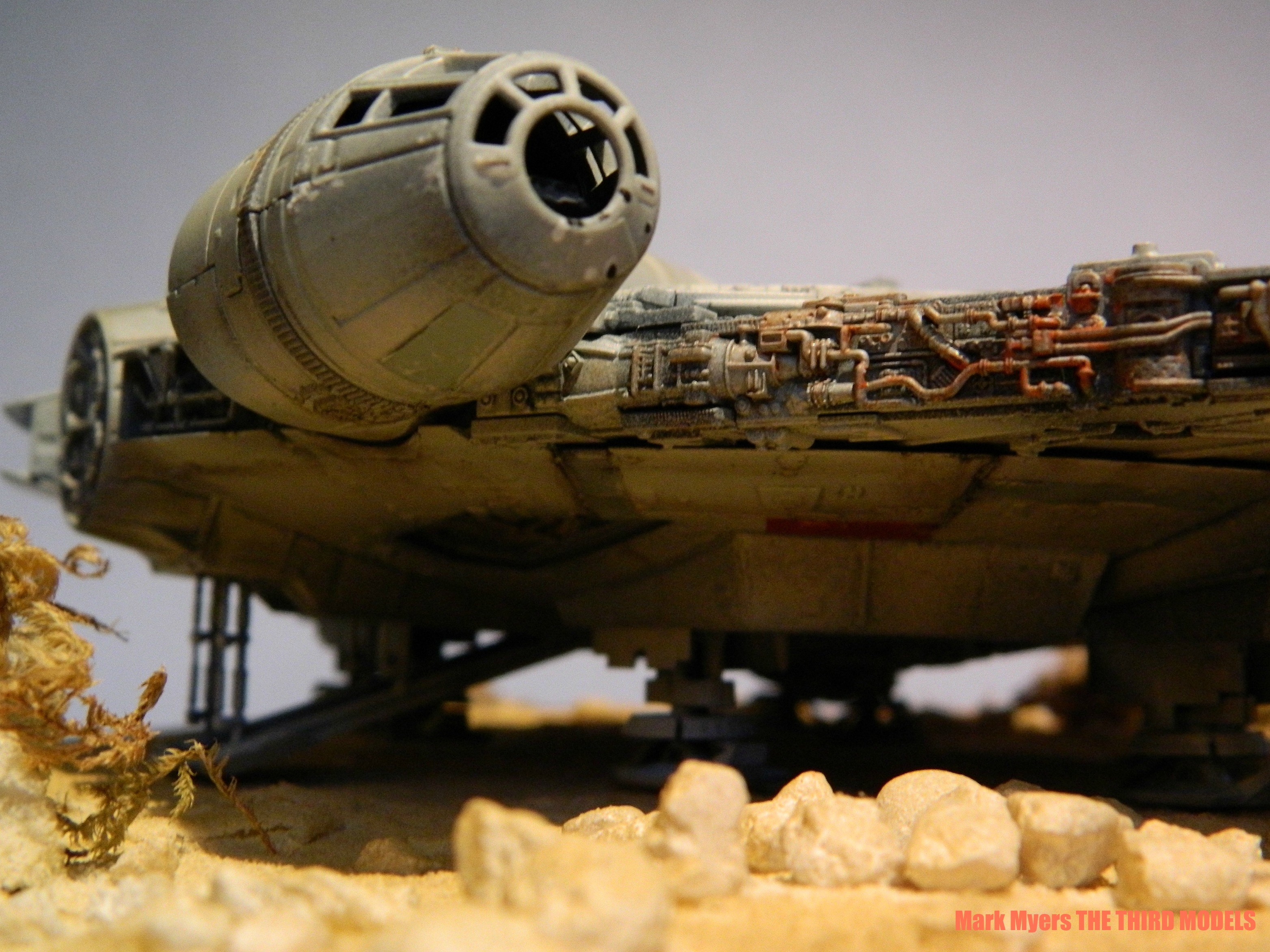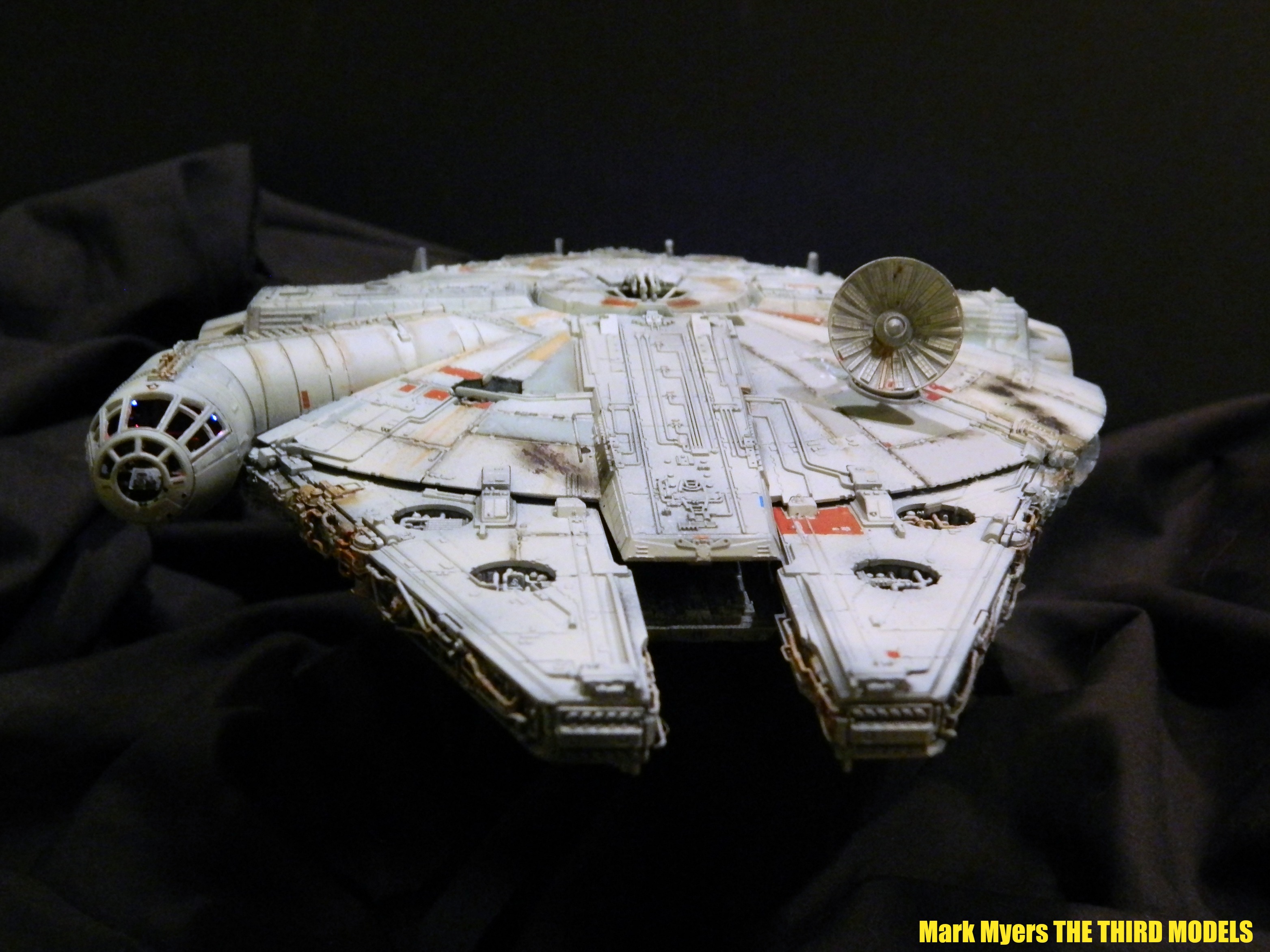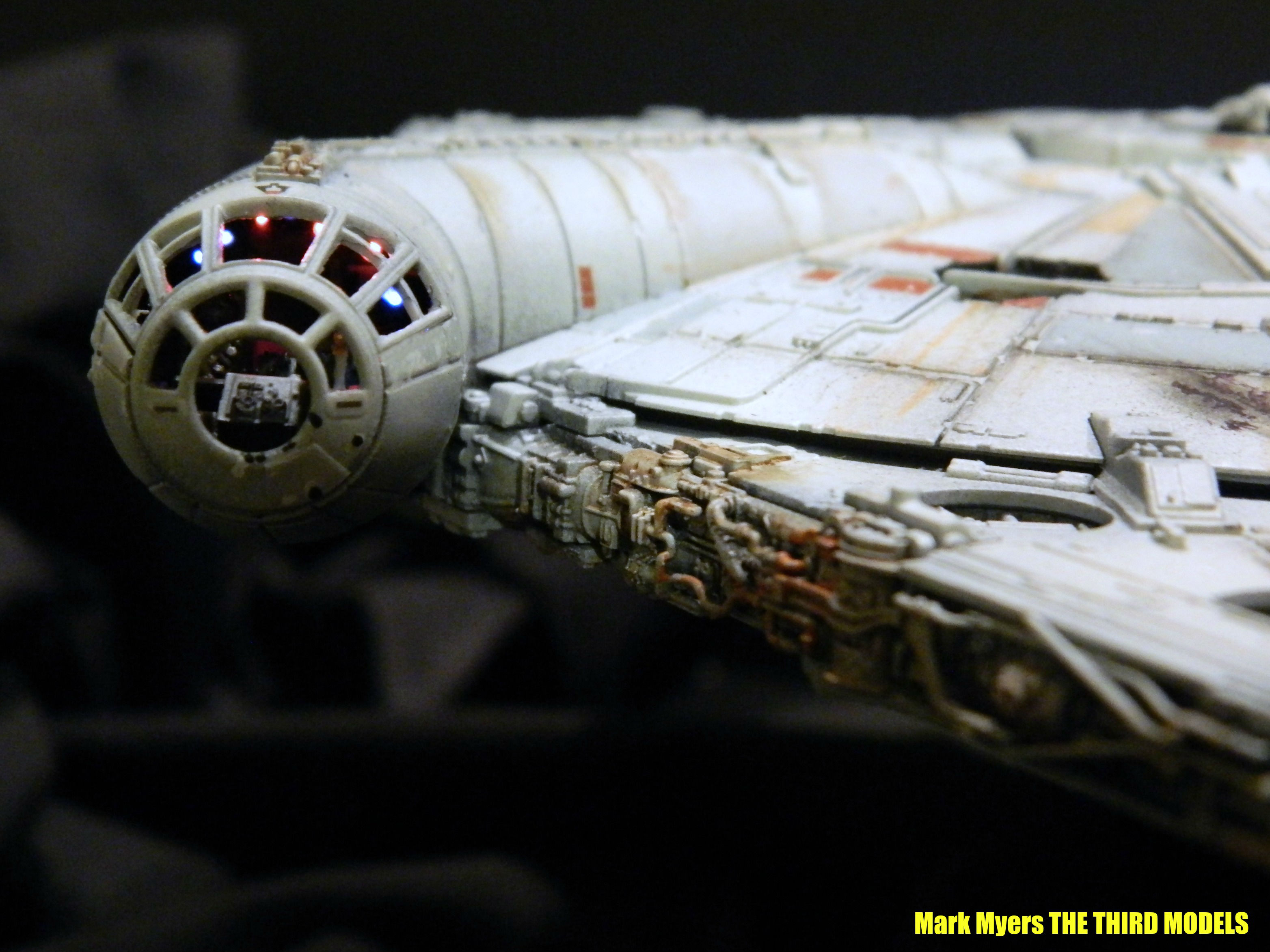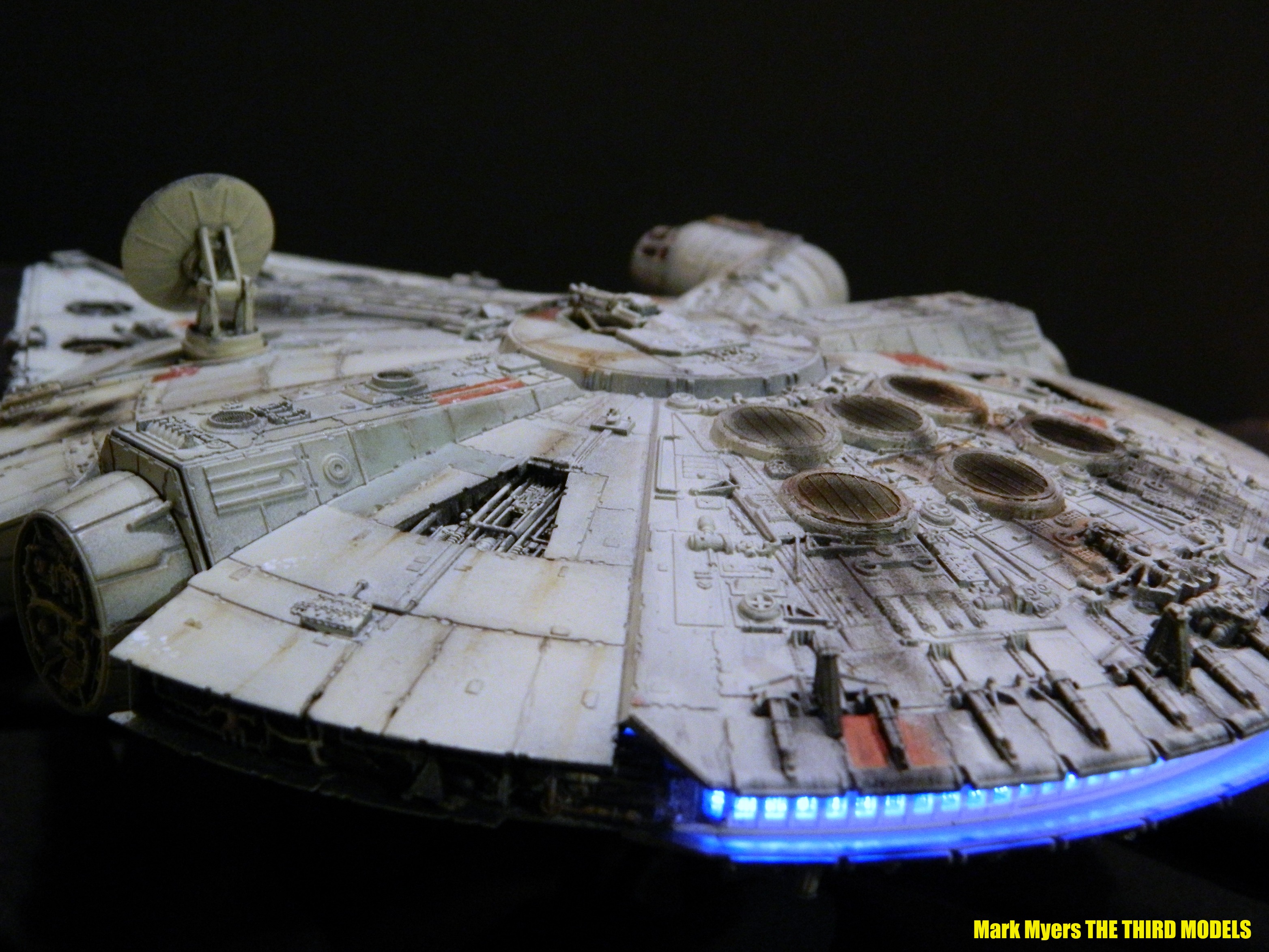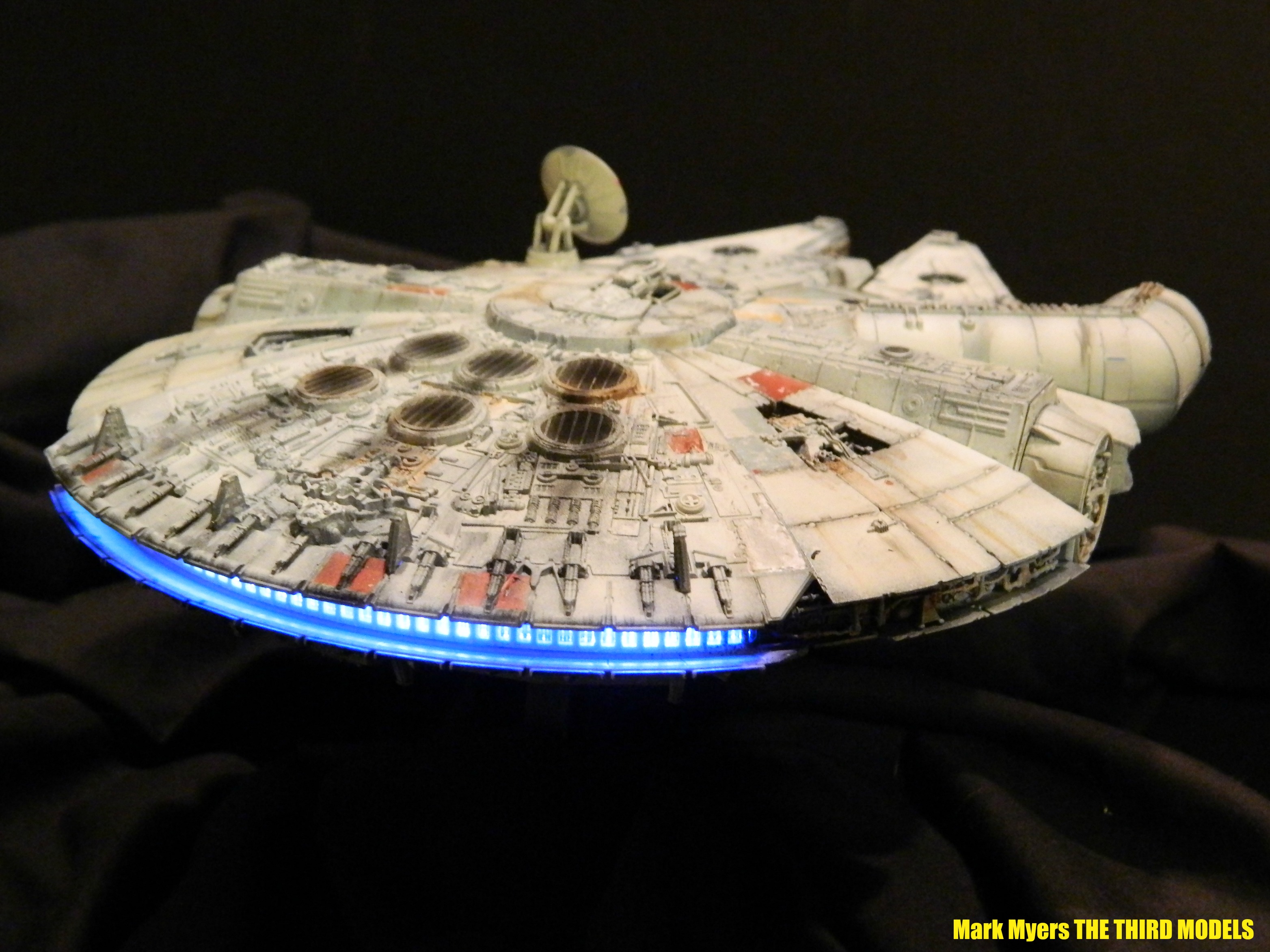Here’s what I did…Added Photo etch to the rear engine exhausts, Replaced the gunner view ports with in scale frames, Replaced the Force Awakens dish with the original trilogy round dish, Weathered the model to scale and lit the model to scale…