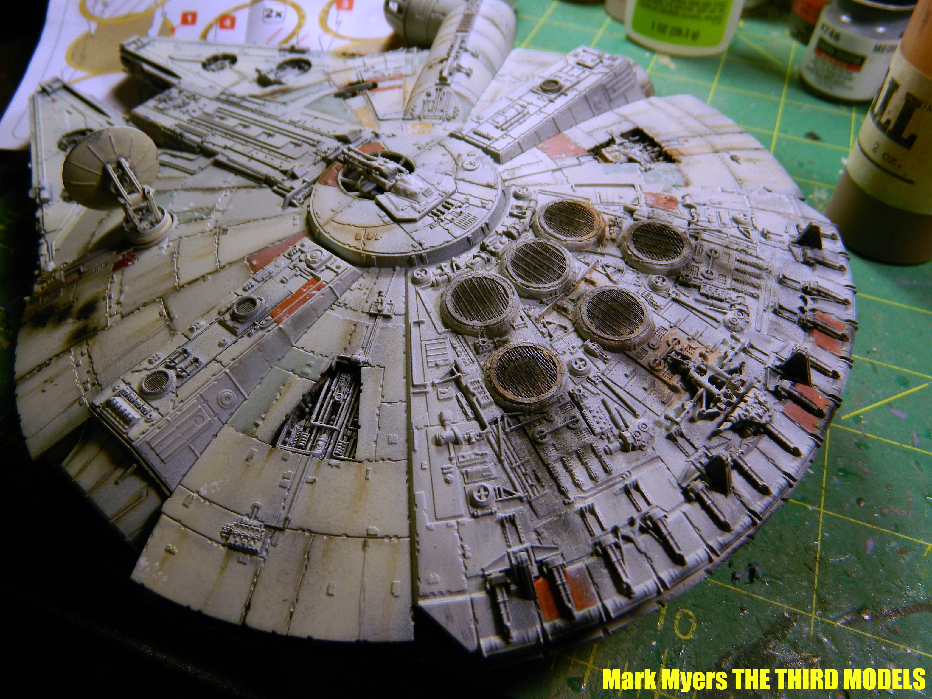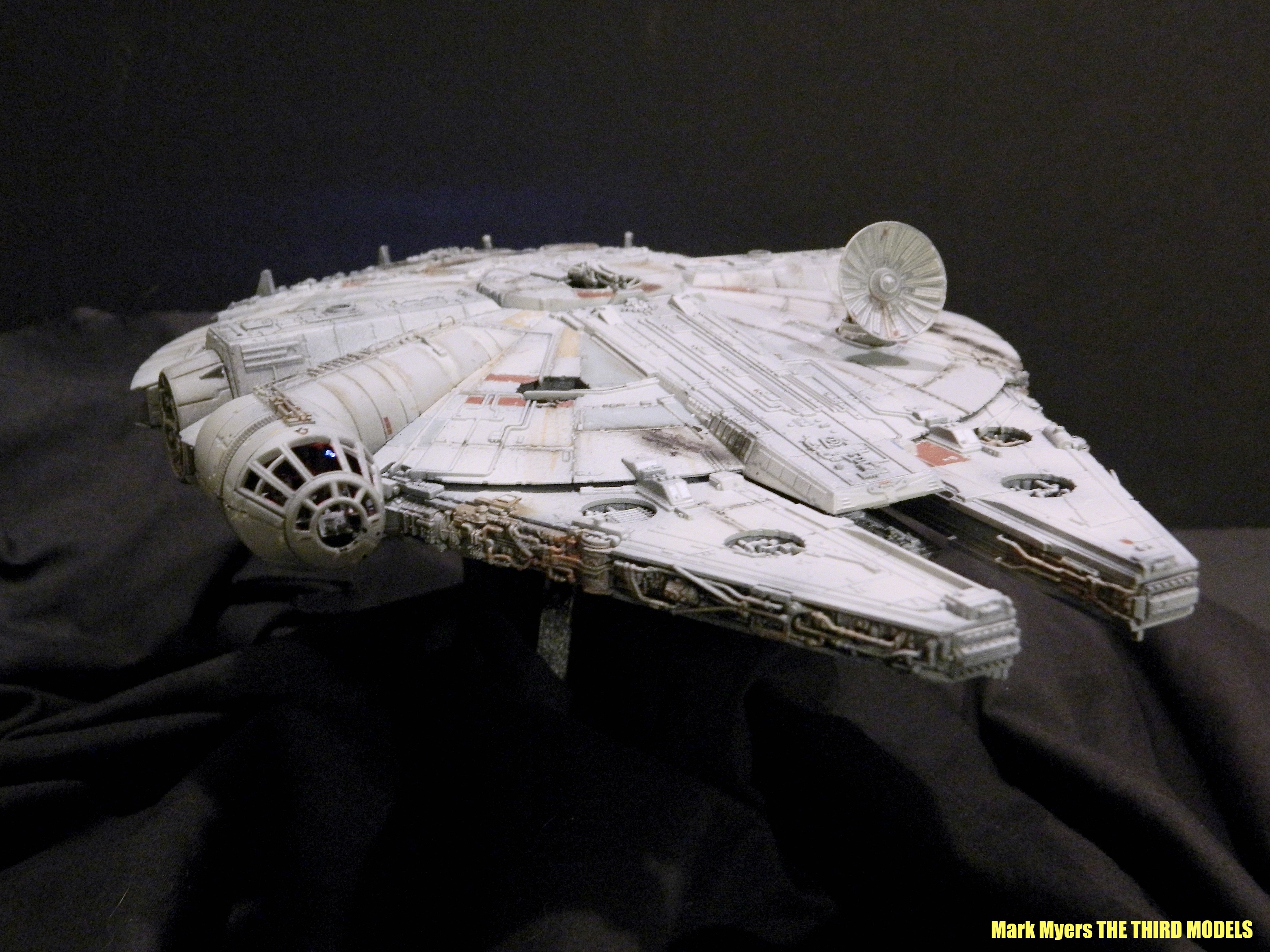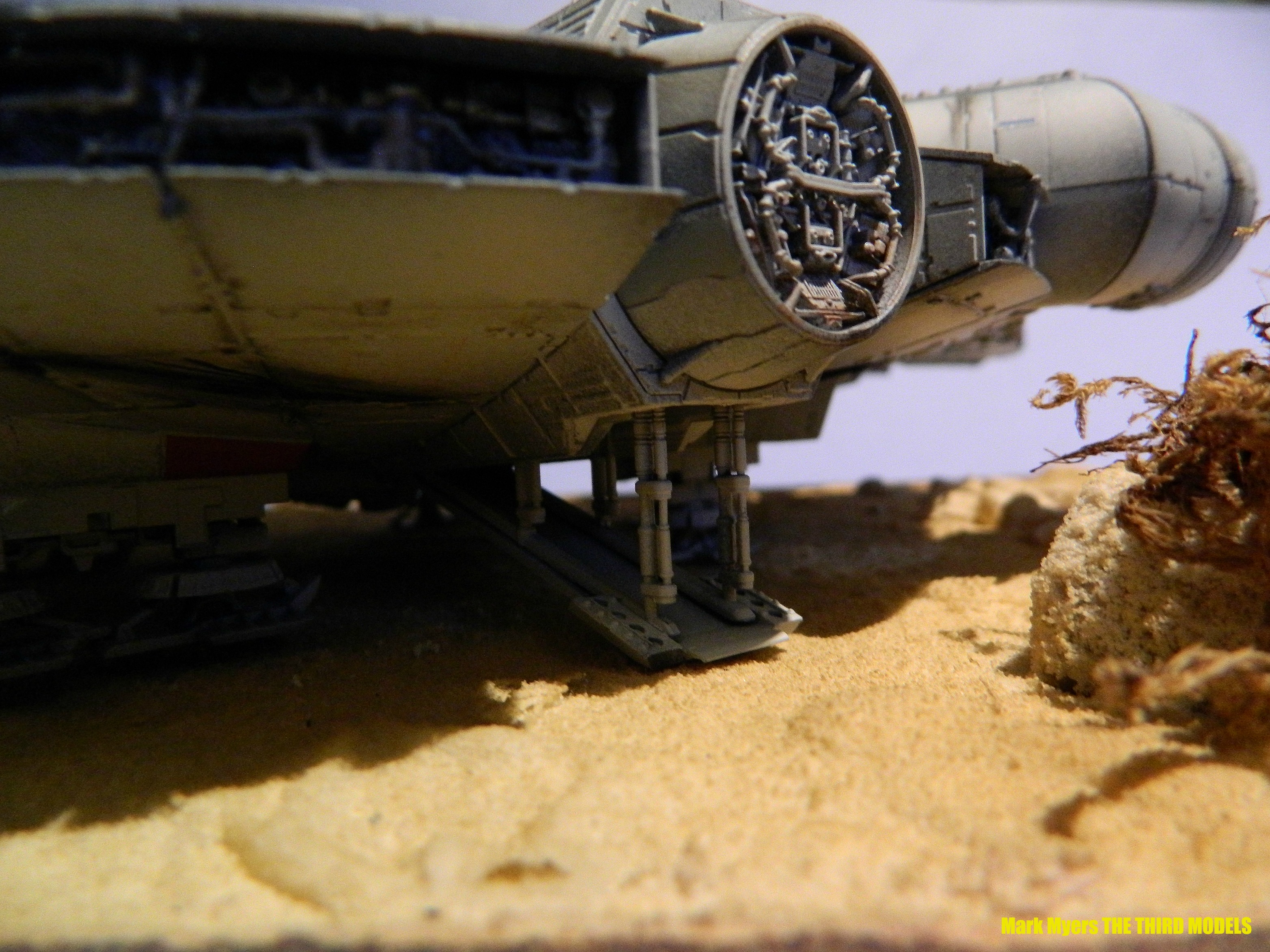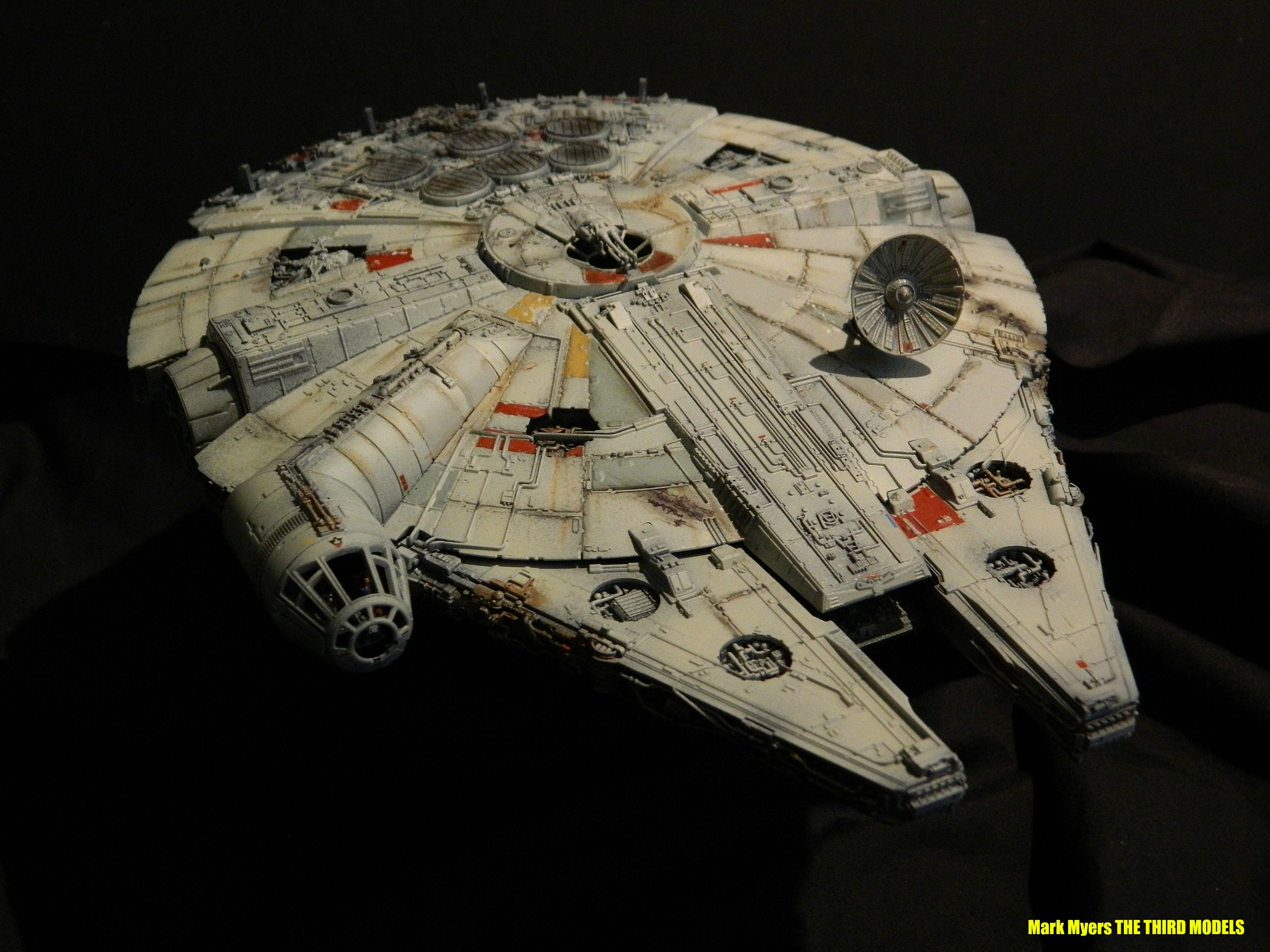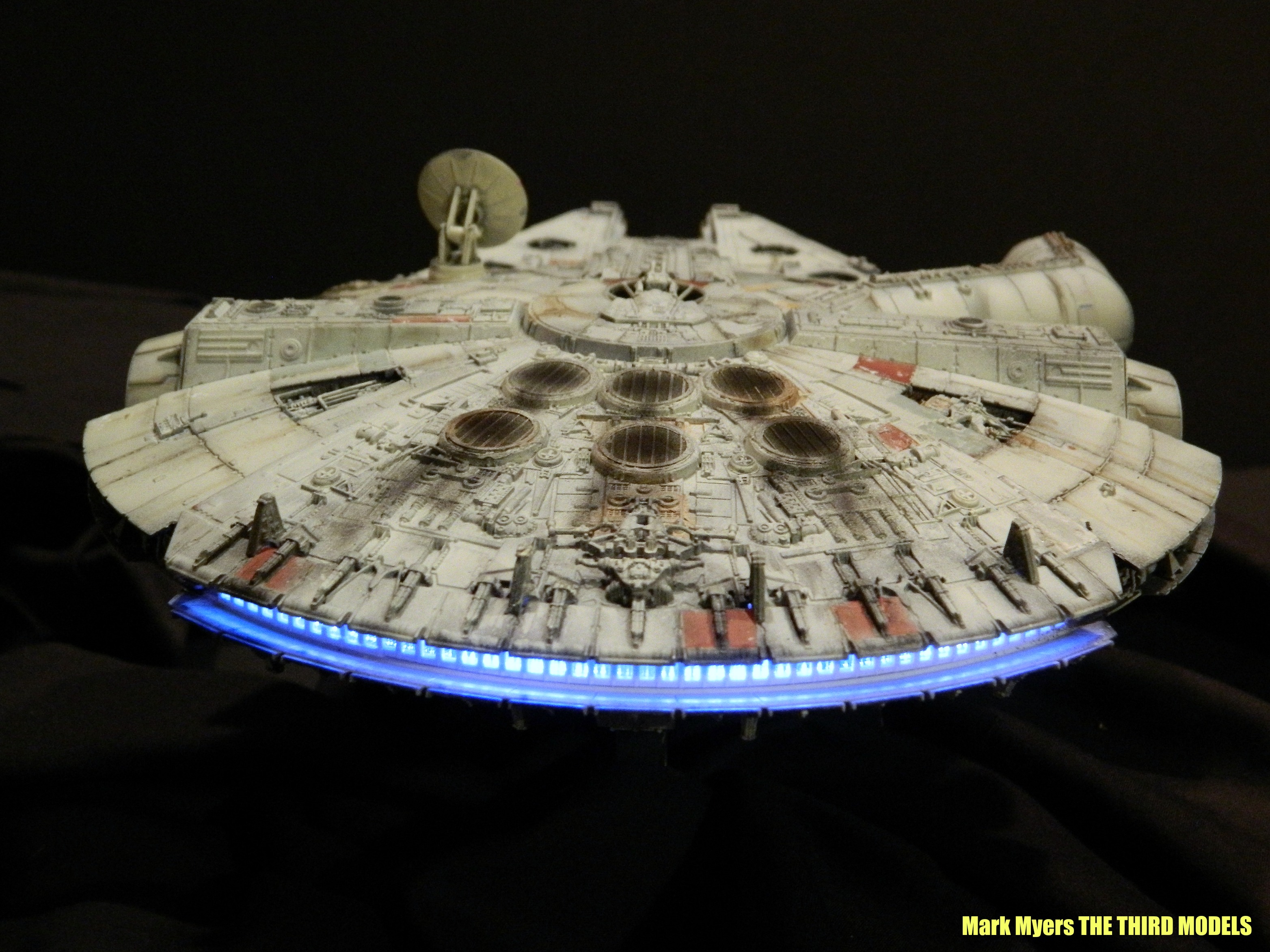 Here’s what I did…Added Photo etch to the rear engine exhausts, Replaced the gunner view ports with in scale frames, Replaced the Force Awakens dish with the original trilogy round dish, Weathered the model to scale and lit the model to scale…