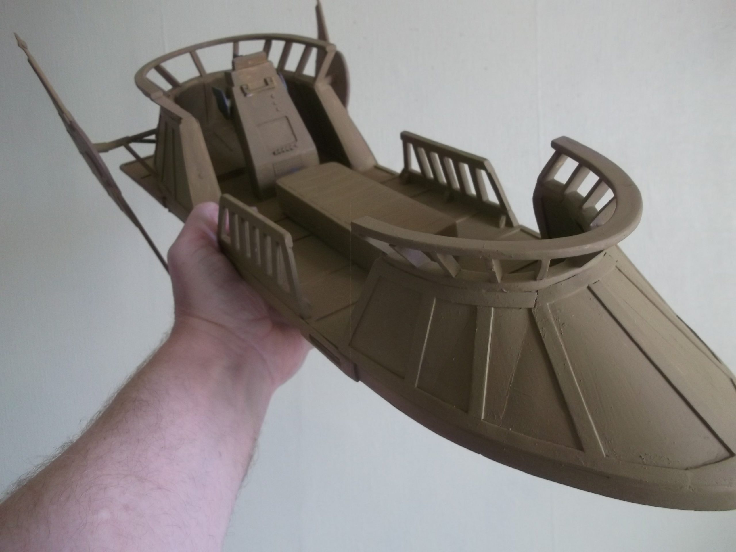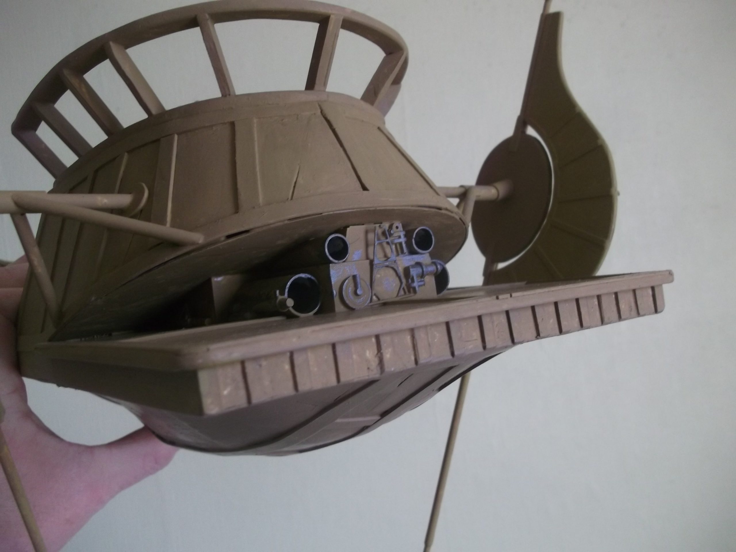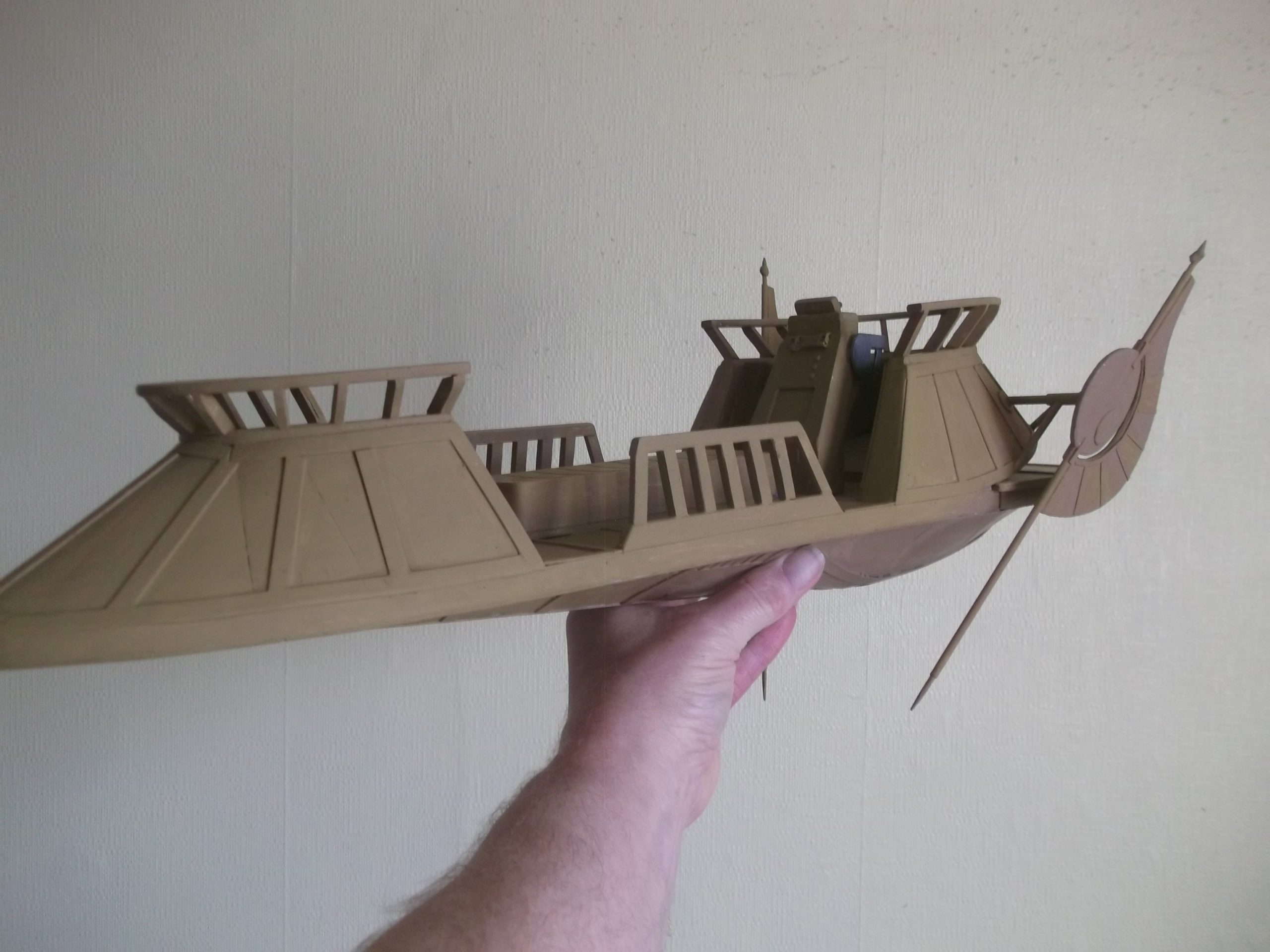 This Tatooine SKIFF was scratch built from flat plastic sheet. I managed to get a small drawing off the good old internet and then set about scaling it up to give me a model around 20 inches long. All the parts were shaped by hand after laminating layers of sheet plastic. The big challenge was the underside of the hull. It was a curious shape but with some careful bending. I managed to get it close to the final craft shape. The model was painted in enamels, then a very small amount of weathering was added.