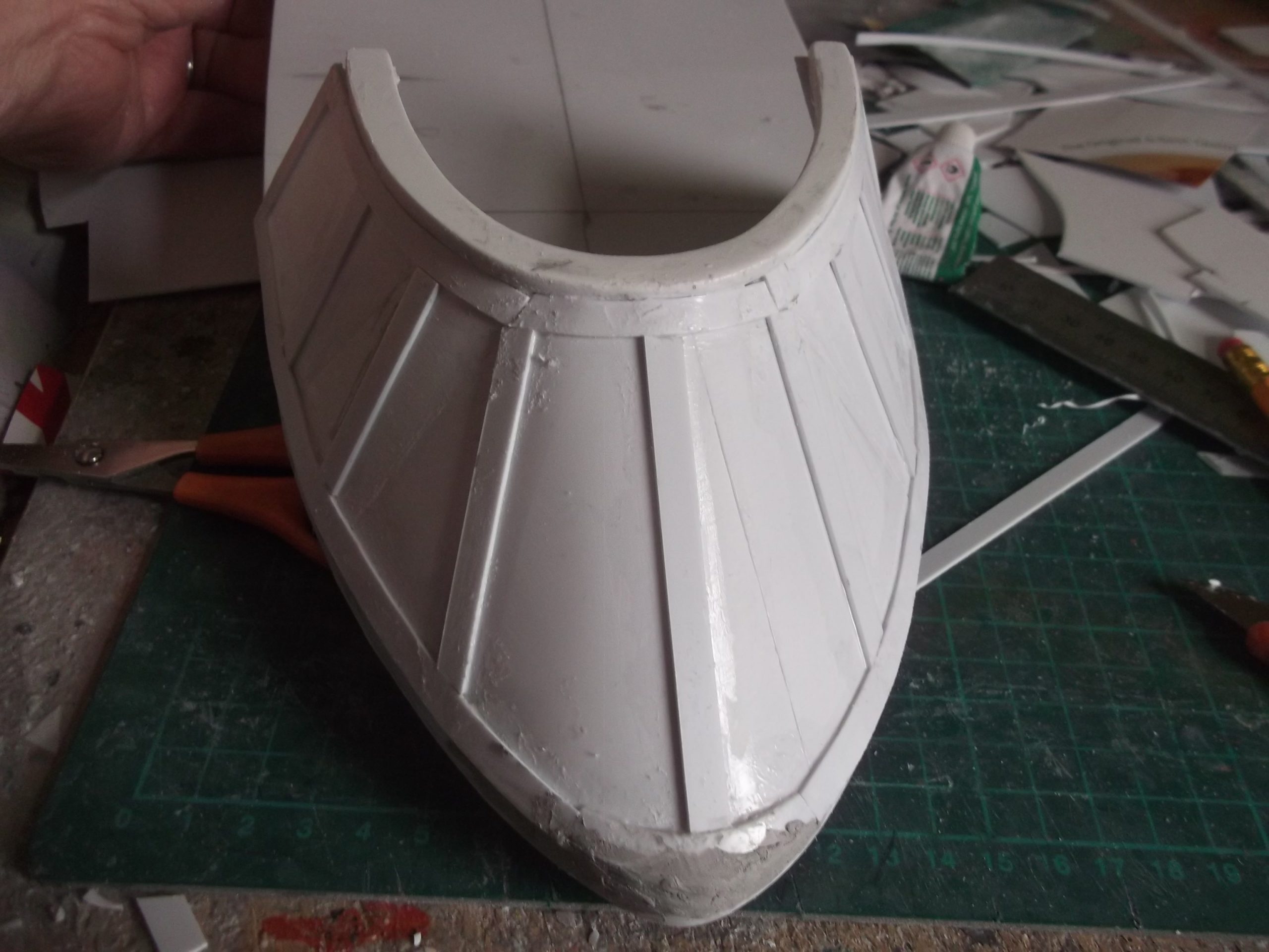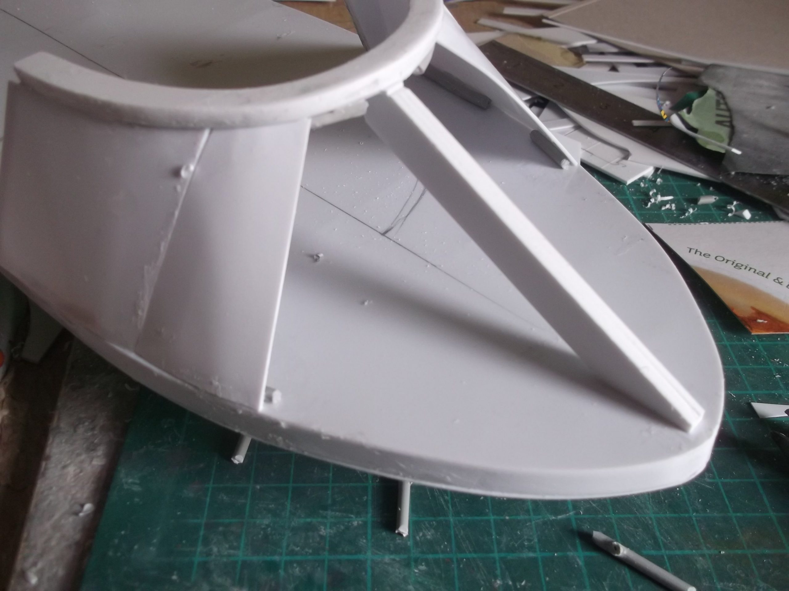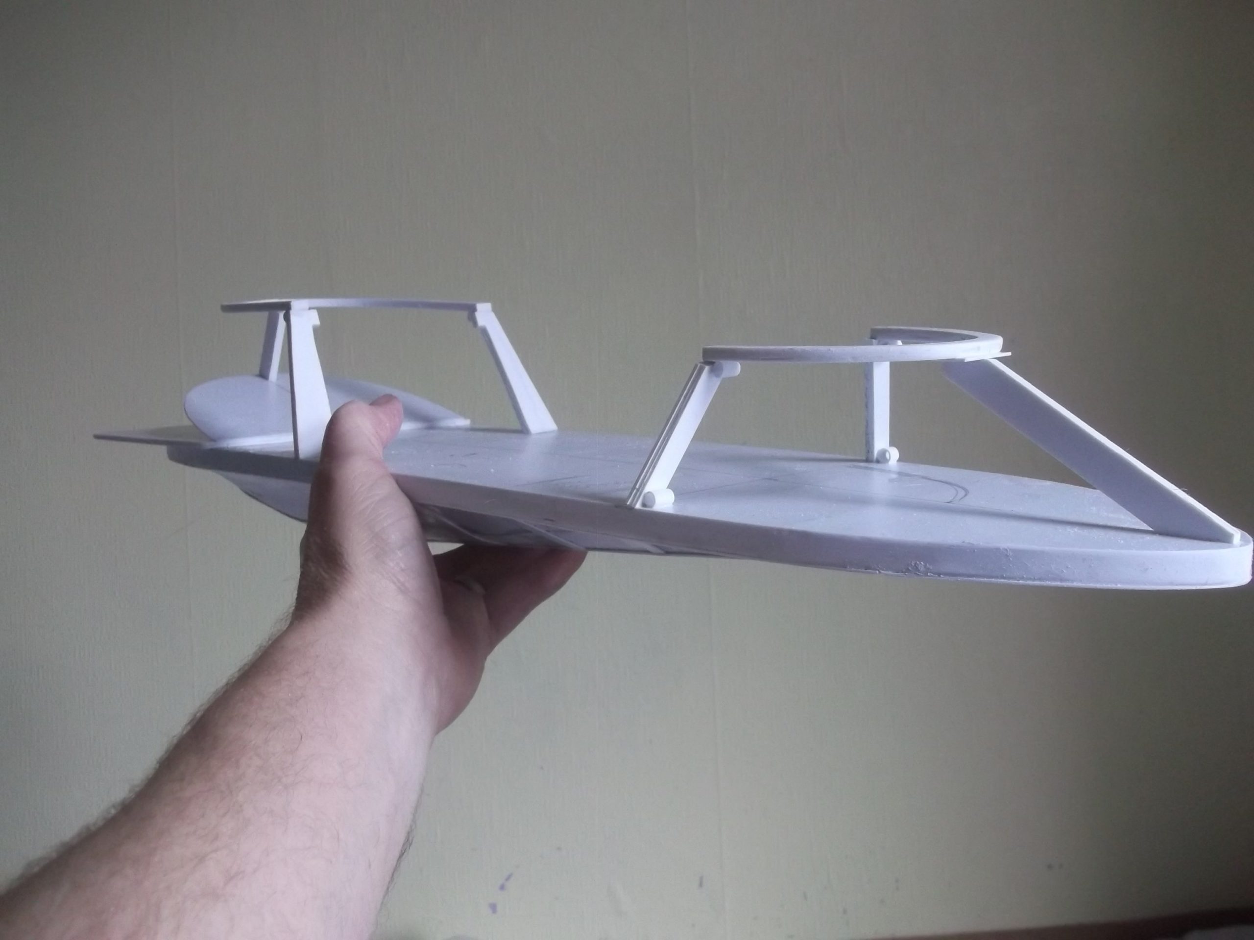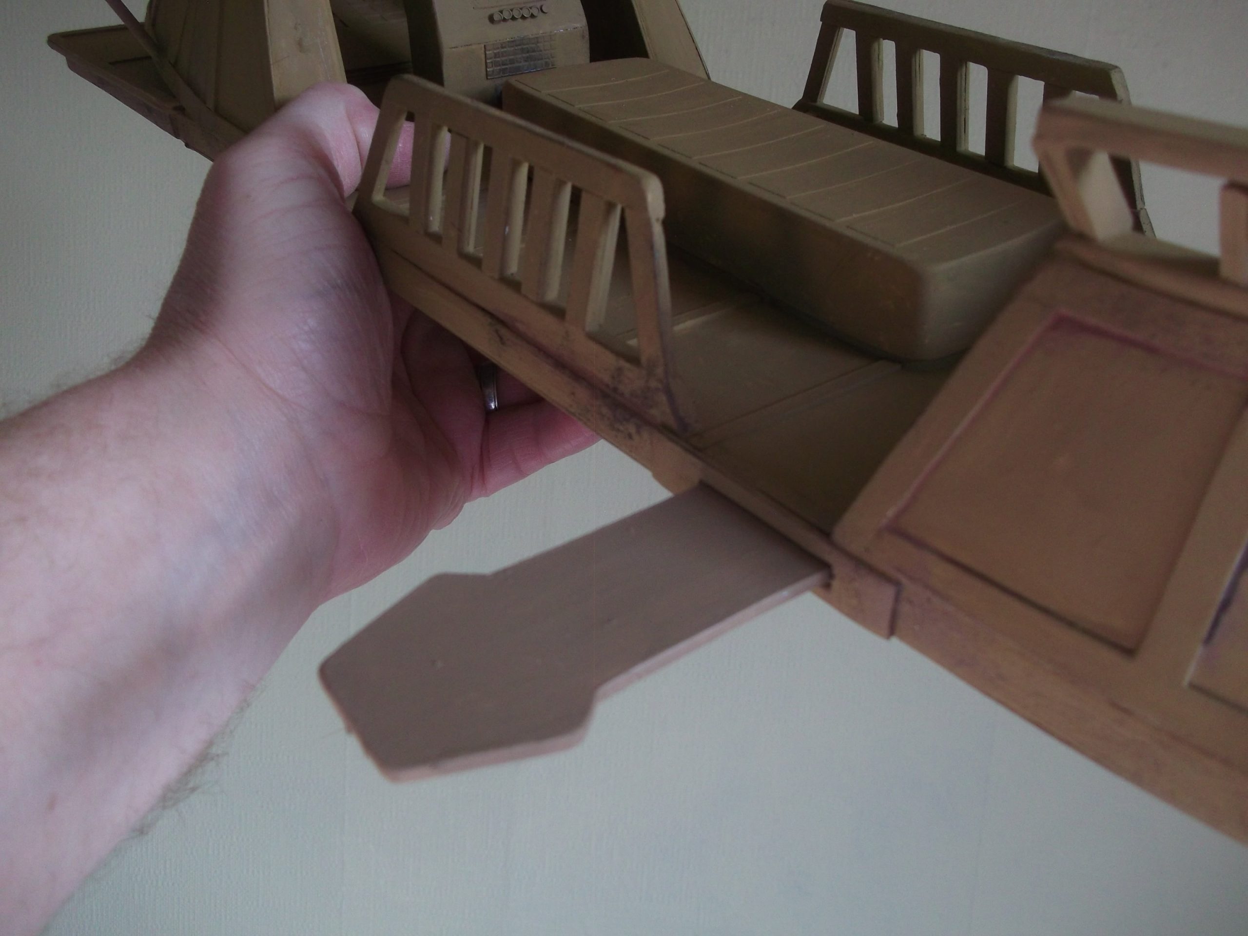 This Tatooine SKIFF was scratch built from flat plastic sheet. I managed to get a small drawing off the good old internet and then set about scaling it up to give me a model around 20 inches long. All the parts were shaped by hand after laminating layers of sheet plastic. The big challenge was the underside of the hull. It was a curious shape but with some careful bending. I managed to get it close to the final craft shape. The model was painted in enamels, then a very small amount of weathering was added.