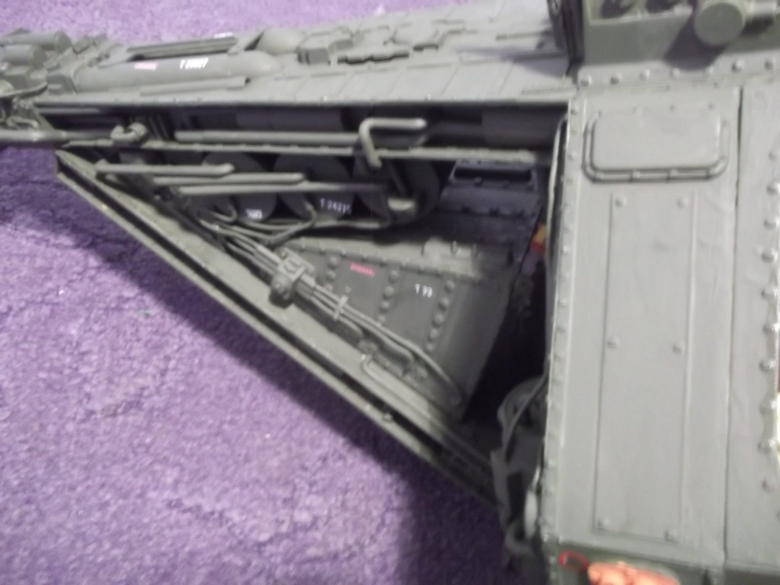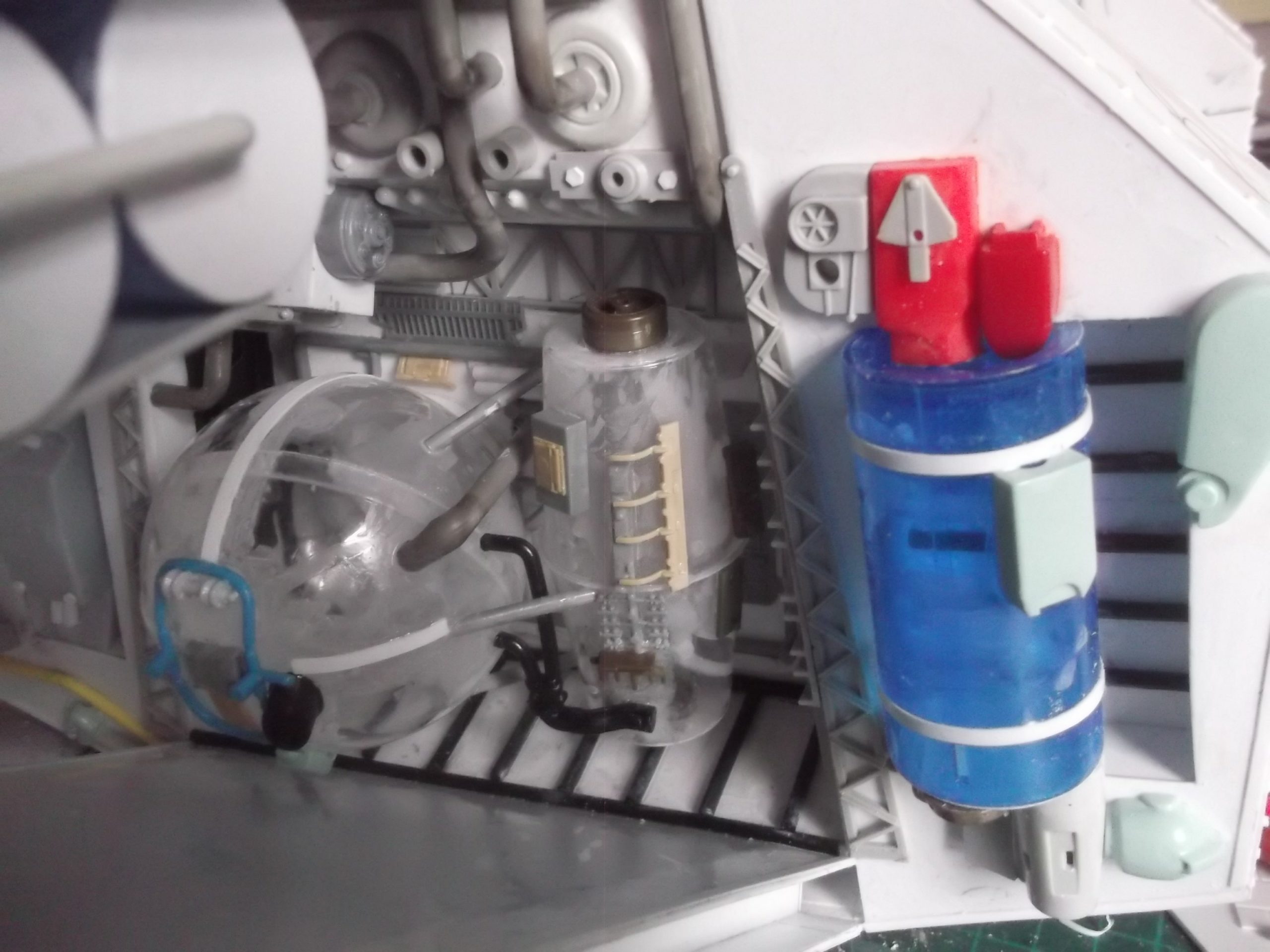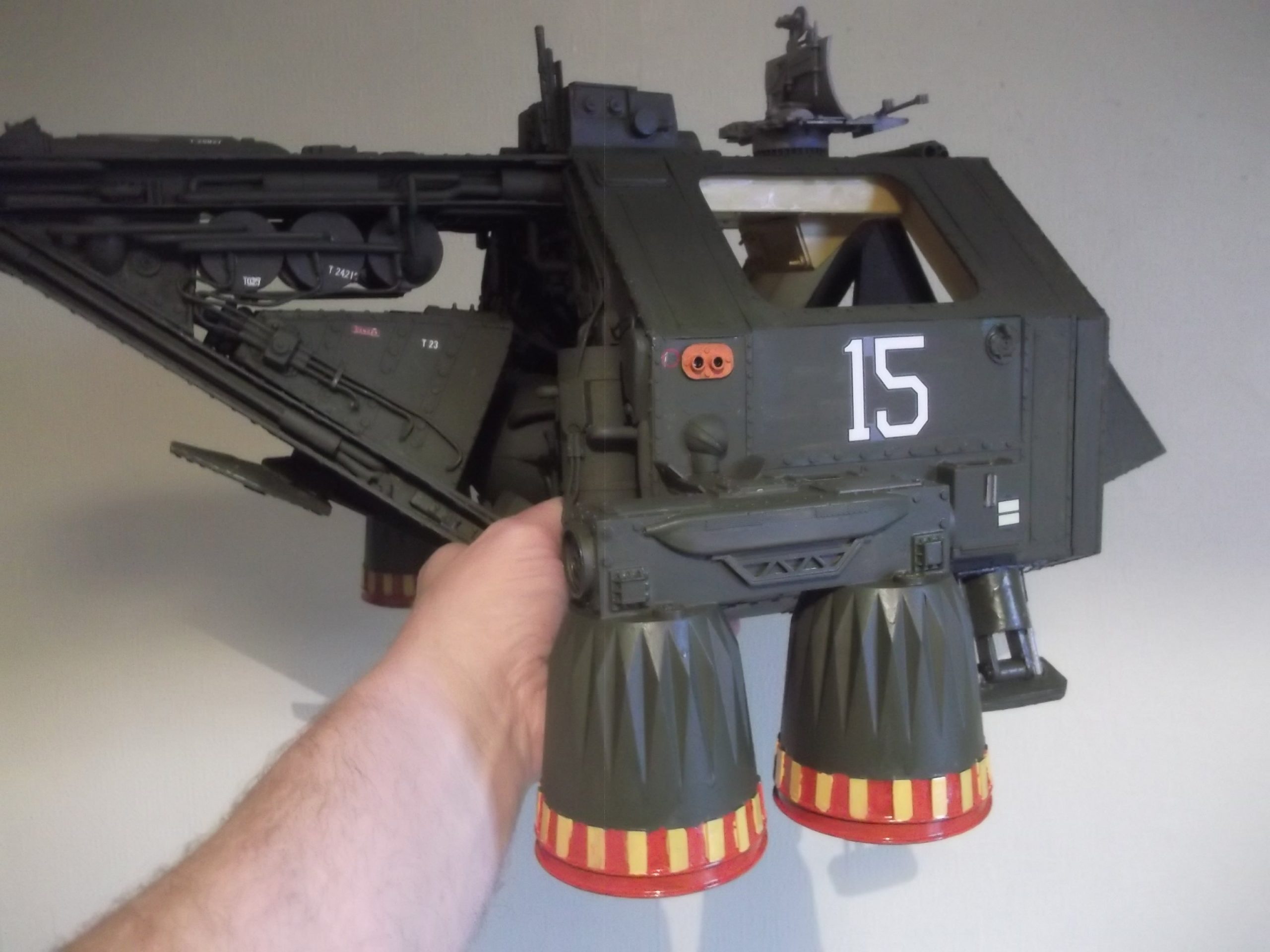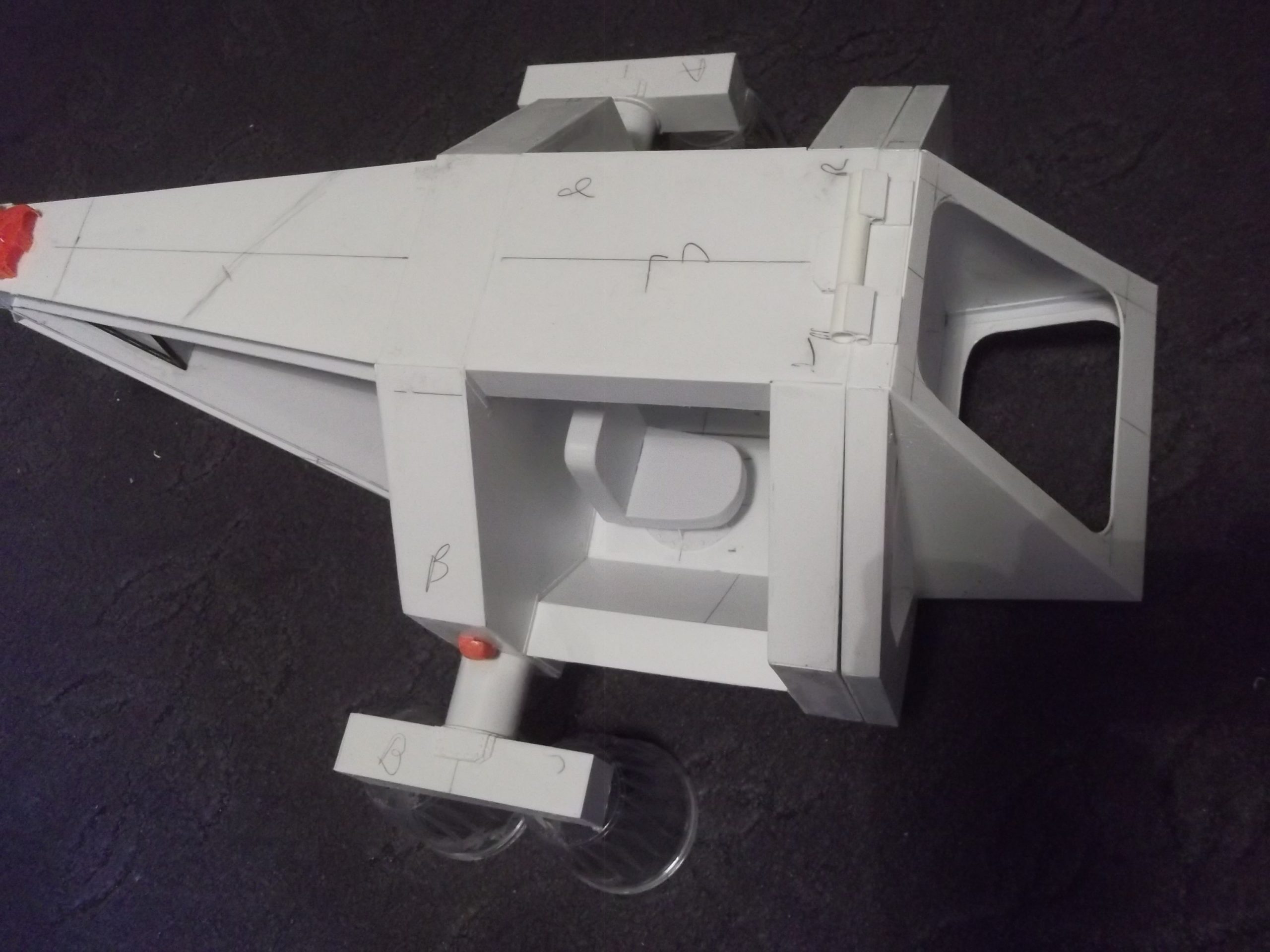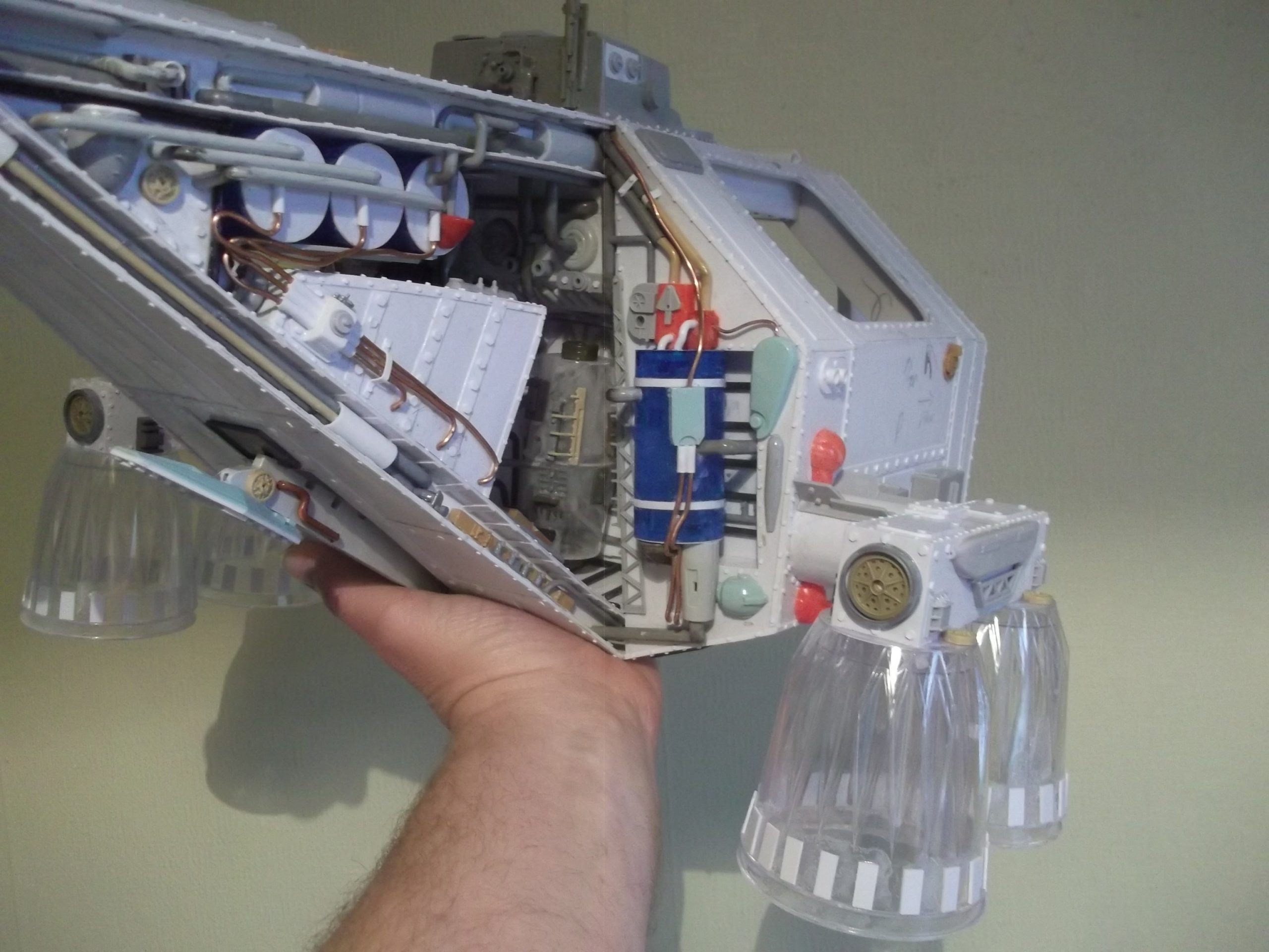 The VTOL craft was an idea I had for a long time. It began with building the two seats and then the whole craft just grew around them. Most of the model was plastic sheet, but I also used some other items such as Herasetas ( sugar substitute ) containers, and some thick brass electrical wire for the pipe work and other detail parts. The two control panels in the craft swing outwards to allow crew access. Also, the front of the model lifts when the Astronauts have an EVA to perform. The fuel tank is armored and sits in the tail of the model. It would be used for planet exploration hops and also double up as a close support vehicle when guns are added. Overall the model took two months to build and changed from day to day as the design in my head kept changing.