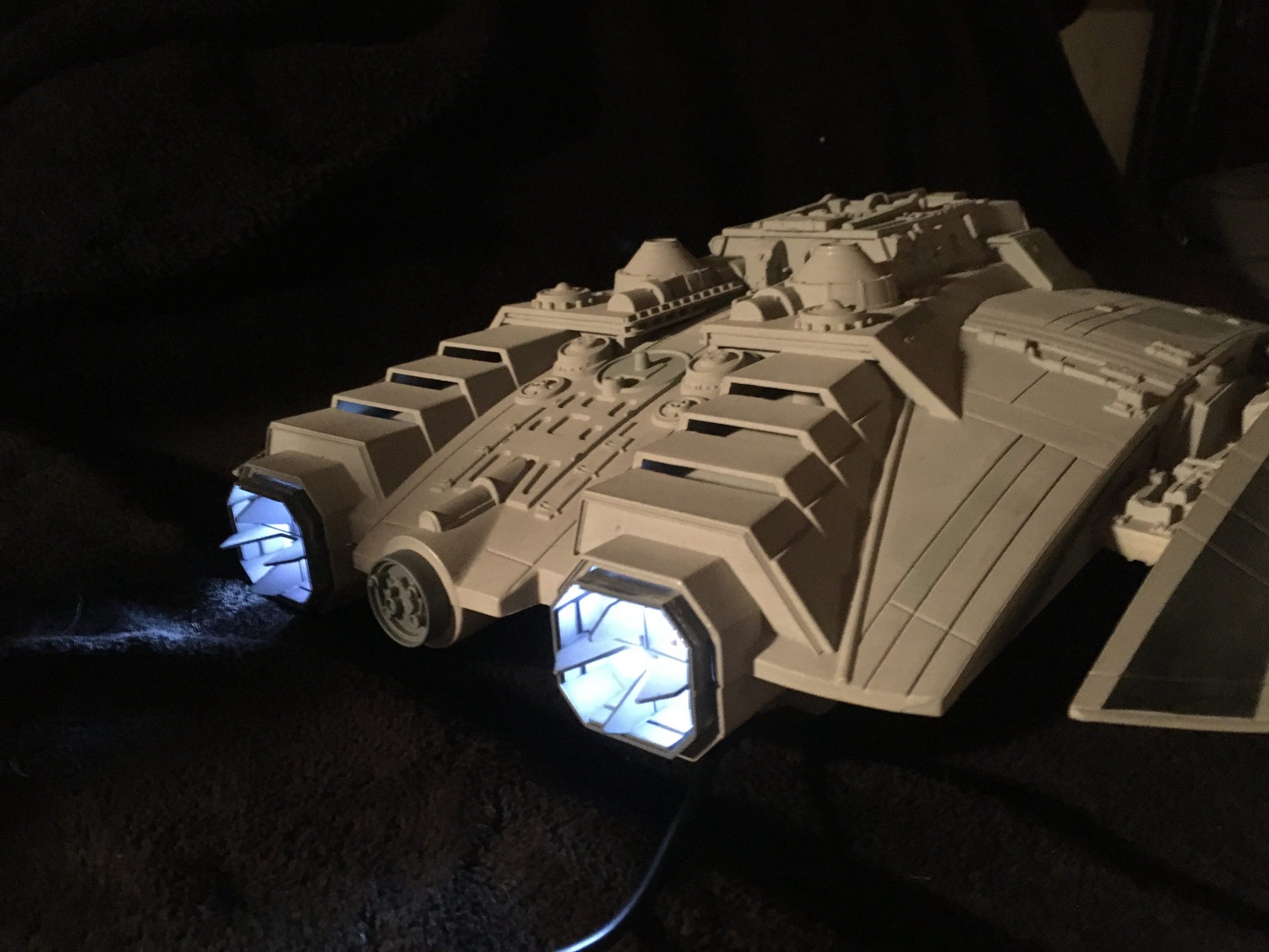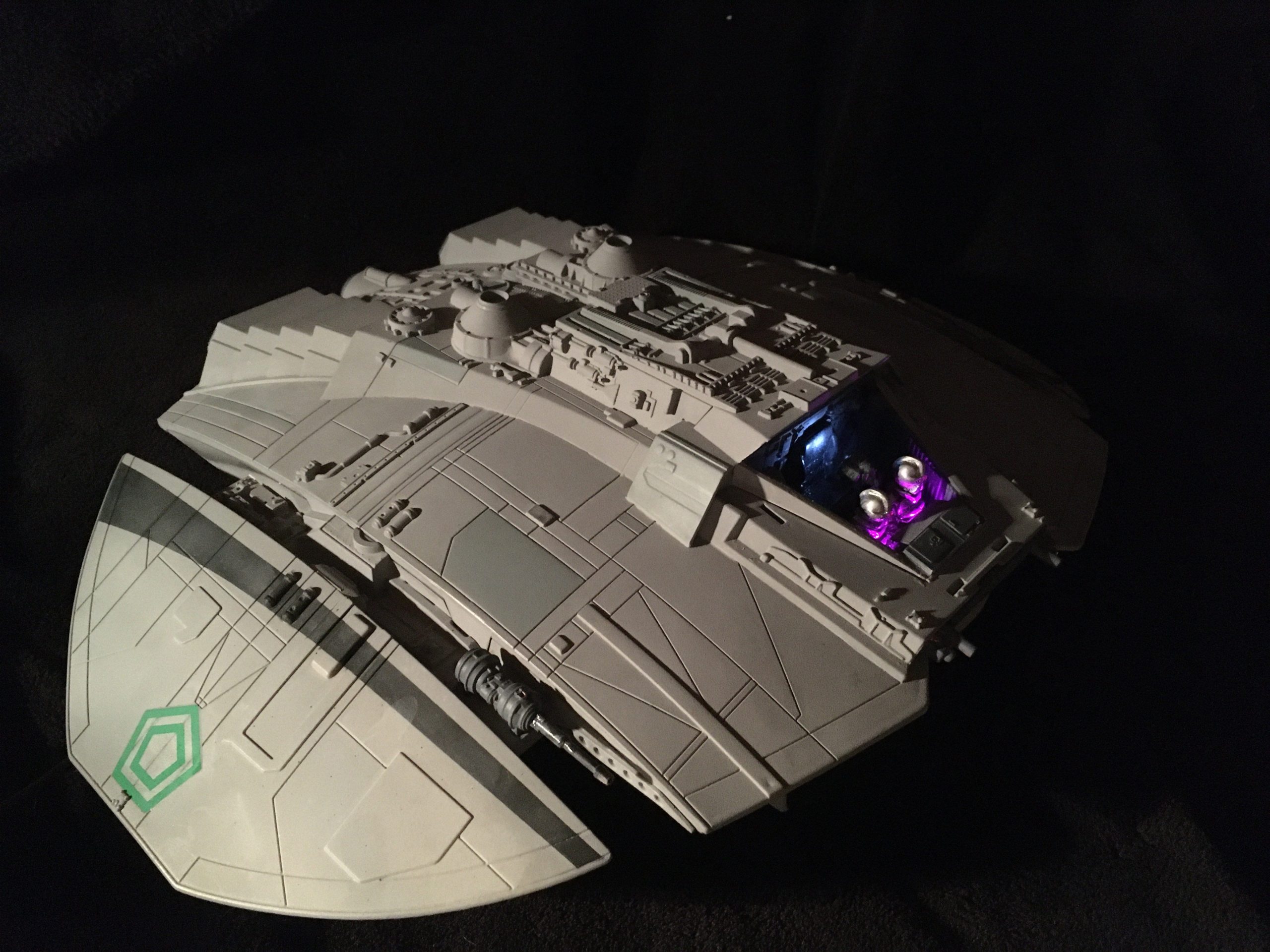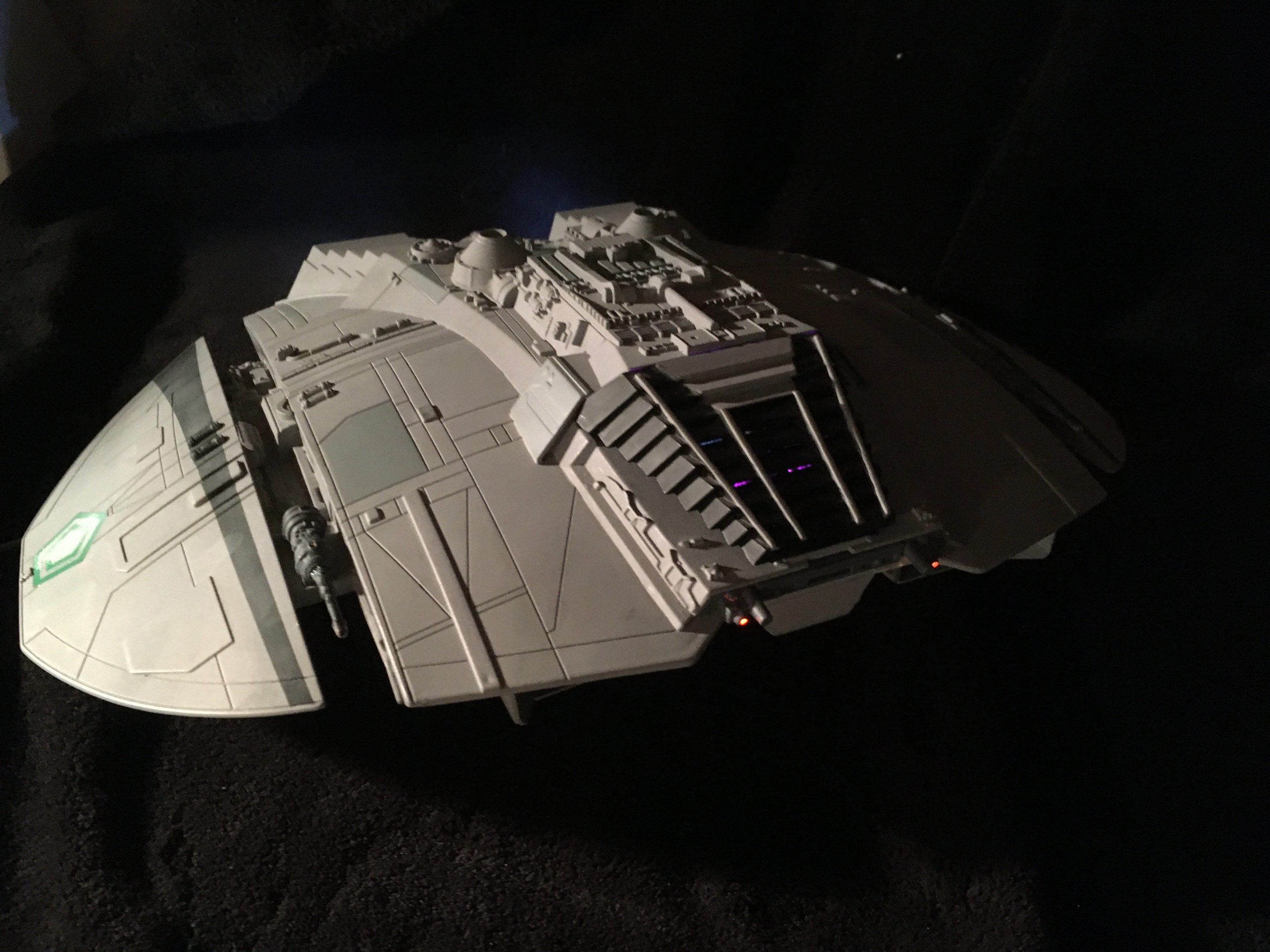 Collector Bobby Rogers has again commissioned the talents of Spacecraft Creation Models to build this wonderful classic Cylon Raider. I believe this one depicts Baltar in the rear command seat! Bringing it to life is the lighting and effects created by Starling Technologies!