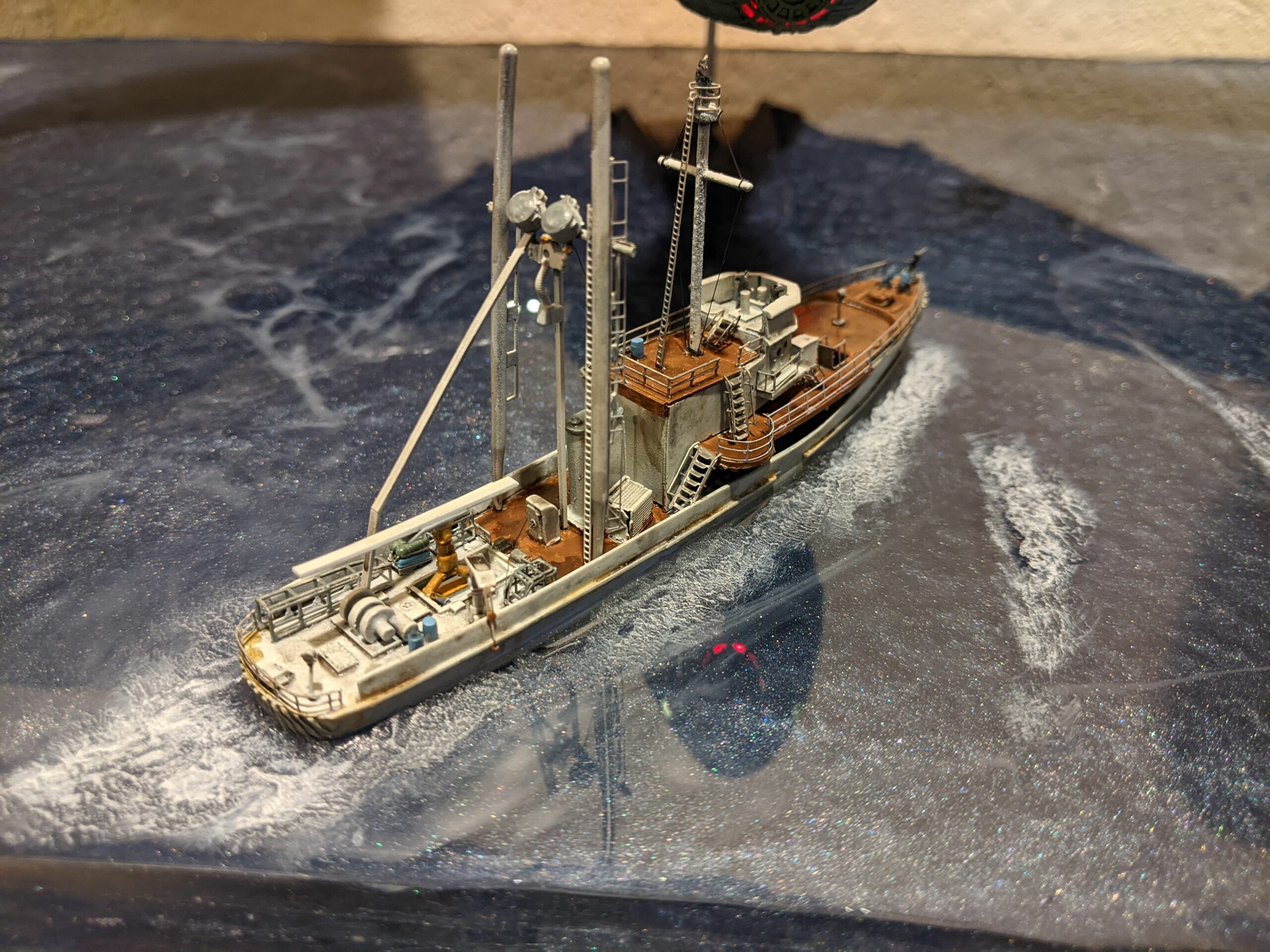 This is a 1:350 scale diorama. The model used for the whaling ship is a YMS class minesweeper, the same used for filming. It was modified heavily by me to more closely match the filming ship.