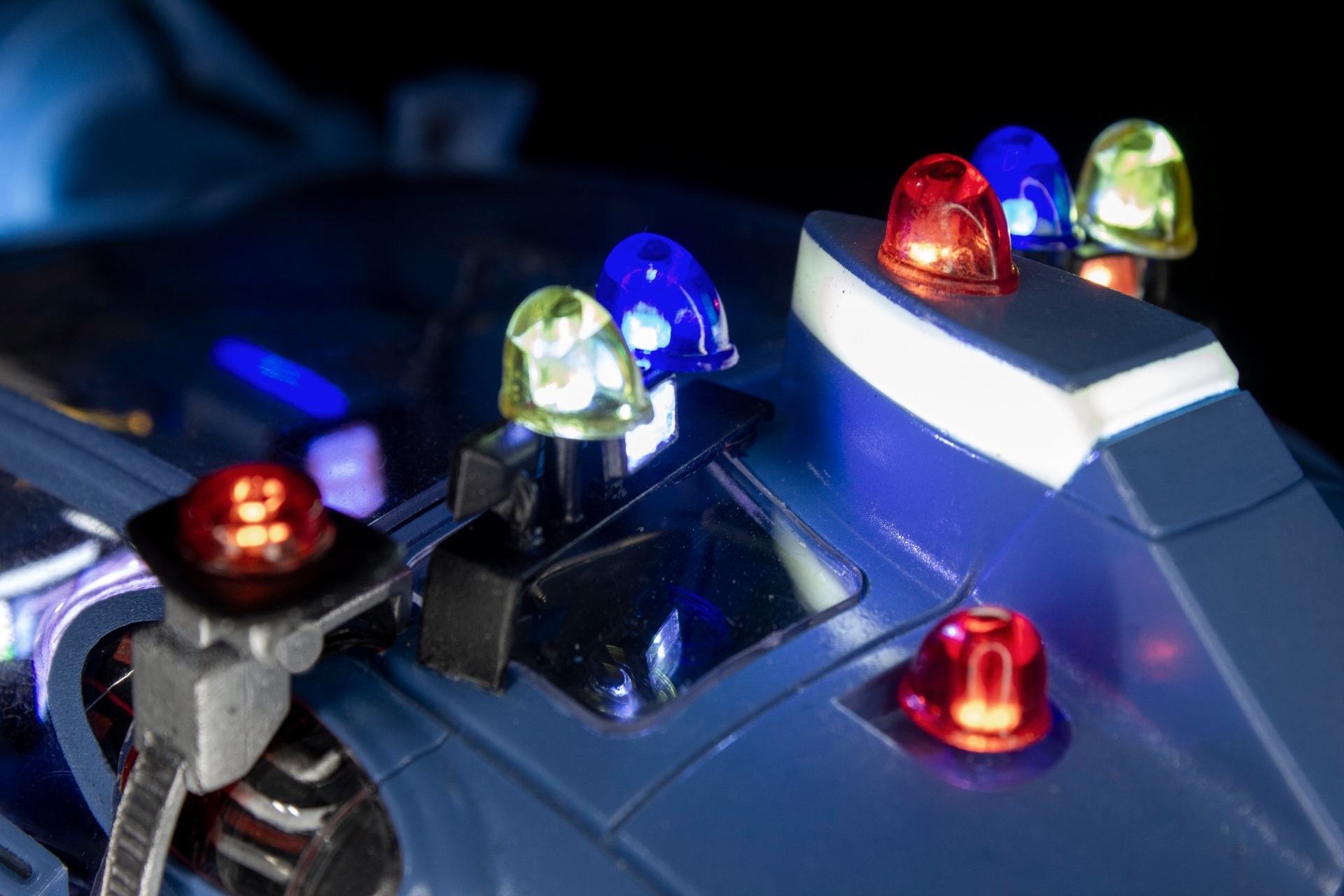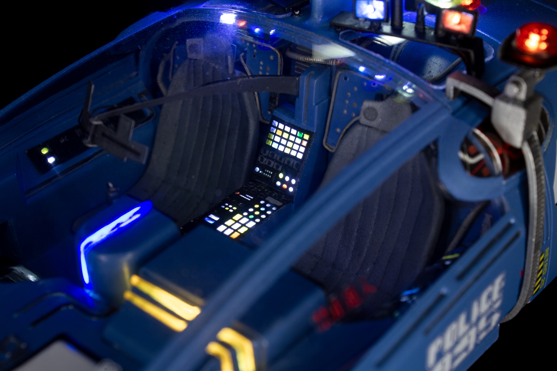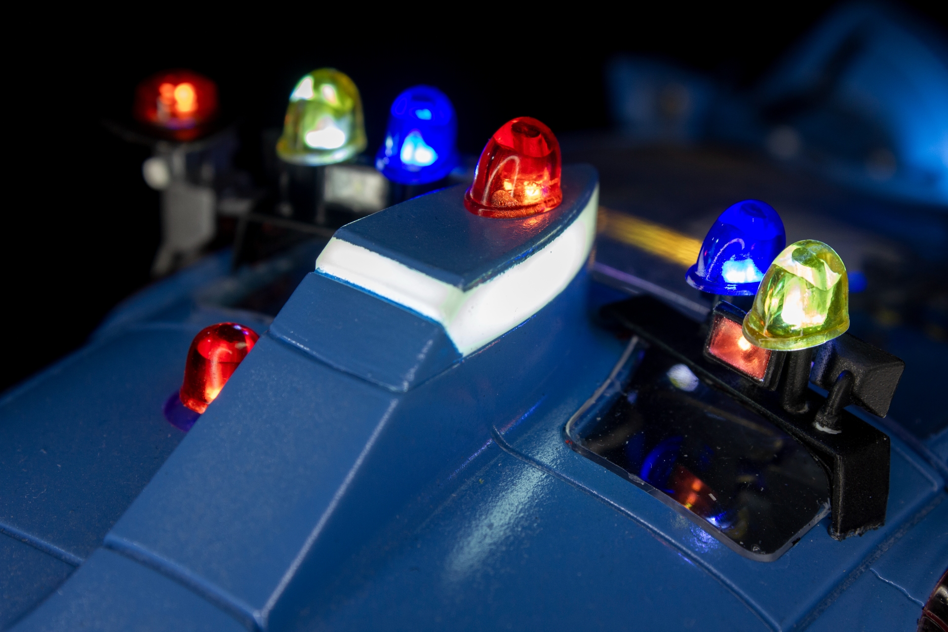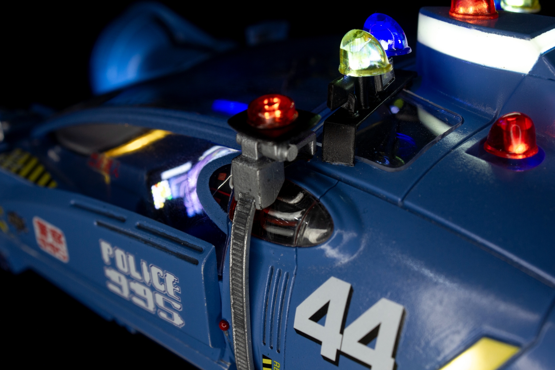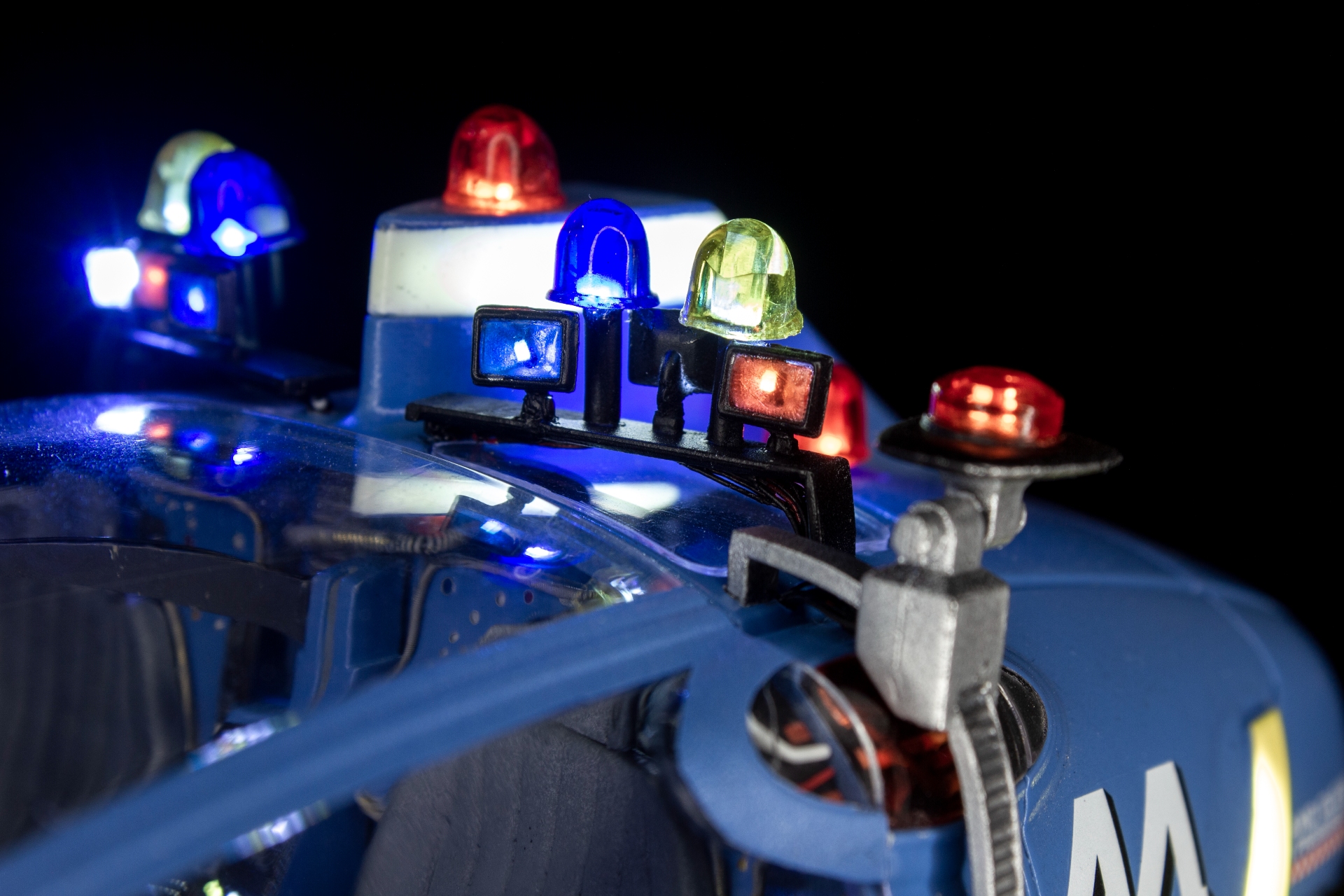 I used 55 SMD LEDs, 4 COB LED strips for lighting the side fenders, main headlight and top white light, and I used an Adafruit Trinket to control the lighting effects of the police lights on the top and bottom of the Spinner.