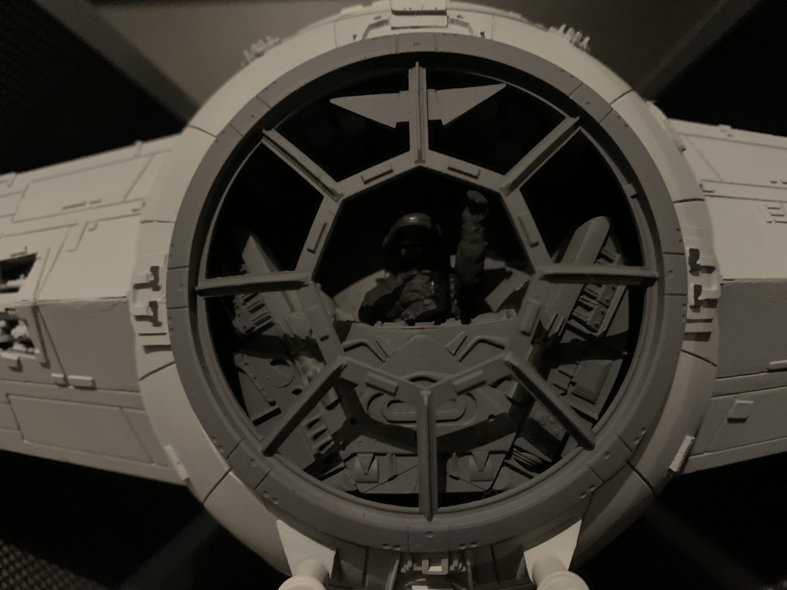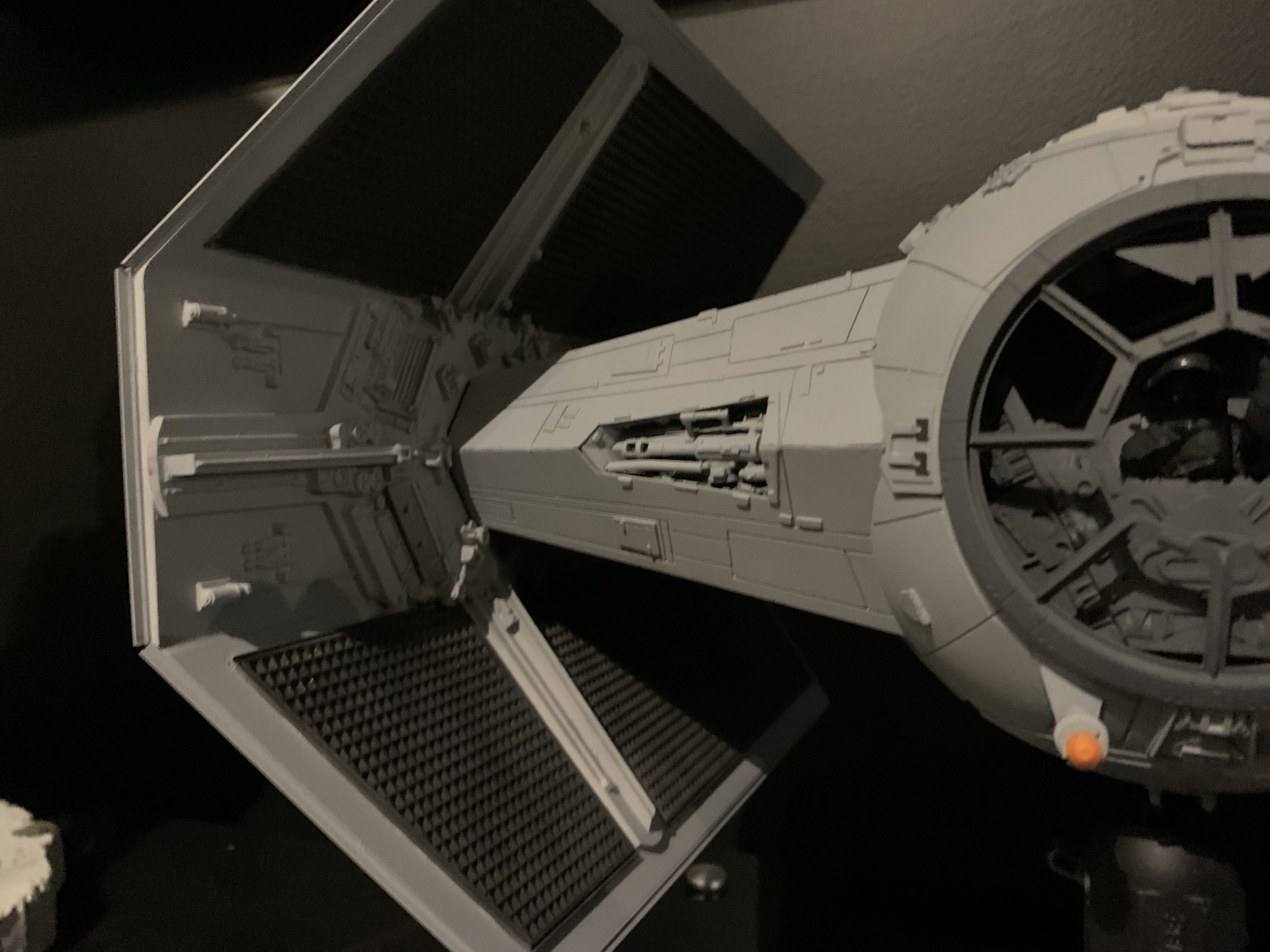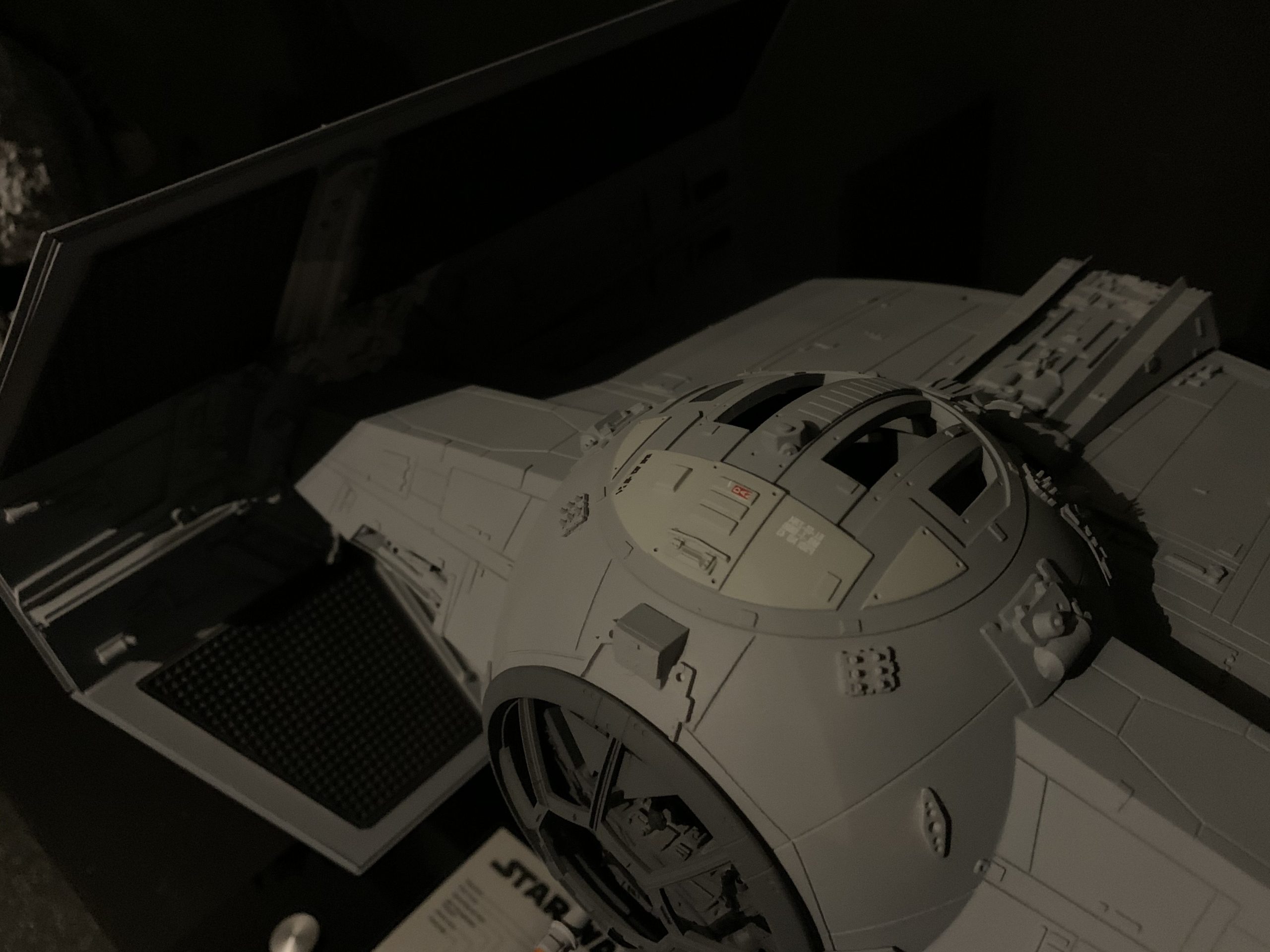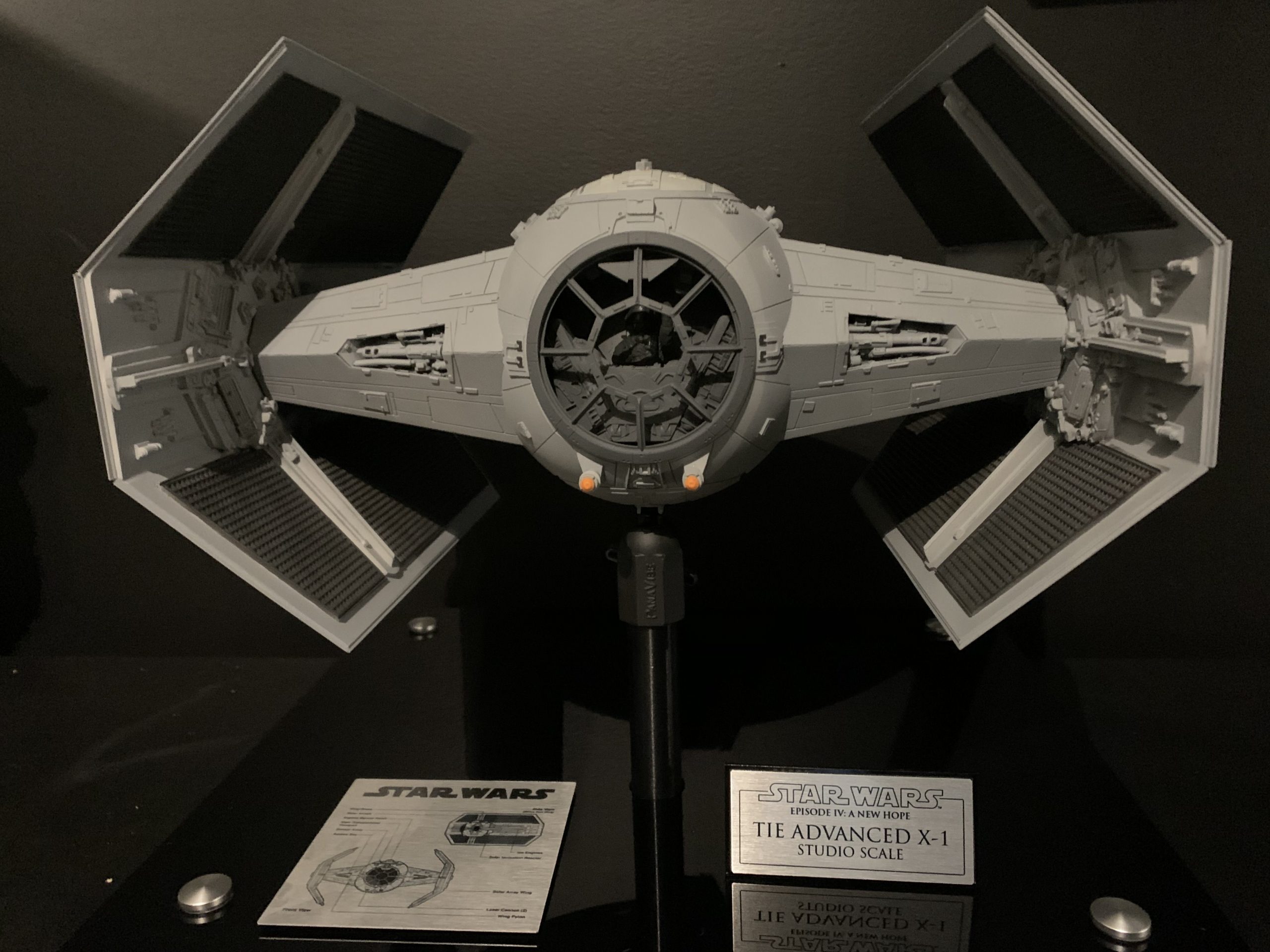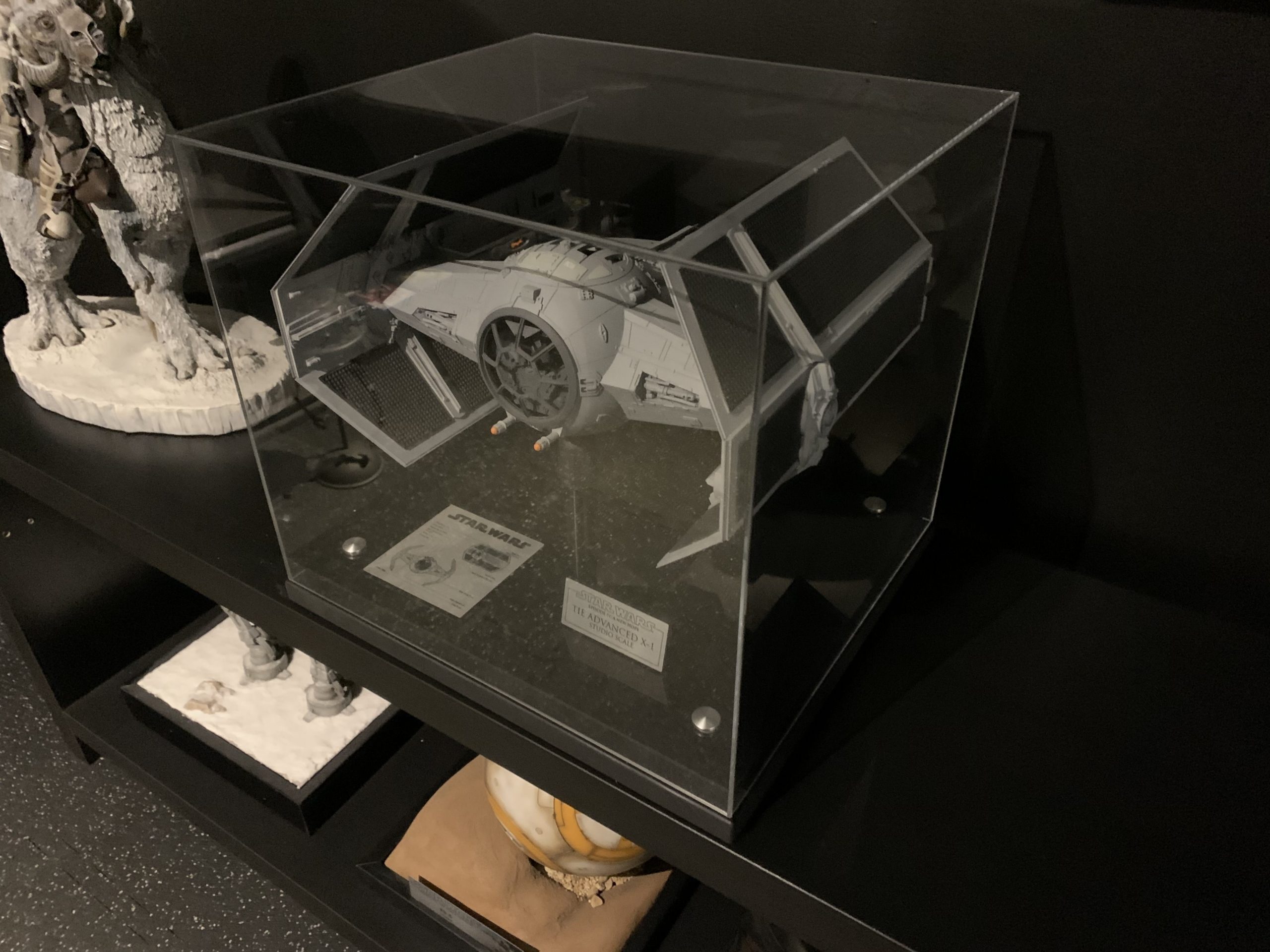 This is the Nice-N Model Designs Tie Advanced studio scale model. It was a straight up build with pretty much zero weathering. I could not see any wear/tear in any of the images I saw so it was difficult to resist going crazy weathering it. Painted with Vallejo Air paints, had some custom plaques and display case made up to give it that museum look.