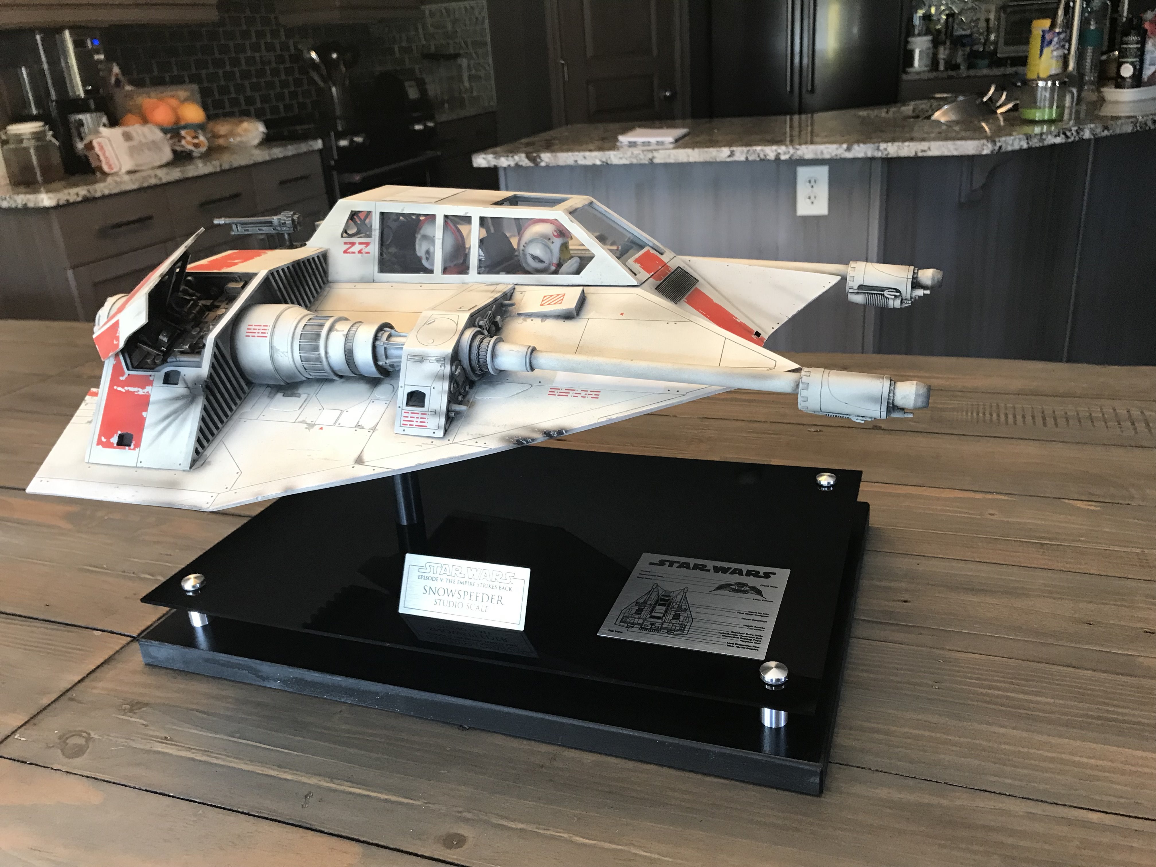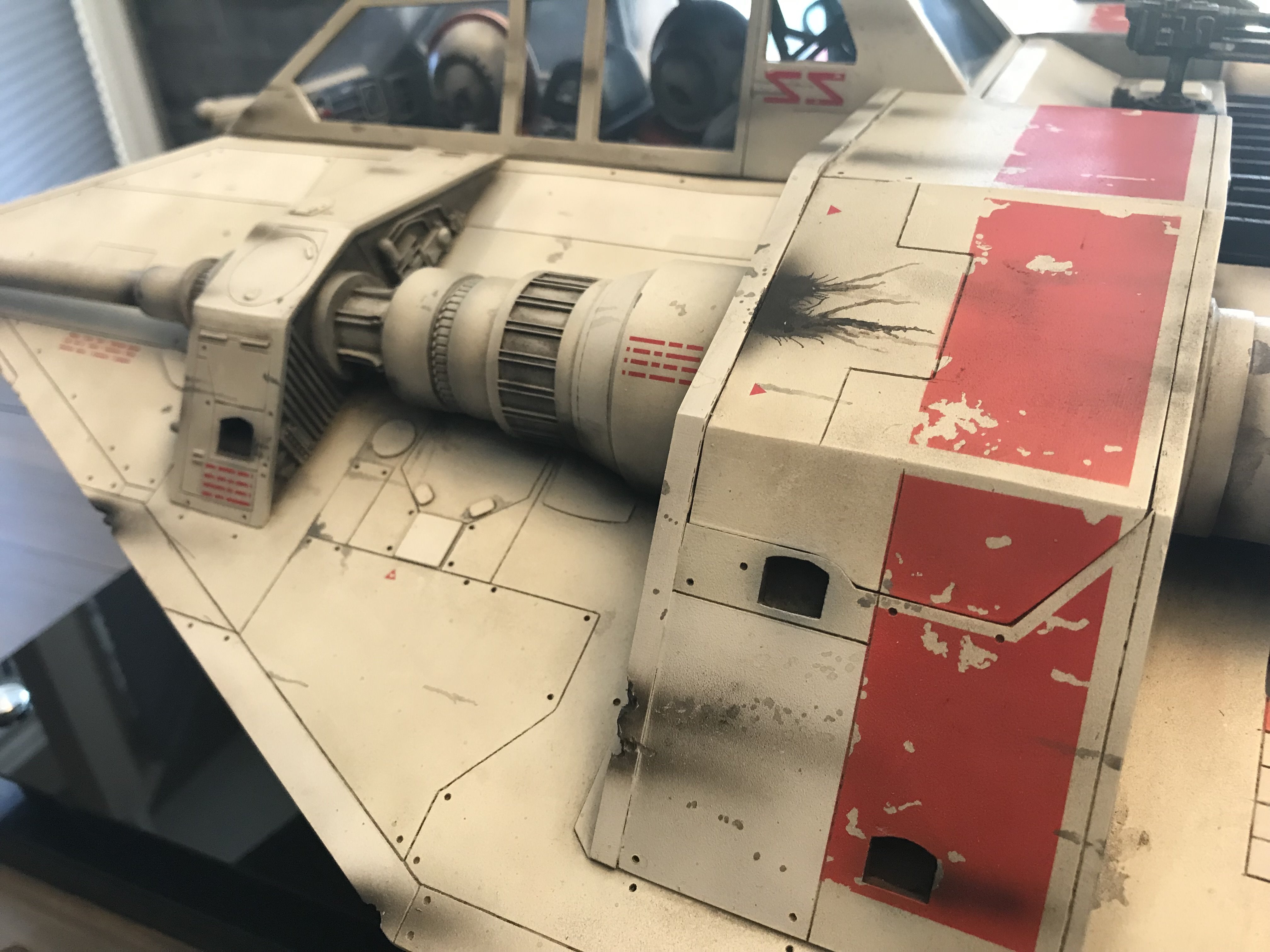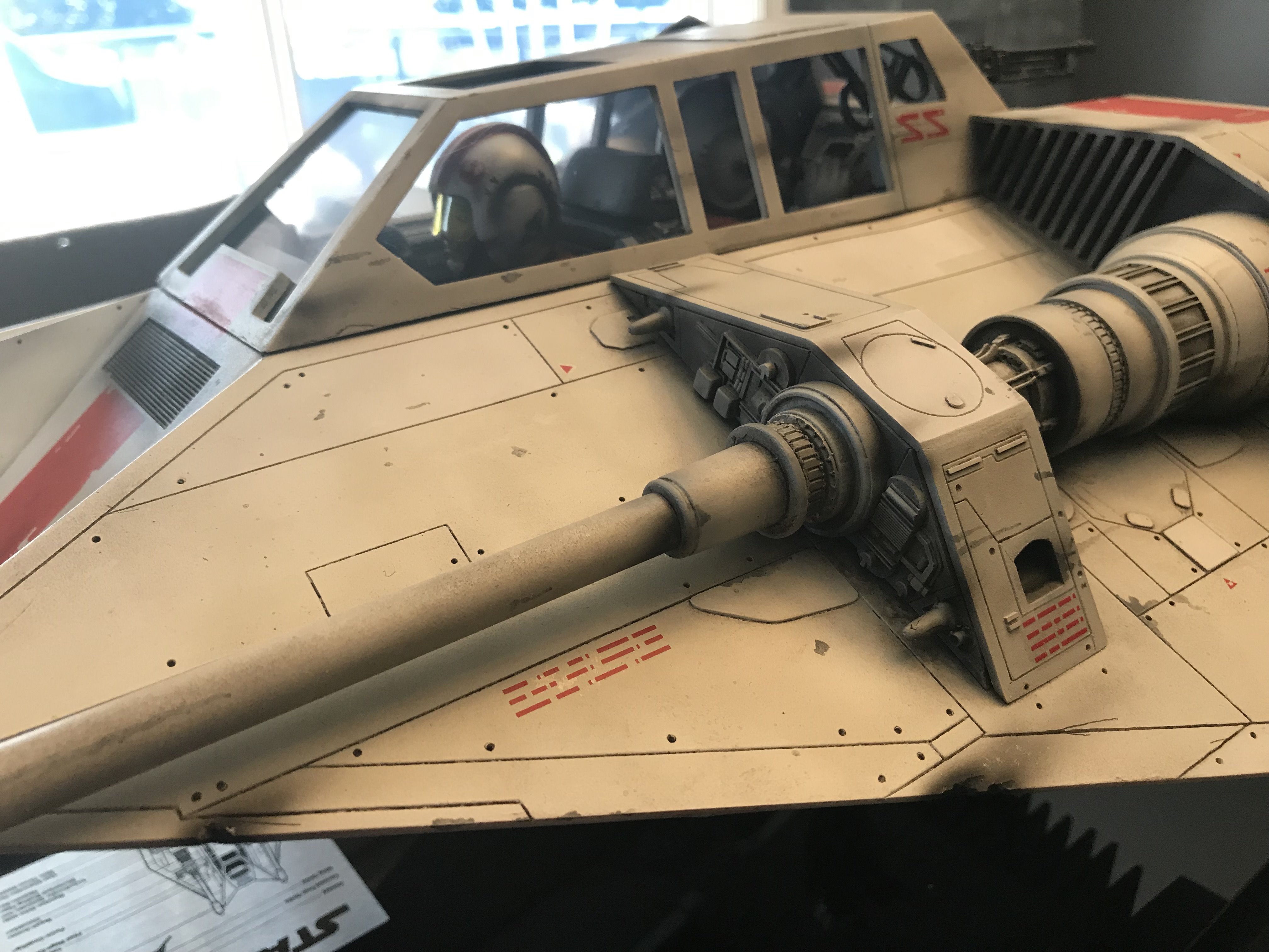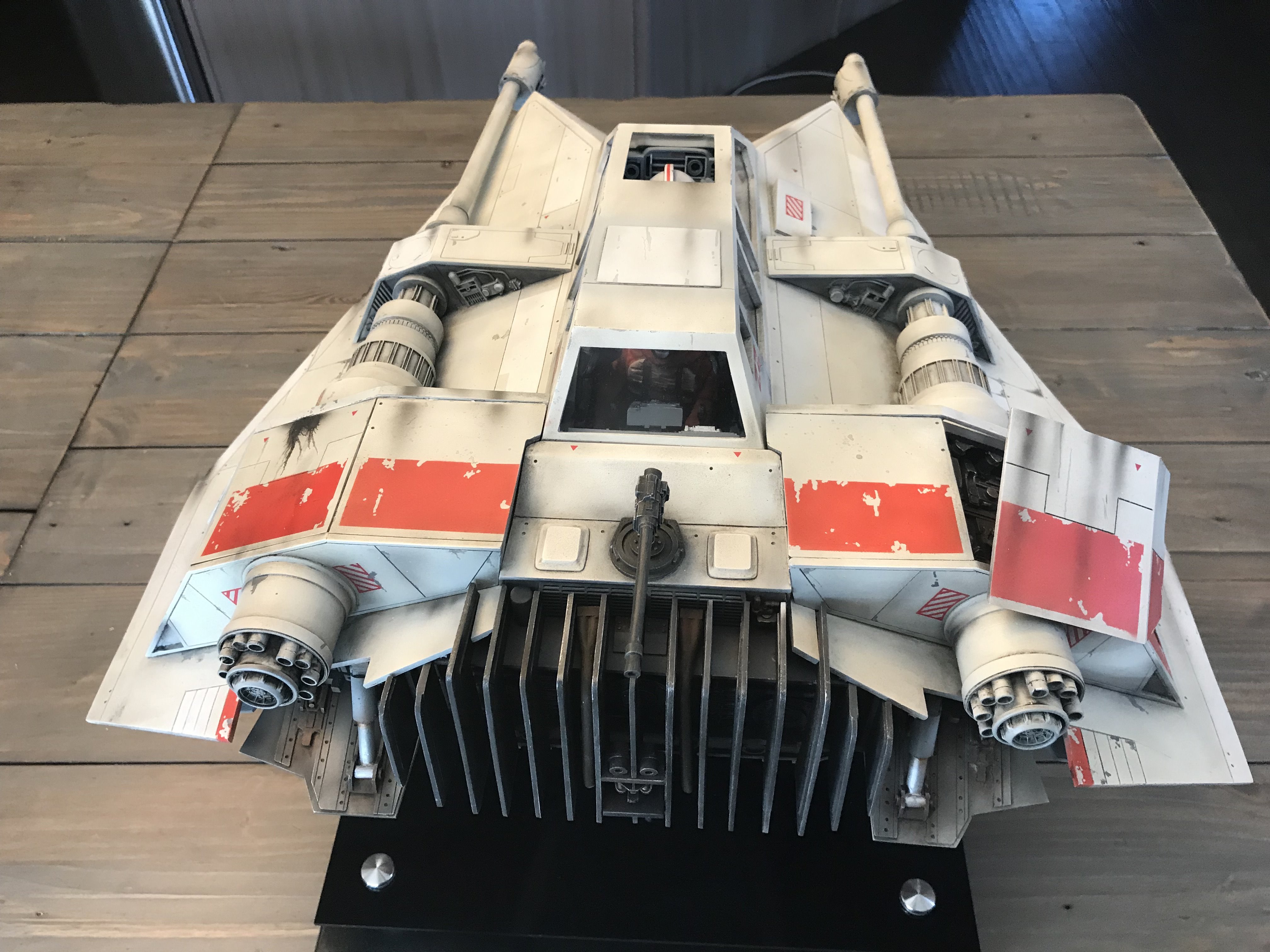This is my Nice-N Studio Scale Snowspeeder. Completed with acrylics and tried to pay homage to the ILM models. I installed clear styrene for the windows although normally I wouldn’t but its such a huge model I kinda went against the grain and installed them. I also decided to give it an oil wash to bring out all those great panel lines with the small rivet holes in them. Also made a custom base and kept it nice and simple.