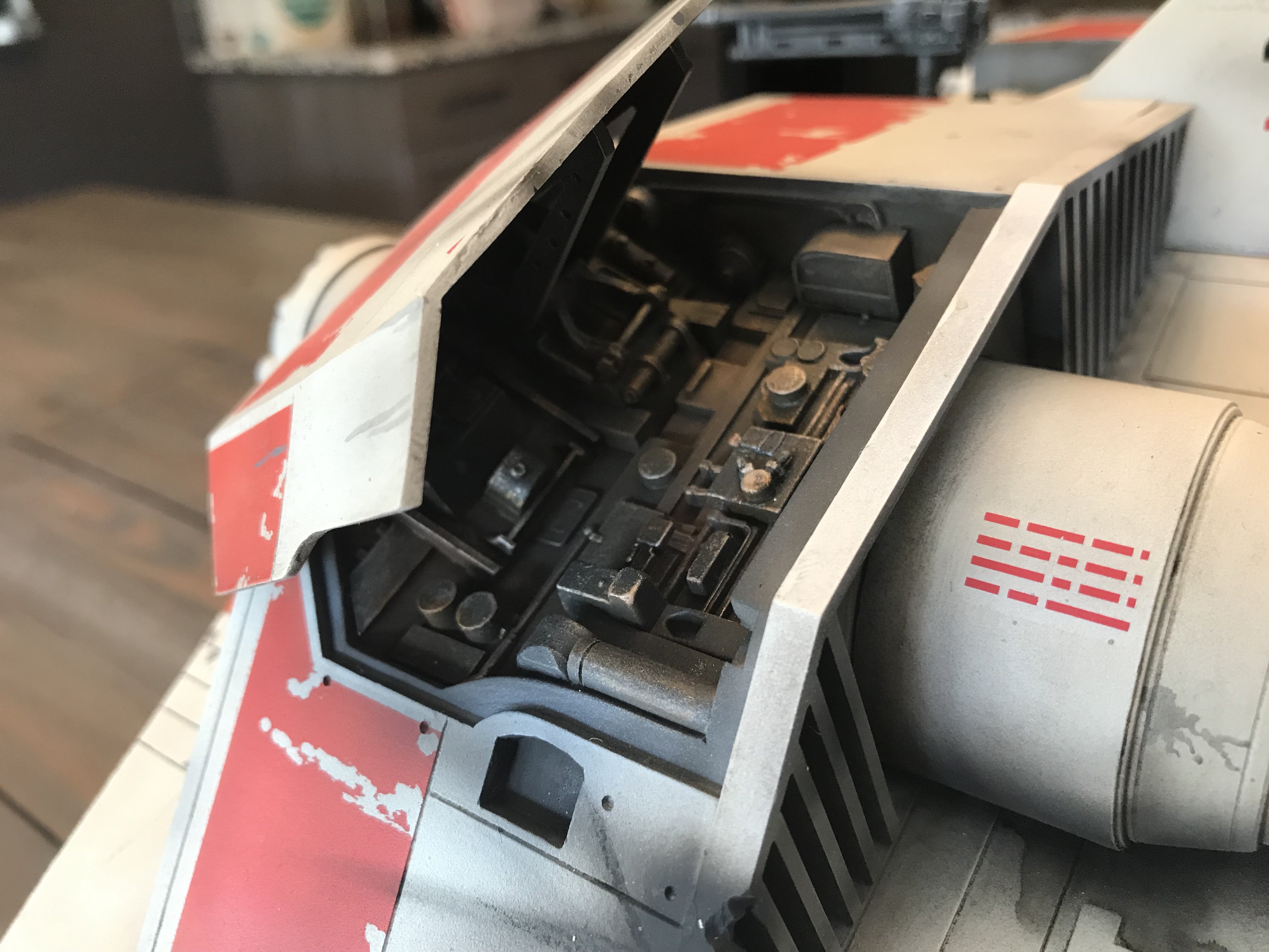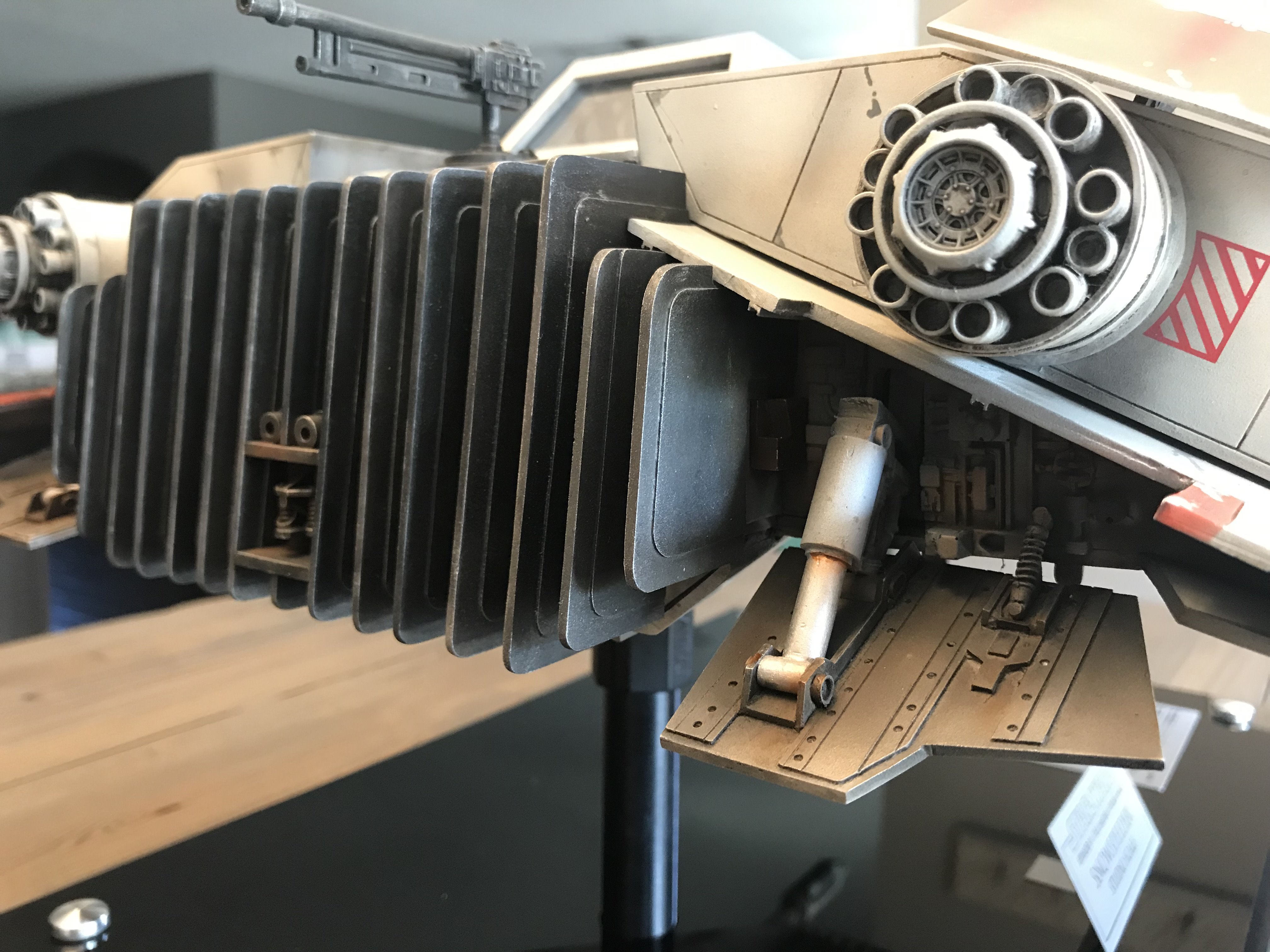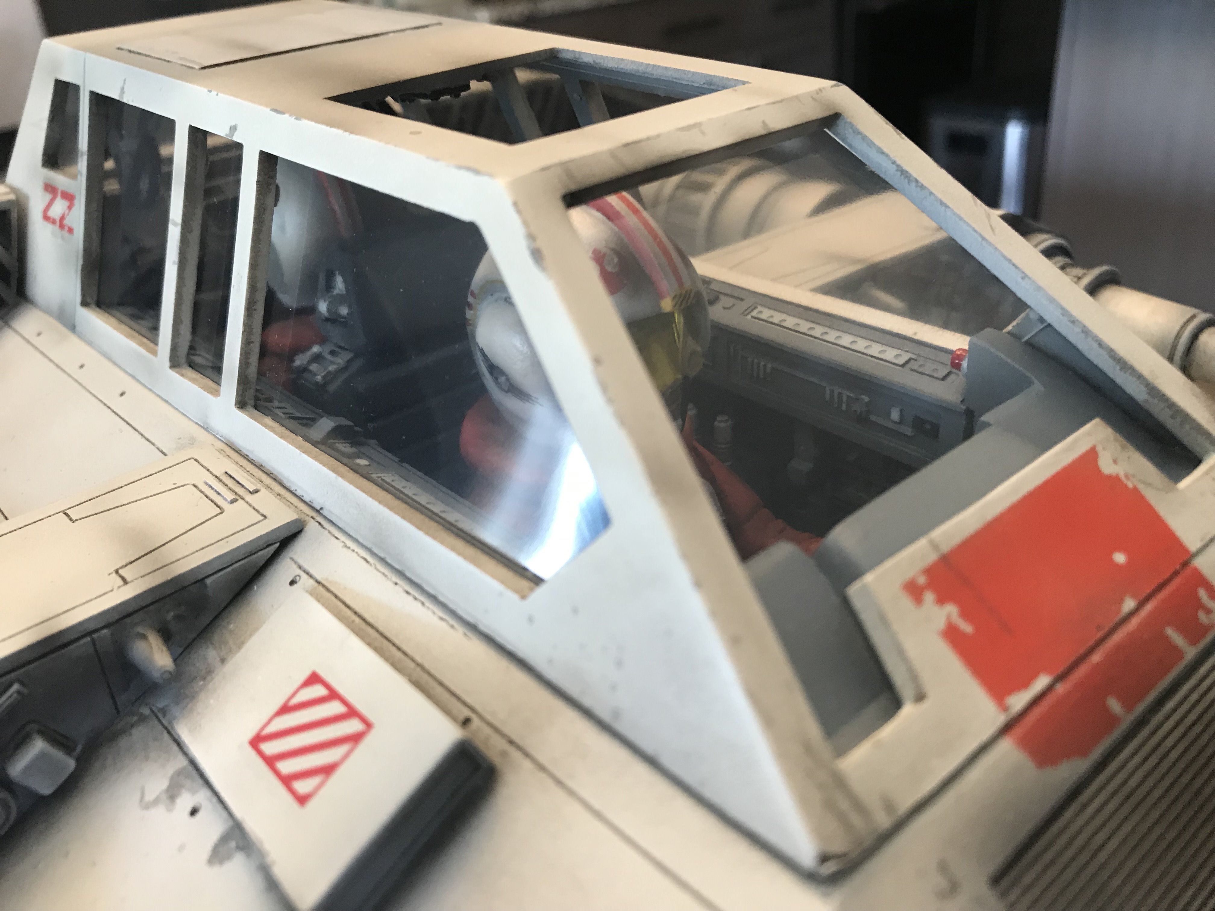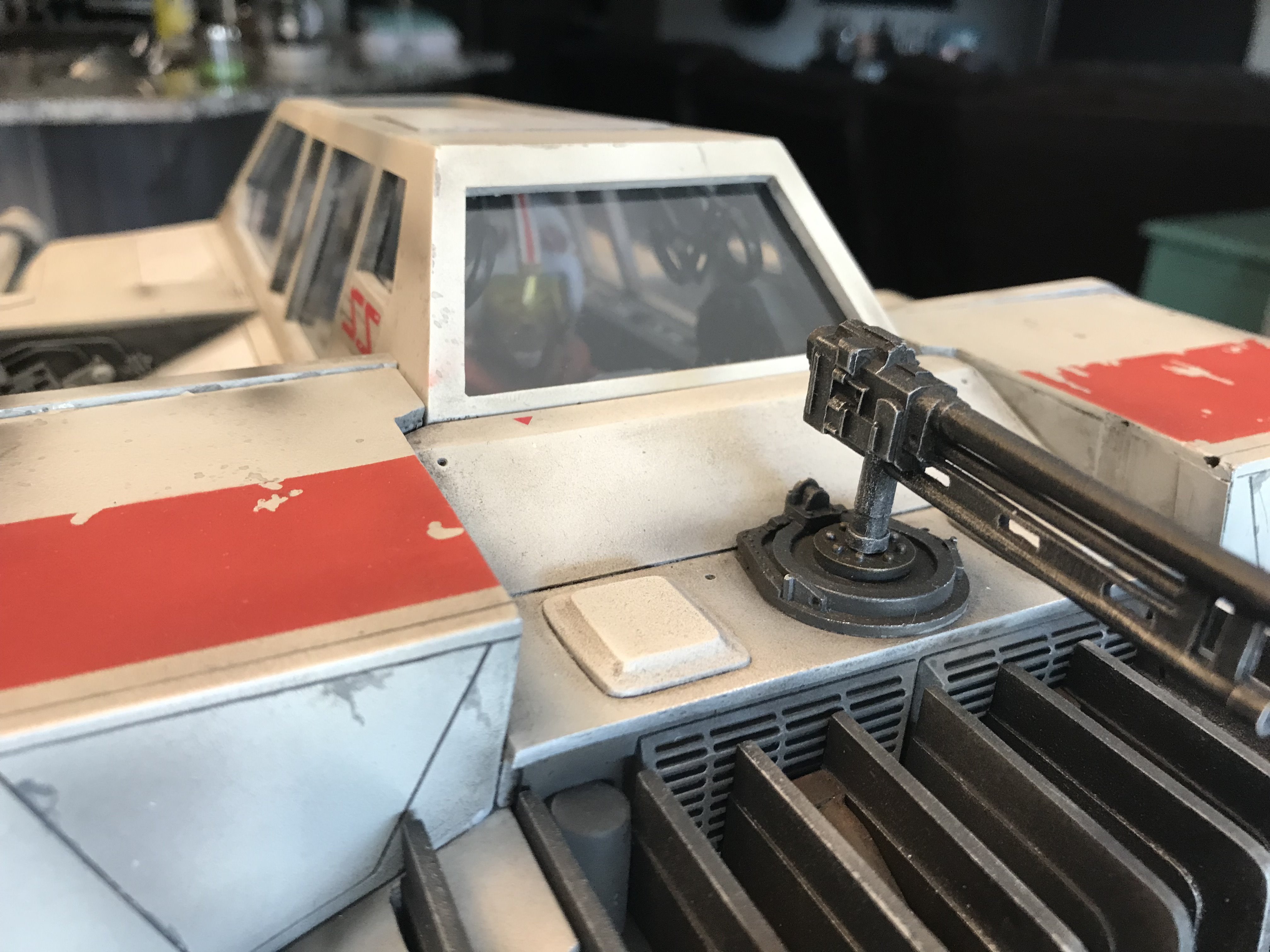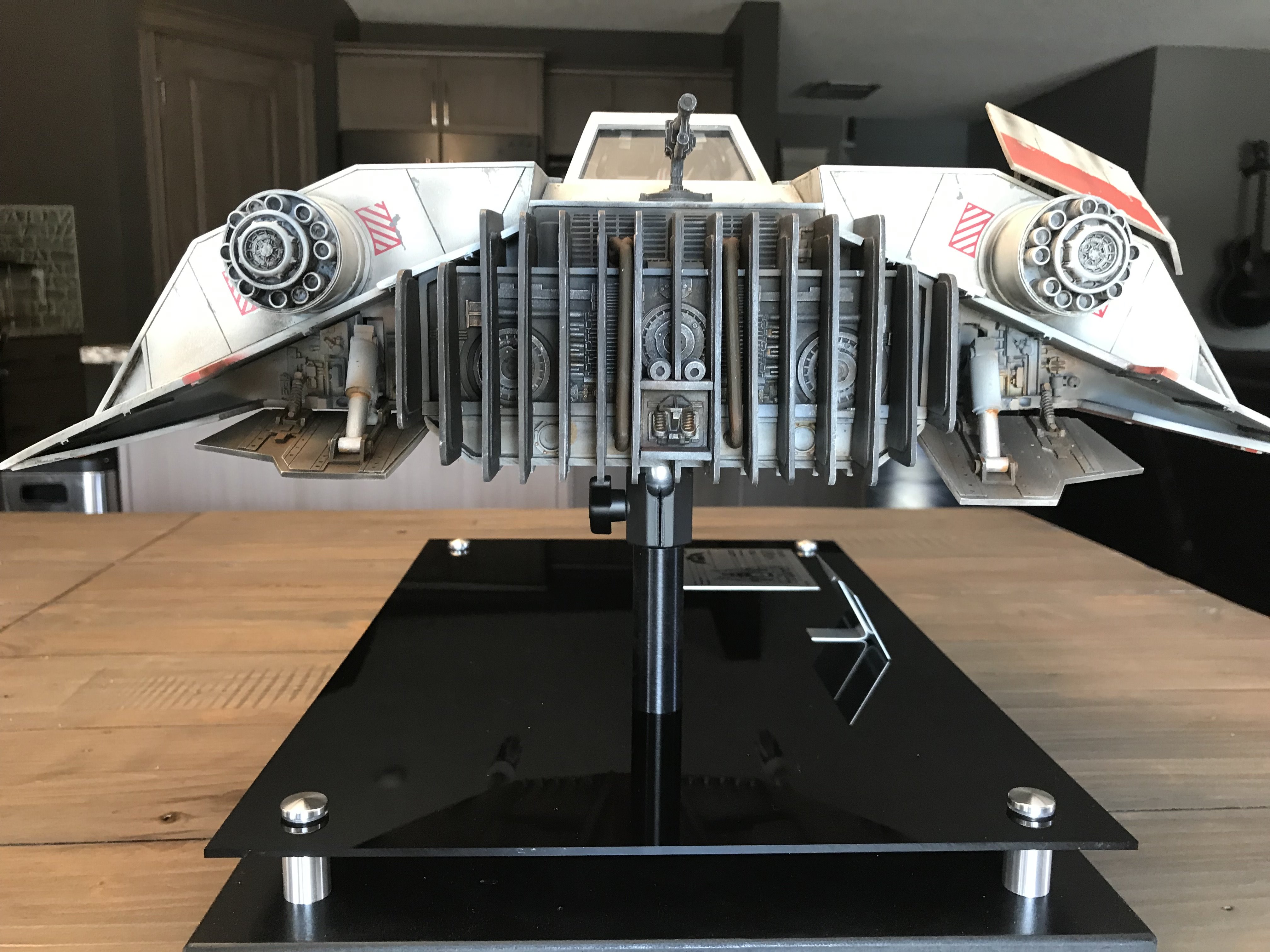 This is my Nice-N Studio Scale Snowspeeder. Completed with acrylics and tried to pay homage to the ILM models. I installed clear styrene for the windows although normally I wouldn’t but its such a huge model I kinda went against the grain and installed them. I also decided to give it an oil wash to bring out all those great panel lines with the small rivet holes in them. Also made a custom base and kept it nice and simple.