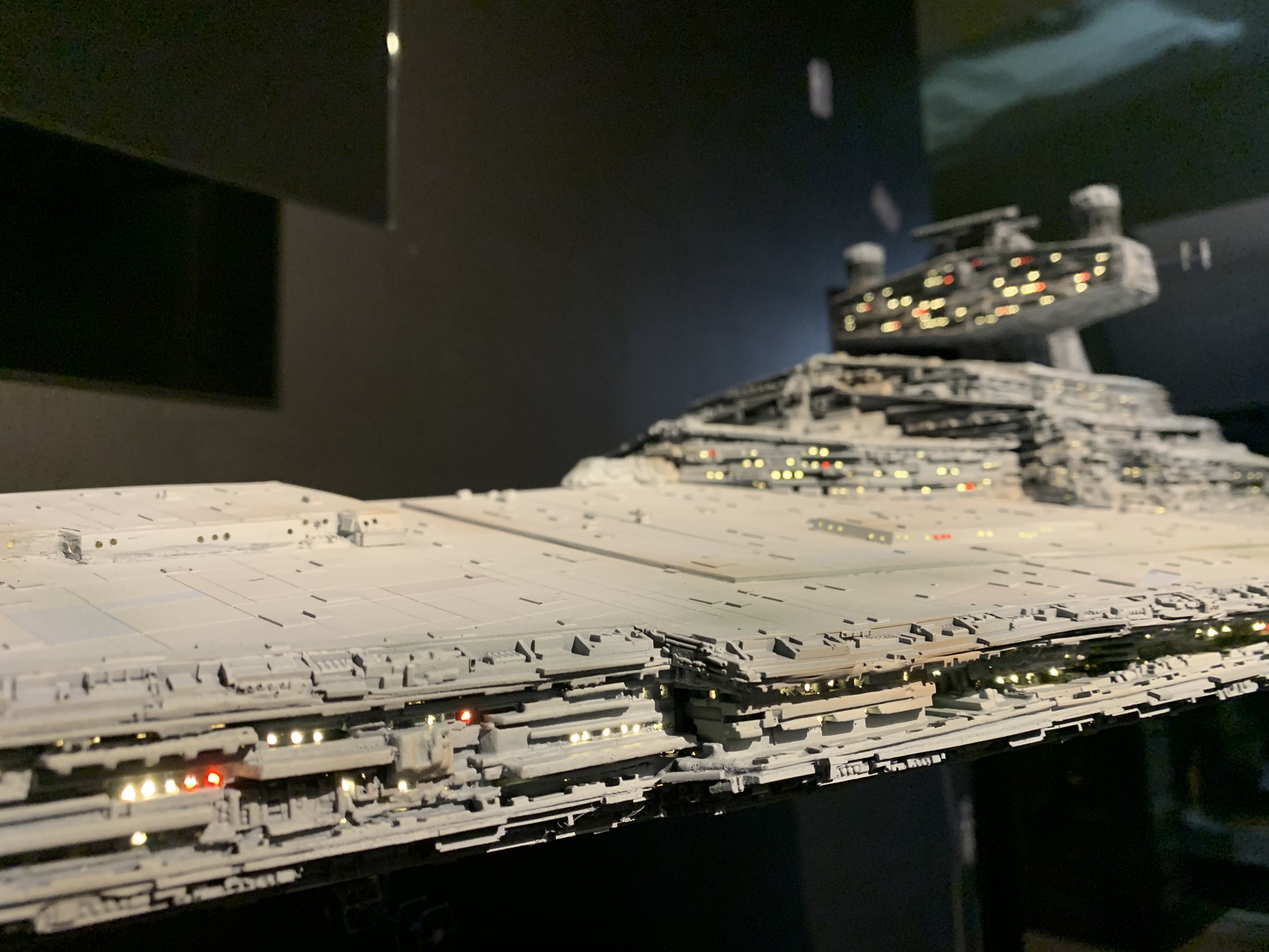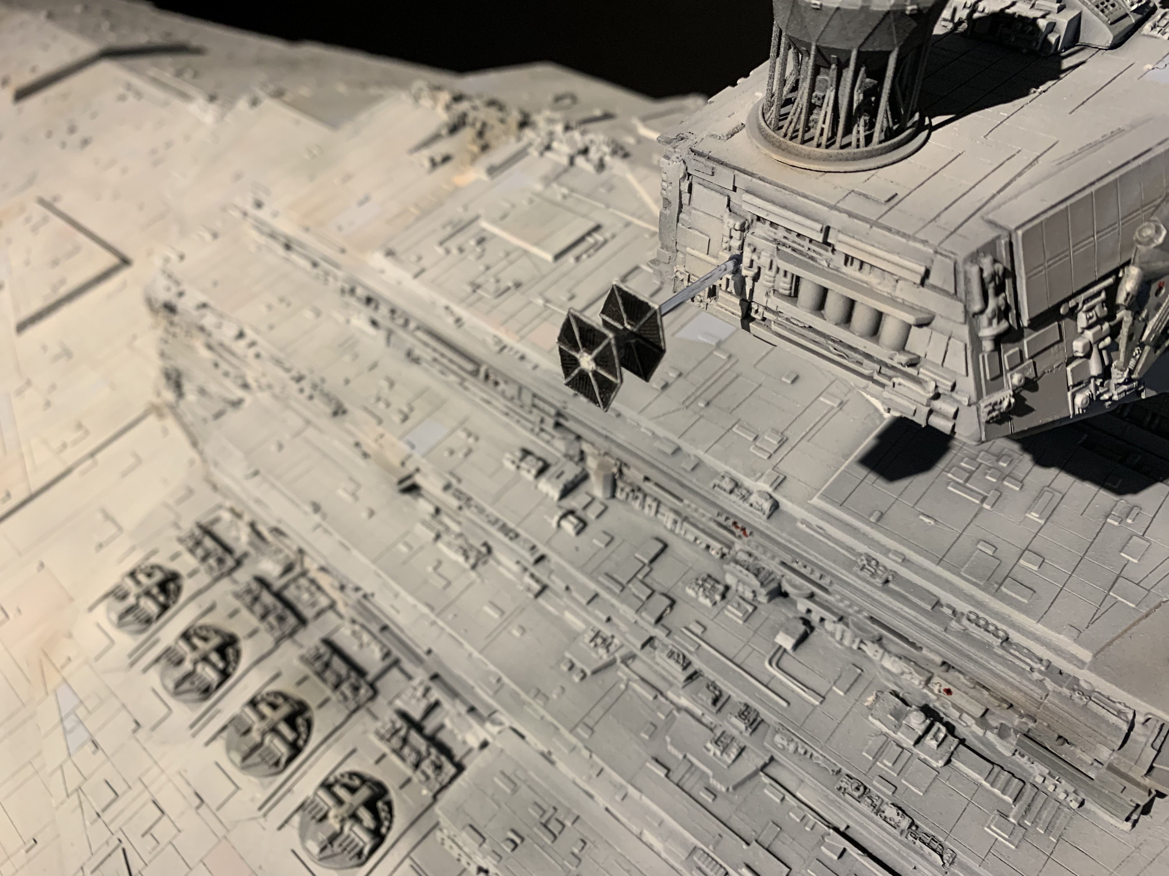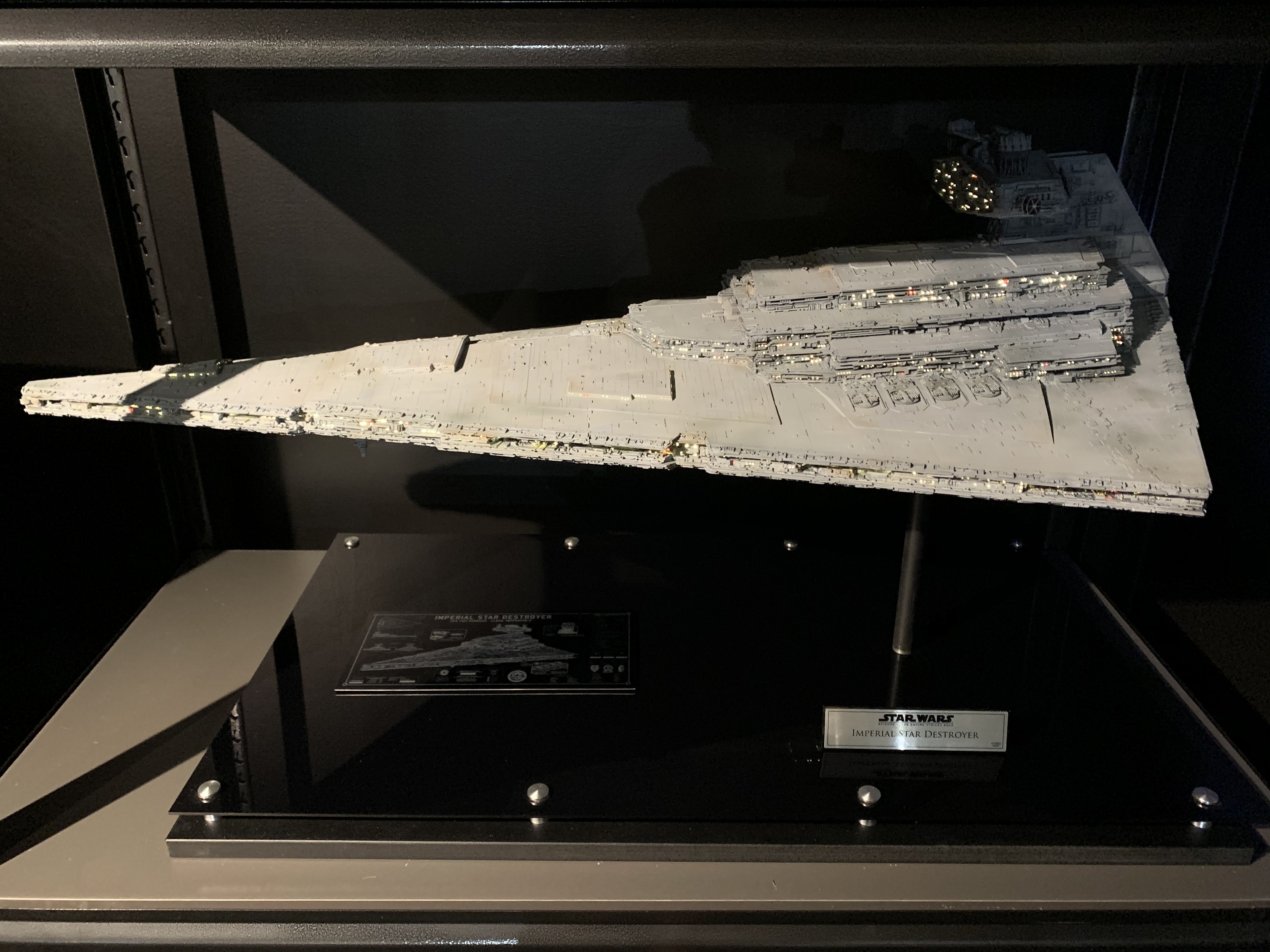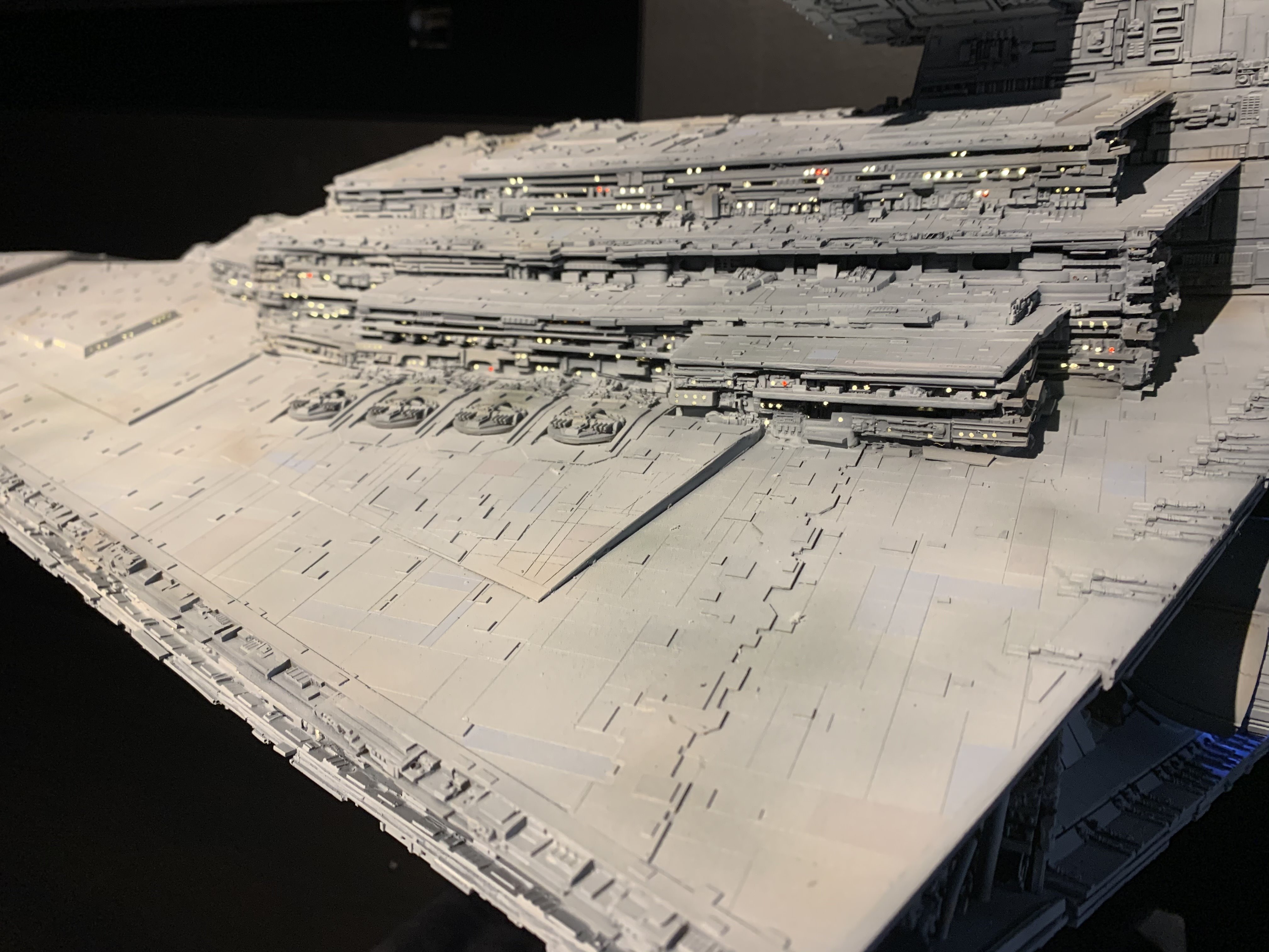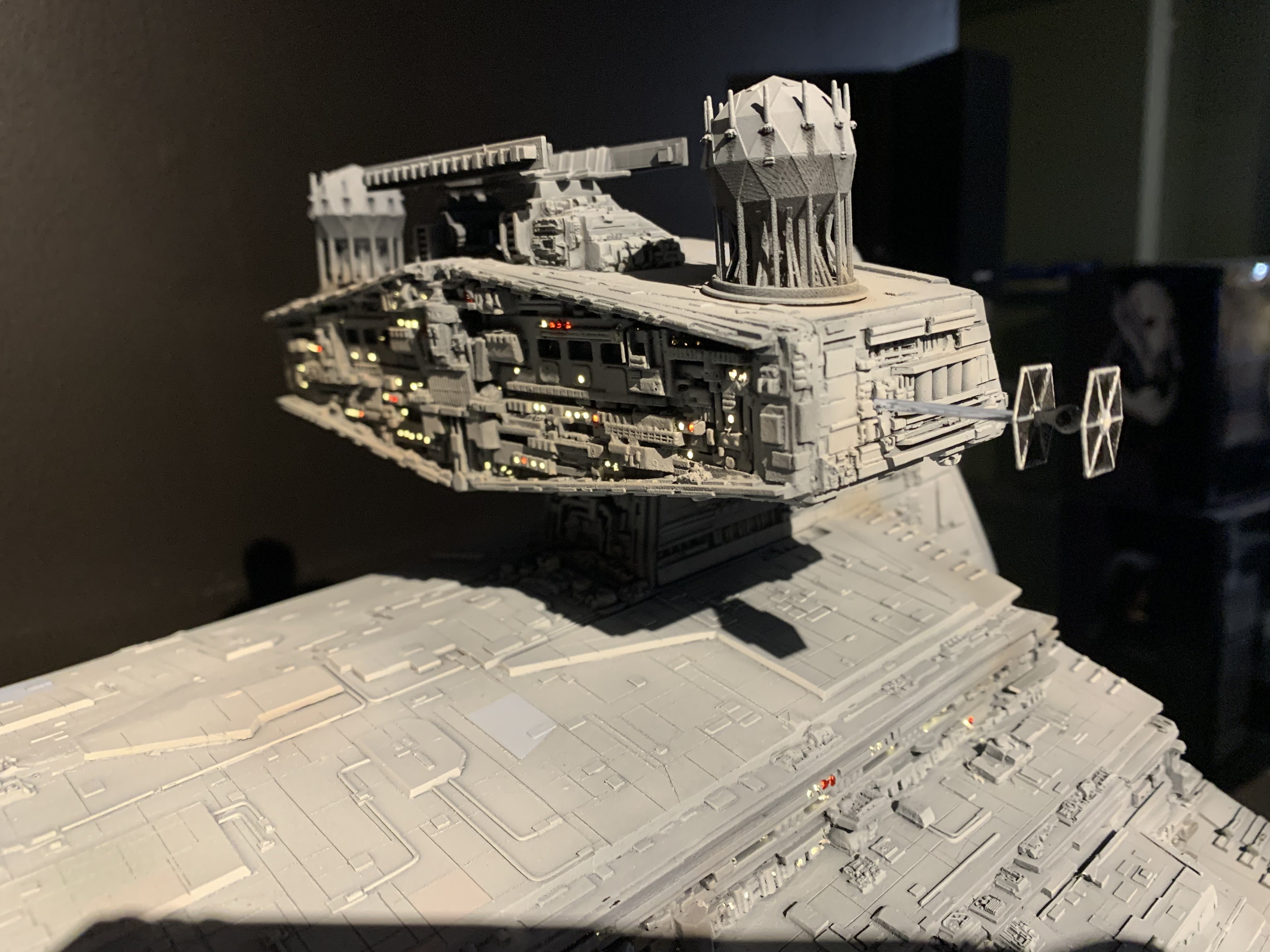 I just finished a monster of a model. Here is my vision of Randy Coopers 1/1500 ISD. I added extra piping to the rear corner engine areas as well as lots of extra detail bits on other parts as well. I really just picked and choose from various ISD’s that I thought looked really cool. I used Mission Model Paints on this and added extra panel colors such as purple/blue and grey hues, it gave me the look I was going for. I had some Tie Fighters as well as Imperial Shuttle printed and feel it added a pretty neat ROTJ feel to it, I made the Ties a little larger just so they would look like actual Tie Fighters rather than tiny specs, it gave the impression I was going for. The lights are not fiber optic but rather clear resin that is back lit, using a pin vice to remove small circles of paint to reveal the light in behind it. I added a dim, red glow to the garbage chute and gave it a honeycomb texture to it. I ran a 1/2″ metal pipe thru it and is powered by a 12v wall plug. The three large engine bells are lit using 3, 5 mm flickering LED’s to give a larger spread of light. I finished it off once again with a custom base, spec plaque and ID plaque. This is a very impressive model when seen in person and is now my favorite build.