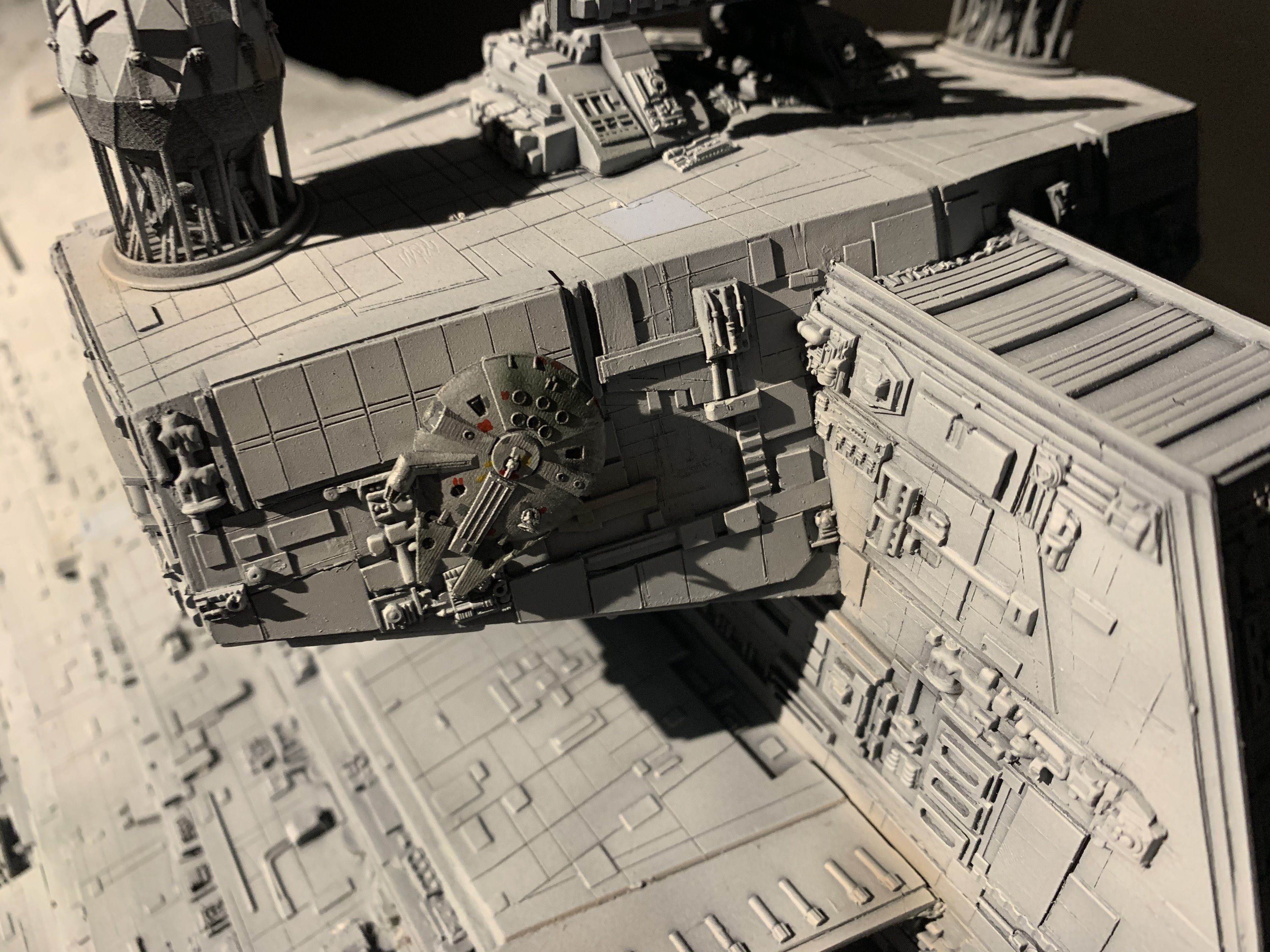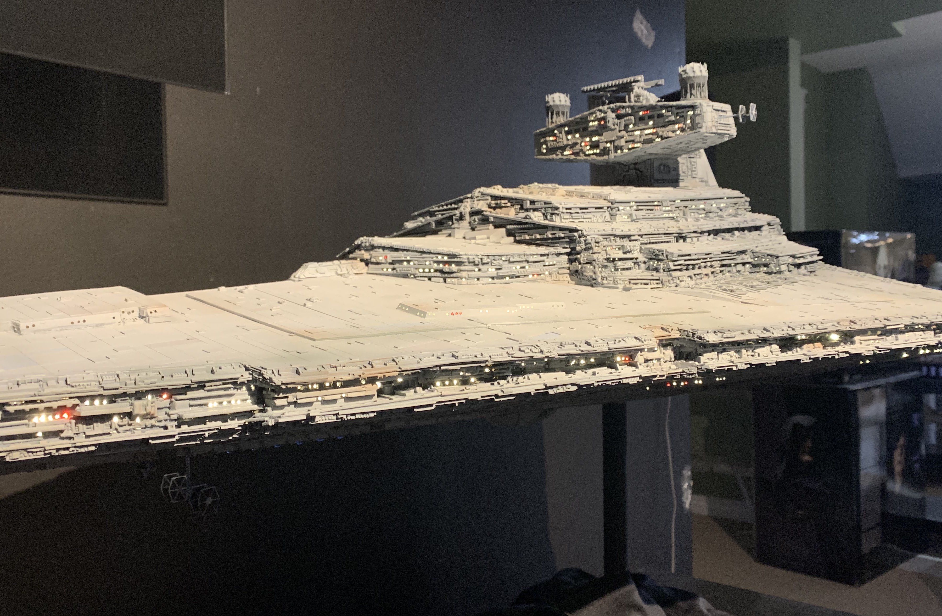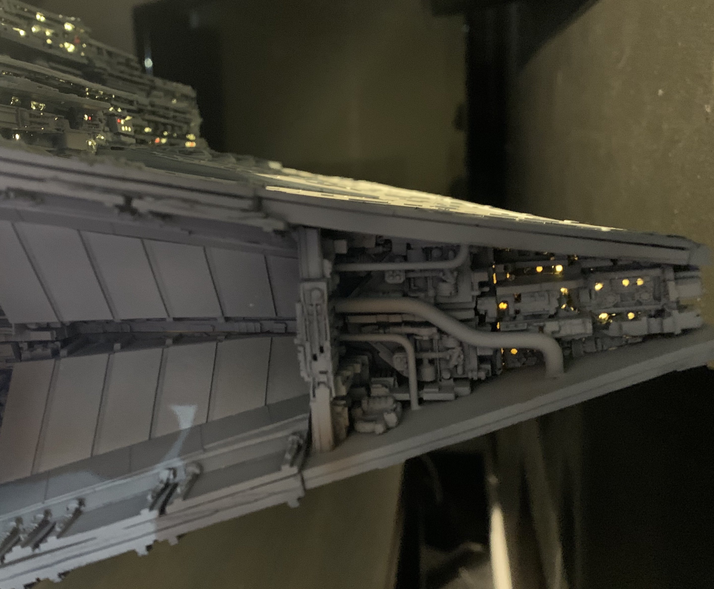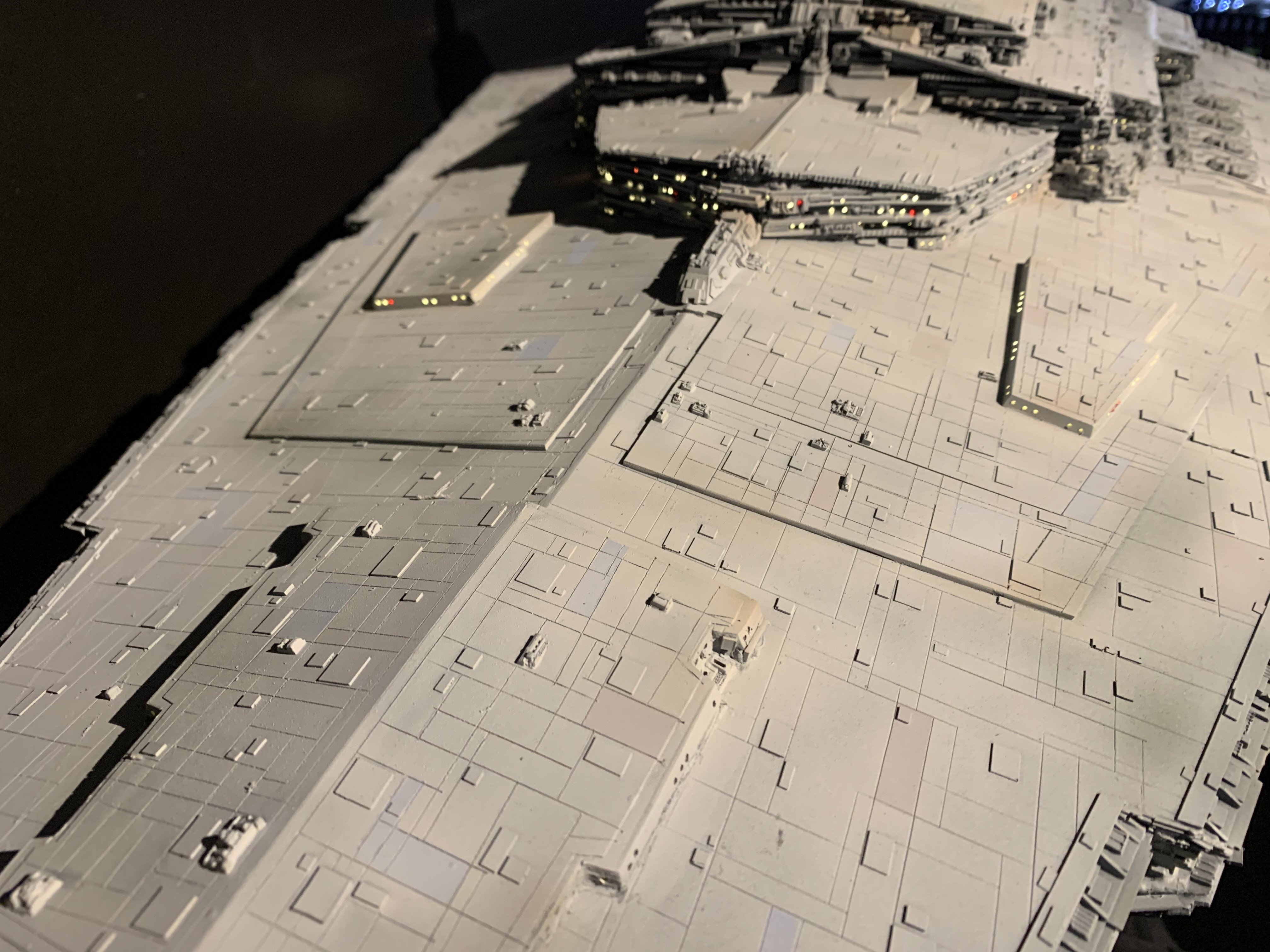 I just finished a monster of a model. Here is my vision of Randy Coopers 1/1500 ISD. I added extra piping to the rear corner engine areas as well as lots of extra detail bits on other parts as well. I really just picked and choose from various ISD’s that I thought looked really cool. I used Mission Model Paints on this and added extra panel colors such as purple/blue and grey hues, it gave me the look I was going for. I had some Tie Fighters as well as Imperial Shuttle printed and feel it added a pretty neat ROTJ feel to it, I made the Ties a little larger just so they would look like actual Tie Fighters rather than tiny specs, it gave the impression I was going for. The lights are not fiber optic but rather clear resin that is back lit, using a pin vice to remove small circles of paint to reveal the light in behind it. I added a dim, red glow to the garbage chute and gave it a honeycomb texture to it. I ran a 1/2″ metal pipe thru it and is powered by a 12v wall plug. The three large engine bells are lit using 3, 5 mm flickering LED’s to give a larger spread of light. I finished it off once again with a custom base, spec plaque and ID plaque. This is a very impressive model when seen in person and is now my favorite build.
