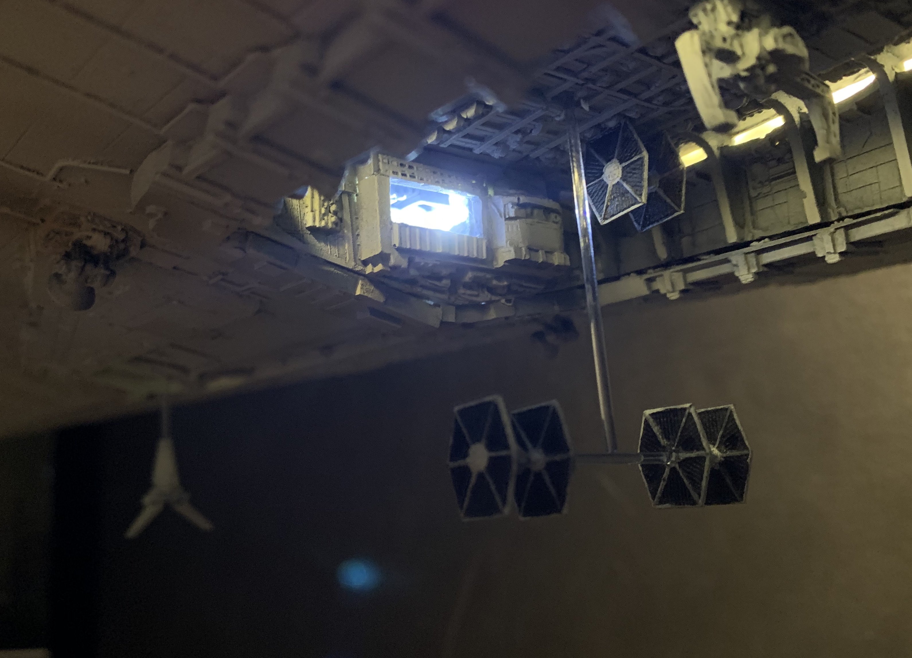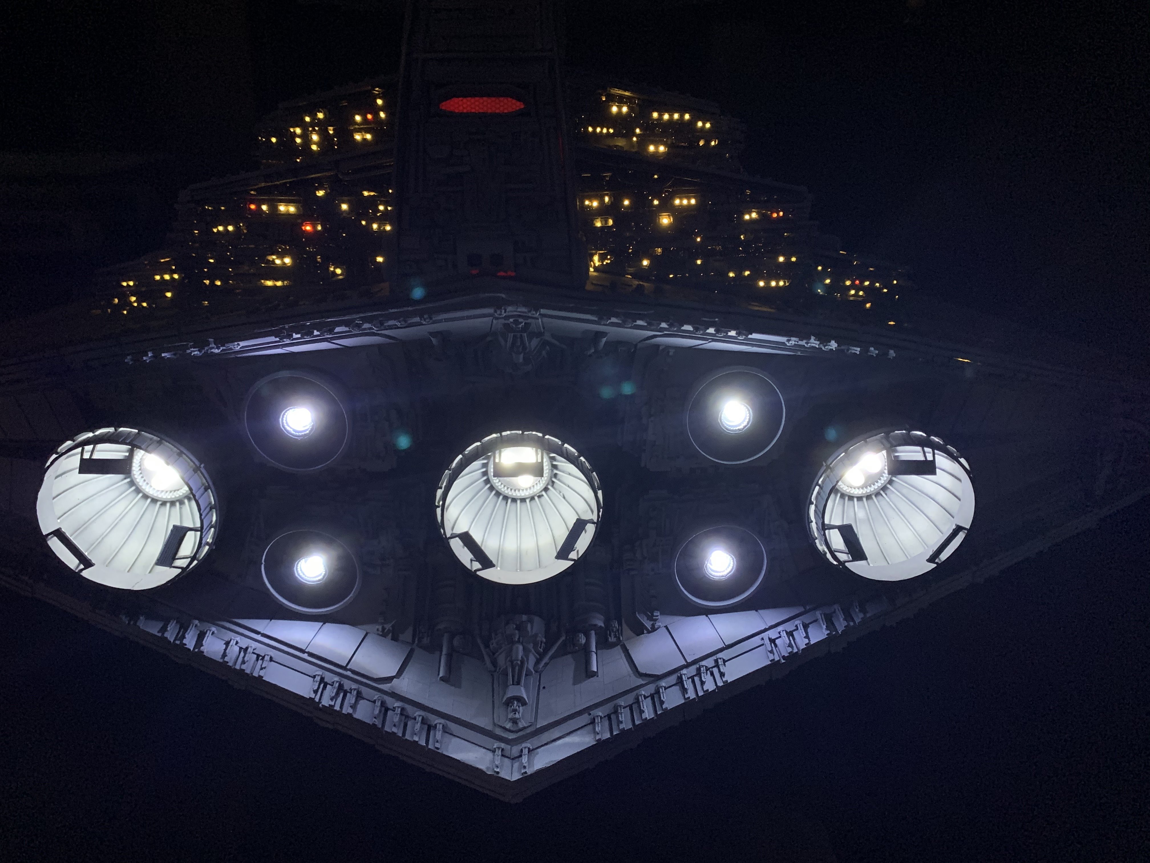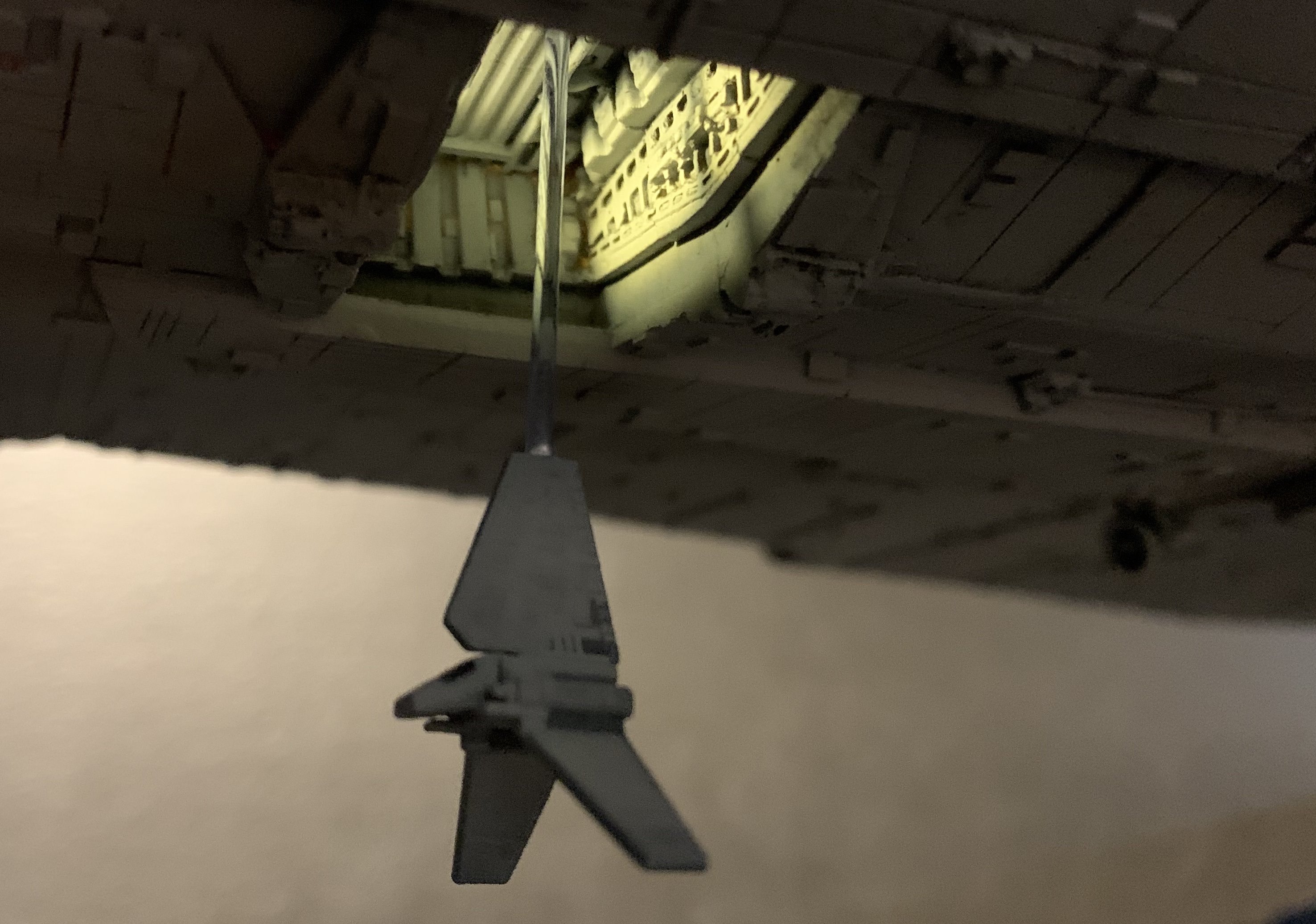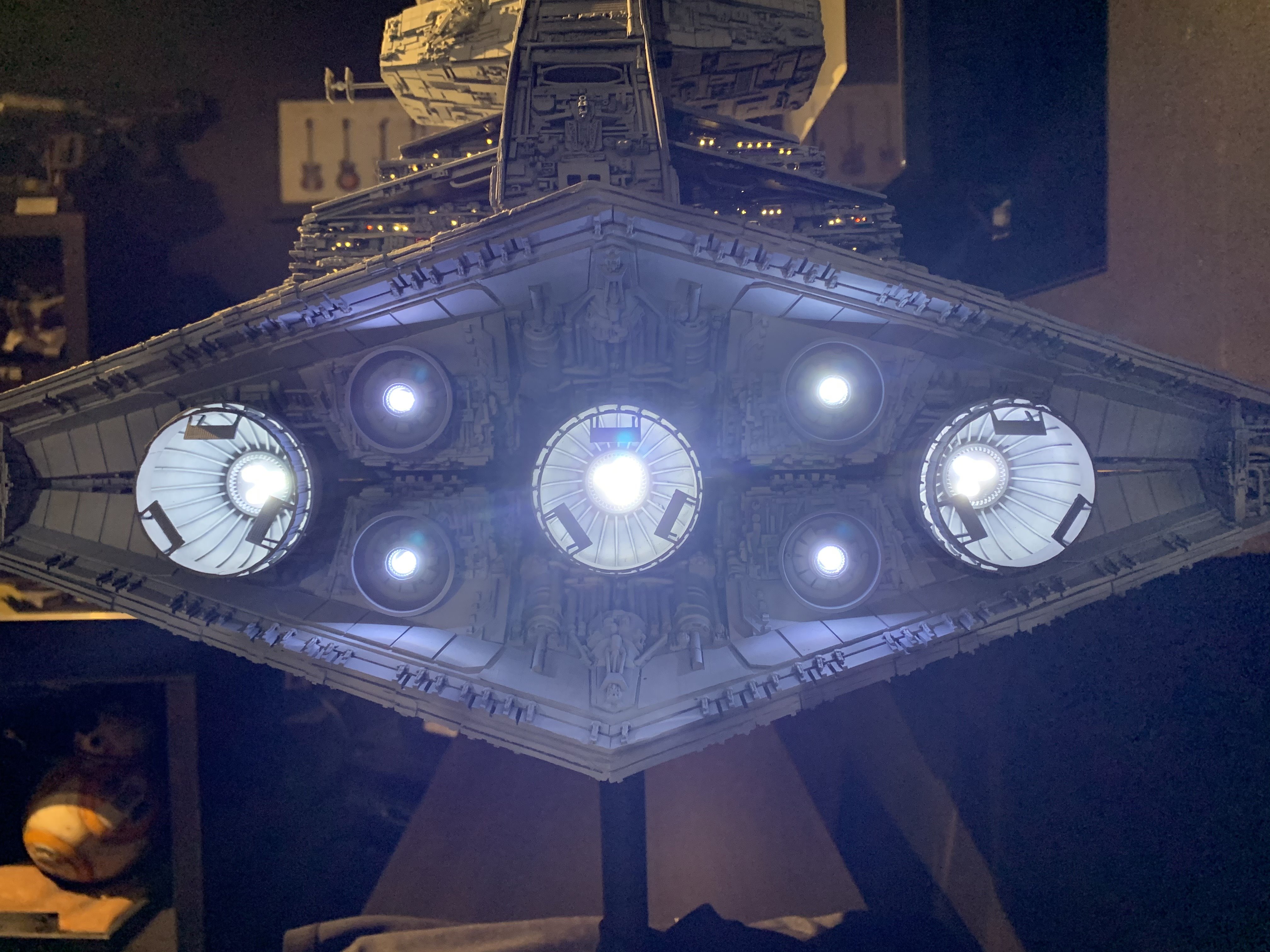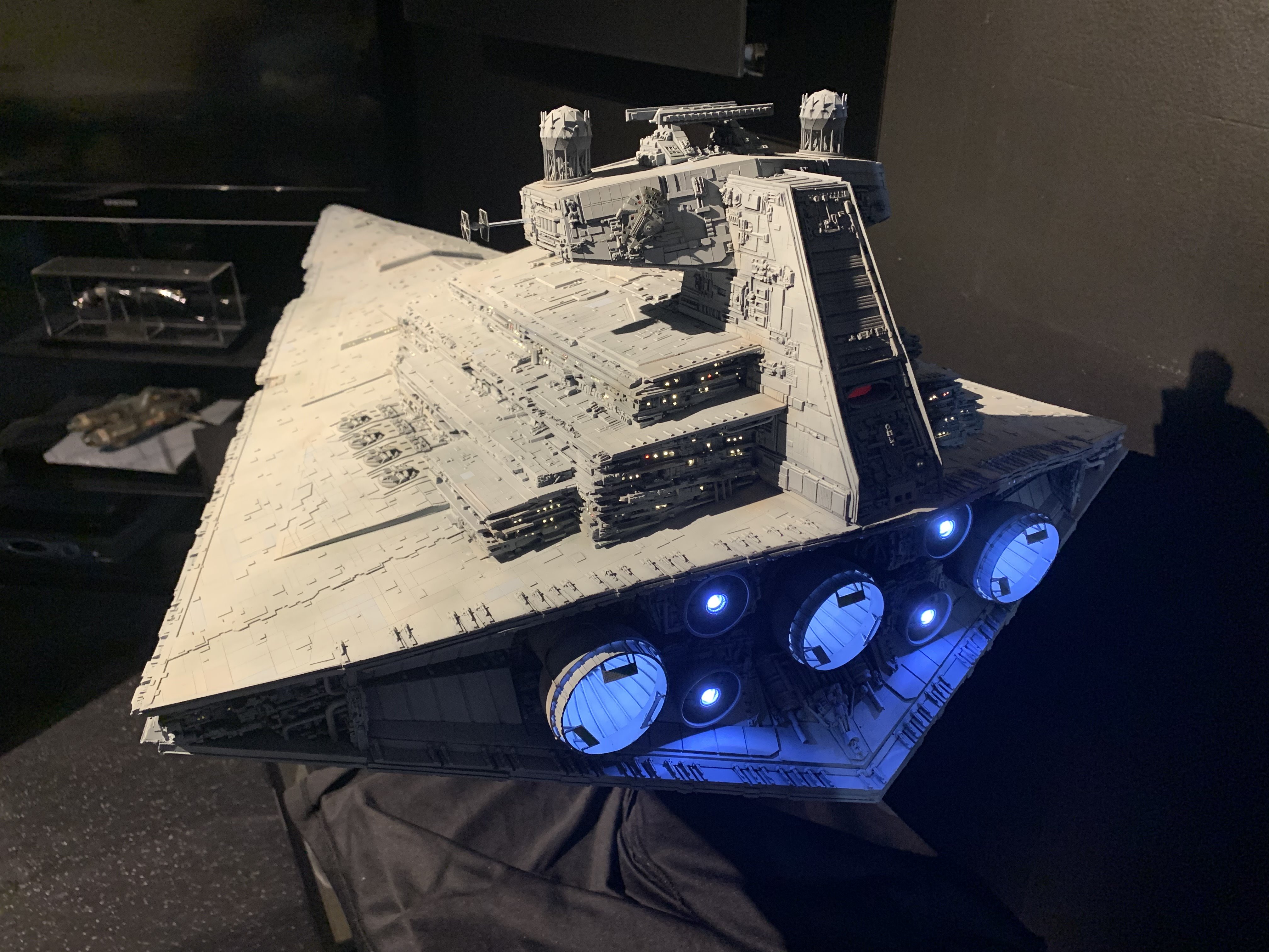 I just finished a monster of a model. Here is my vision of Randy Coopers 1/1500 ISD. I added extra piping to the rear corner engine areas as well as lots of extra detail bits on other parts as well. I really just picked and choose from various ISD’s that I thought looked really cool. I used Mission Model Paints on this and added extra panel colors such as purple/blue and grey hues, it gave me the look I was going for. I had some Tie Fighters as well as Imperial Shuttle printed and feel it added a pretty neat ROTJ feel to it, I made the Ties a little larger just so they would look like actual Tie Fighters rather than tiny specs, it gave the impression I was going for. The lights are not fiber optic but rather clear resin that is back lit, using a pin vice to remove small circles of paint to reveal the light in behind it. I added a dim, red glow to the garbage chute and gave it a honeycomb texture to it. I ran a 1/2″ metal pipe thru it and is powered by a 12v wall plug. The three large engine bells are lit using 3, 5 mm flickering LED’s to give a larger spread of light. I finished it off once again with a custom base, spec plaque and ID plaque. This is a very impressive model when seen in person and is now my favorite build.
