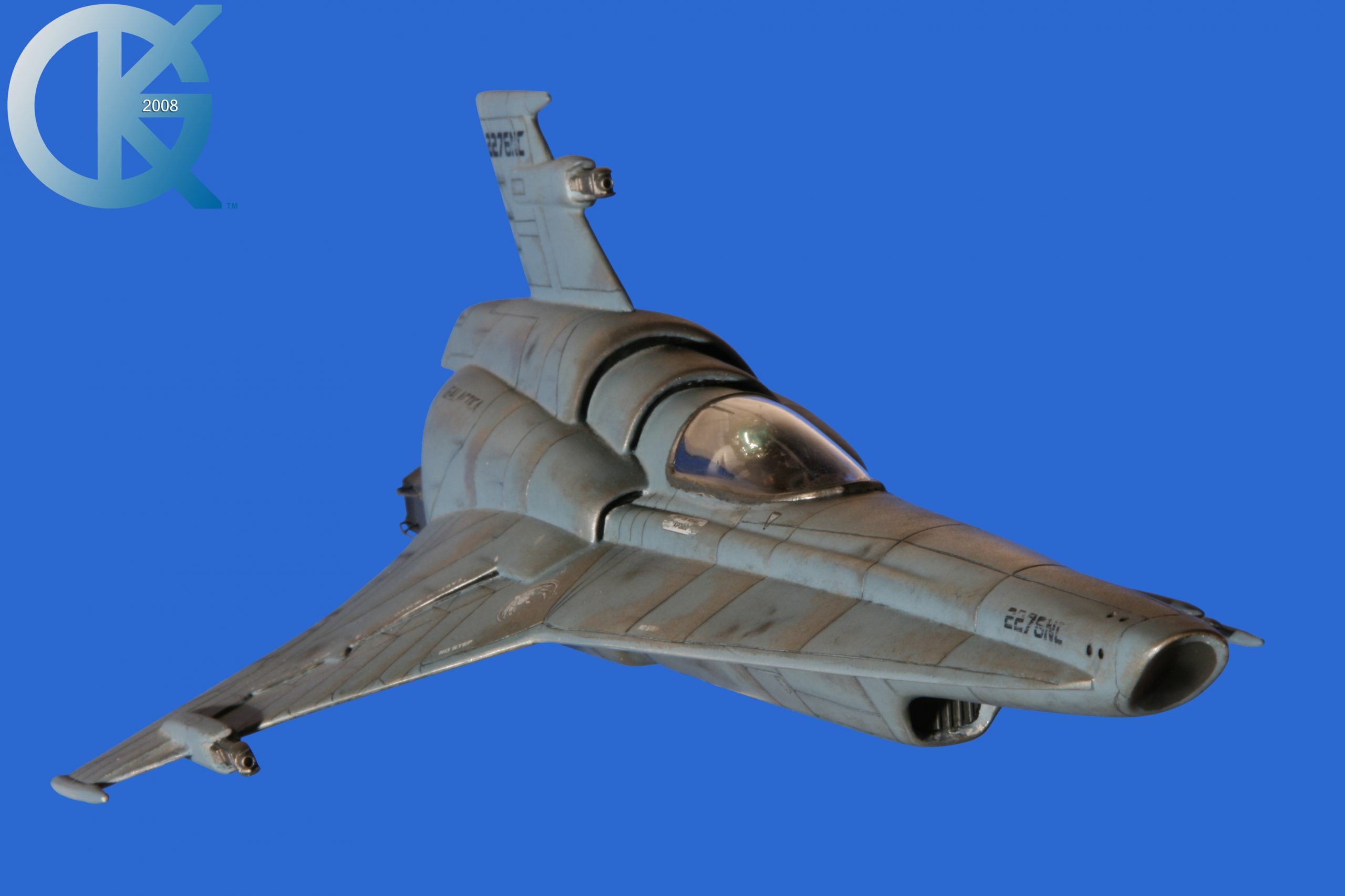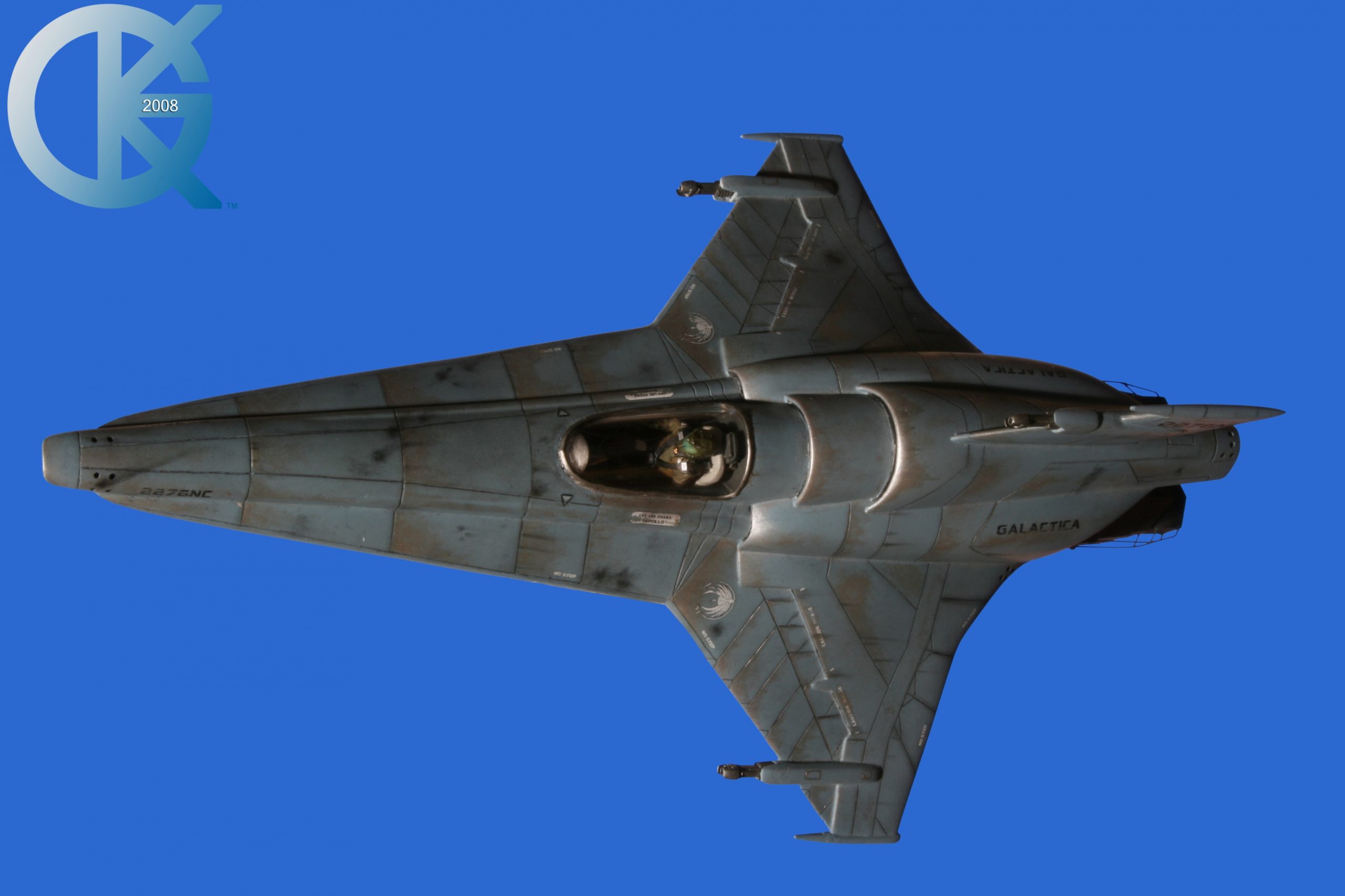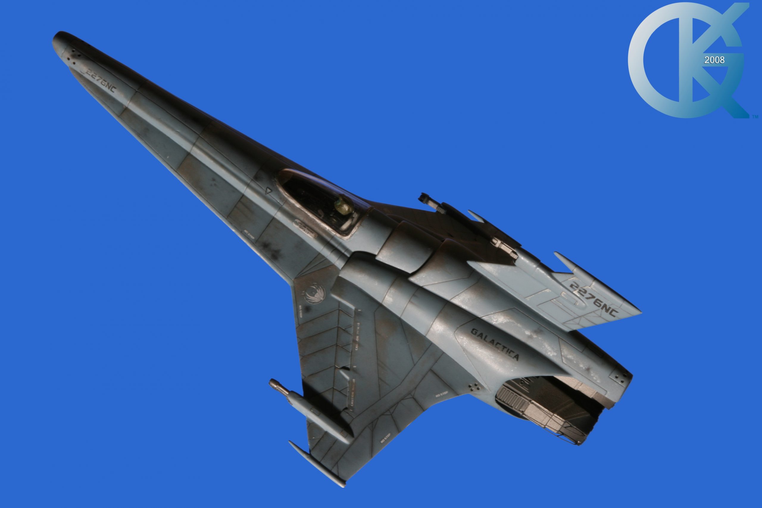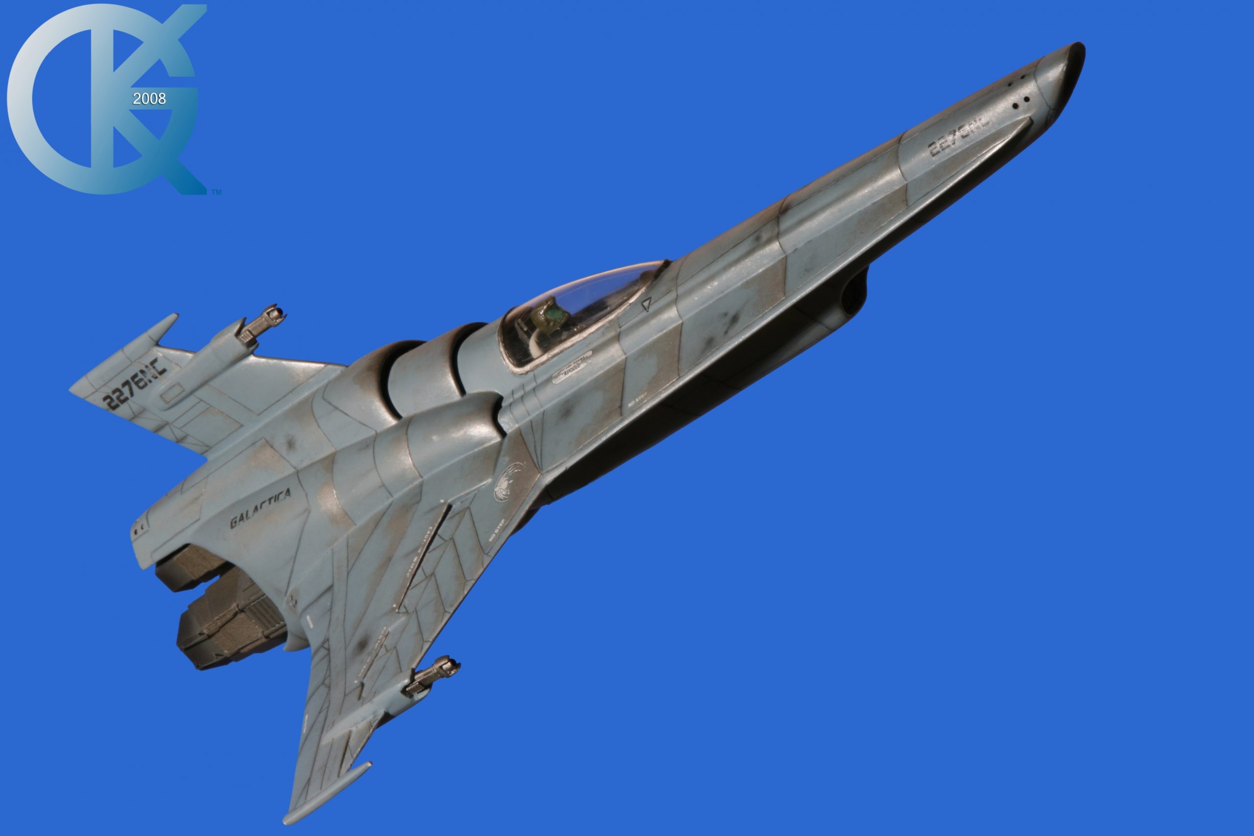 The 2003 Ron Moore reboot of Battlestar Galactica took us into a completely different imagined arena of the already fantastic 1978 Glen Larson television show and 1979 film. With this re-imagining came new designs of the ships we all loved. One of those models was from the conceptual art of Eric Chu, then digitally made by the artists at ZOIC, many of whom are very known, and shown here on Modeler Magic. The model shown here today is of the Mk7 Colonial Viper design, and to my knowledge was the first Garage Kit made of it. It is 1:32 and was built up by artist Chris Dobinson. It is beautiful with it’s detailing and weathering. Chris even managed to make the tiny pilot helmet look as if it were lit, when it is not.
