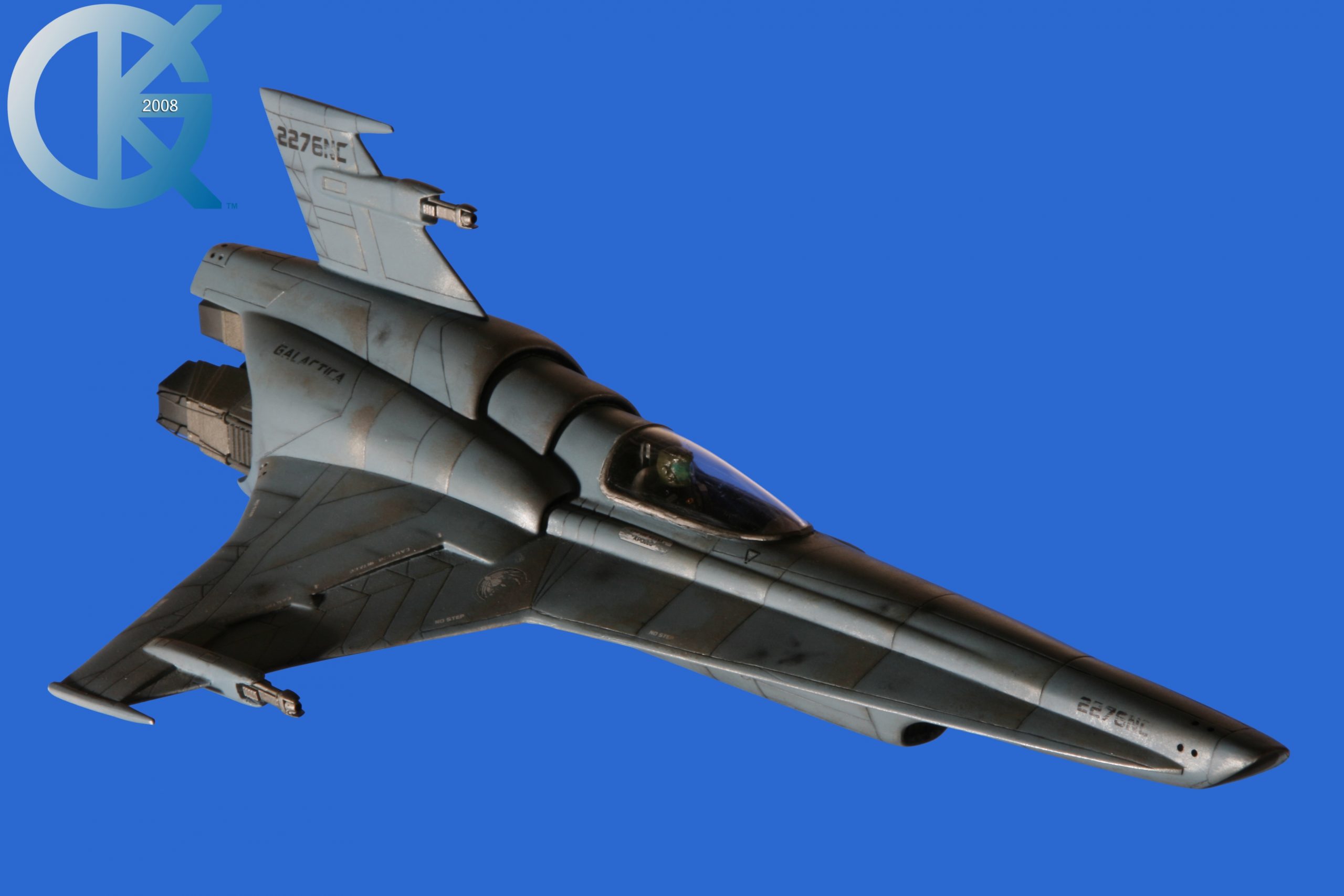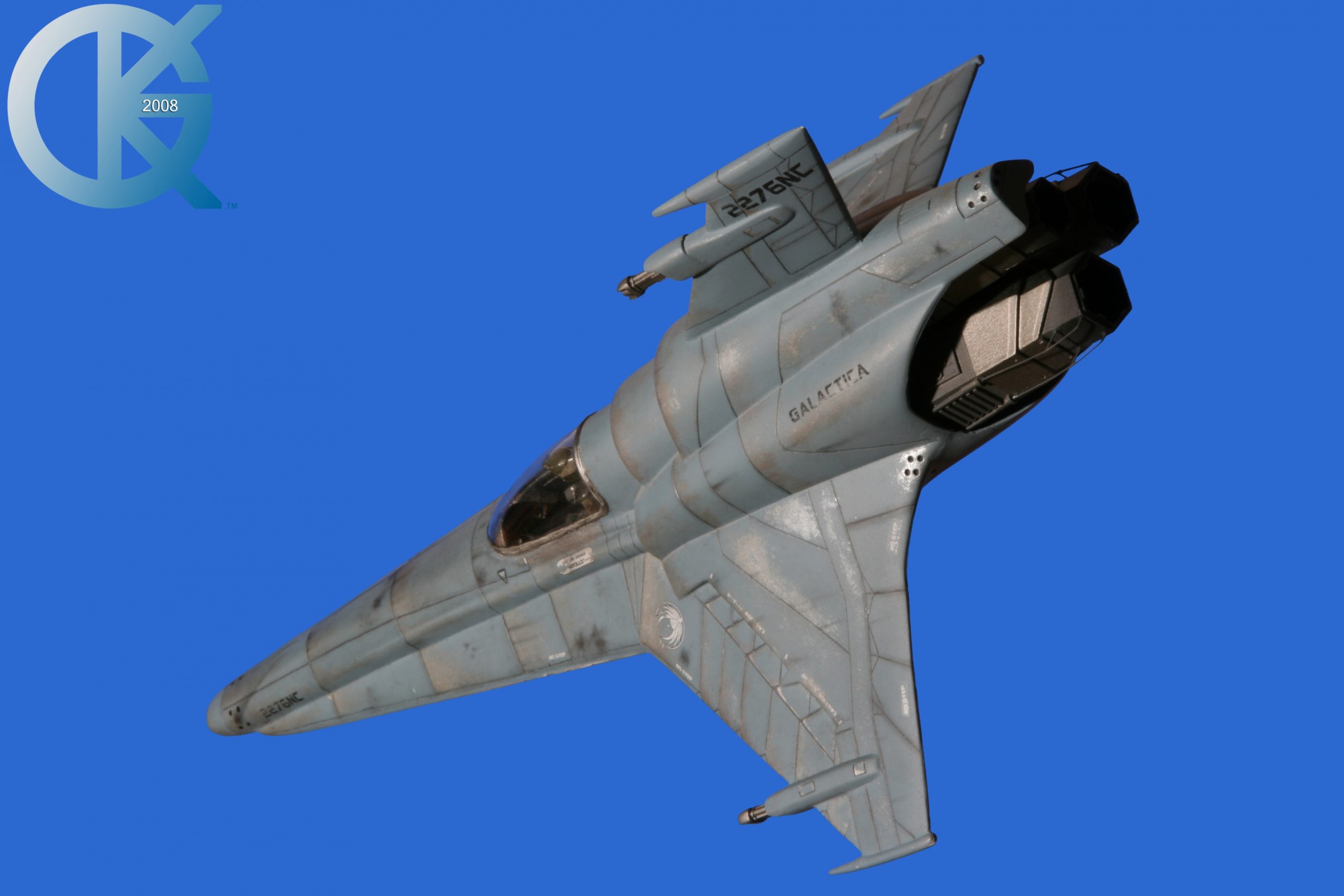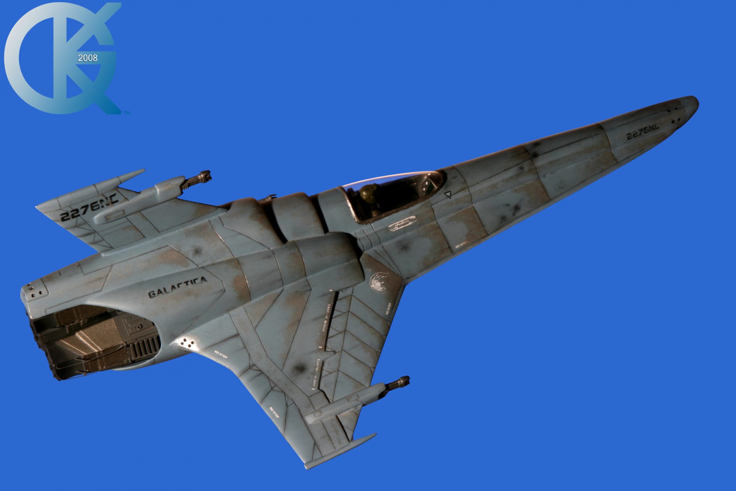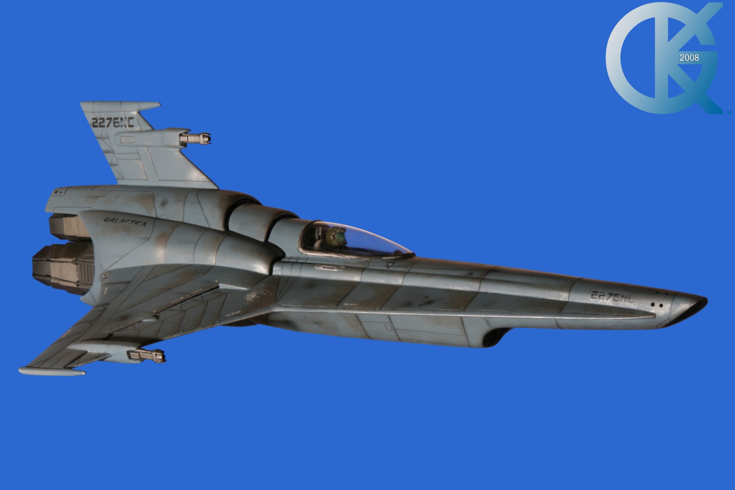 The 2003 Ron Moore reboot of Battlestar Galactica took us into a completely different imagined arena of the already fantastic 1978 Glen Larson television show and 1979 film. With this re-imagining came new designs of the ships we all loved. One of those models was from the conceptual art of Eric Chu, then digitally made by the artists at ZOIC, many of whom are very known, and shown here on Modeler Magic. The model shown here today is of the Mk7 Colonial Viper design, and to my knowledge was the first Garage Kit made of it. It is 1:32 and was built up by artist Chris Dobinson. It is beautiful with it’s detailing and weathering. Chris even managed to make the tiny pilot helmet look as if it were lit, when it is not.
