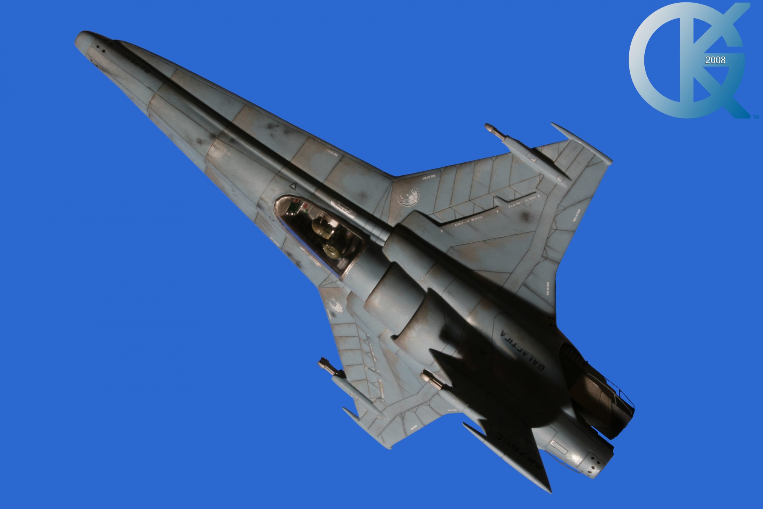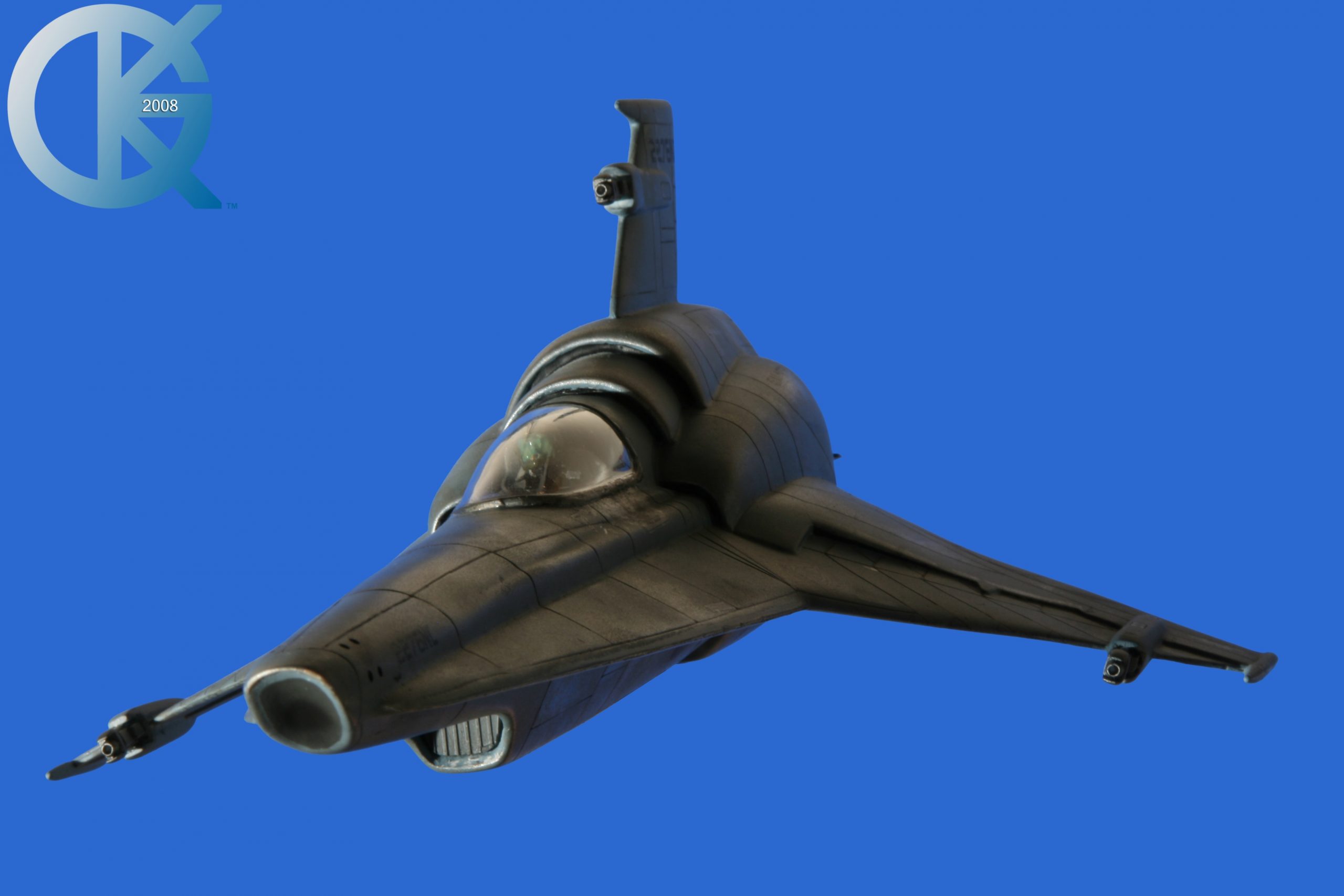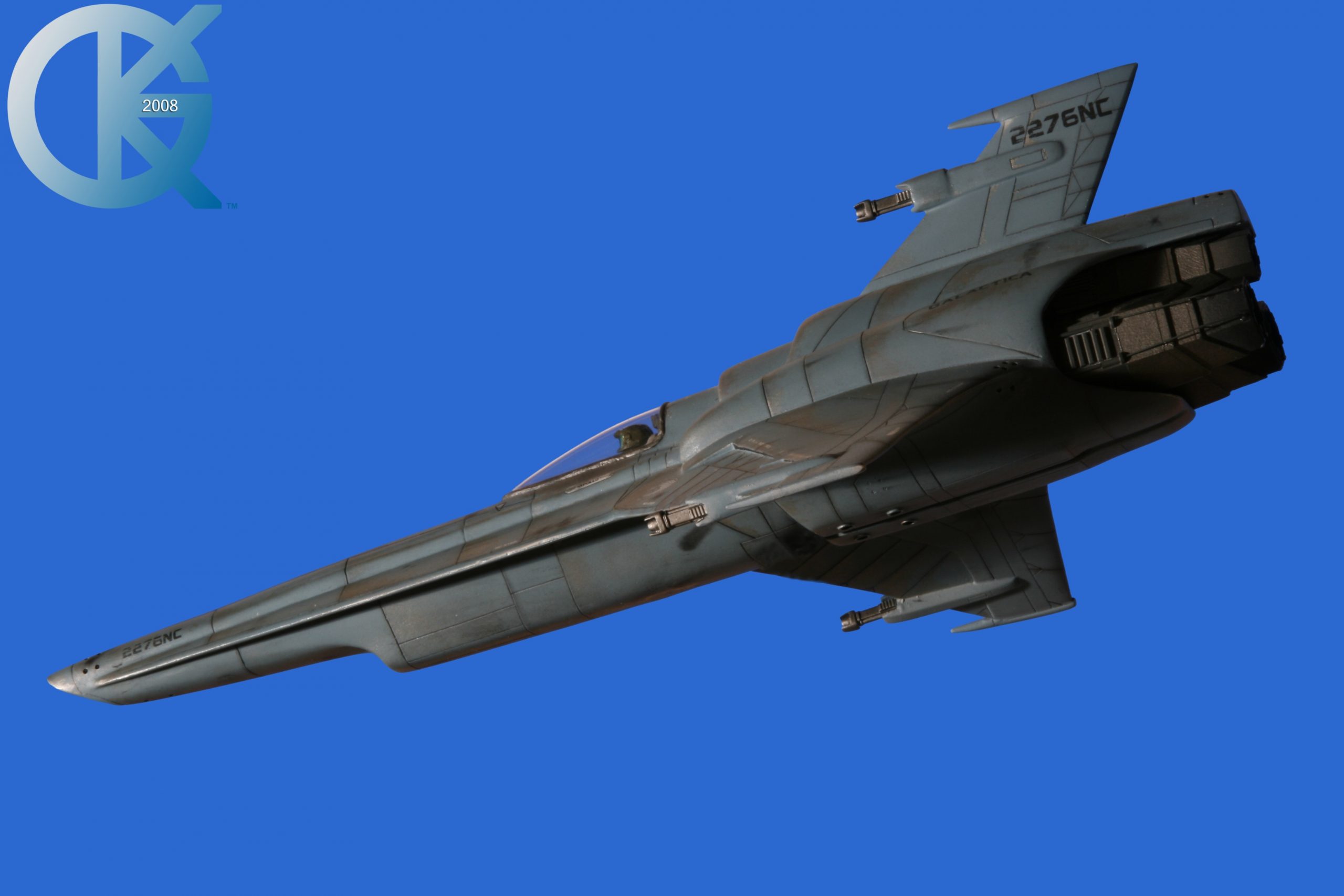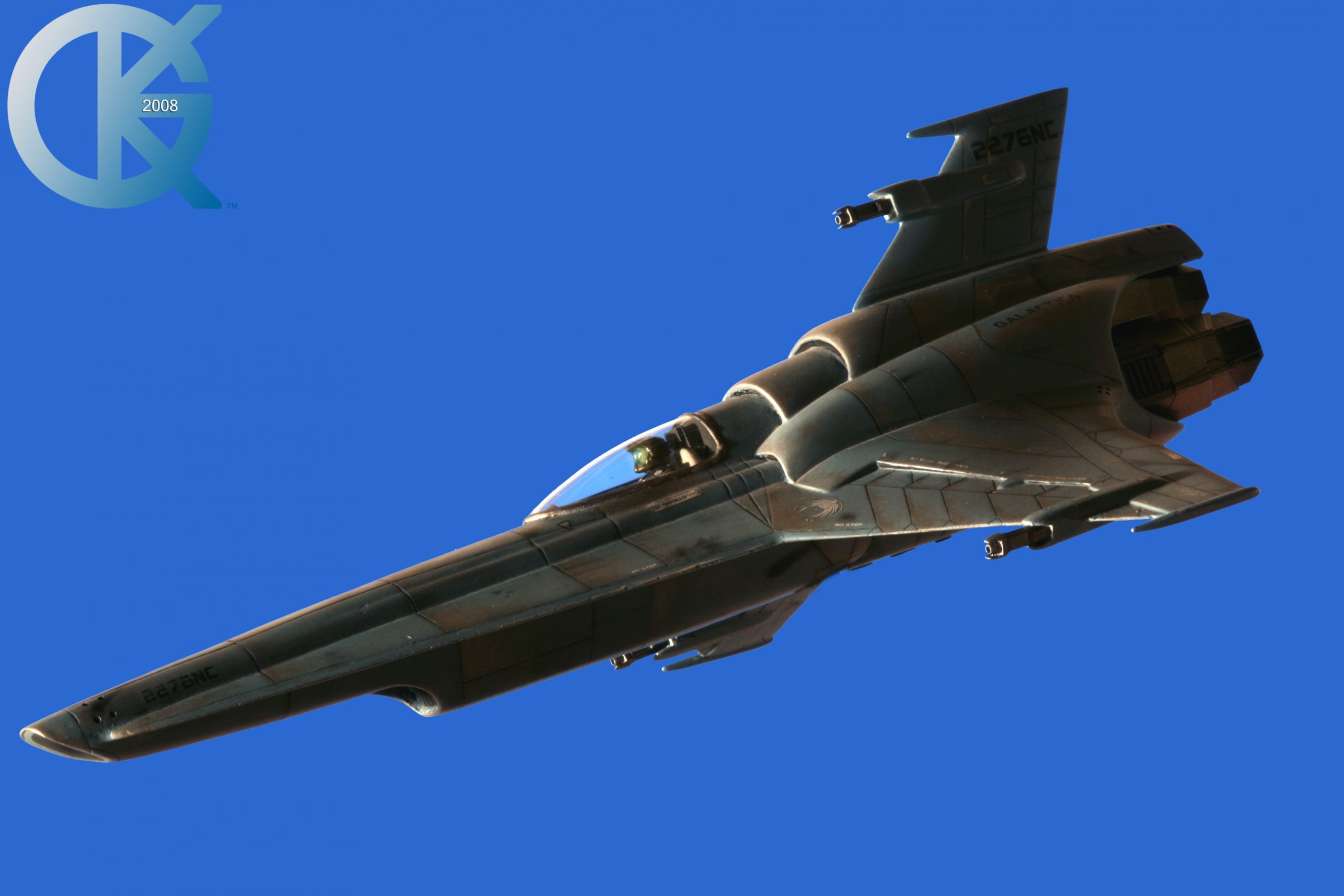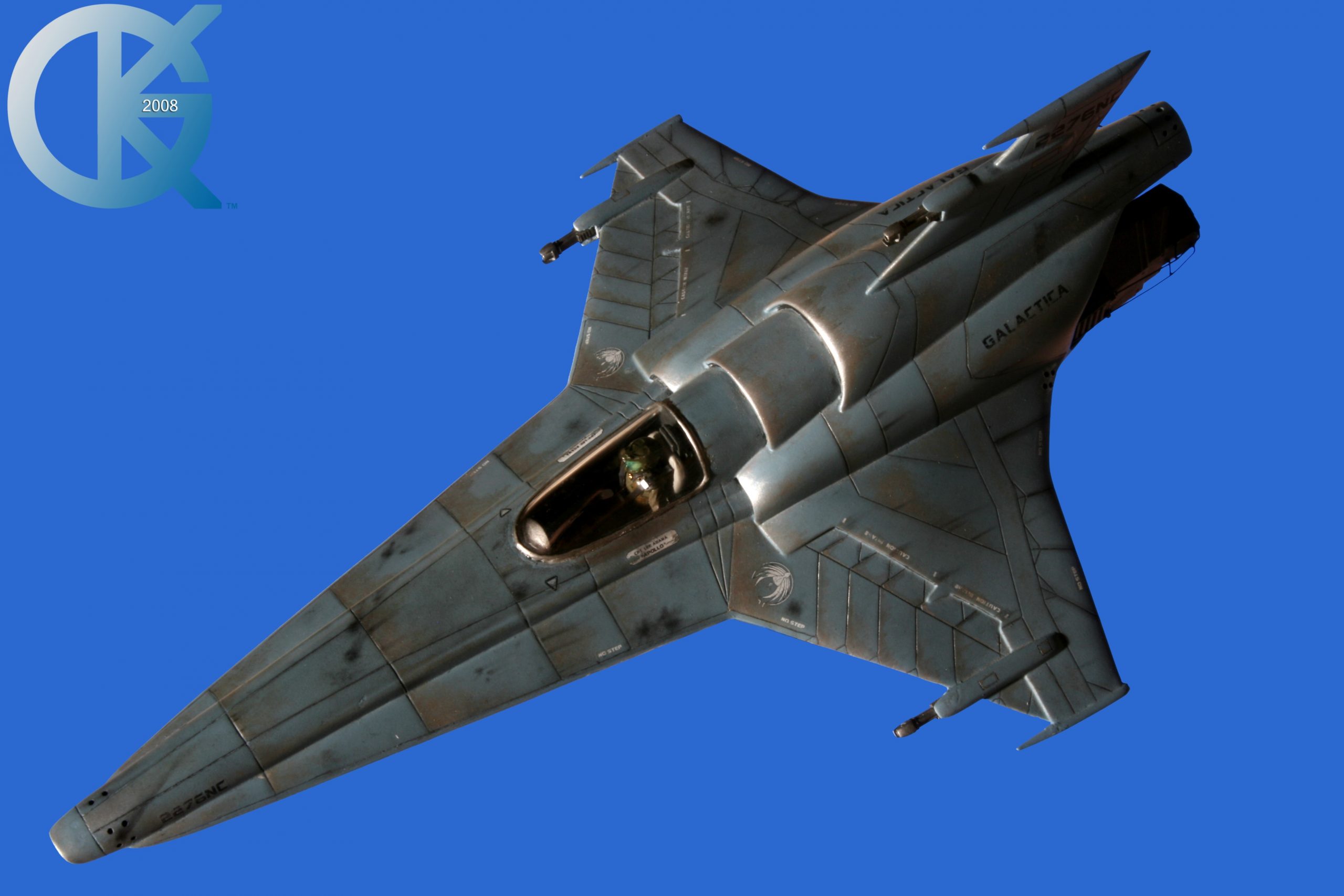 The 2003 Ron Moore reboot of Battlestar Galactica took us into a completely different imagined arena of the already fantastic 1978 Glen Larson television show and 1979 film. With this re-imagining came new designs of the ships we all loved. One of those models was from the conceptual art of Eric Chu, then digitally made by the artists at ZOIC, many of whom are very known, and shown here on Modeler Magic. The model shown here today is of the Mk7 Colonial Viper design, and to my knowledge was the first Garage Kit made of it. It is 1:32 and was built up by artist Chris Dobinson. It is beautiful with it’s detailing and weathering. Chris even managed to make the tiny pilot helmet look as if it were lit, when it is not.