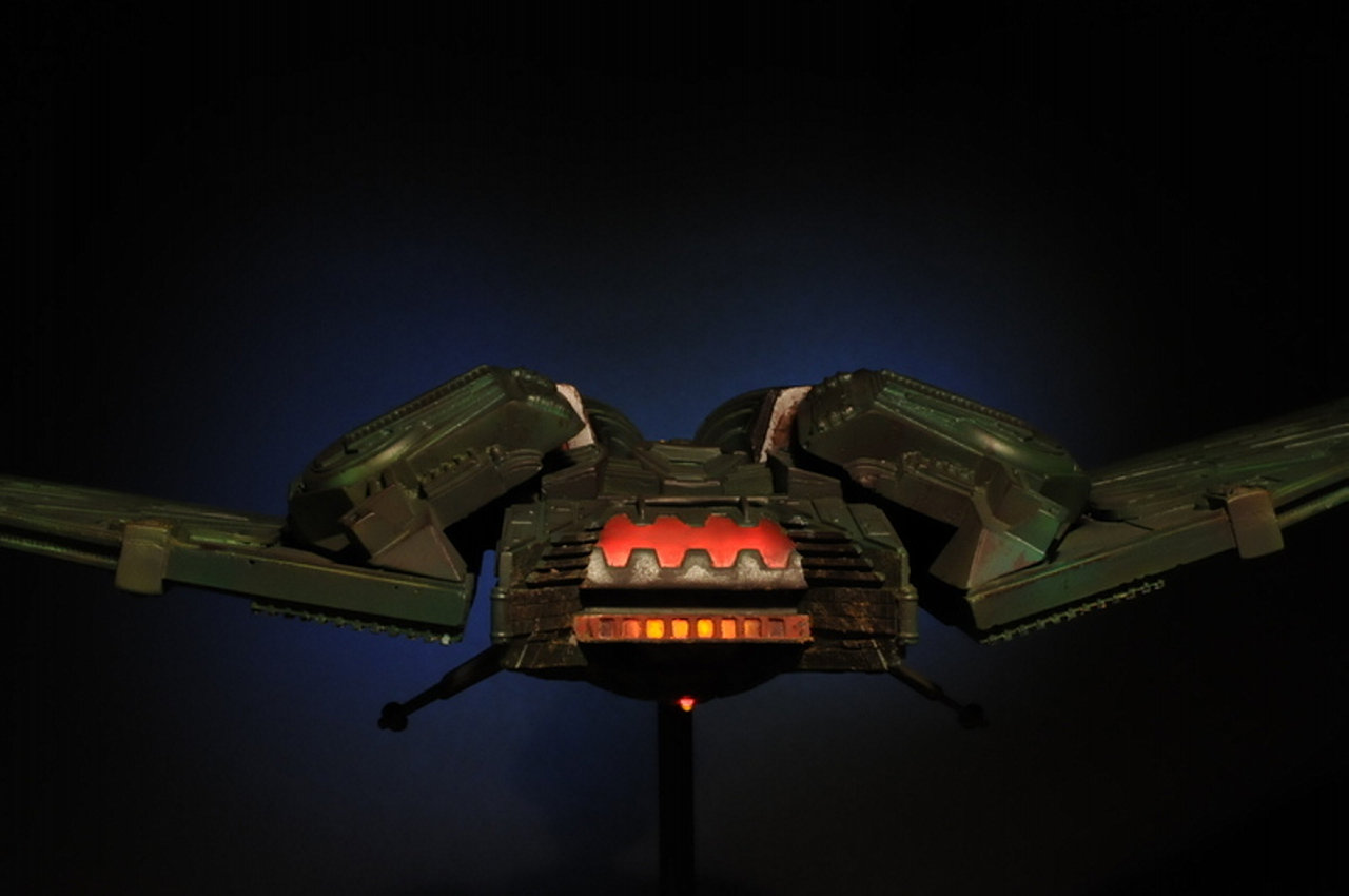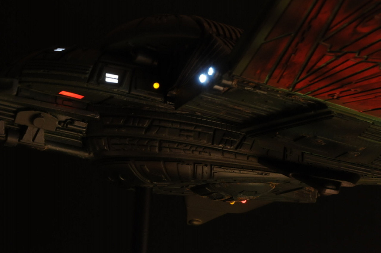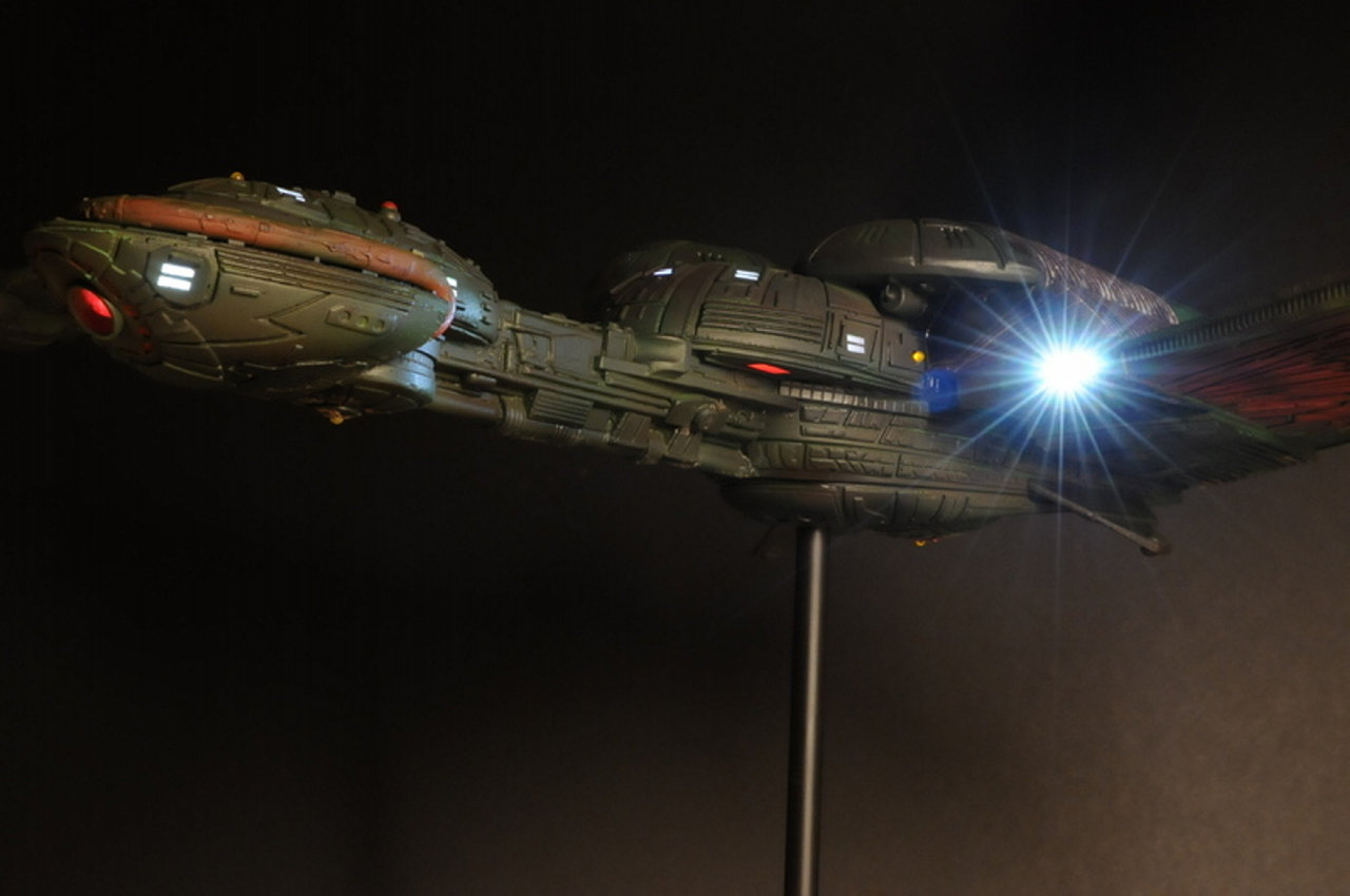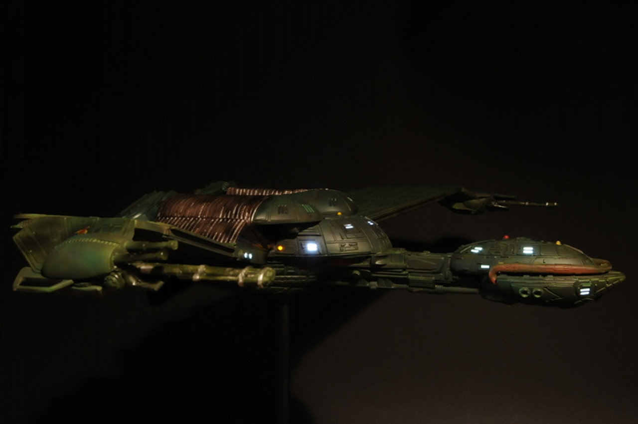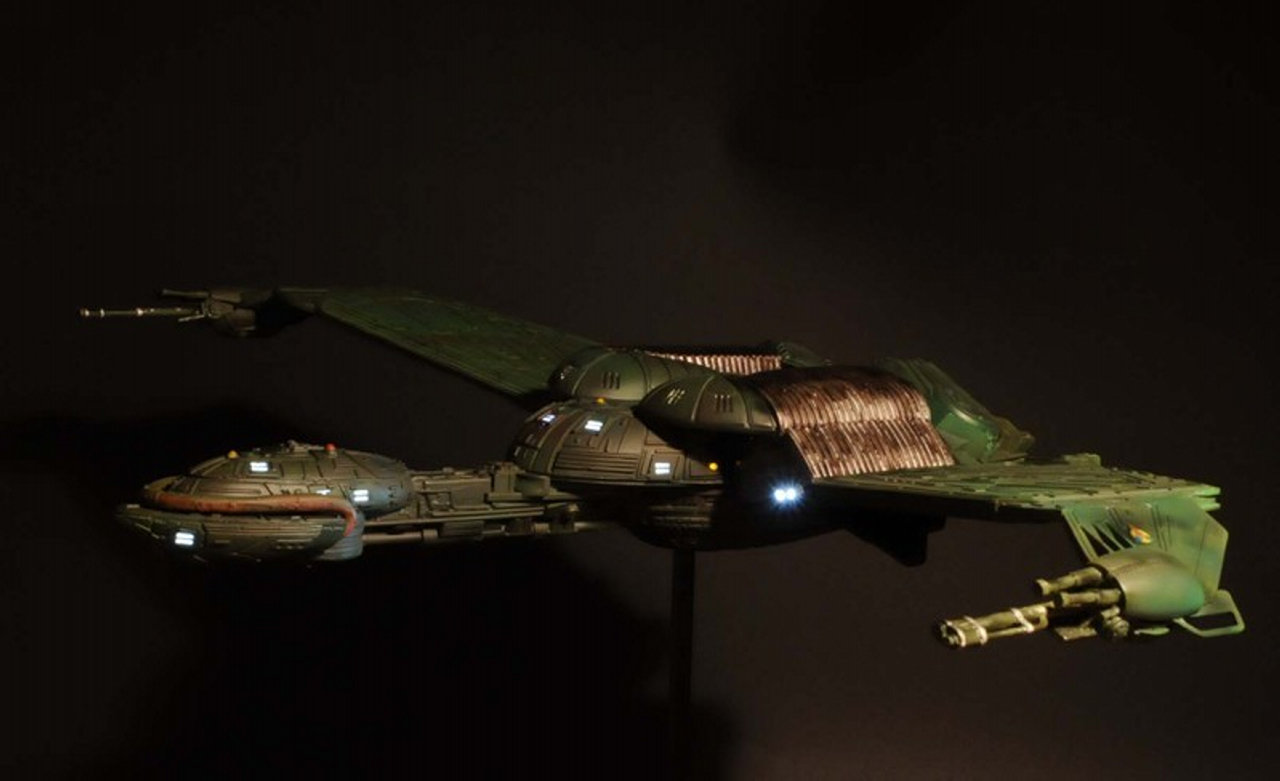 This piece was originally shown here on Modelers Miniatures & Magic back on April 26, 2009 and is now updated to today’s showing standard! Eleven years has passed since we originally showed this piece and it still is marvelous! Built from the WARP models 28 inch wide Klingon Bird of Prey, this piece is outstanding. A perfect size for most any collection to display. Artist Chris Ford did a magnificent job.