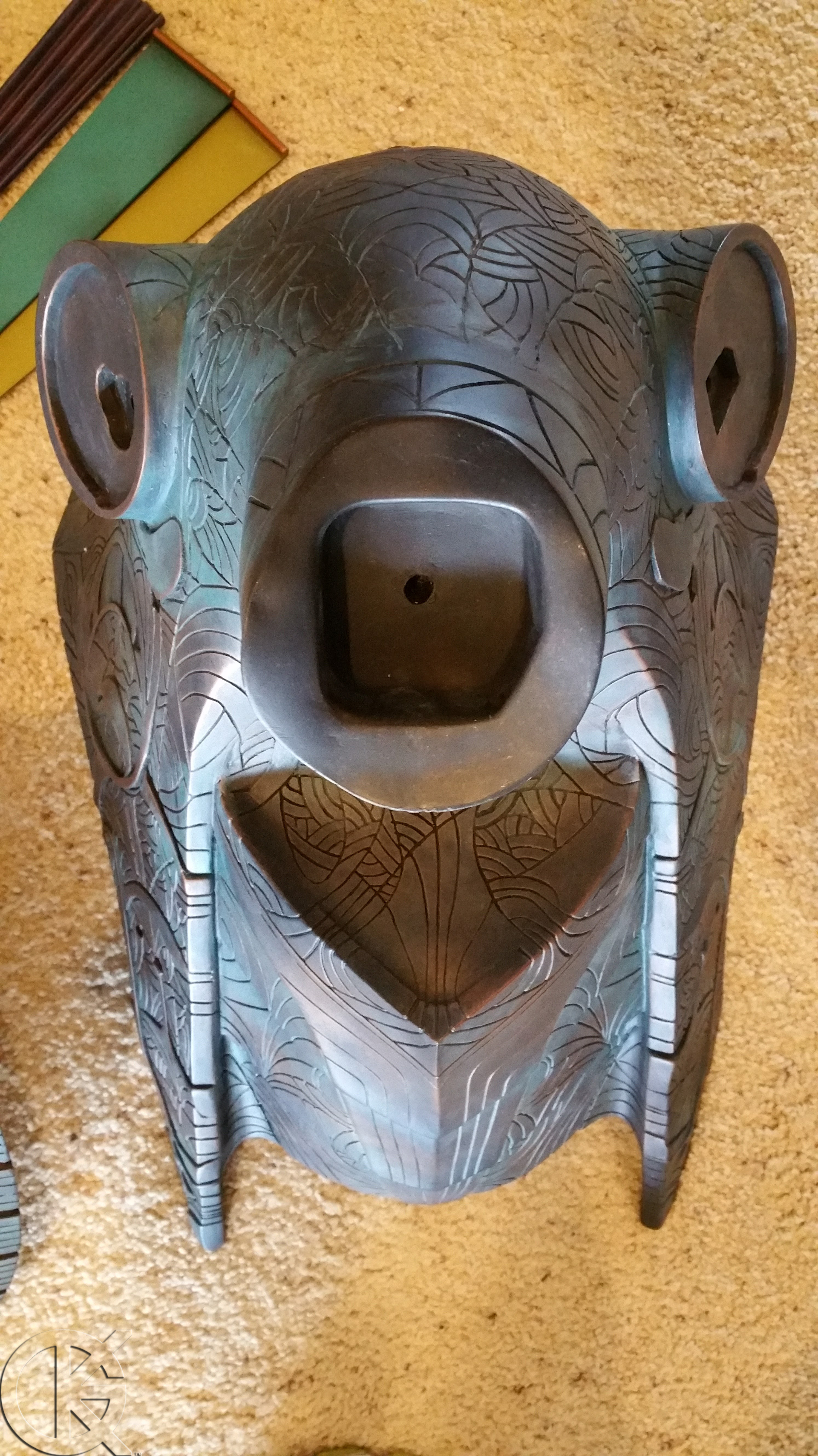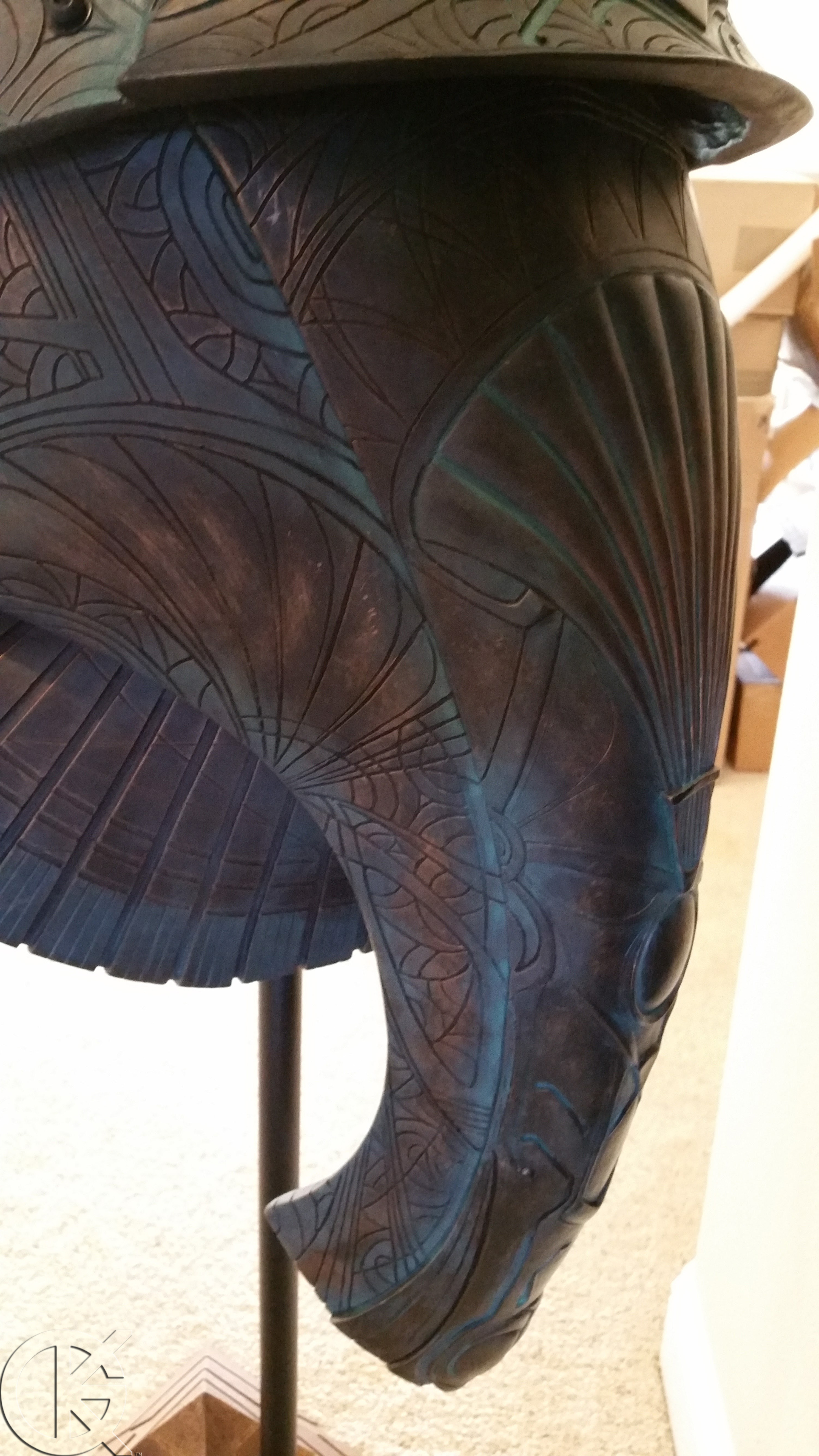 As stated this piece came is three boxes. Two larger boxes, with one that obviously carry’s the mounting pole. All well packed and wrapped within the shaped Styrofoam, I found unpacking all the pieces easy, but with time needed to take proper care. Since this Helmet is pretty much a layered piece with a mounting pole, and as heavy as it is, there is no way to actually wear it without a complete re-design. To be honest, I wouldn’t want to wear the piece anyway since looking at it’s great details is the true pleasure. That stated, I am certain someone will manage to modify one someday… in fiberglass to wear.