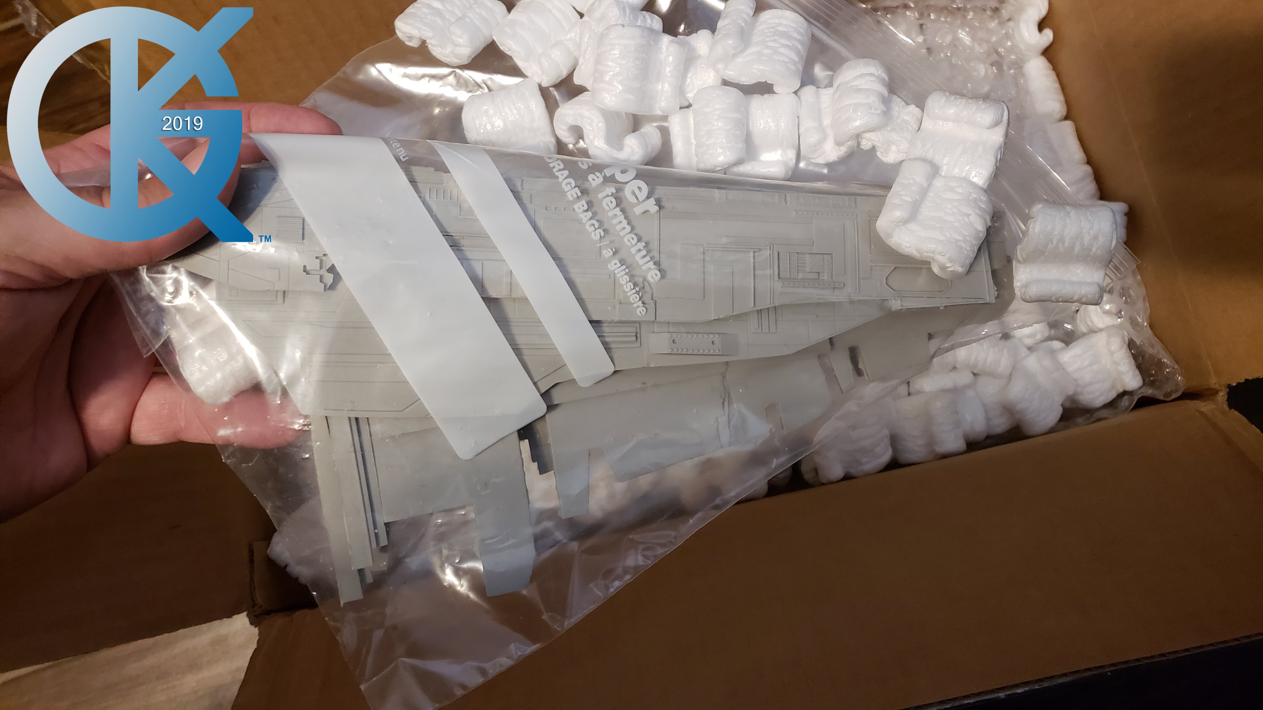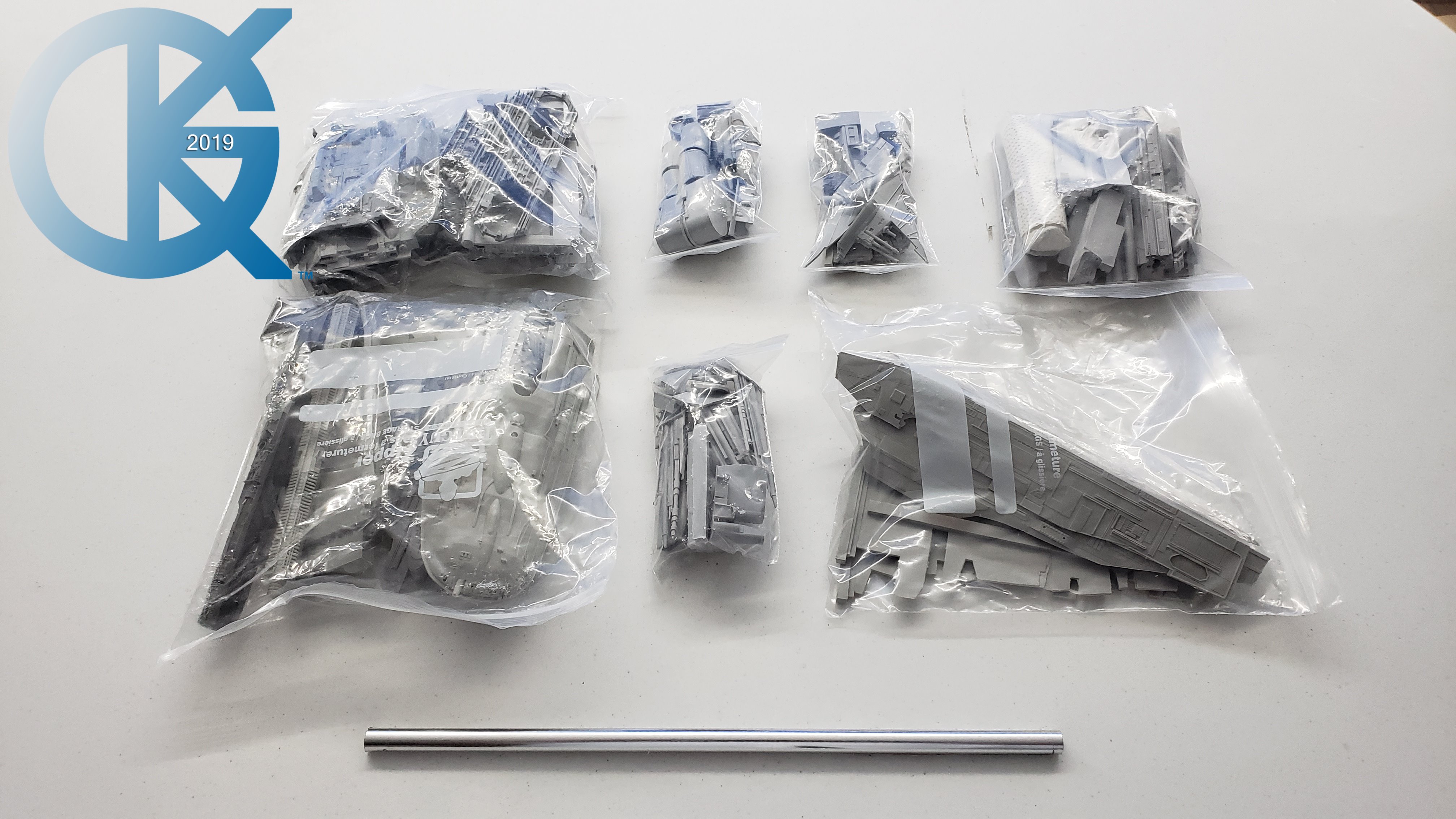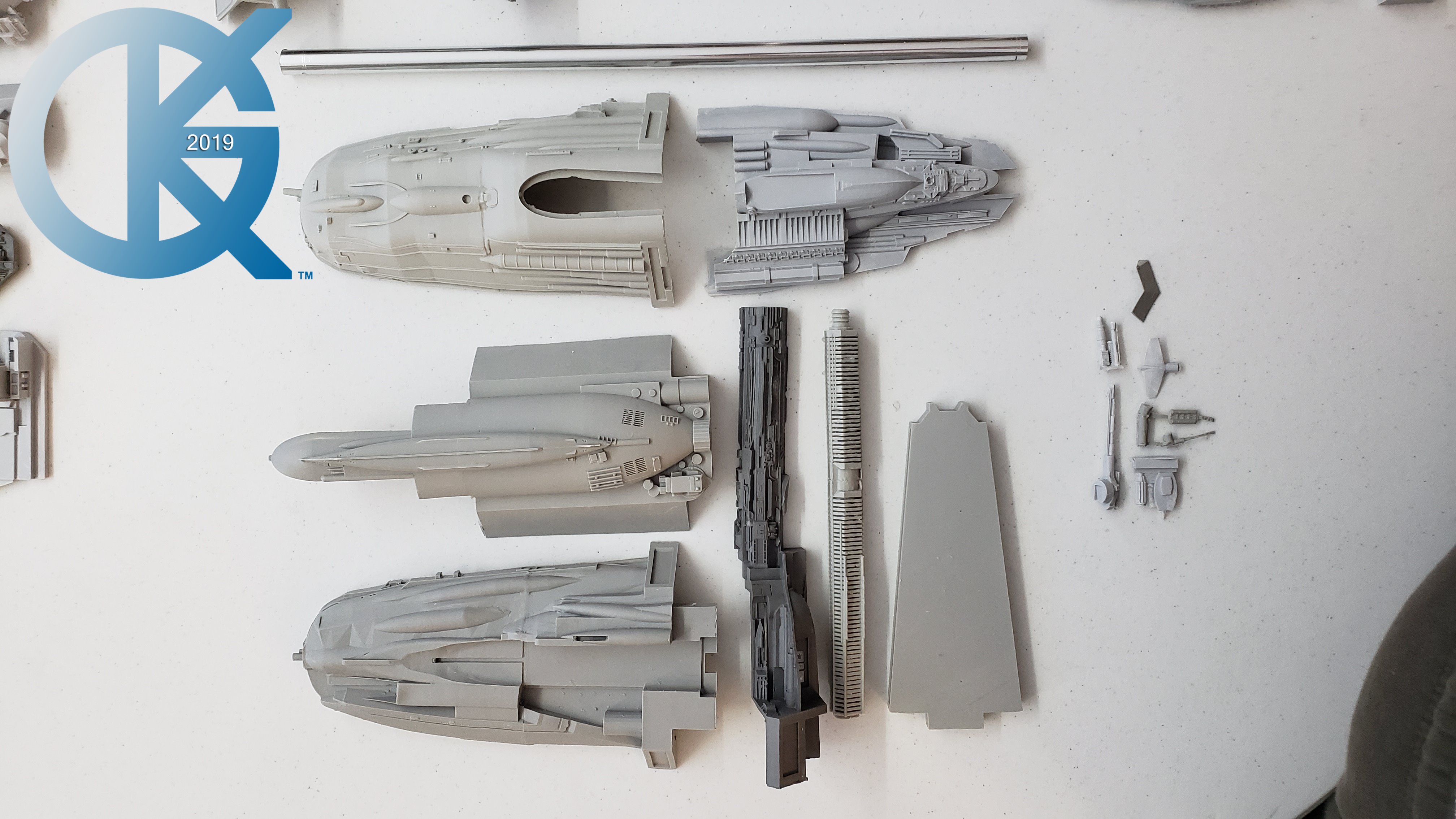 Every so often a kit emerges that has been long awaited, and very exciting to me. Such is the Cosmos Models 1/350 Nebulon B Medical Frigate from The Empire Strikes Back. When built it is supposed to measure 3 feet in length! How exciting is that?!! Nicholas Sagan has done marvelous work in producing this kit… from 3D files… to 3D printing of the parts… the kit I received looks fantastic. The first kit arrived very well packed, and has a metal tube included for the spine of the model.