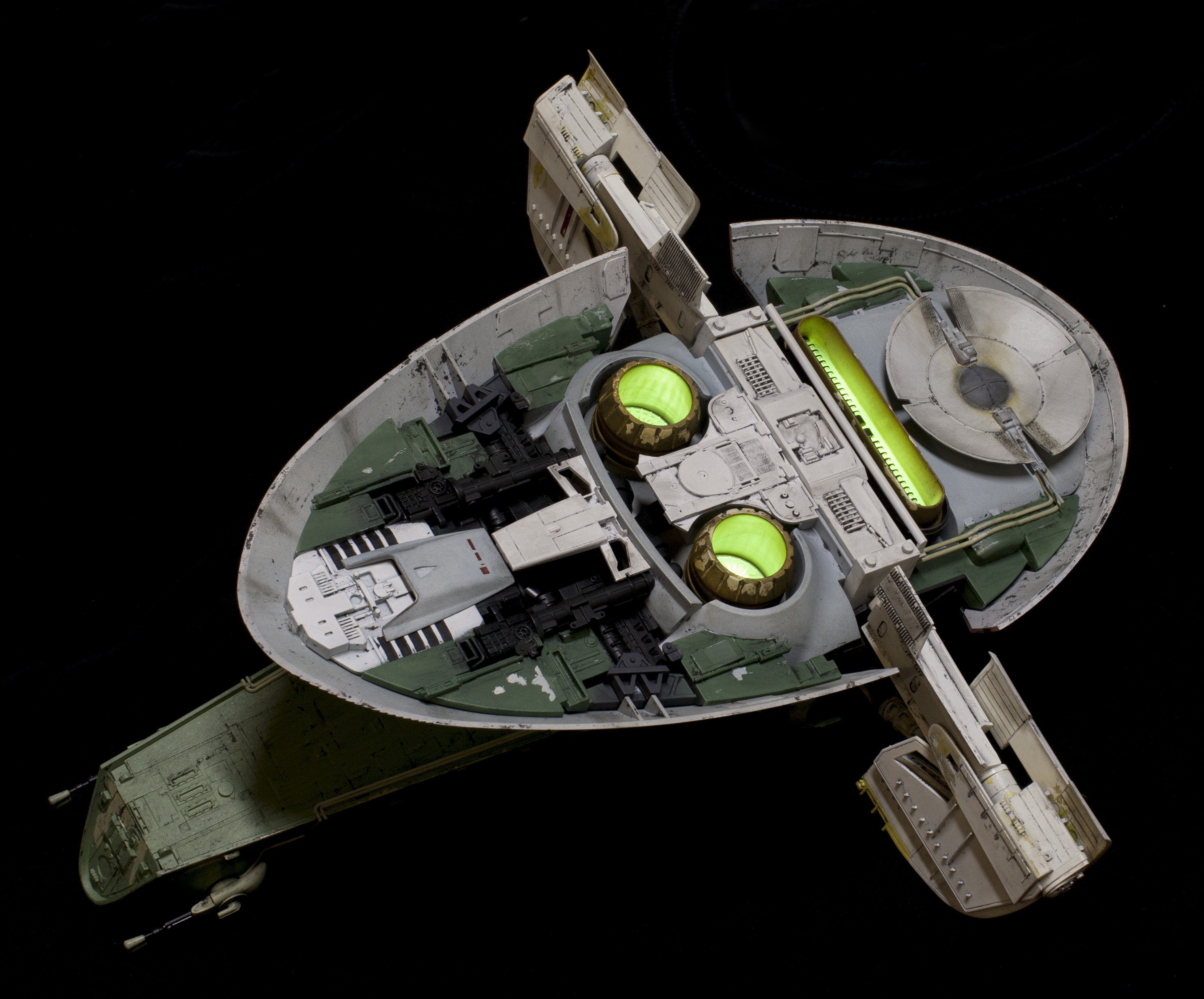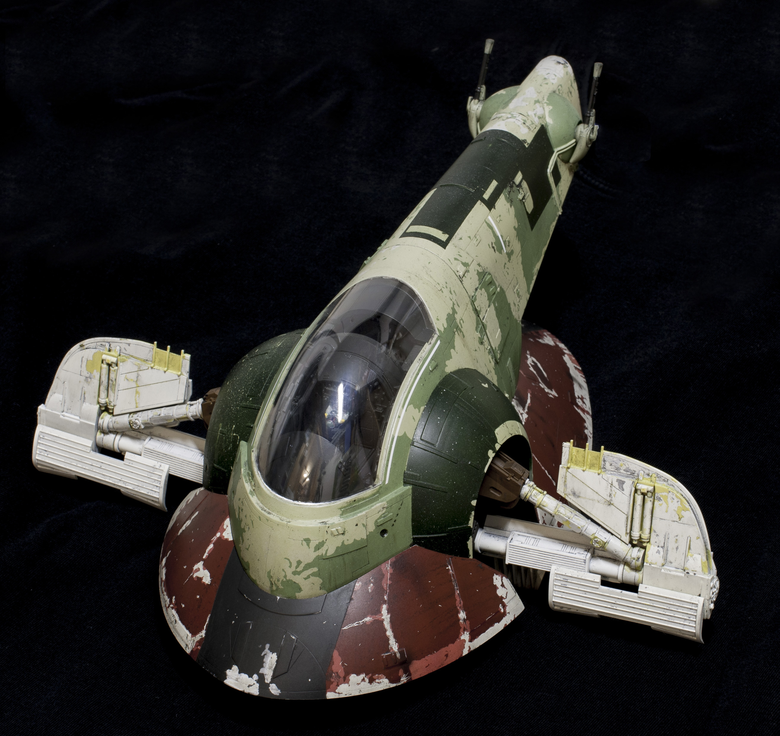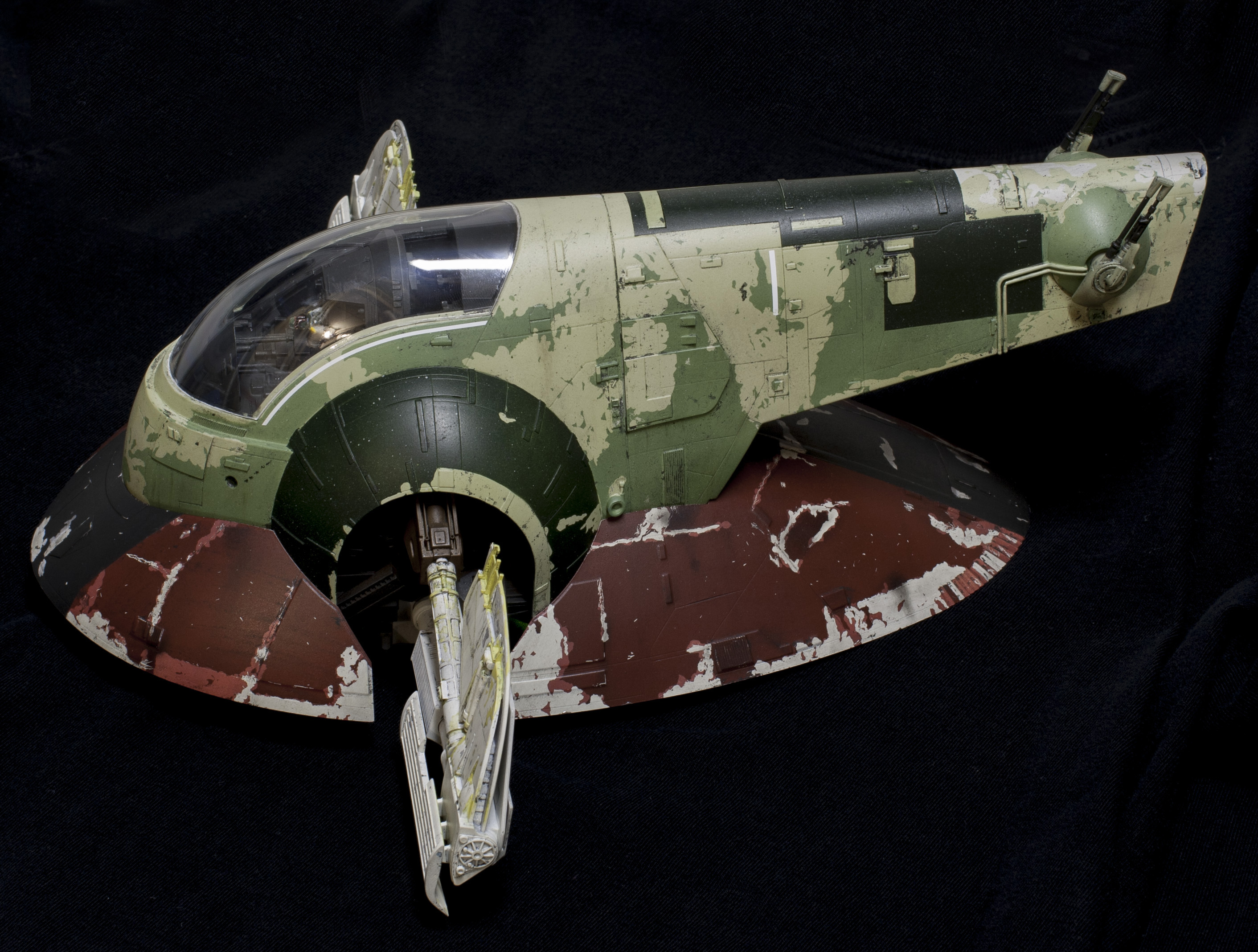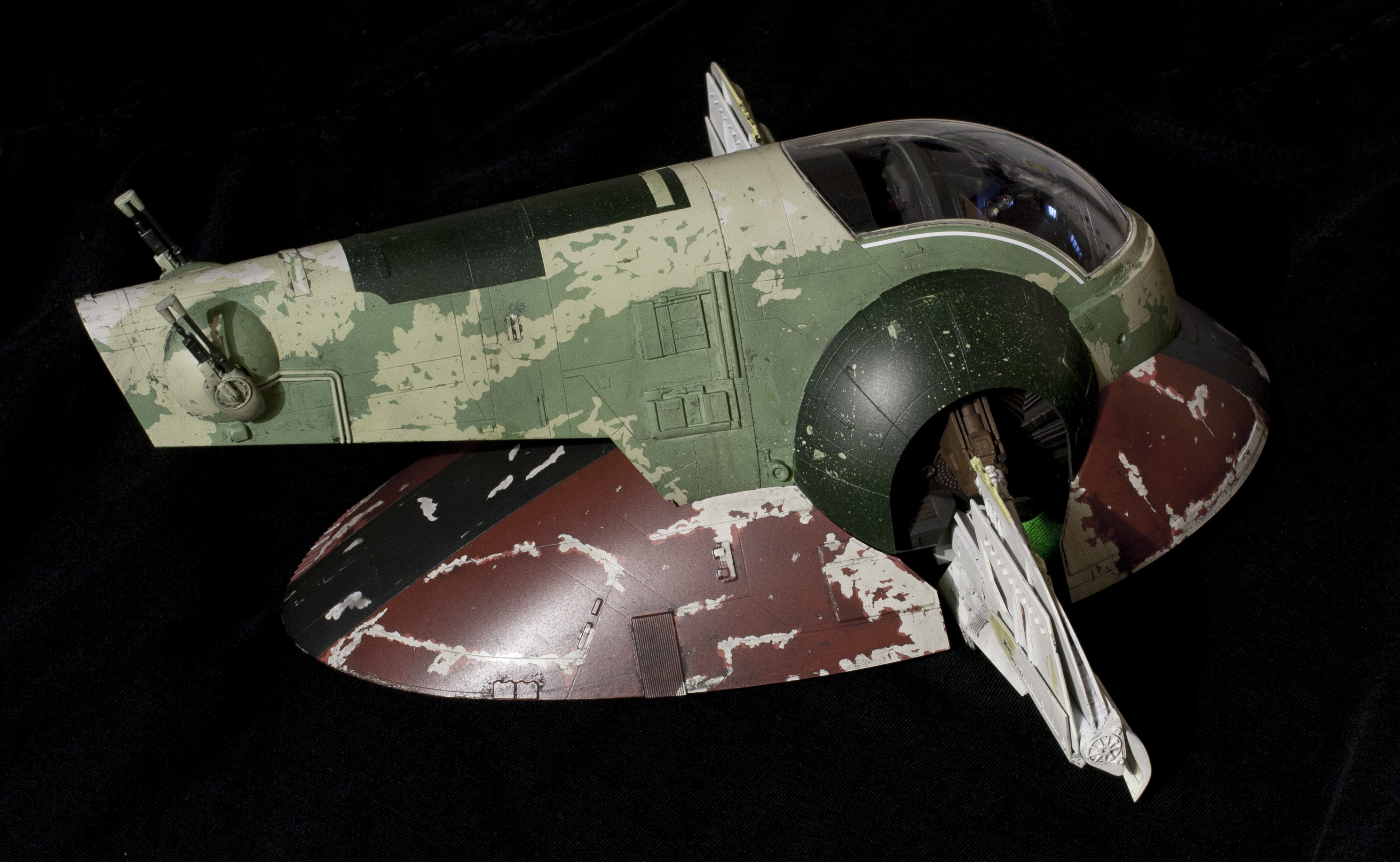 Wanted to light the thing, and, whenever possible, I like to keep my lighting self contained. Fortunately, the top shell fits onto the skirt very tightly just on its own. So, I’ve decided not to glue it together . . . which allows me access to the “nose” of the model, where a battery pack can sit. I’m using 8 LEDs to light it. 2 in each of the round thrusters, three in the long narrow one, and one more LED for my subtle cockpit lighting. The cockpit lighting doesn’t show up very well sadly. I didn’t want to go the standard route of fiber optic buttons and such, the scale didn’t seem right to me, and never personally liked seeing the Slave 1 cockpit lit up like a Christmas tree in some other models. So I noticed that above Boba Fett’s head, there were two “grate” like areas. So I carved them out, rebuilt them with evergreen, and left them open to shine some light down. It puts a VERY subtle glow thru the cockpit. On one hand, I was a little disappointed you couldn’t see it more, but . . on the other hand, it does seem to be in scale.