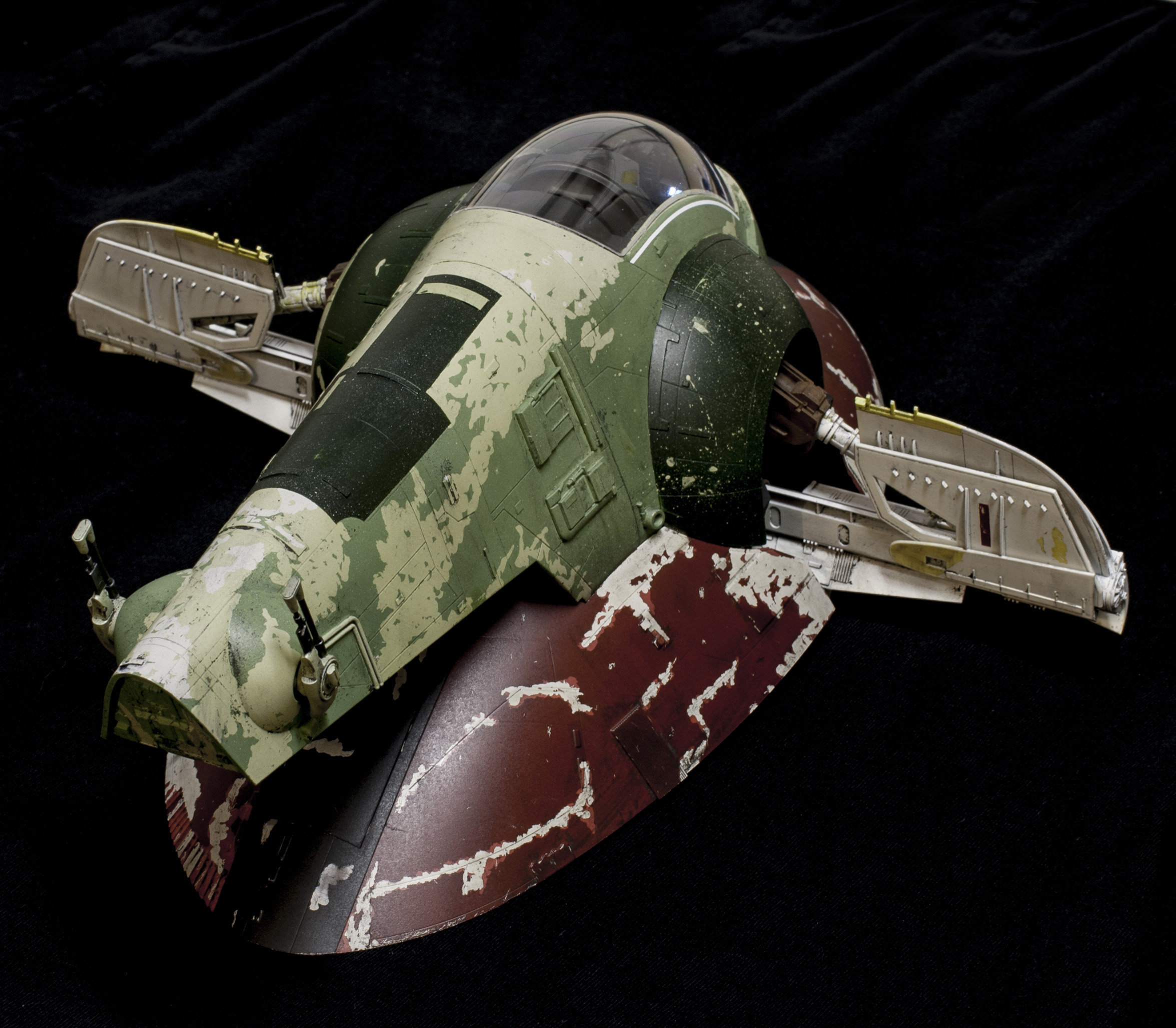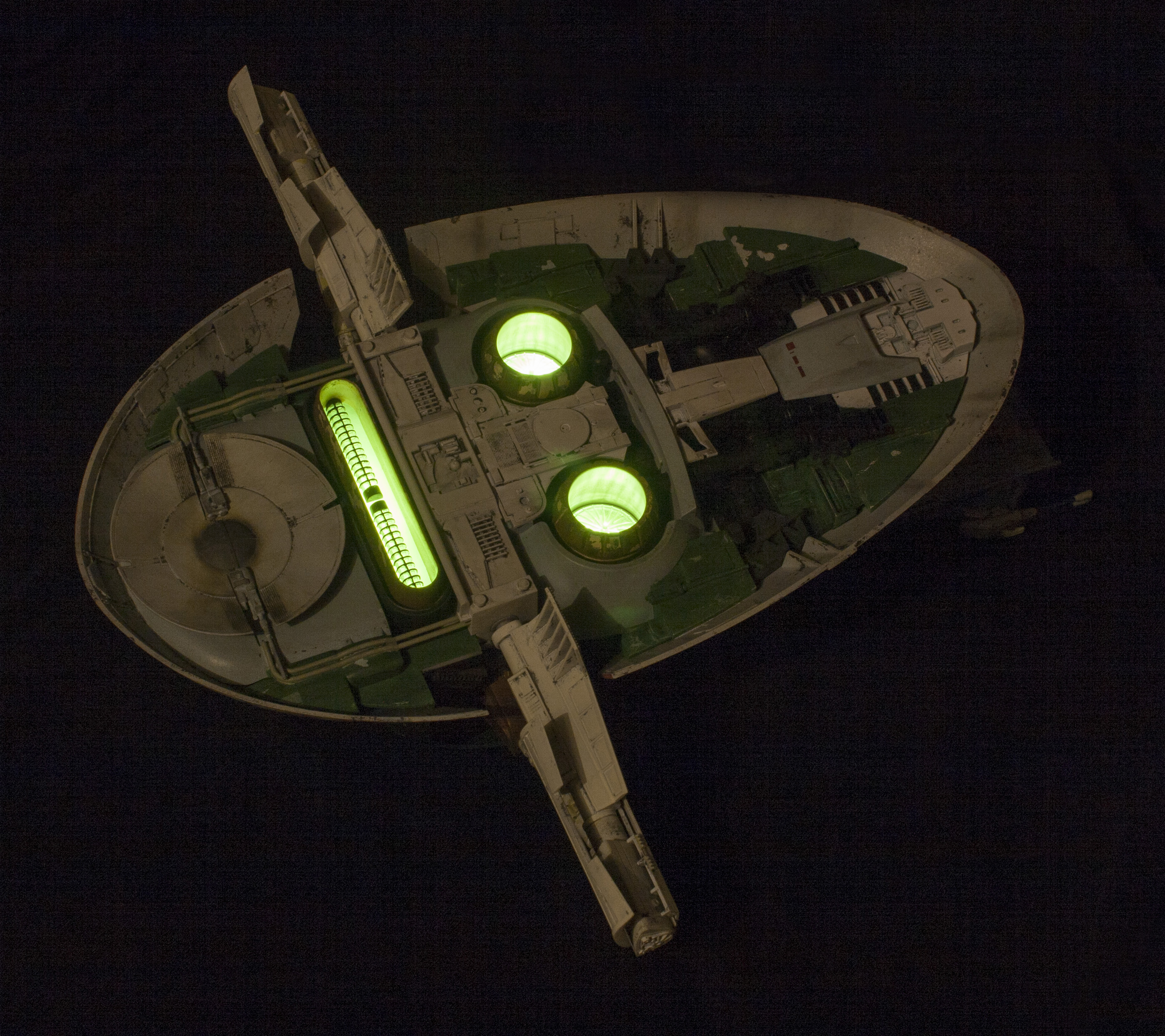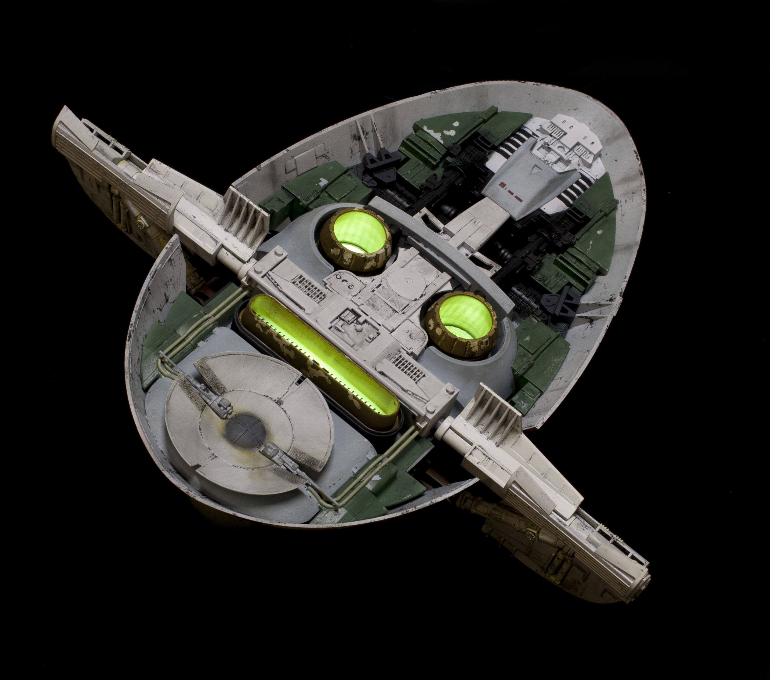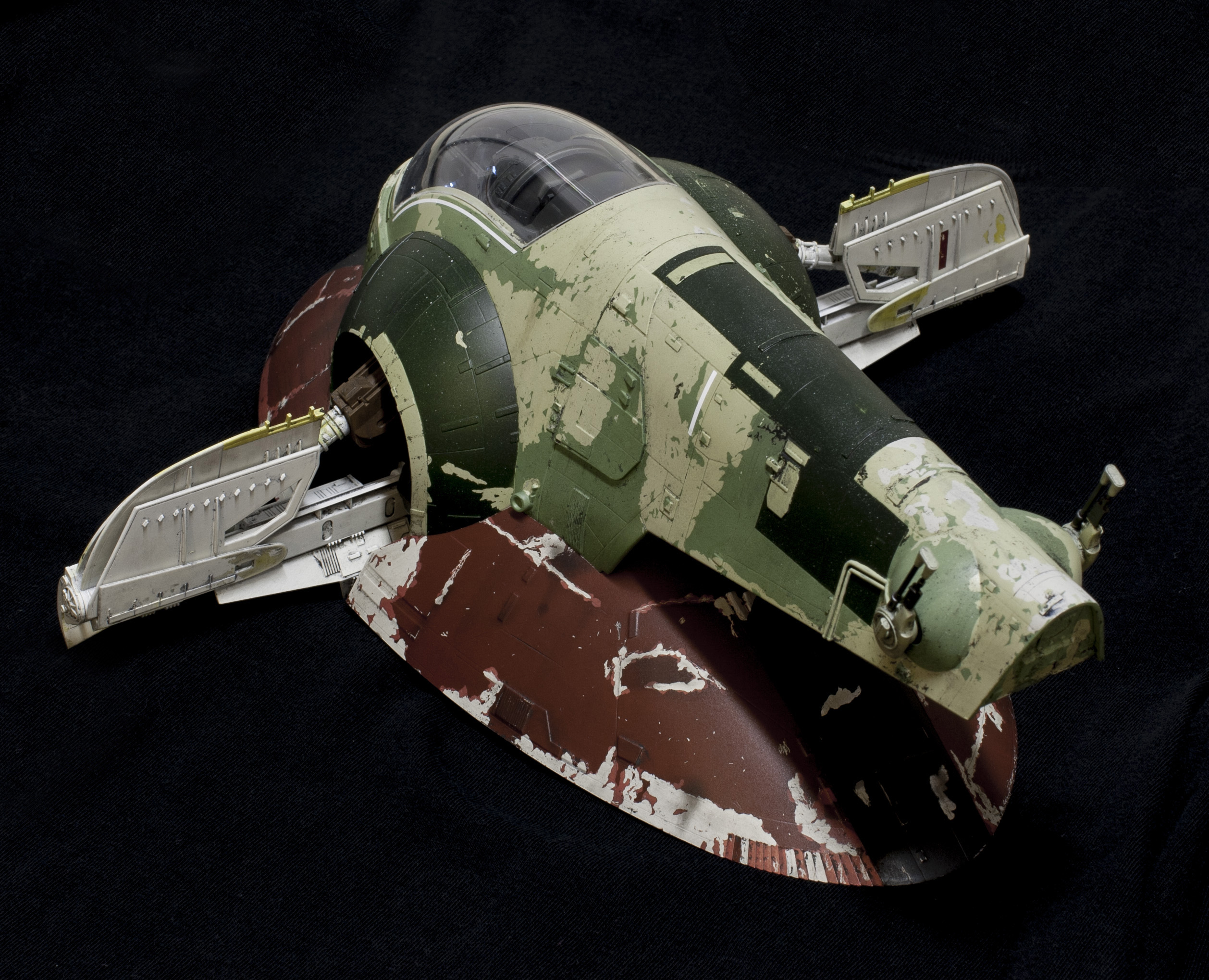 Wanted to light the thing, and, whenever possible, I like to keep my lighting self contained. Fortunately, the top shell fits onto the skirt very tightly just on its own. So, I’ve decided not to glue it together . . . which allows me access to the “nose” of the model, where a battery pack can sit. I’m using 8 LEDs to light it. 2 in each of the round thrusters, three in the long narrow one, and one more LED for my subtle cockpit lighting. The cockpit lighting doesn’t show up very well sadly. I didn’t want to go the standard route of fiber optic buttons and such, the scale didn’t seem right to me, and never personally liked seeing the Slave 1 cockpit lit up like a Christmas tree in some other models. So I noticed that above Boba Fett’s head, there were two “grate” like areas. So I carved them out, rebuilt them with evergreen, and left them open to shine some light down. It puts a VERY subtle glow thru the cockpit. On one hand, I was a little disappointed you couldn’t see it more, but . . on the other hand, it does seem to be in scale.