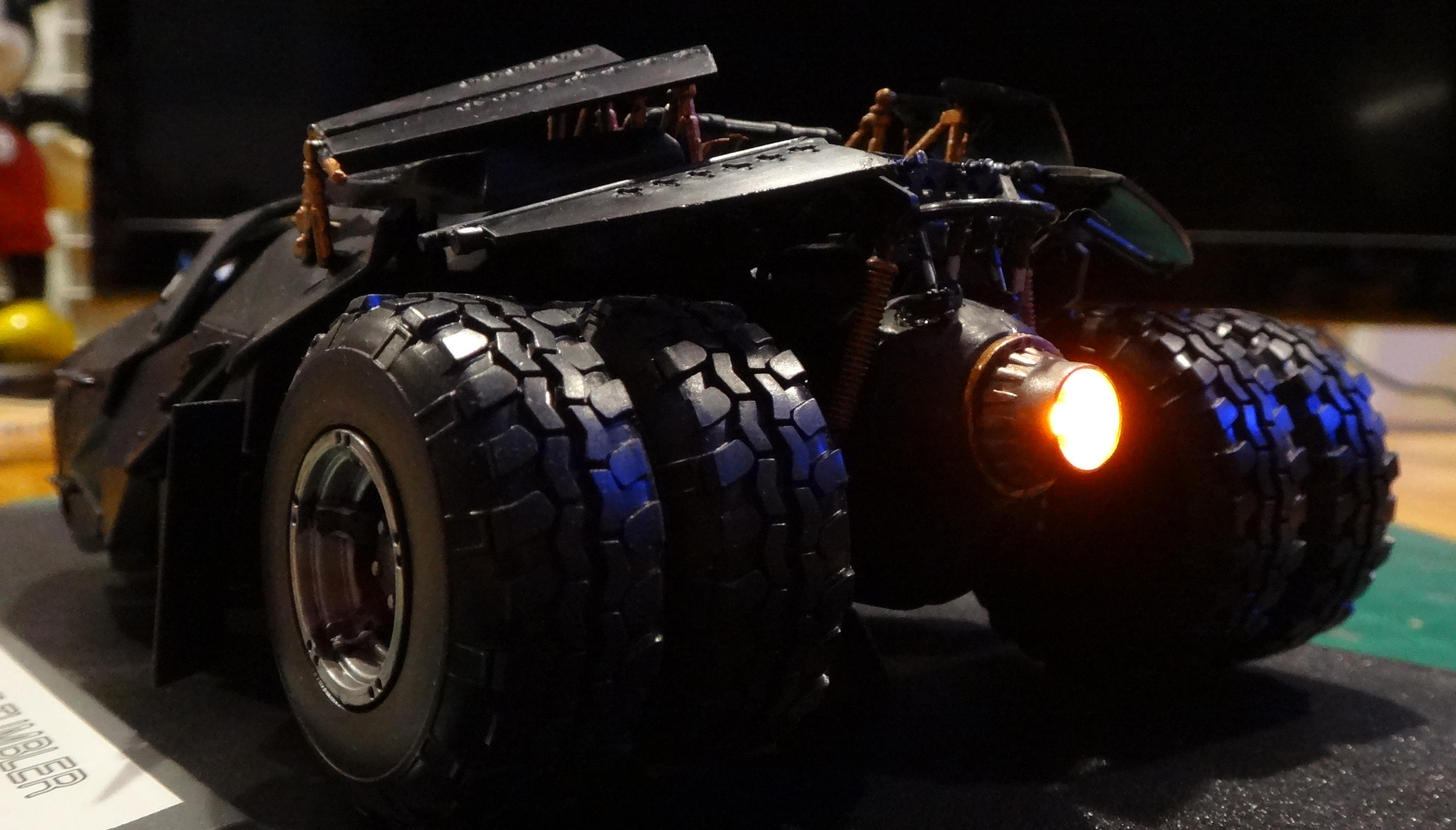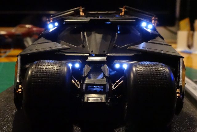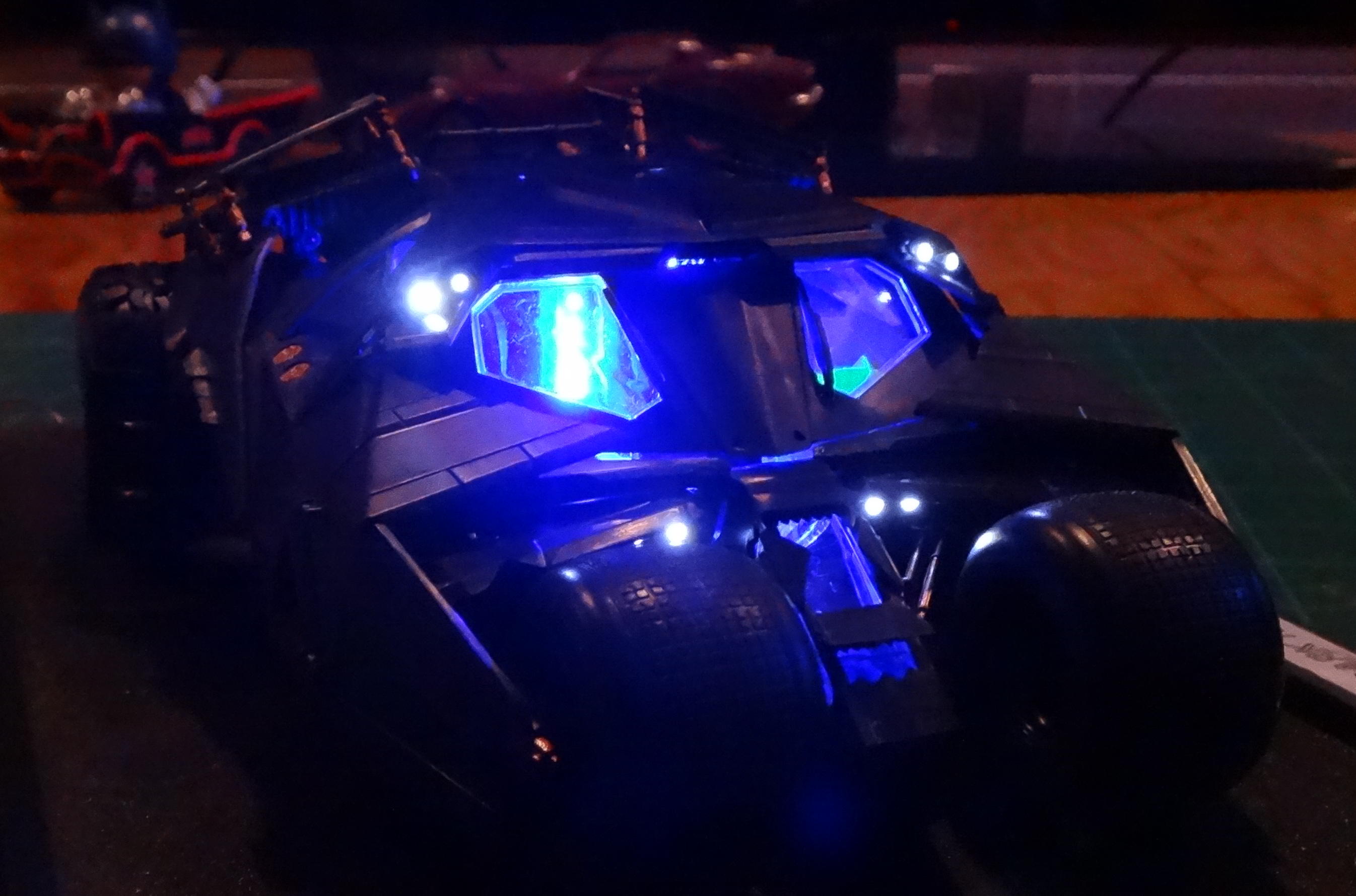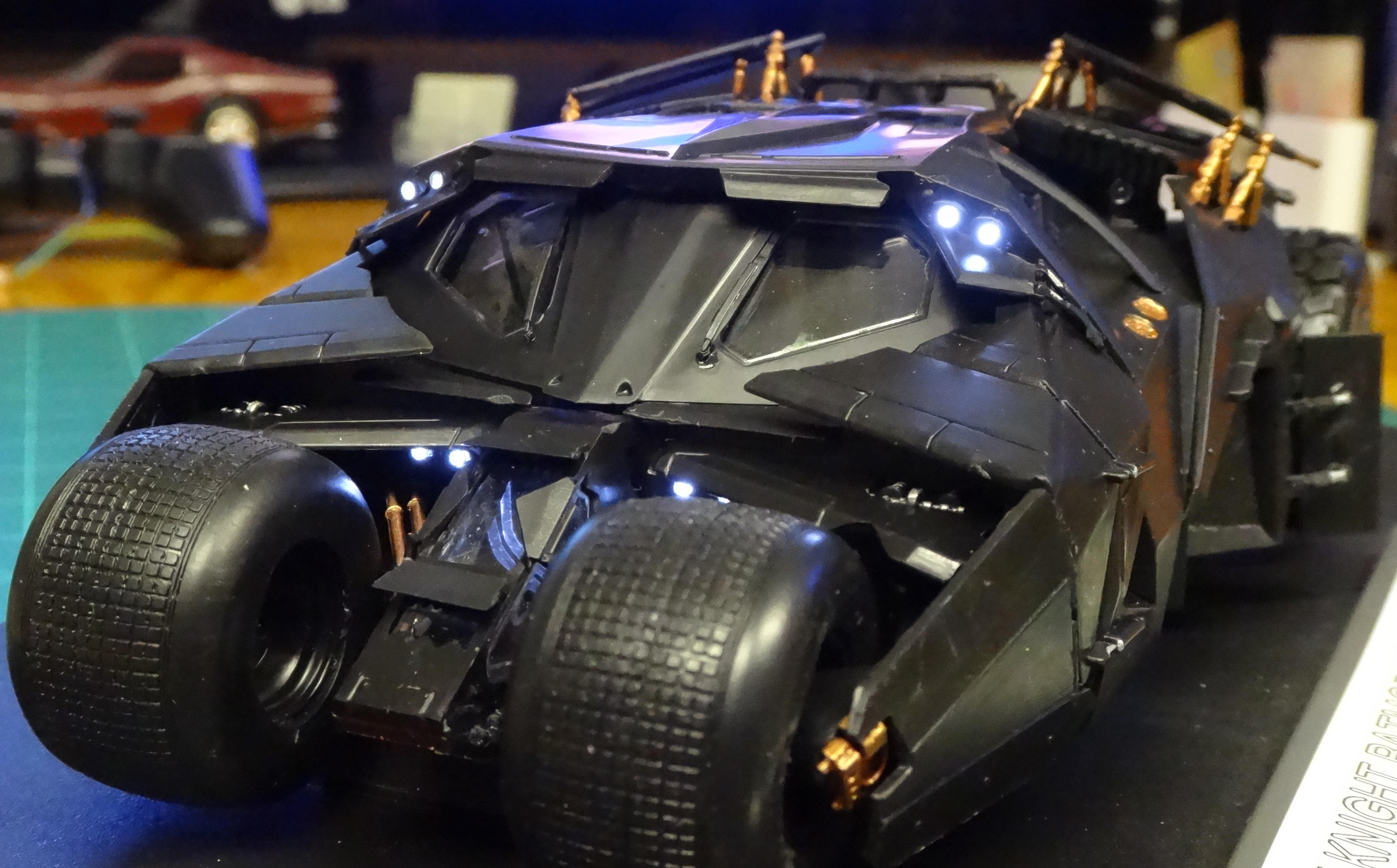 This is a Moebius Batmobile Tumbler I built a few month ago. I used neon paint to light up interior screen panels..