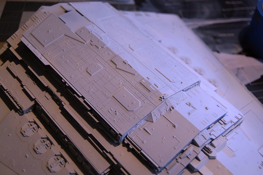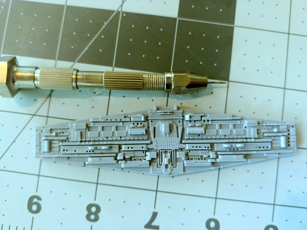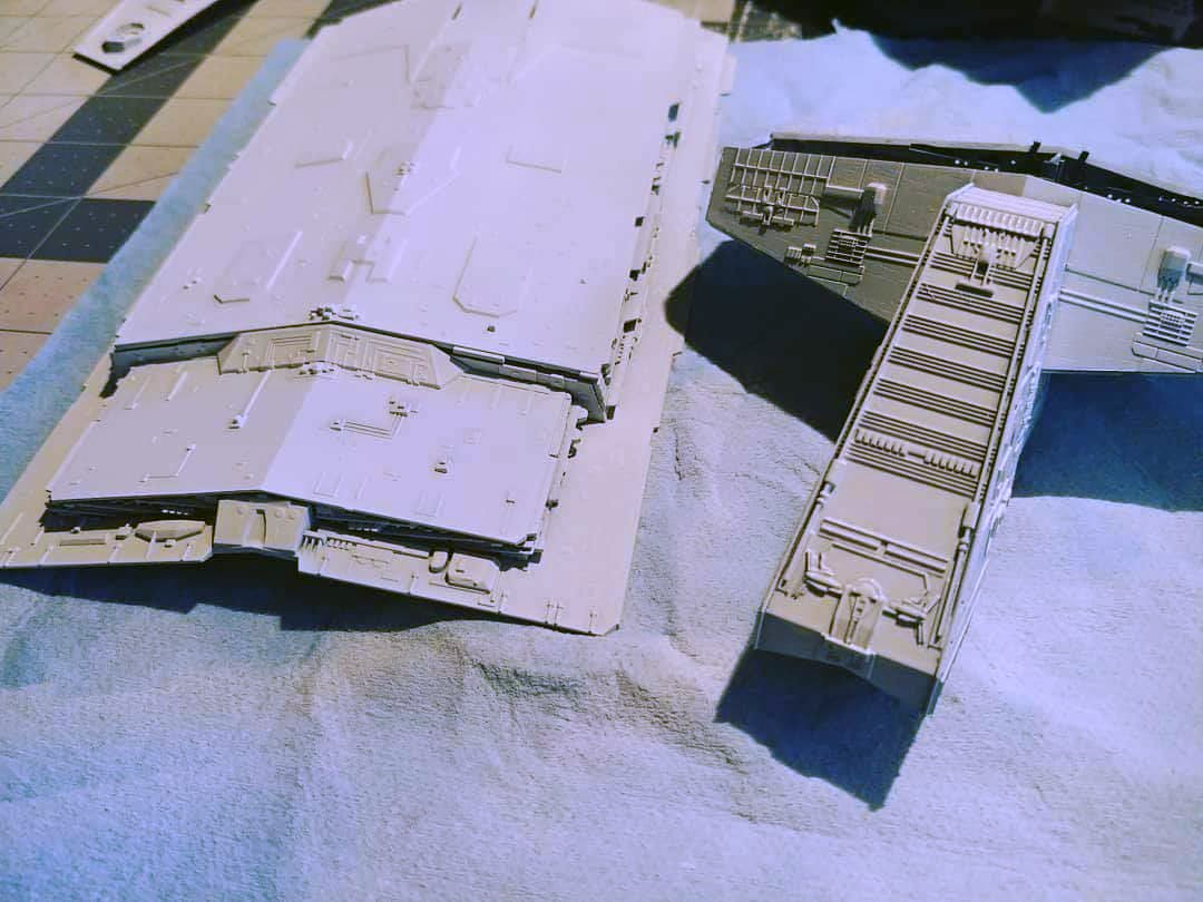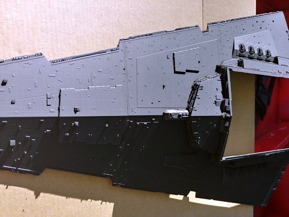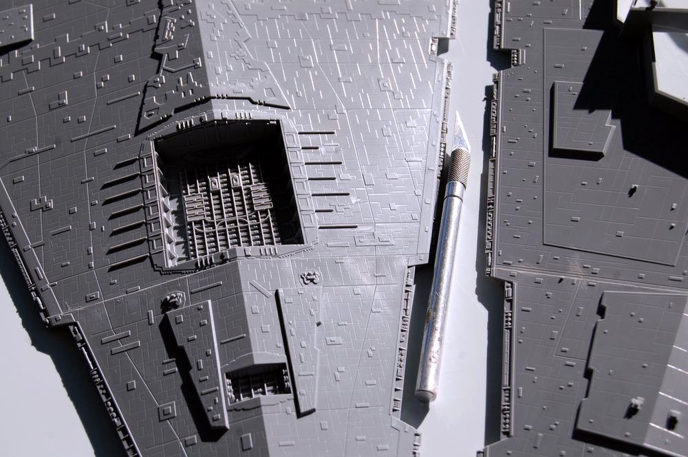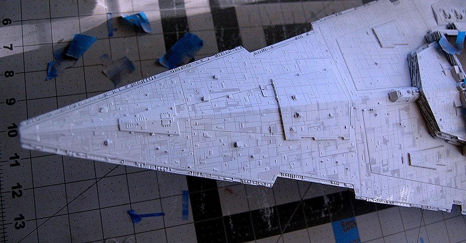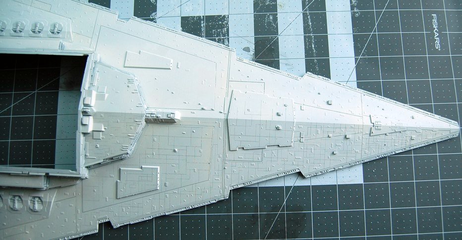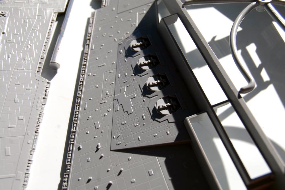 “I’ve finished the panels on the top of the ship, and then I went back over all of them with the base color to blend them in, then I tried to take some pics of how I saw the ship in the movie as far as how the panels and scribing is seen, as in the movies you really don’t see it unless it’s in a close up. I think in these pics it shows how from a distance you don’t even see them, then as you get closer they’re more prominent.