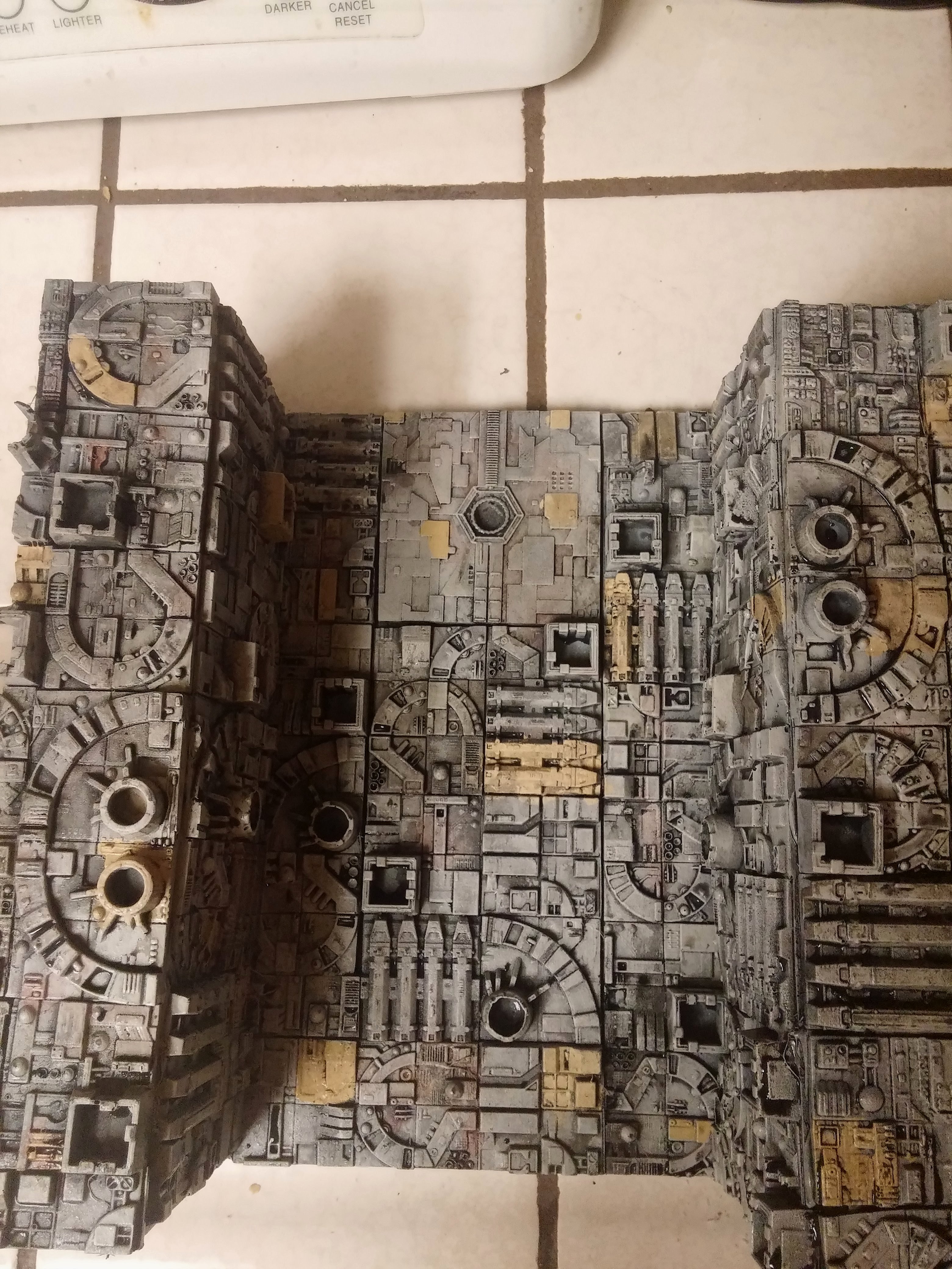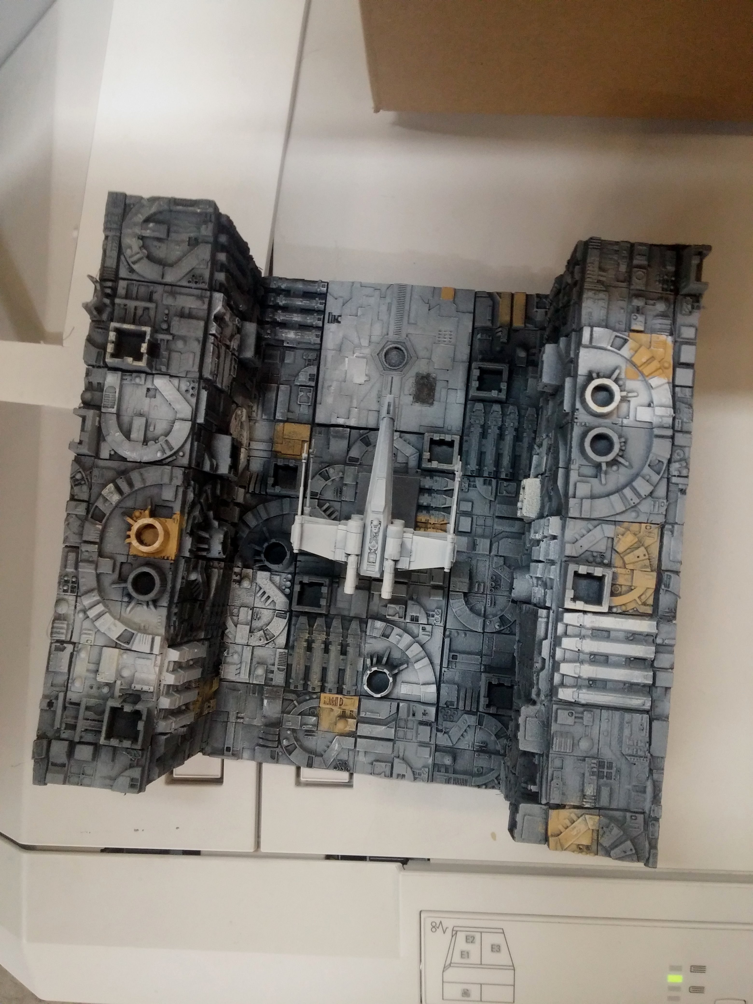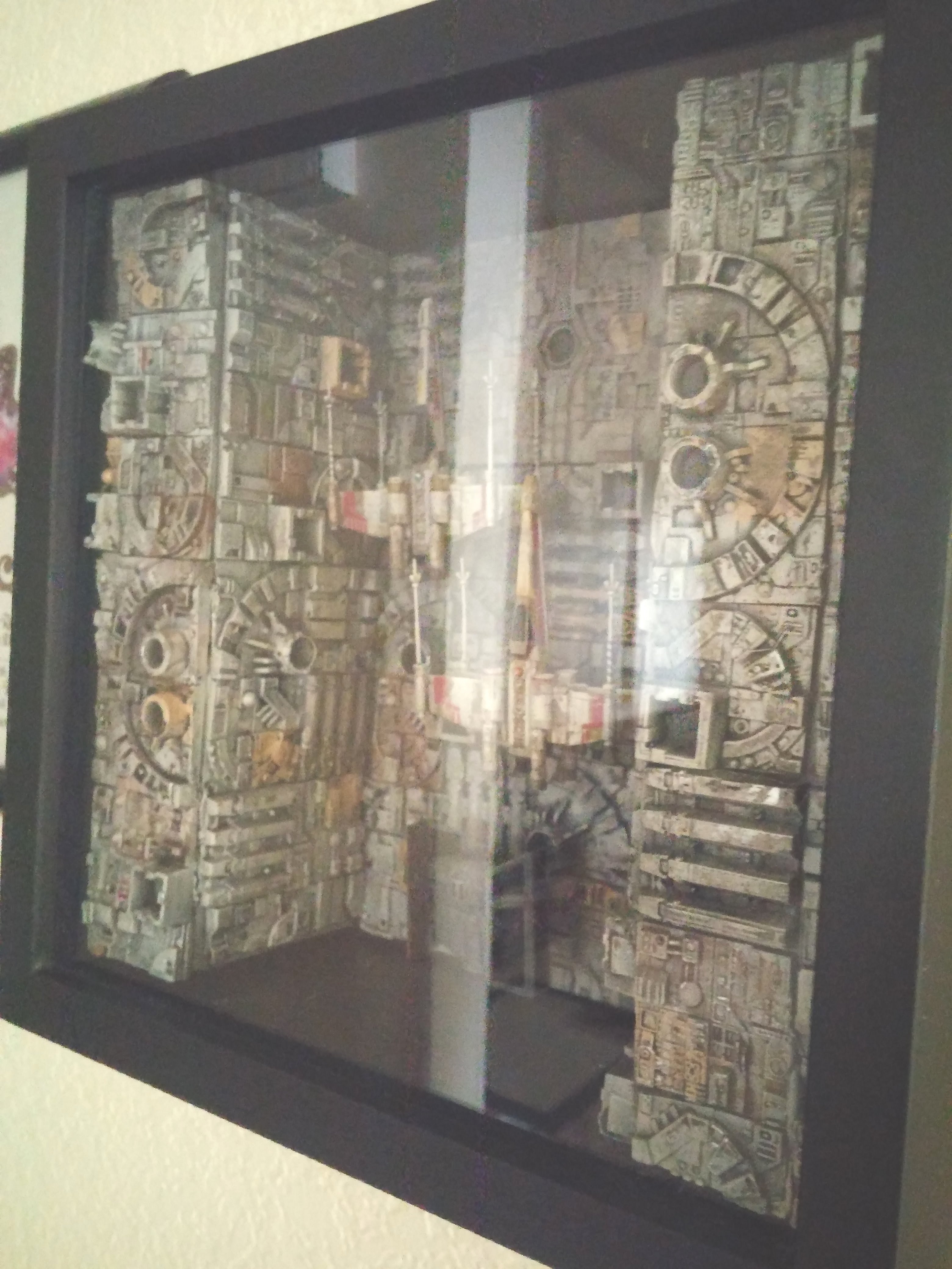 How absolutely fantastic is this display by artist Dannon Marsh of OtherWorld Models! Hanging on a wall in a Shadow-Box, it is out of the way, and enough to show the amazing scene we all remember utilizing the small 1/144 BanDai X-Wing’s and Vader TIE X-1! Nicely done!