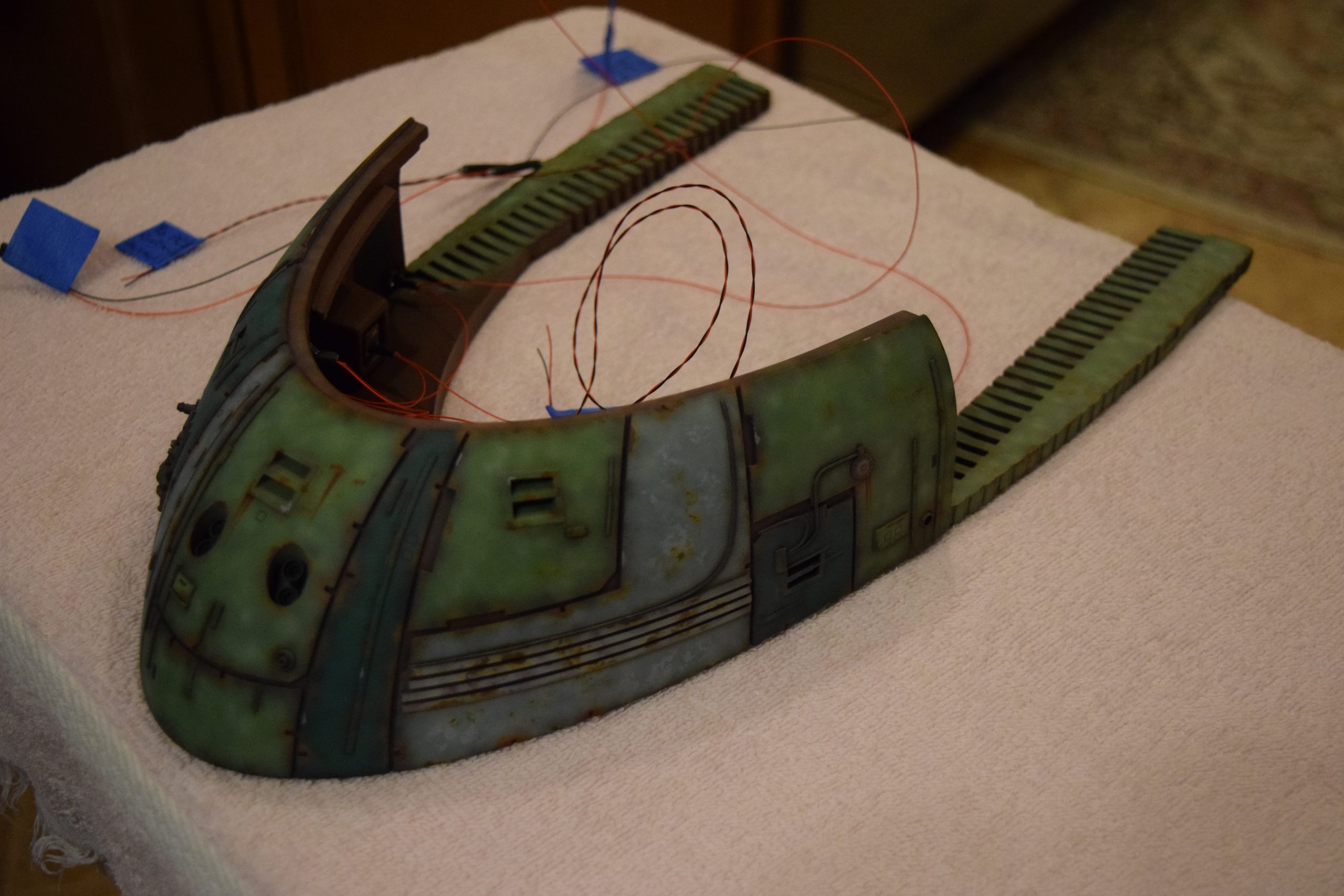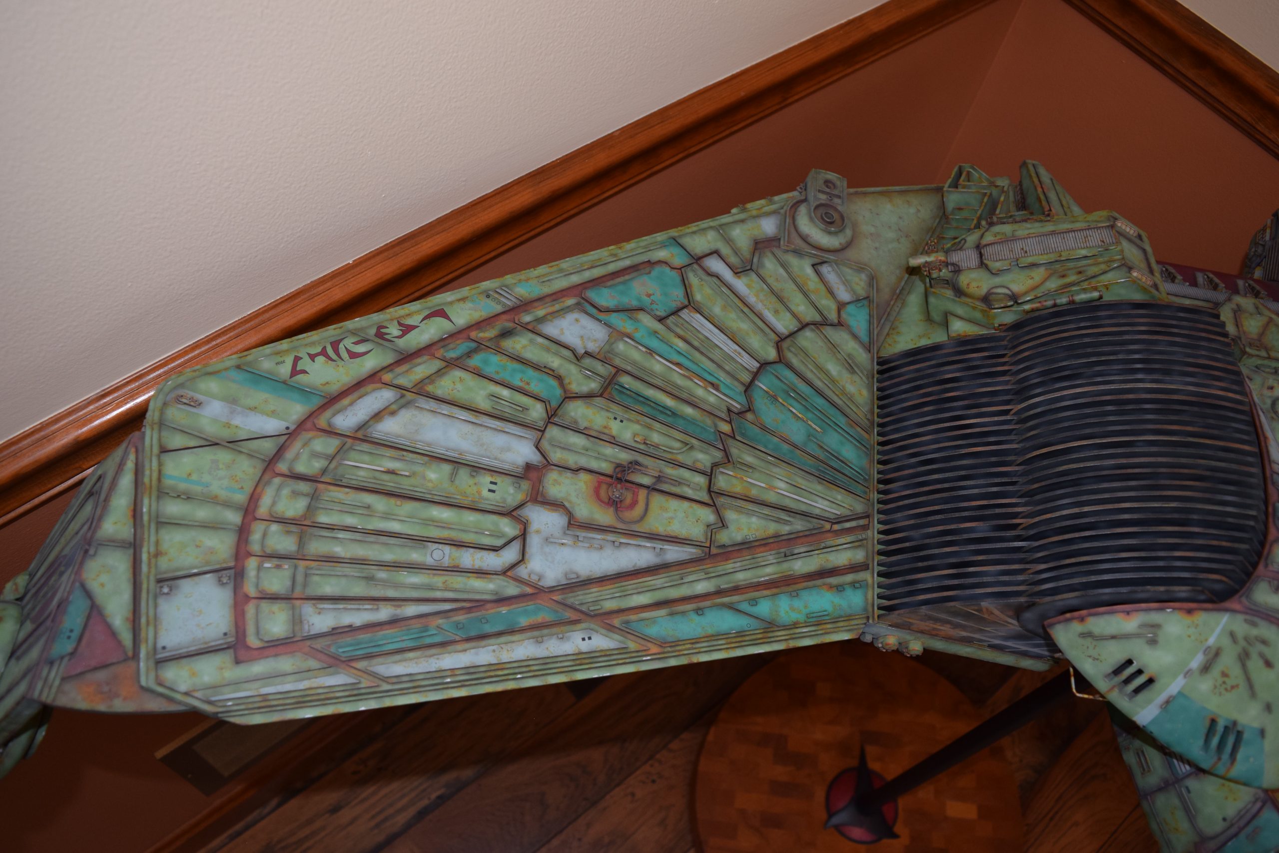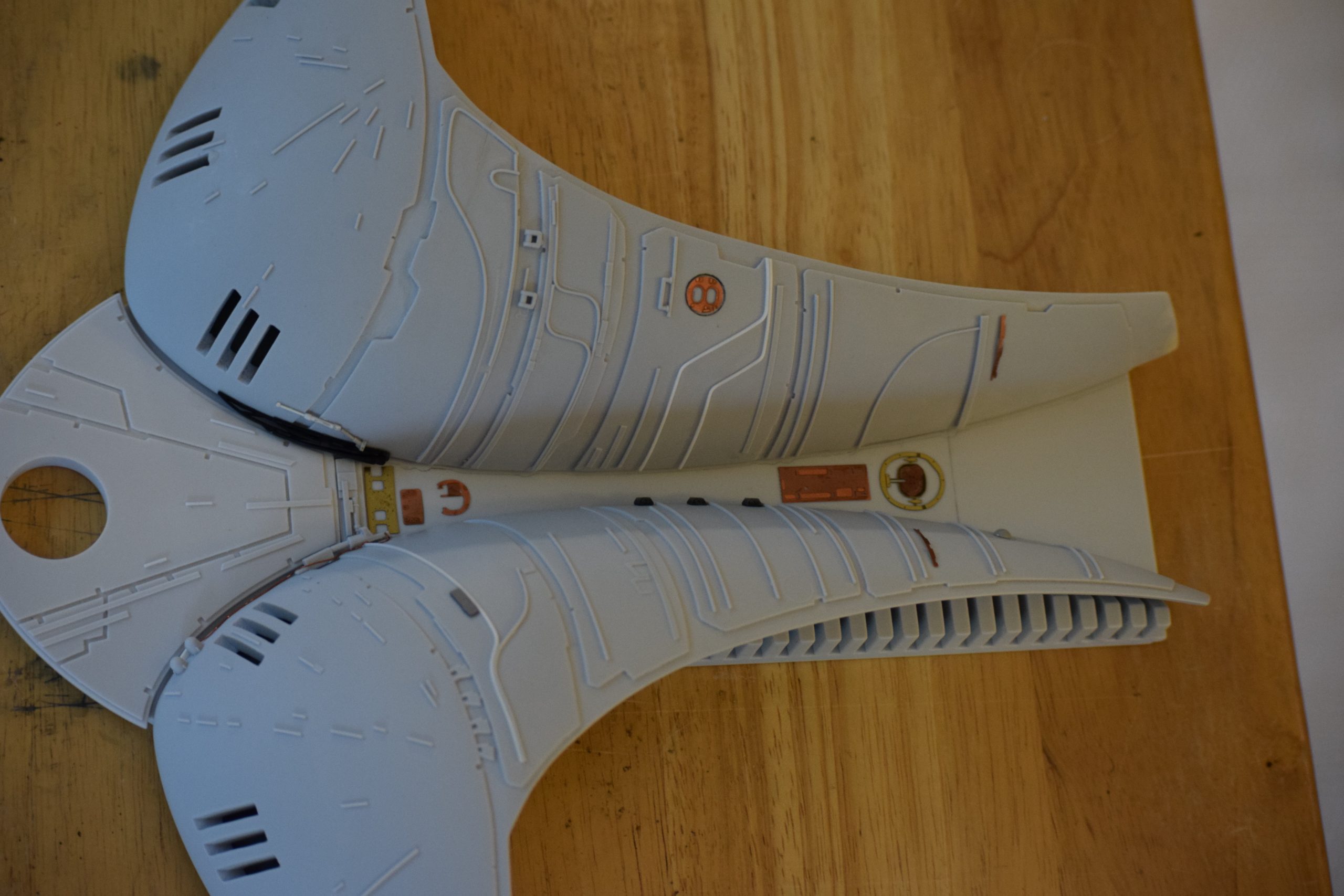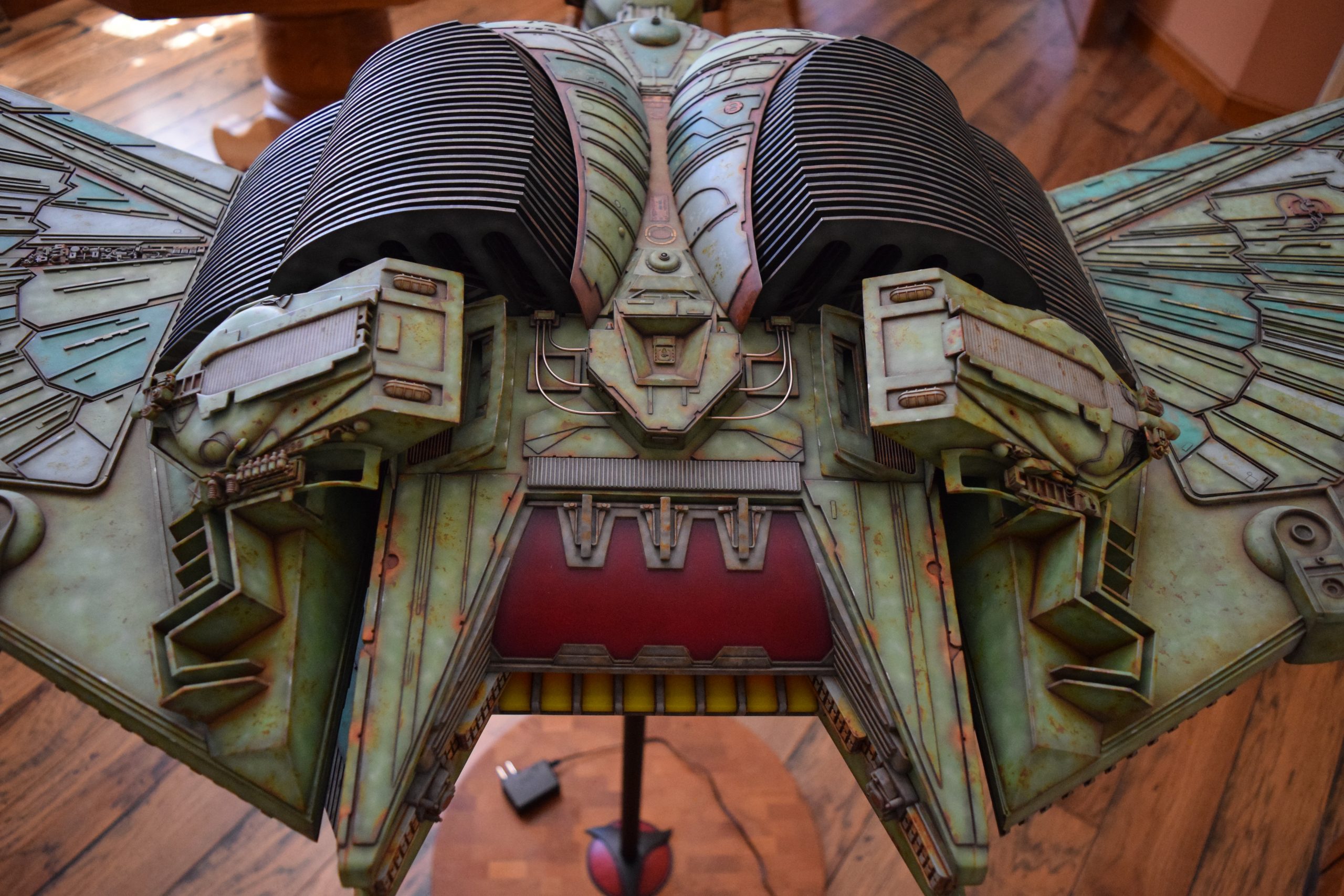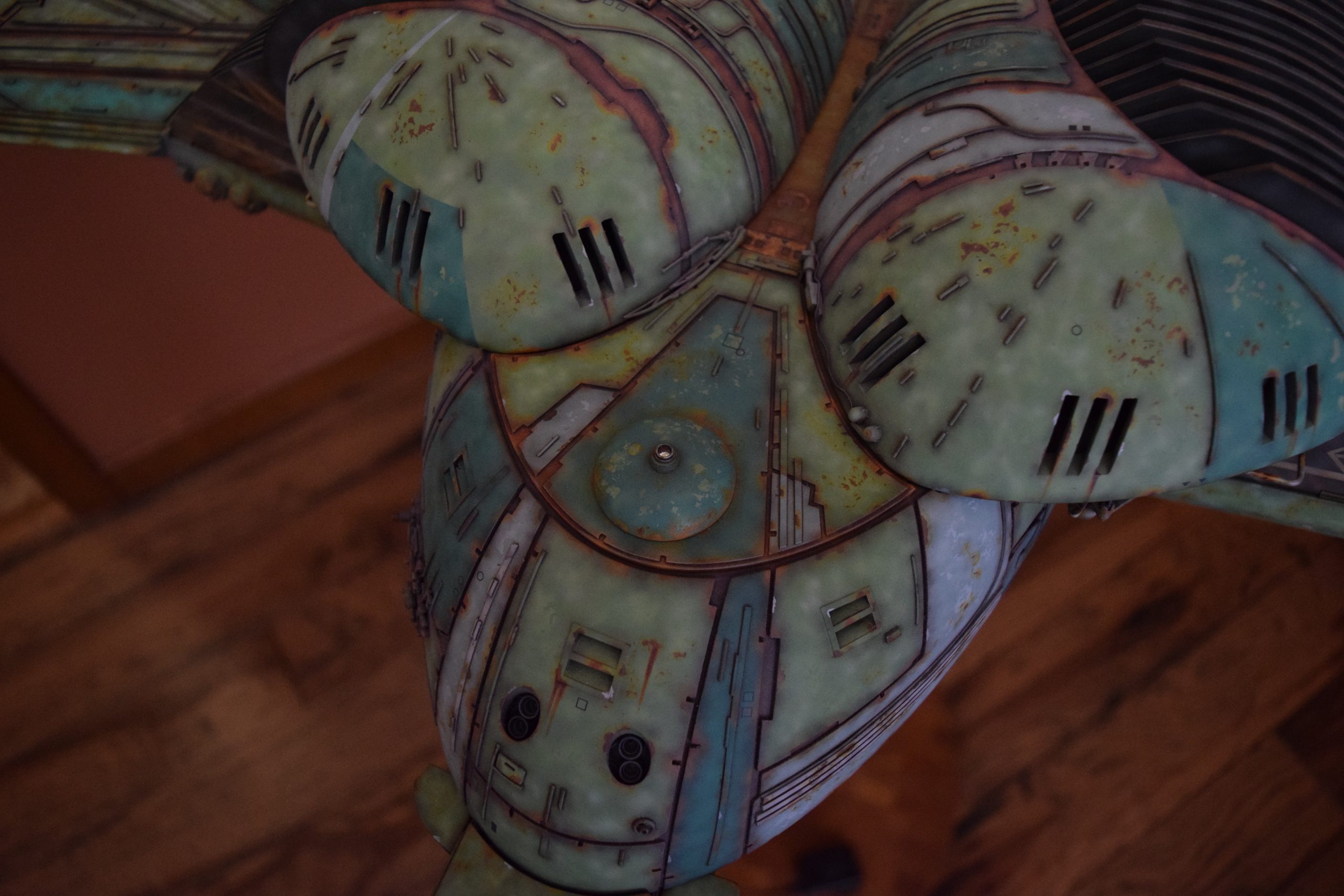 I built the armature (mainly just adding the wing hinge pieces to the wing armature plates – and to the main body armature), then added the detail pieces around the perimeter of the main body armature. From references, I was able to learn the wing angle positions for cruise (slightly angled upward) and attack (angled downward). Using a template with these angles, I positioned the wings at these positions and added identifying strips on the hinges, such that they would align at the corresponding angles – for use when displaying the wings at these different positions.
