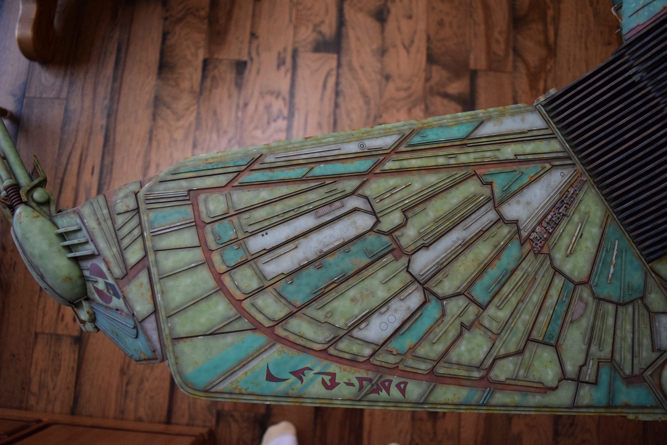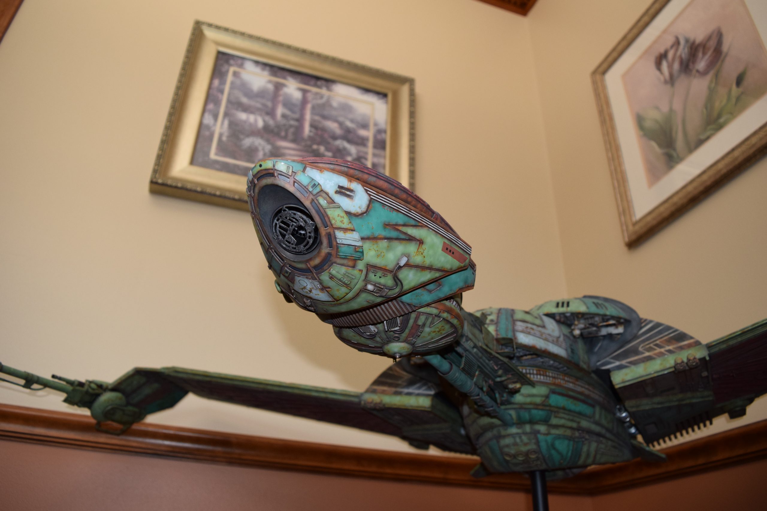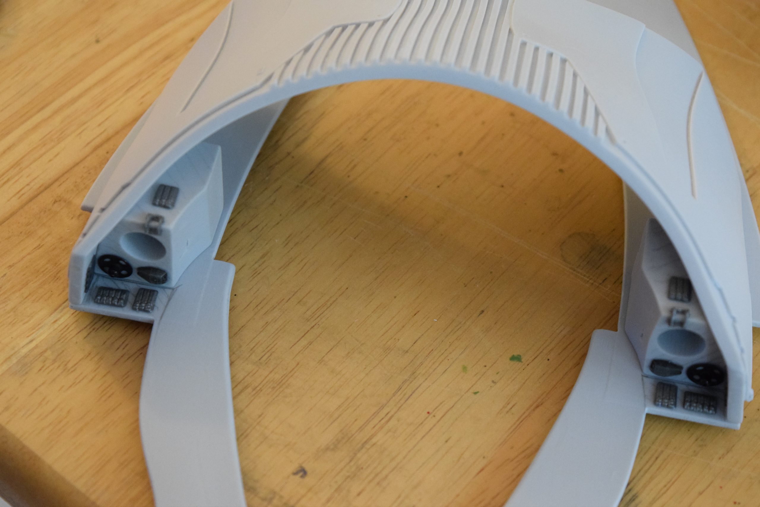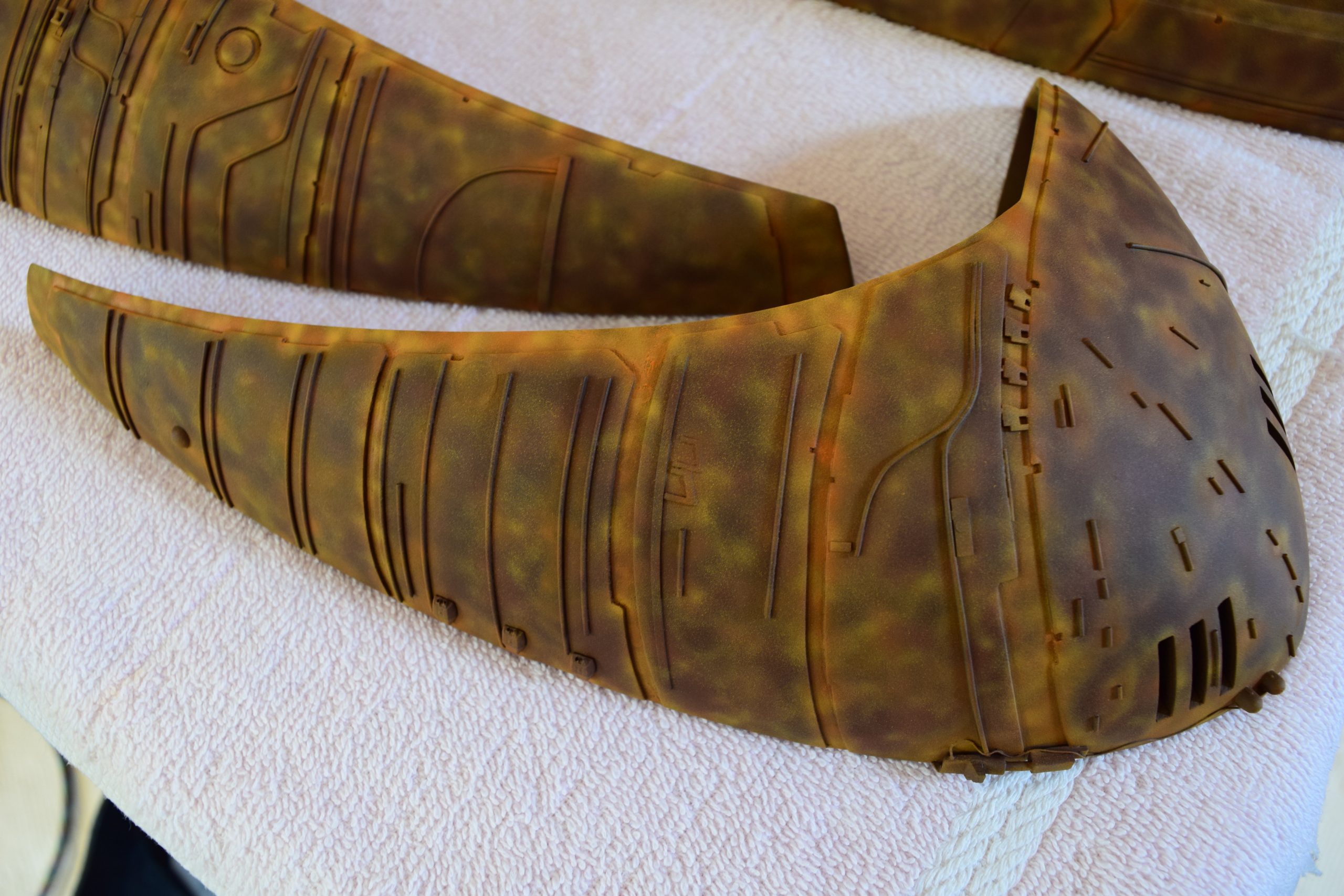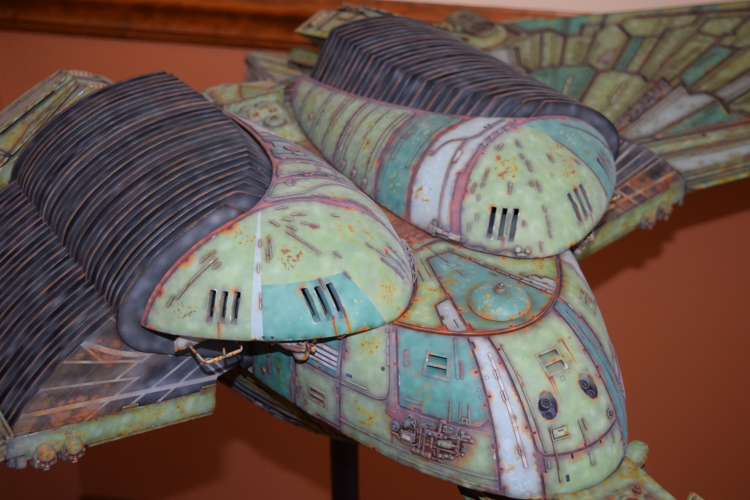 I built the armature (mainly just adding the wing hinge pieces to the wing armature plates – and to the main body armature), then added the detail pieces around the perimeter of the main body armature. From references, I was able to learn the wing angle positions for cruise (slightly angled upward) and attack (angled downward). Using a template with these angles, I positioned the wings at these positions and added identifying strips on the hinges, such that they would align at the corresponding angles – for use when displaying the wings at these different positions.