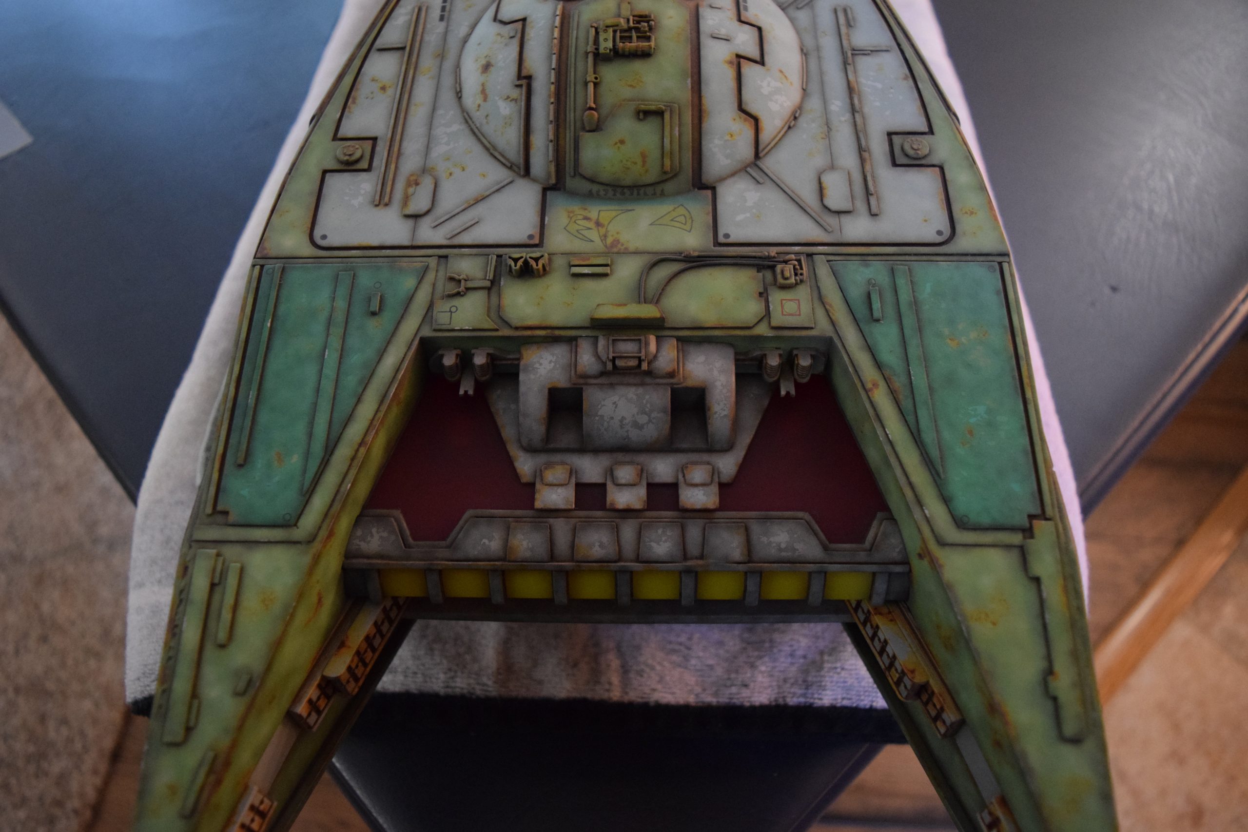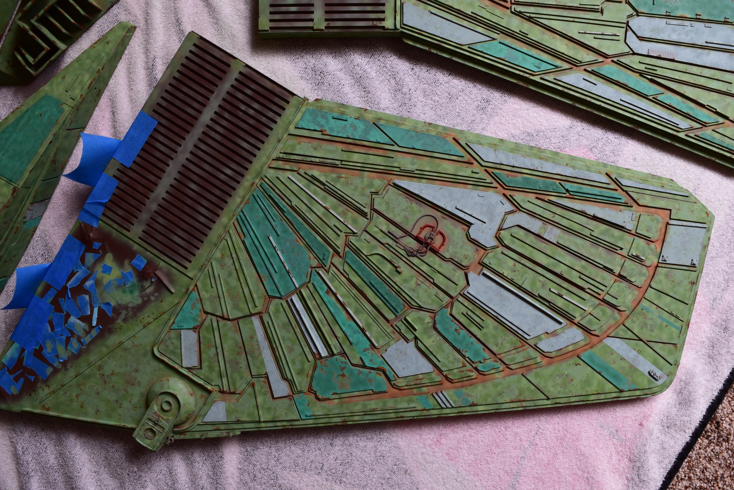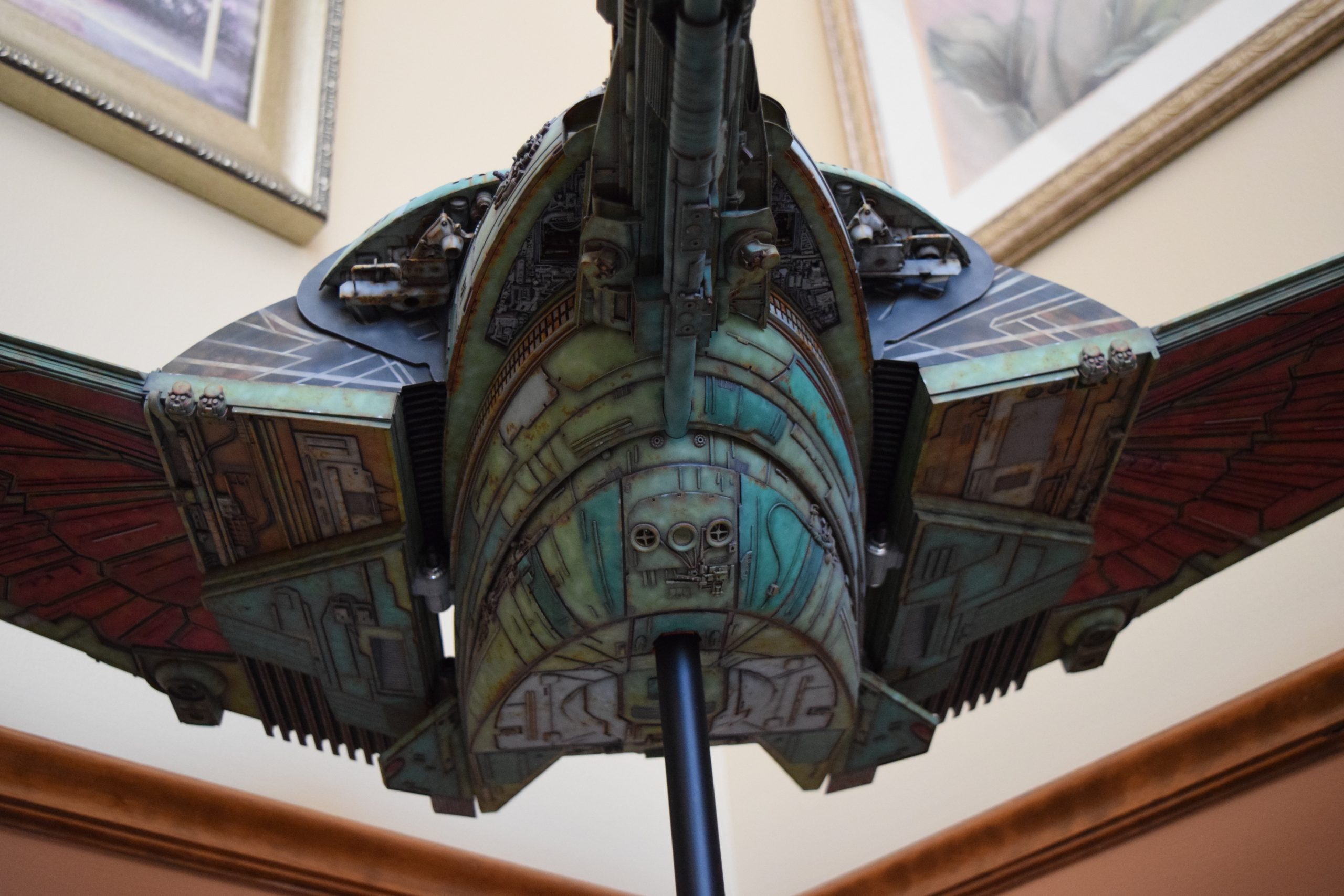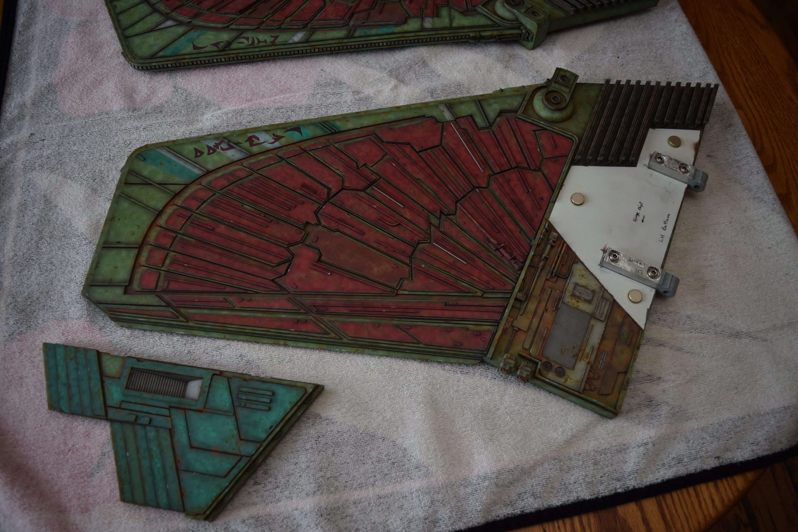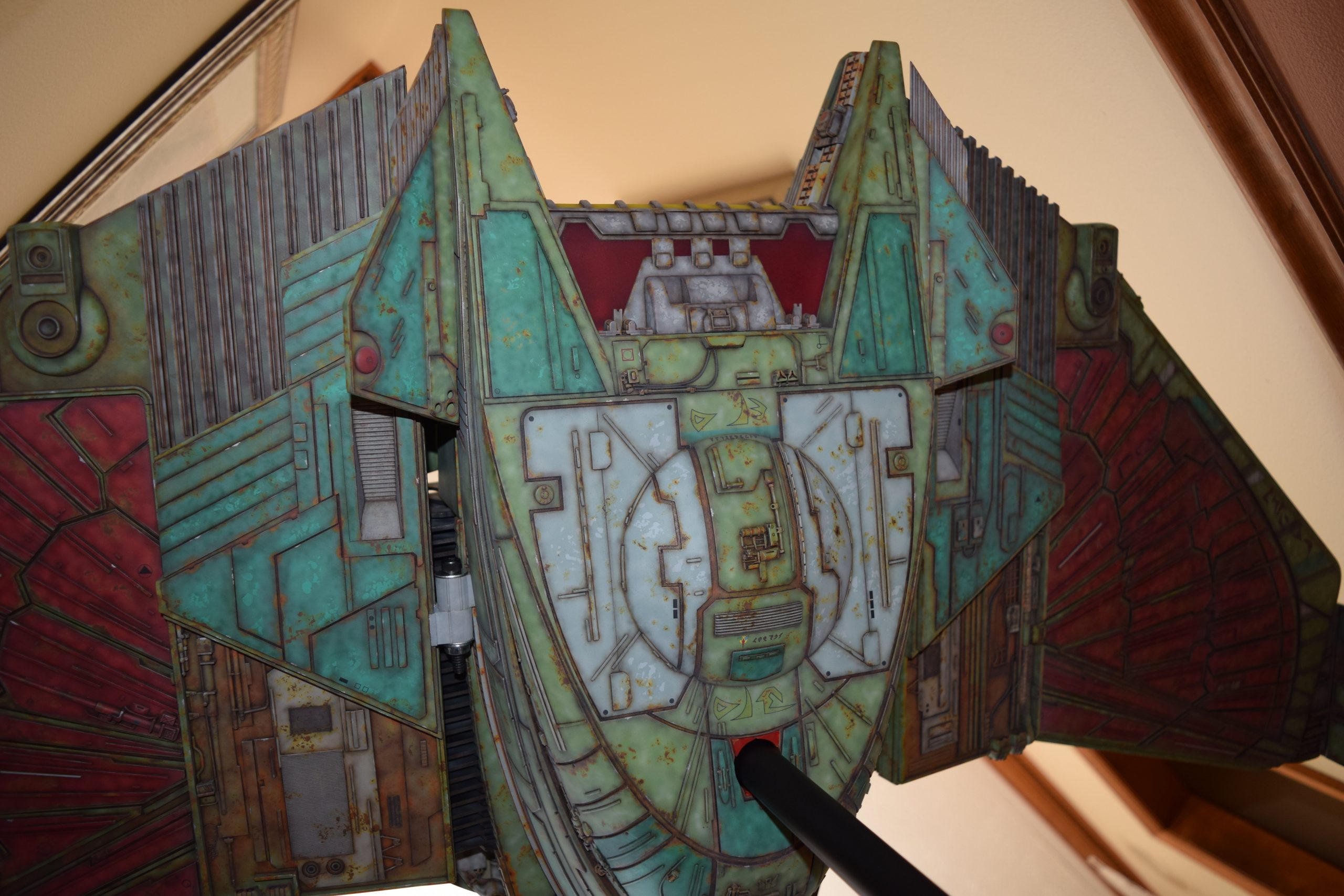 I built the armature (mainly just adding the wing hinge pieces to the wing armature plates – and to the main body armature), then added the detail pieces around the perimeter of the main body armature. From references, I was able to learn the wing angle positions for cruise (slightly angled upward) and attack (angled downward). Using a template with these angles, I positioned the wings at these positions and added identifying strips on the hinges, such that they would align at the corresponding angles – for use when displaying the wings at these different positions.