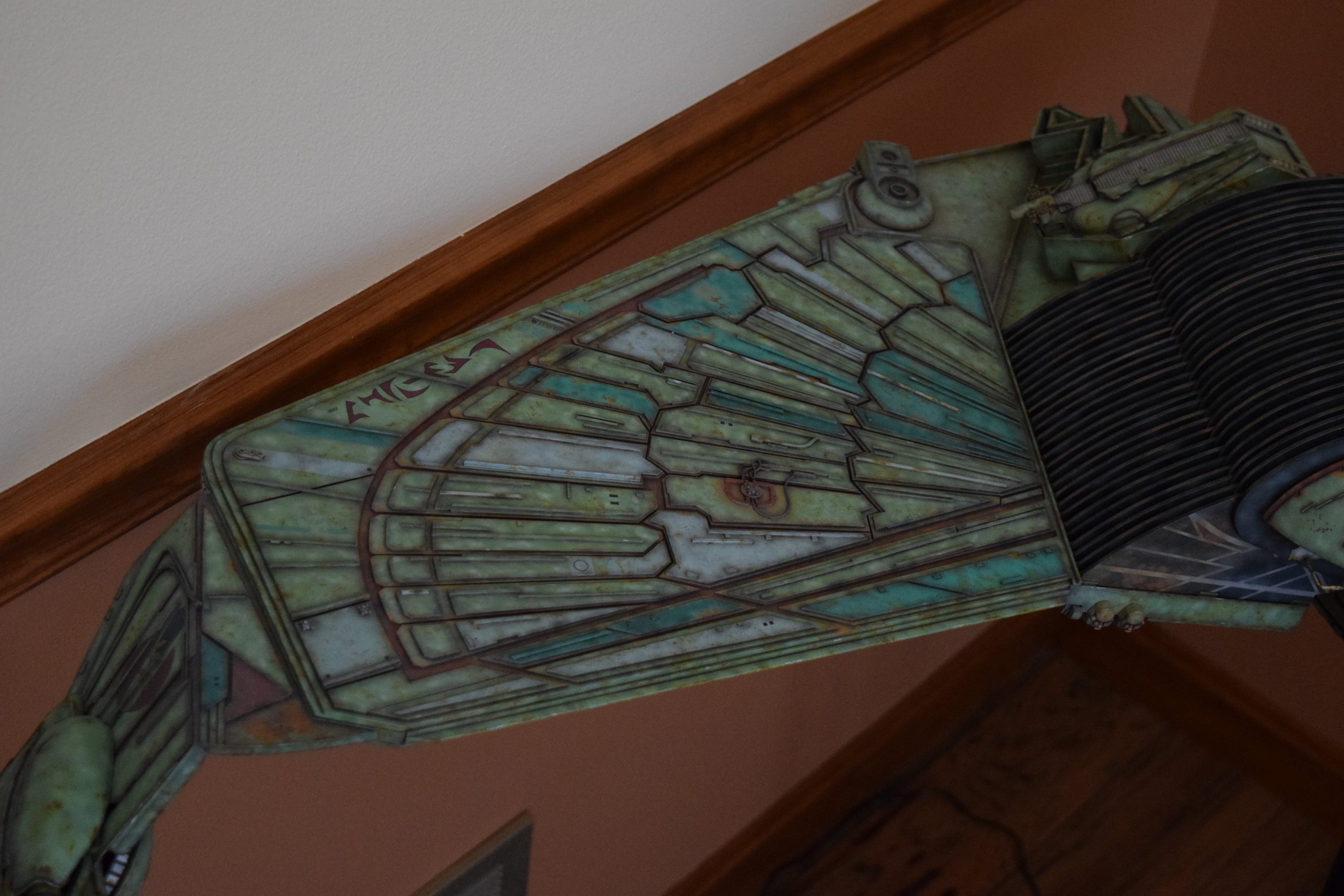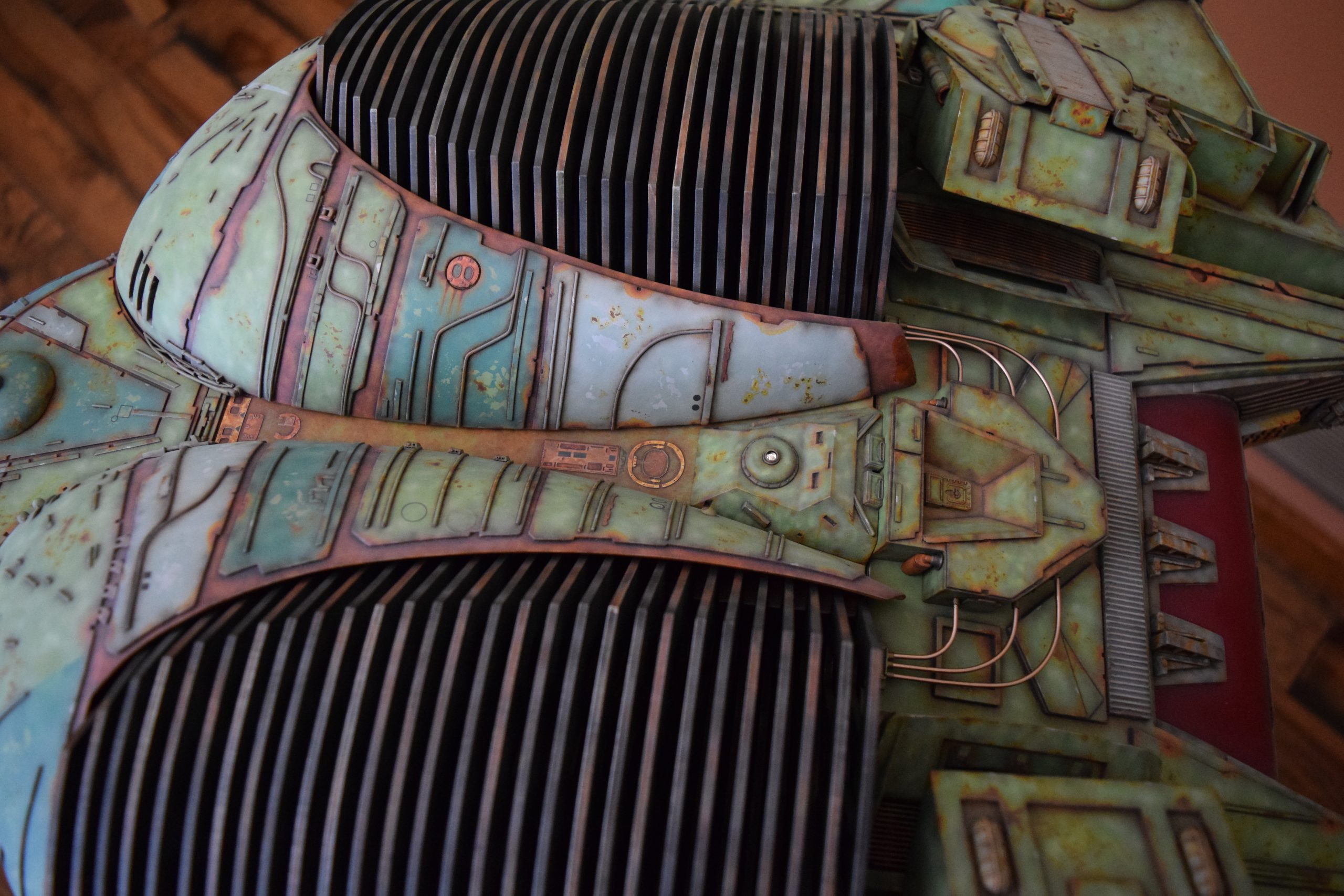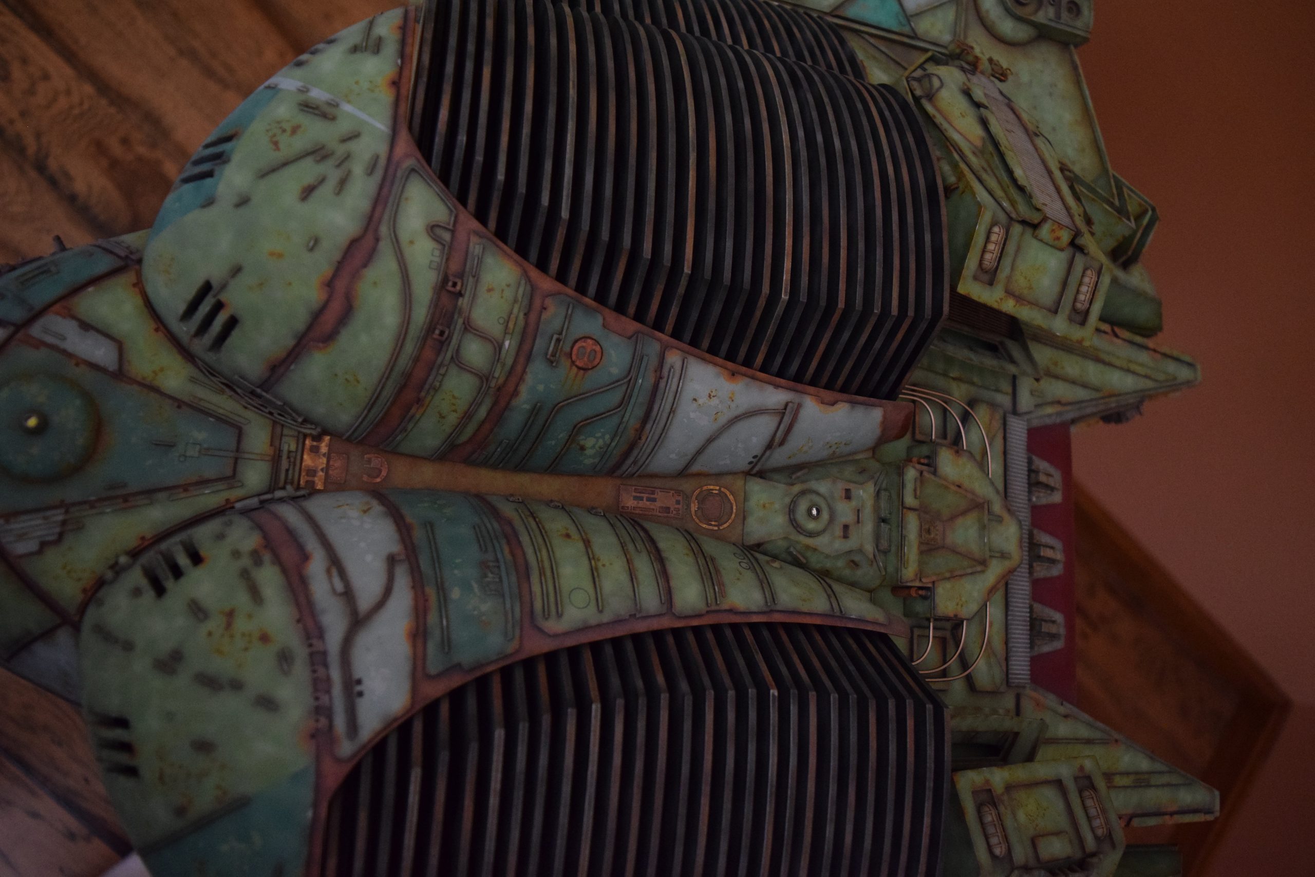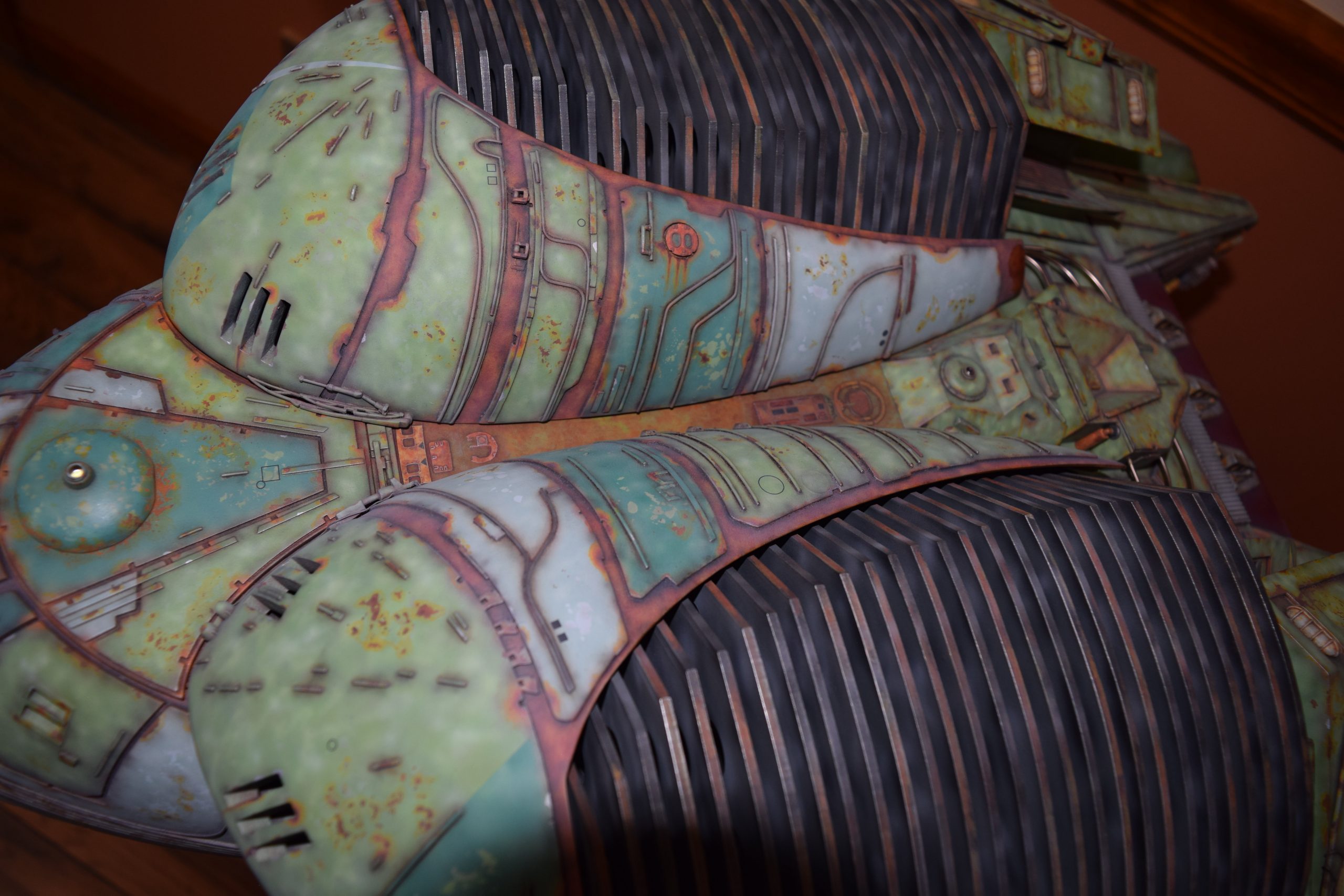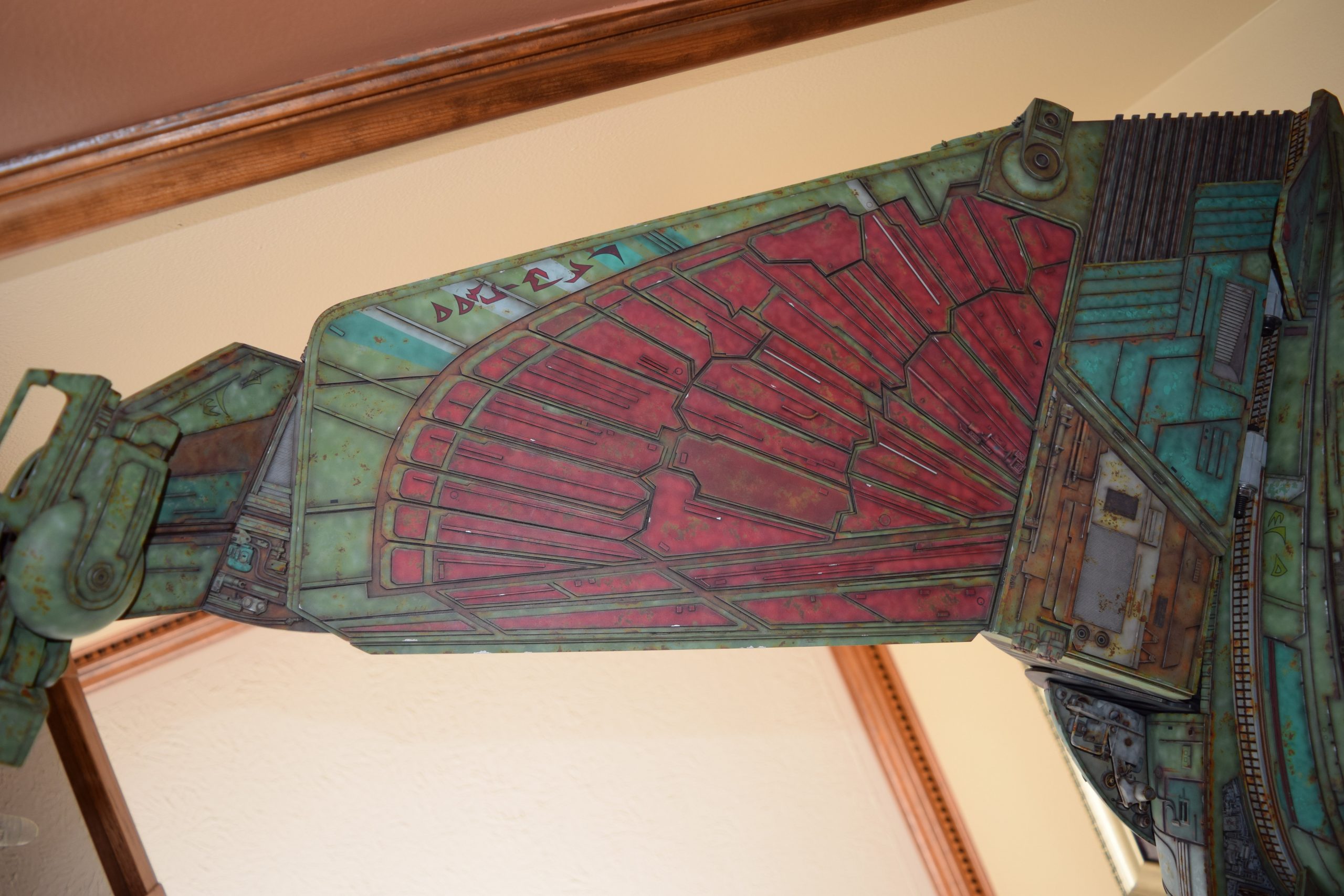 I built the armature (mainly just adding the wing hinge pieces to the wing armature plates – and to the main body armature), then added the detail pieces around the perimeter of the main body armature. From references, I was able to learn the wing angle positions for cruise (slightly angled upward) and attack (angled downward). Using a template with these angles, I positioned the wings at these positions and added identifying strips on the hinges, such that they would align at the corresponding angles – for use when displaying the wings at these different positions.