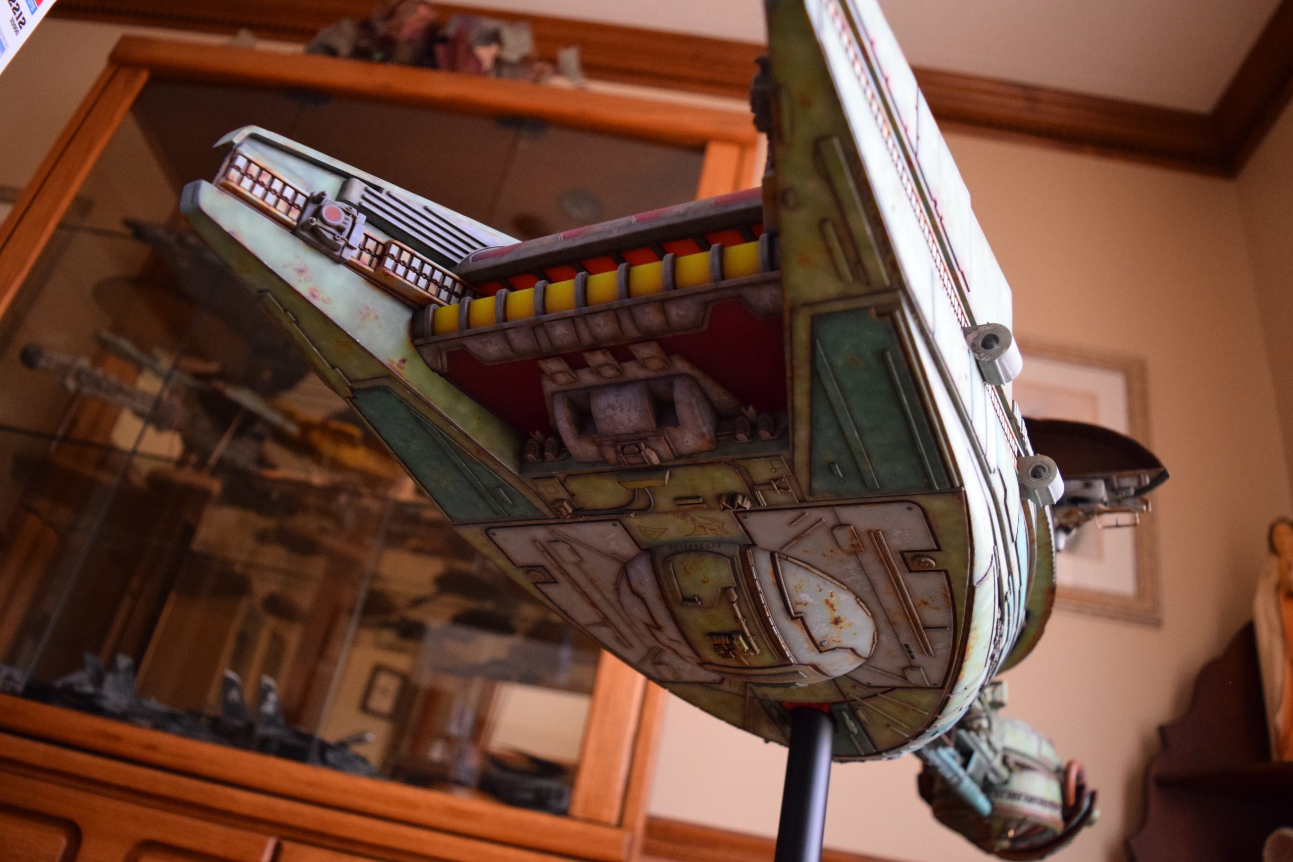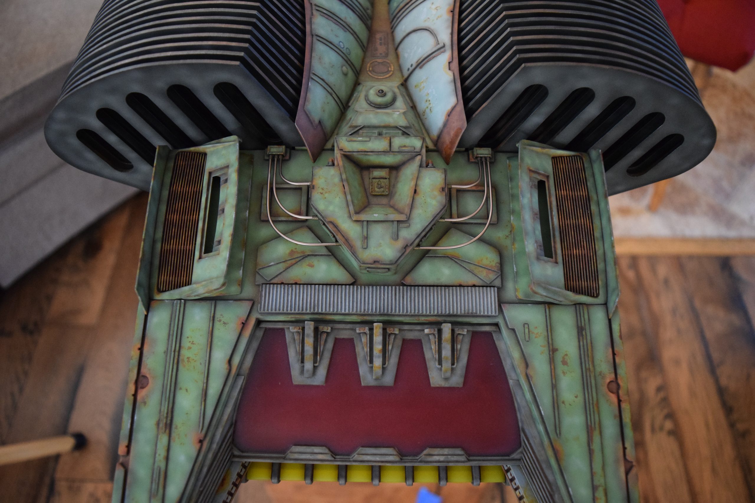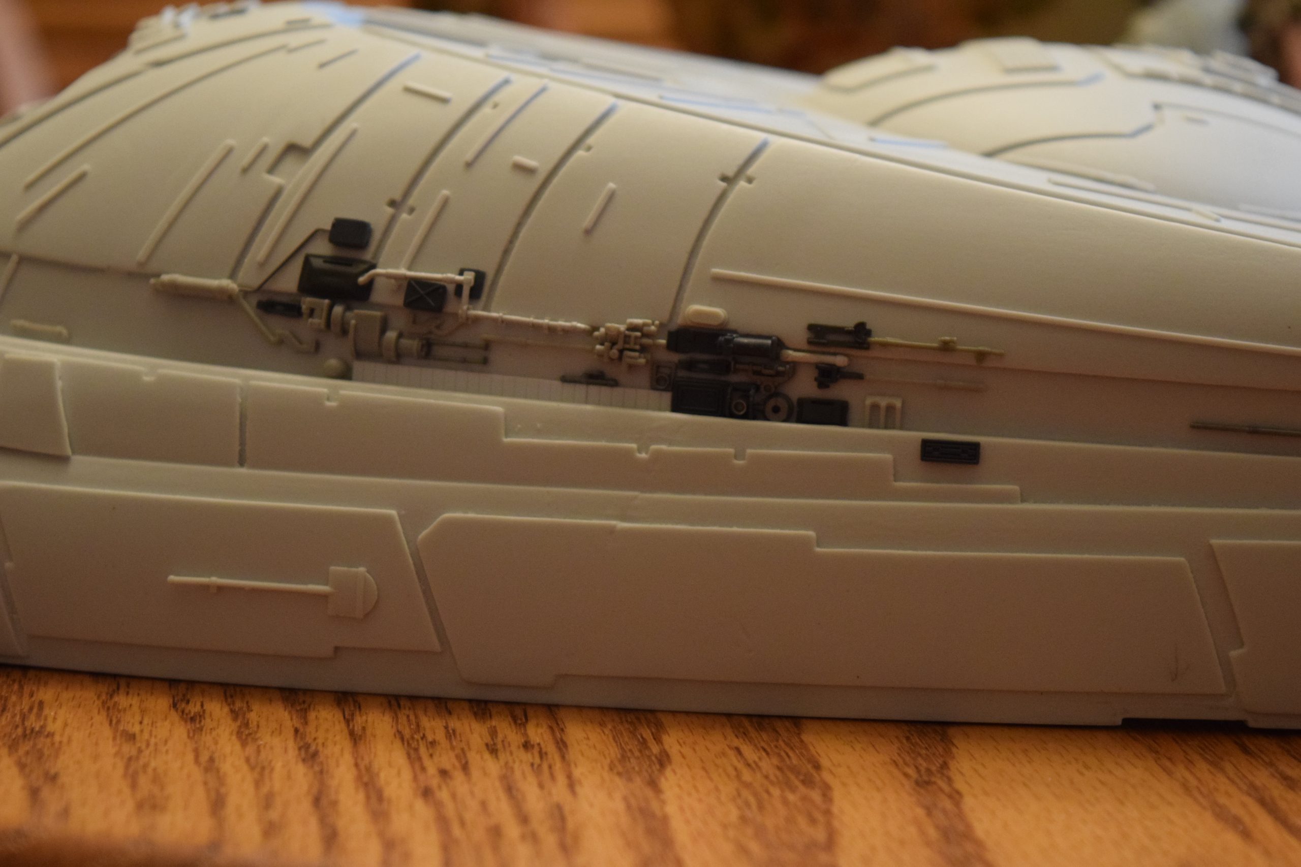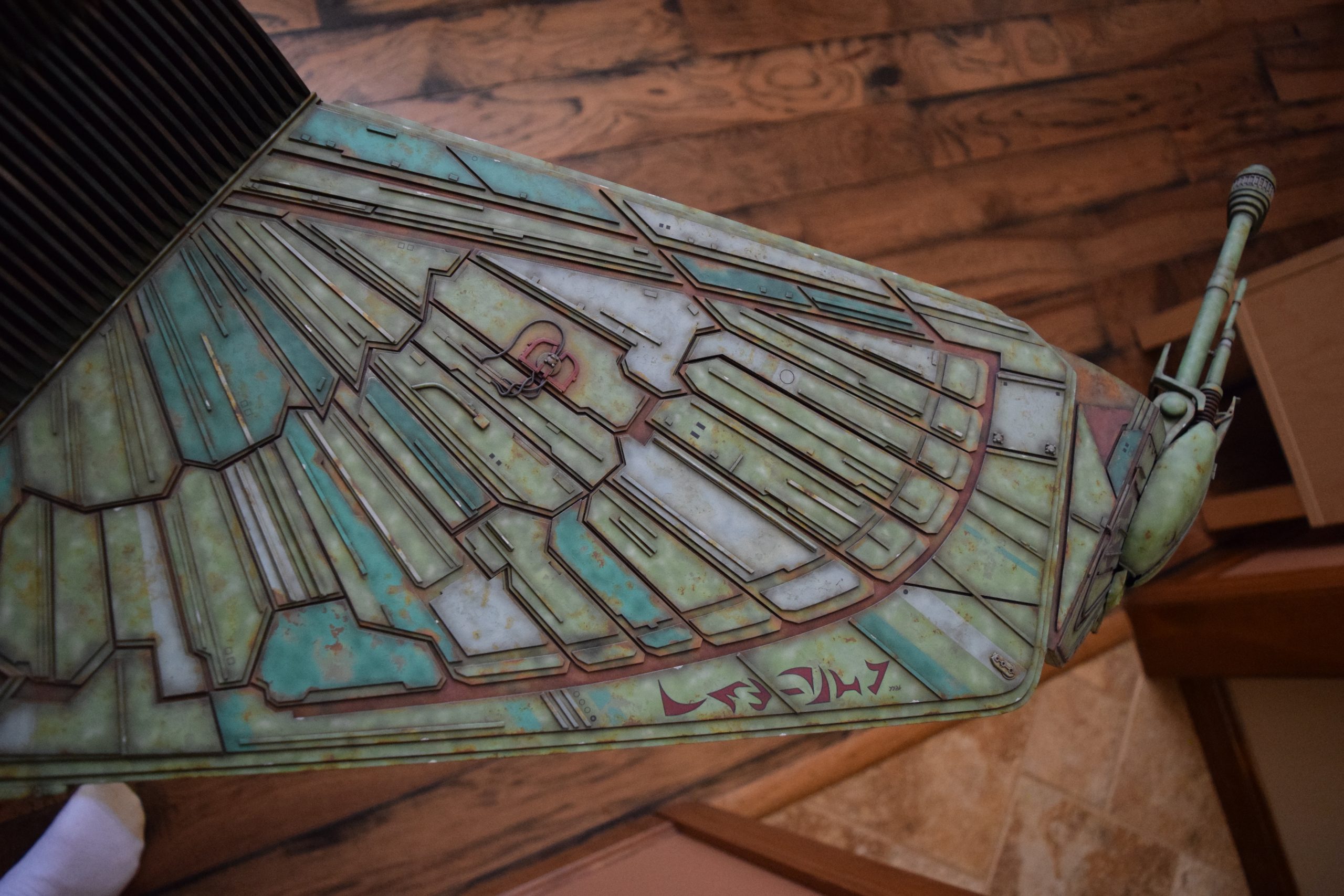 I built the armature (mainly just adding the wing hinge pieces to the wing armature plates – and to the main body armature), then added the detail pieces around the perimeter of the main body armature. From references, I was able to learn the wing angle positions for cruise (slightly angled upward) and attack (angled downward). Using a template with these angles, I positioned the wings at these positions and added identifying strips on the hinges, such that they would align at the corresponding angles – for use when displaying the wings at these different positions.