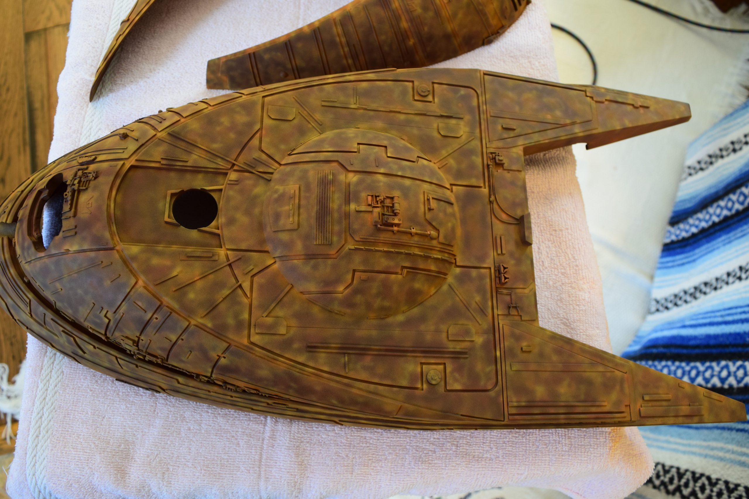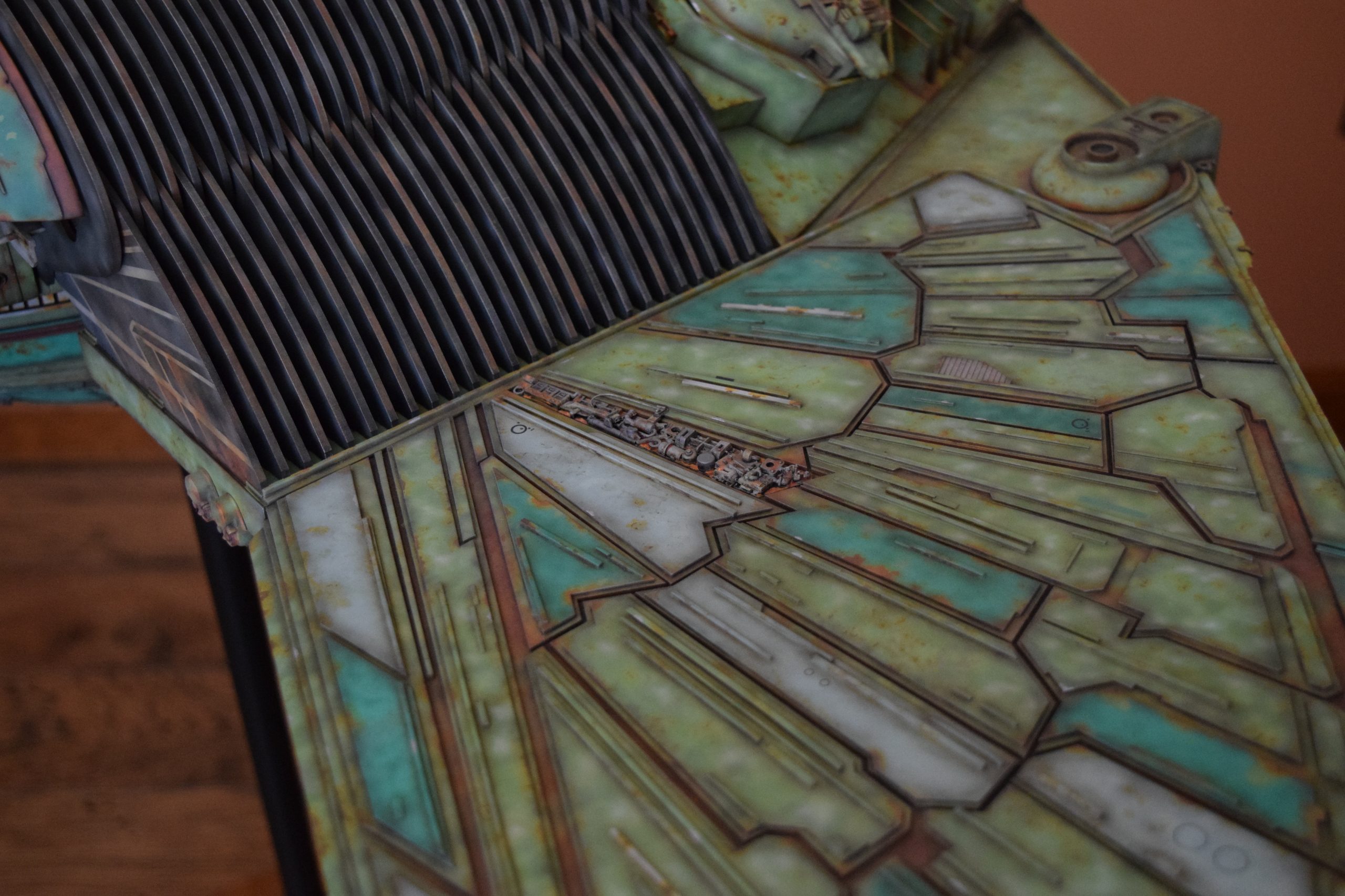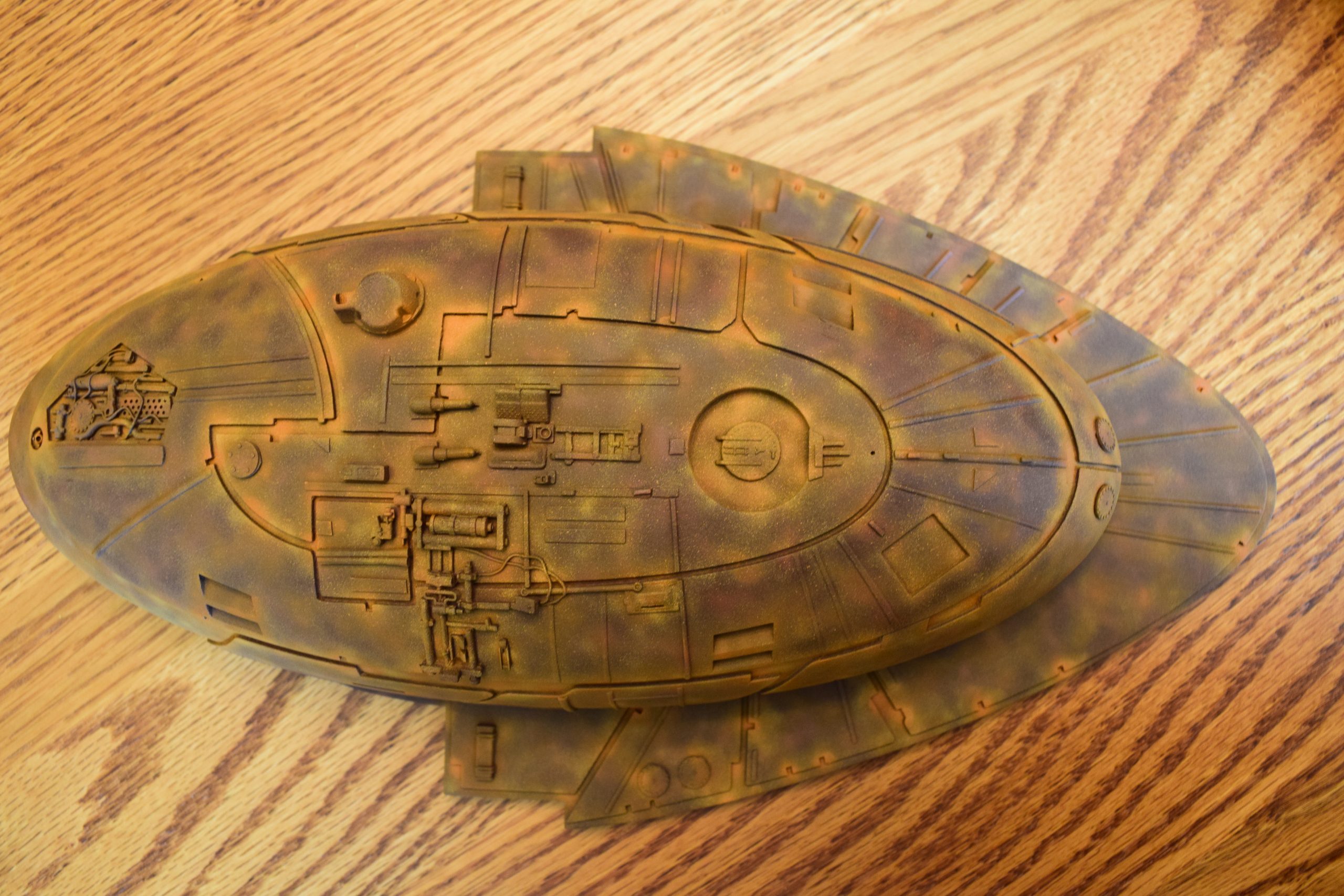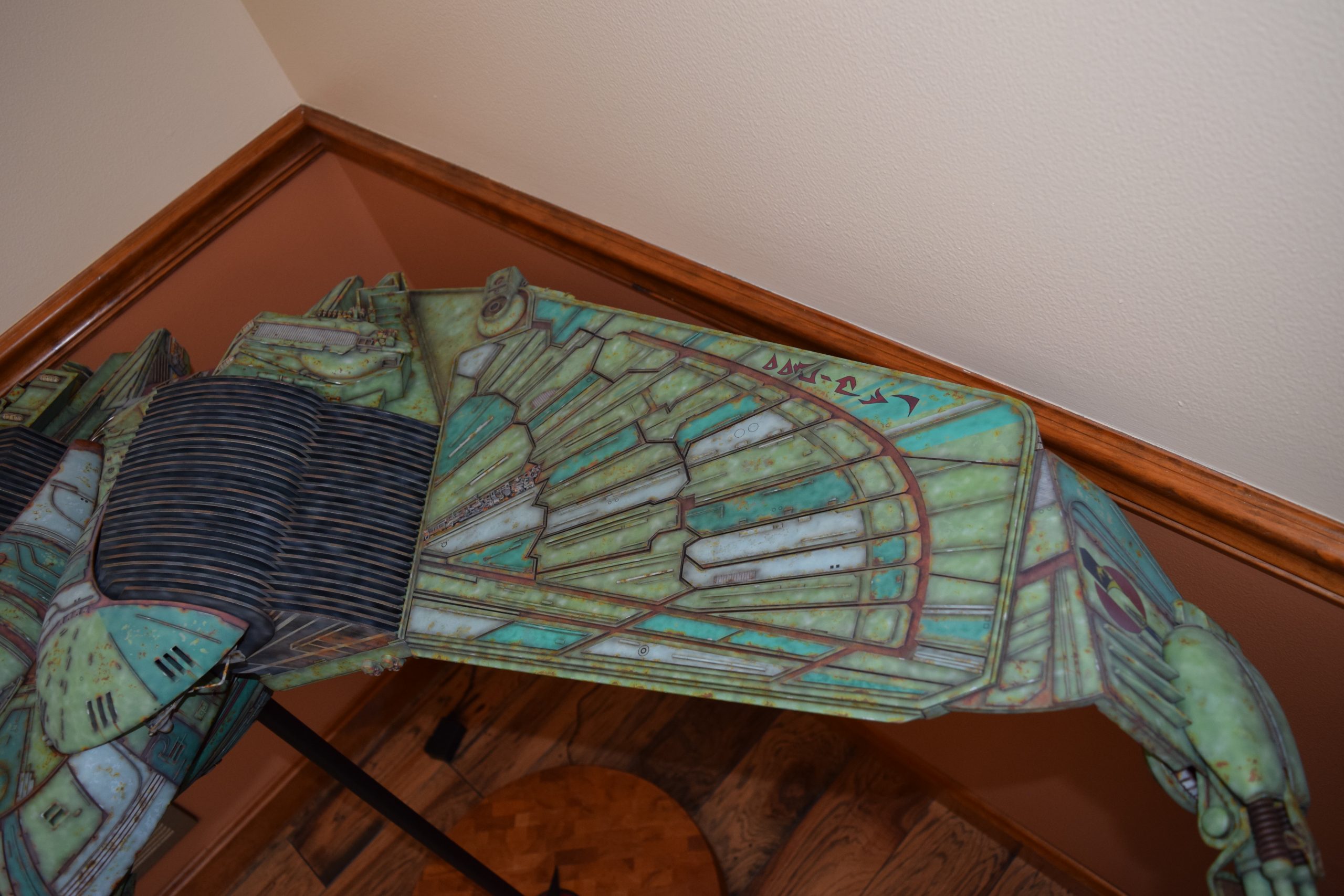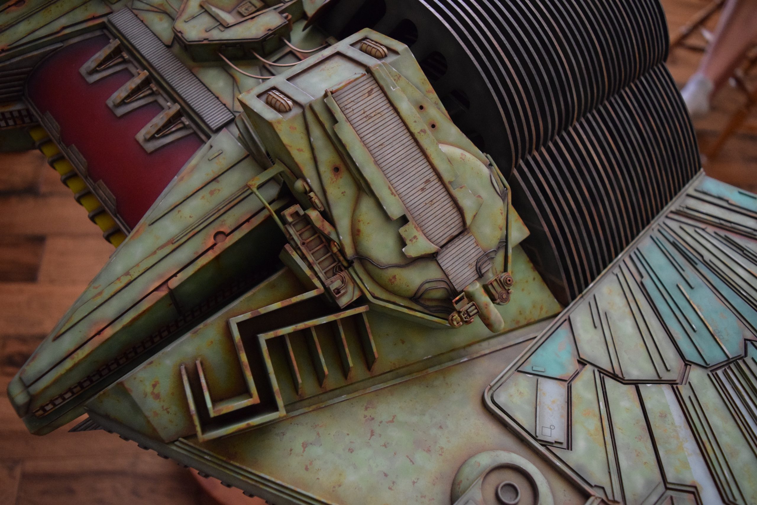 I built the armature (mainly just adding the wing hinge pieces to the wing armature plates – and to the main body armature), then added the detail pieces around the perimeter of the main body armature. From references, I was able to learn the wing angle positions for cruise (slightly angled upward) and attack (angled downward). Using a template with these angles, I positioned the wings at these positions and added identifying strips on the hinges, such that they would align at the corresponding angles – for use when displaying the wings at these different positions.