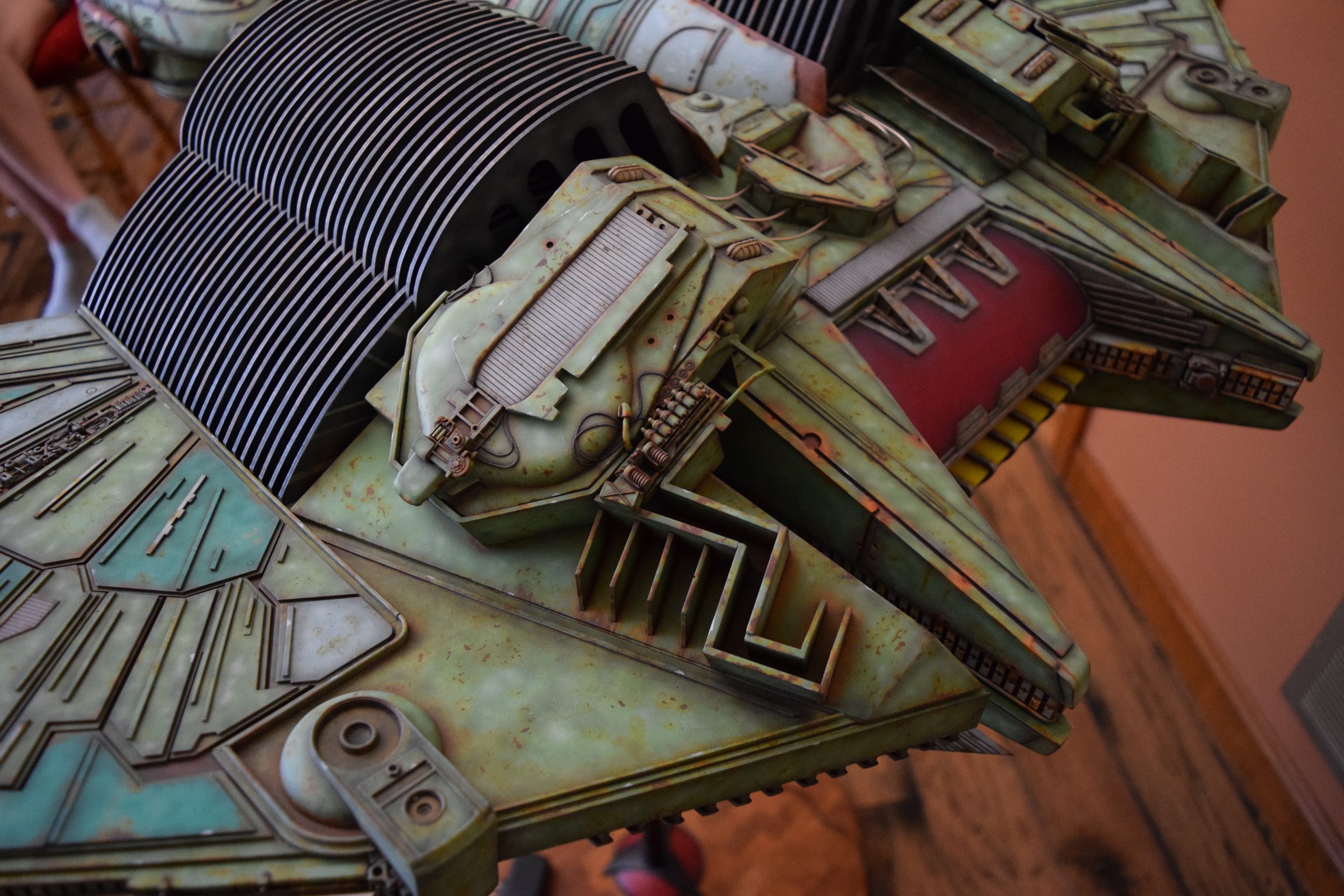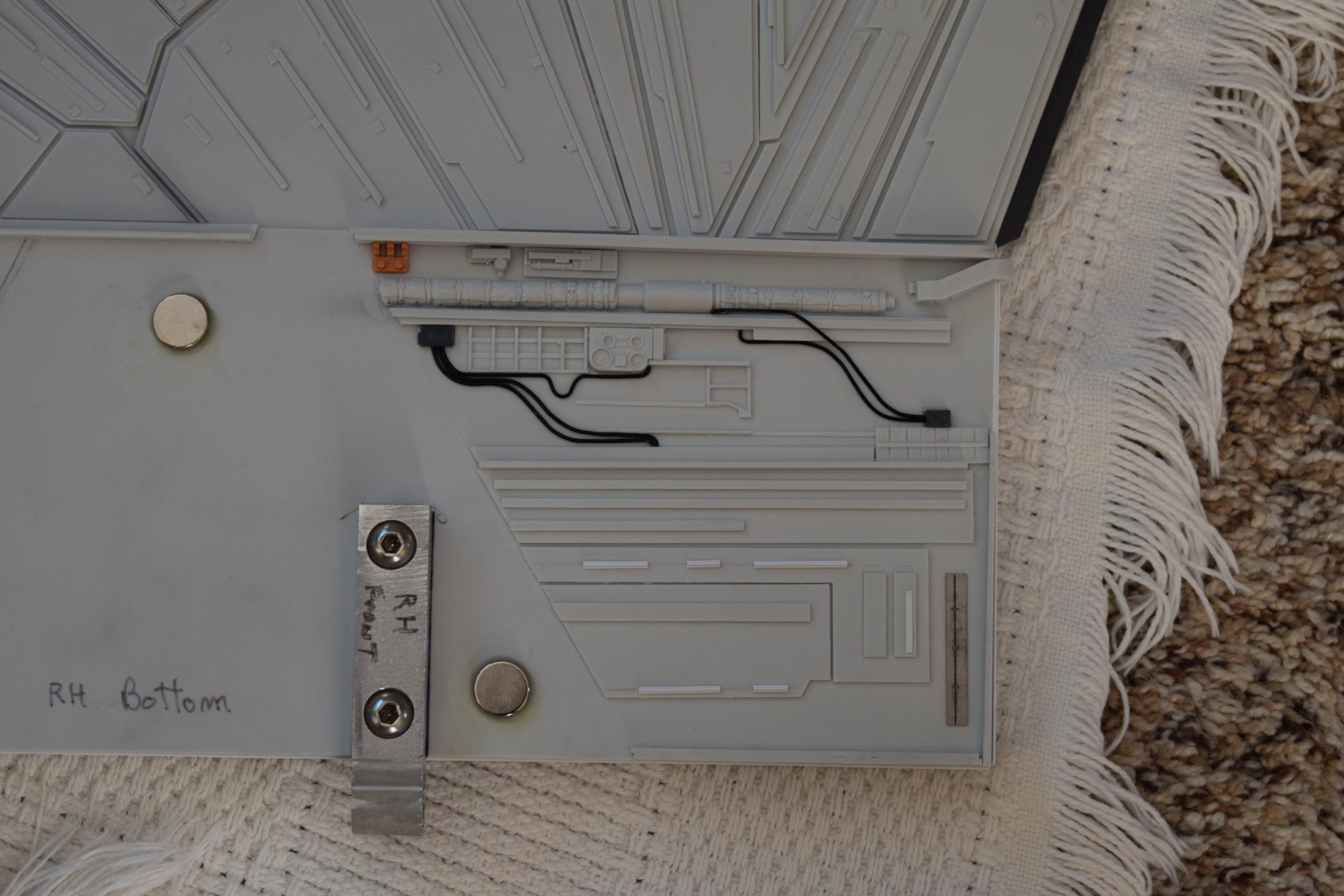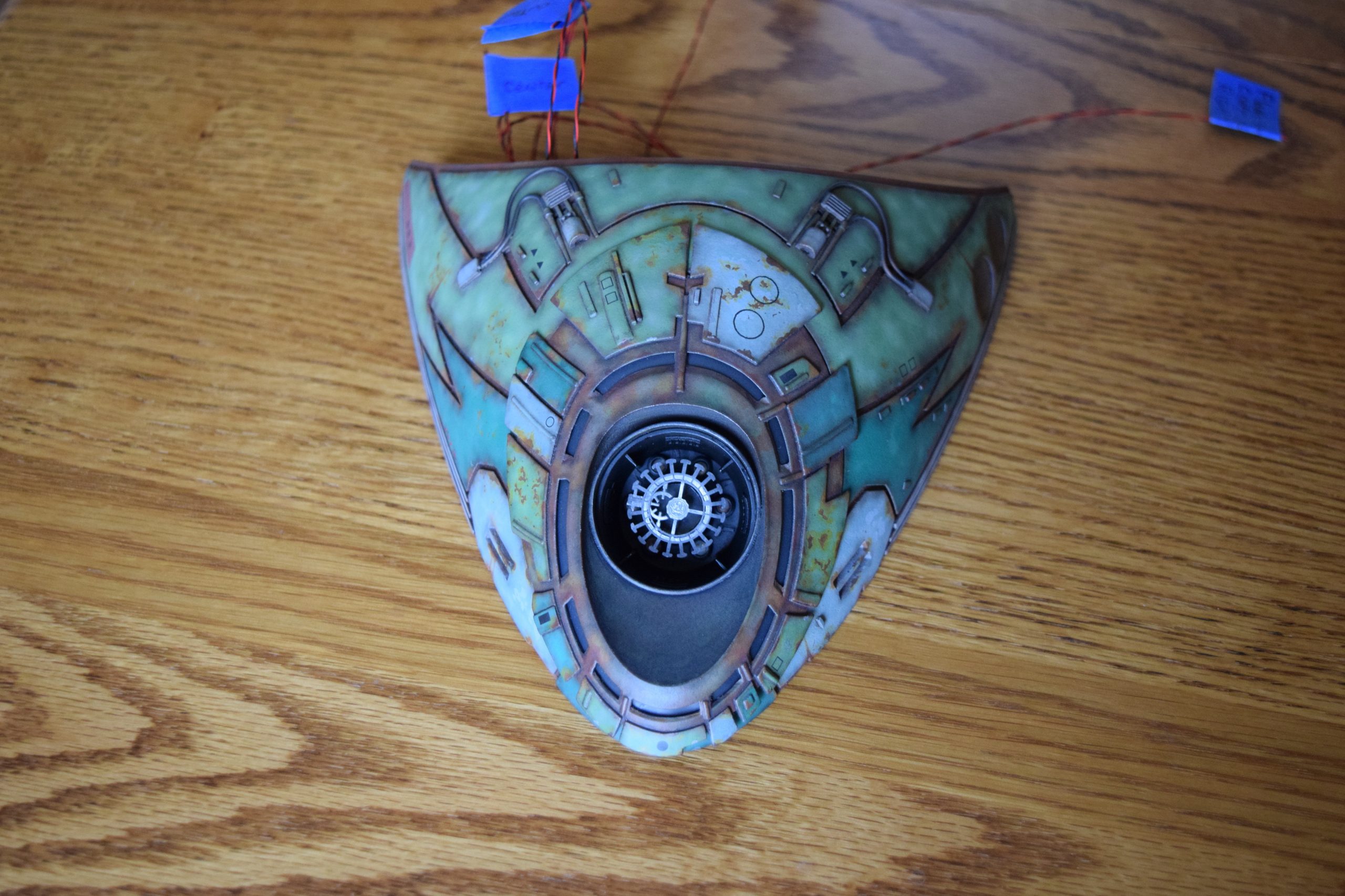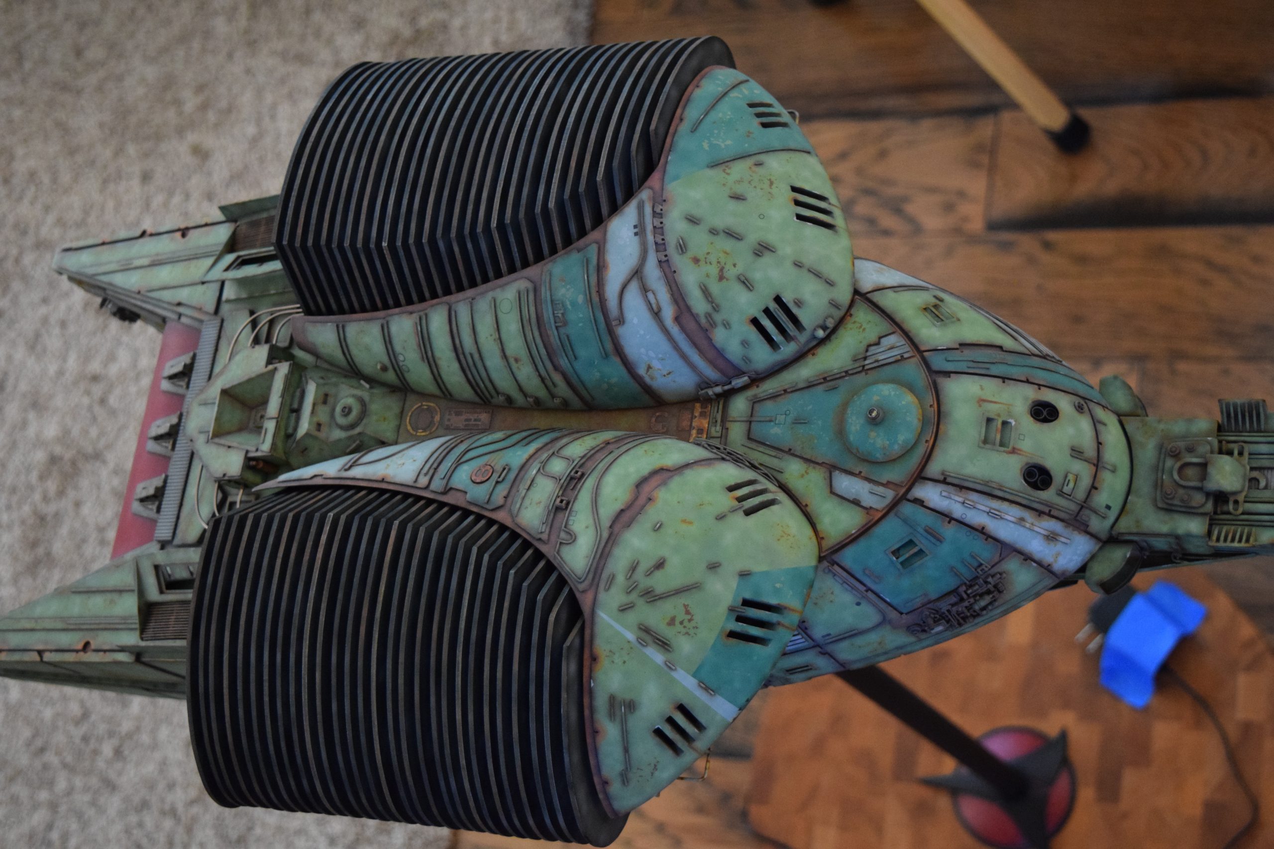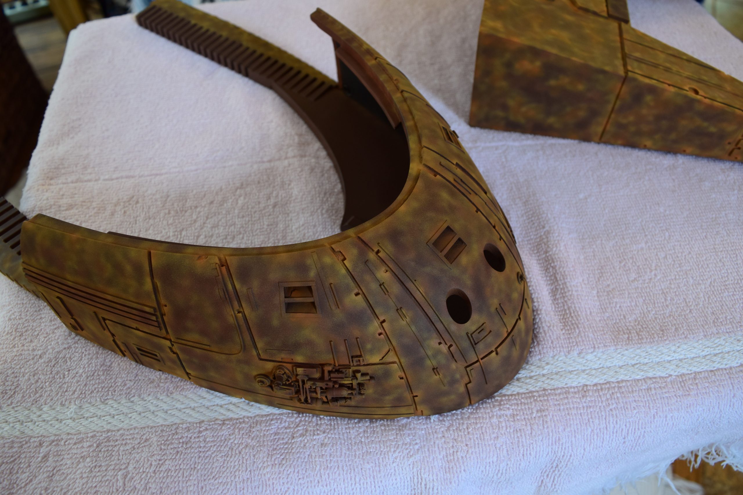 I built the armature (mainly just adding the wing hinge pieces to the wing armature plates – and to the main body armature), then added the detail pieces around the perimeter of the main body armature. From references, I was able to learn the wing angle positions for cruise (slightly angled upward) and attack (angled downward). Using a template with these angles, I positioned the wings at these positions and added identifying strips on the hinges, such that they would align at the corresponding angles – for use when displaying the wings at these different positions.