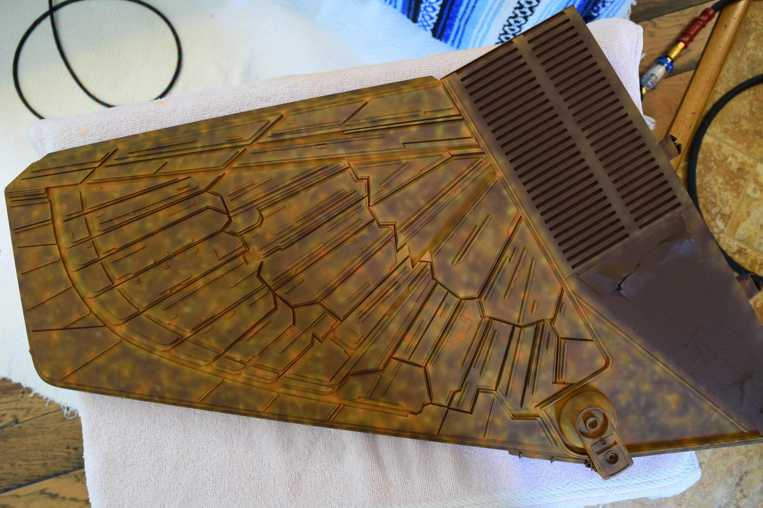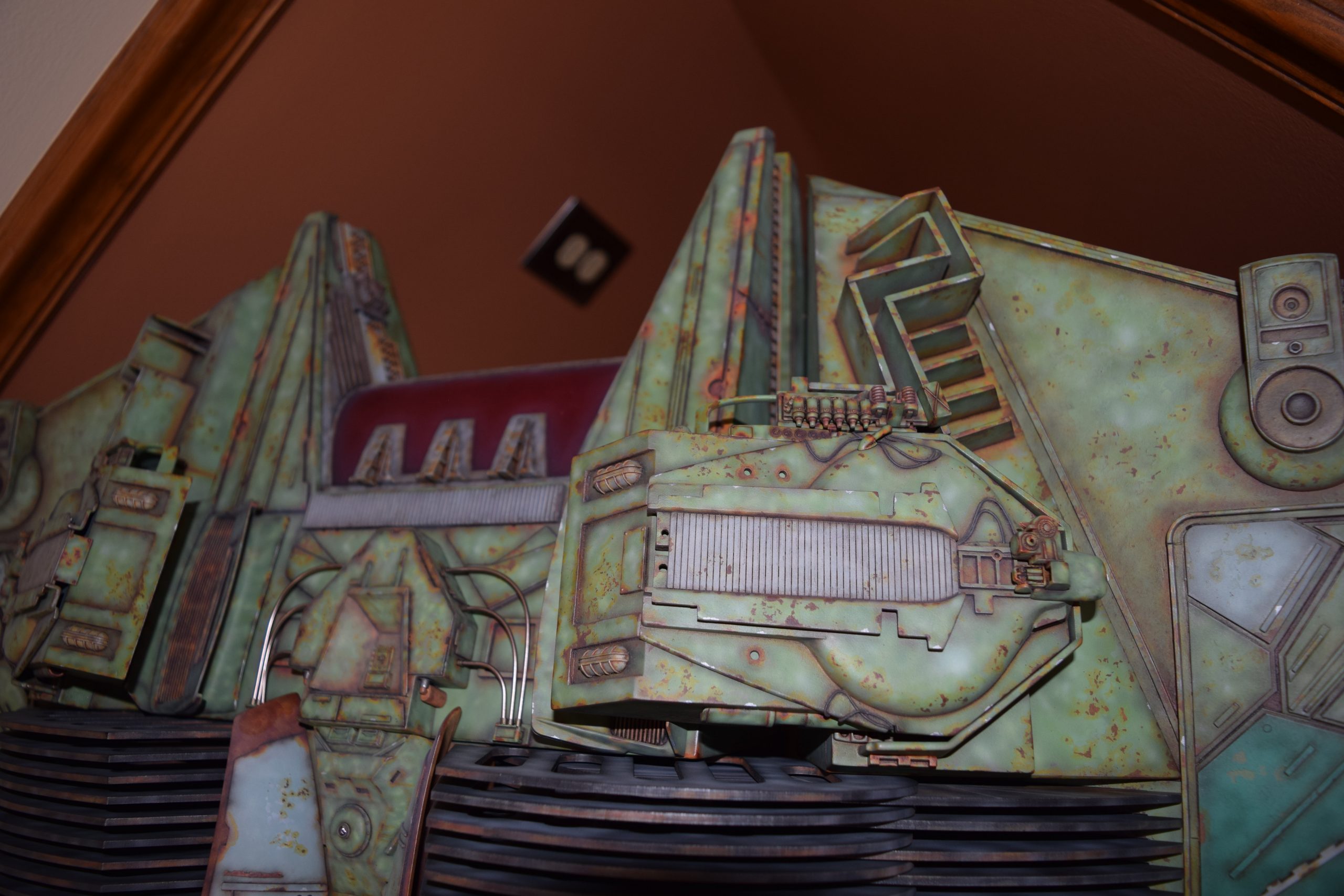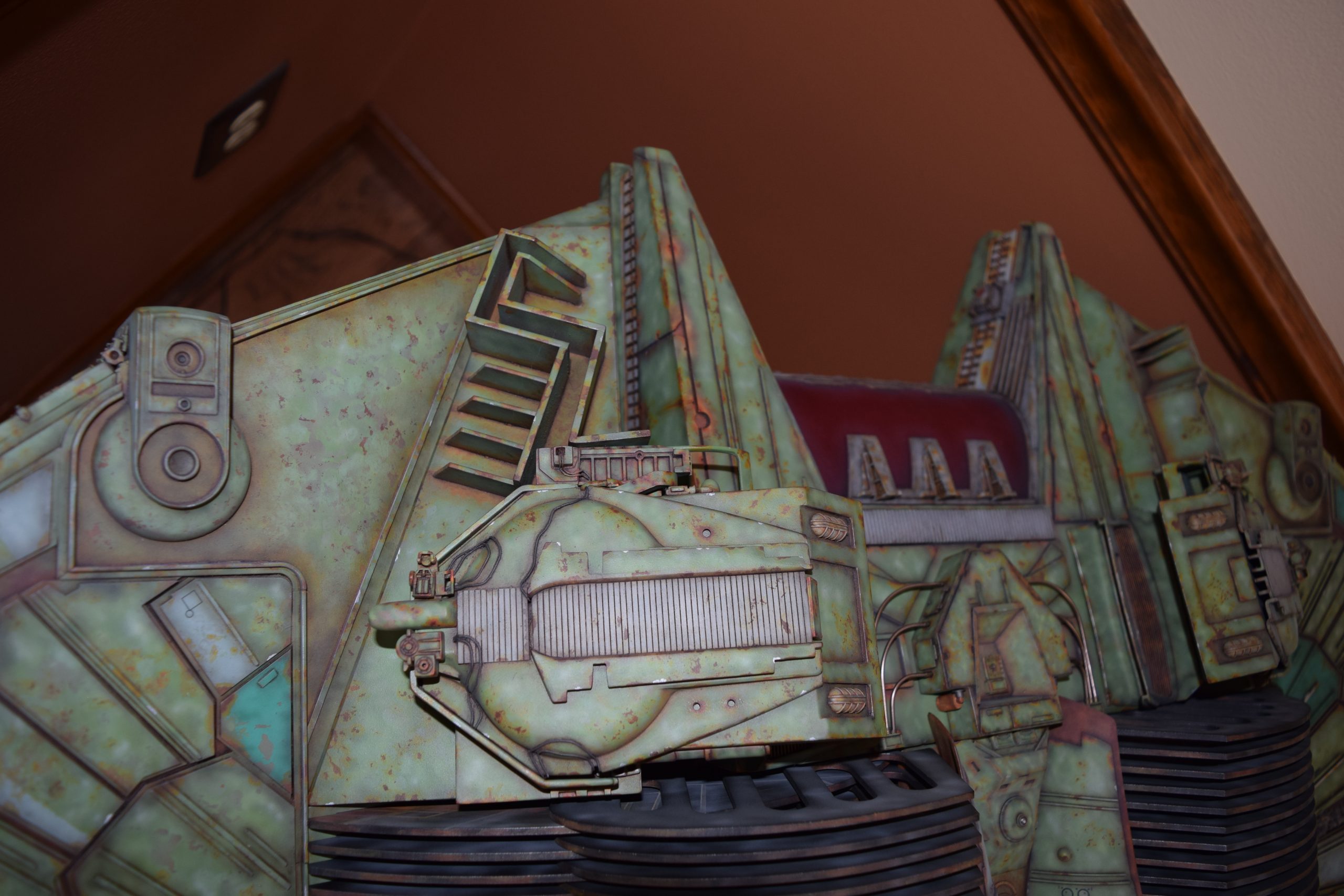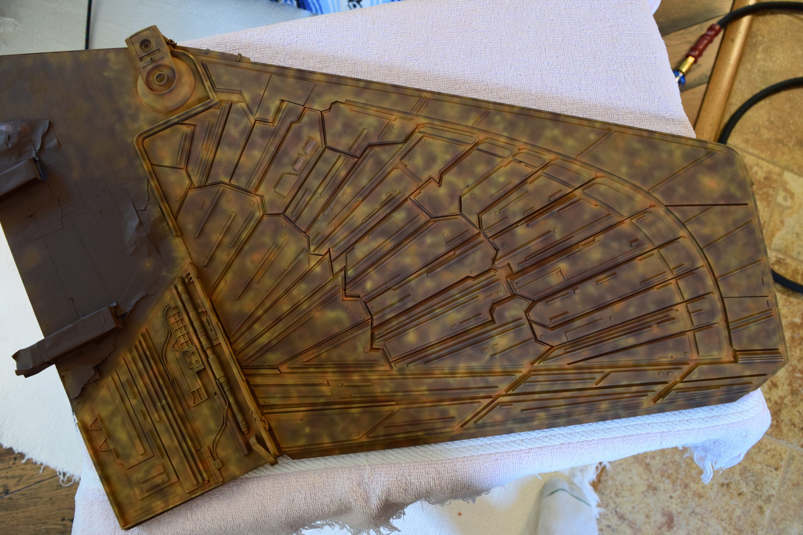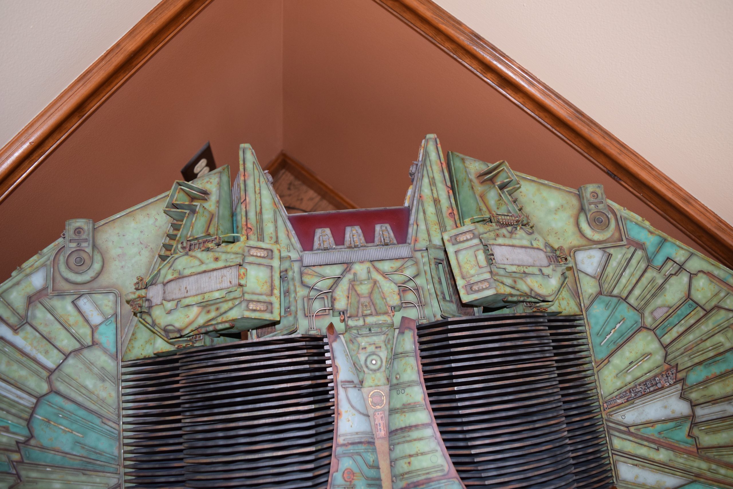 I built the armature (mainly just adding the wing hinge pieces to the wing armature plates – and to the main body armature), then added the detail pieces around the perimeter of the main body armature. From references, I was able to learn the wing angle positions for cruise (slightly angled upward) and attack (angled downward). Using a template with these angles, I positioned the wings at these positions and added identifying strips on the hinges, such that they would align at the corresponding angles – for use when displaying the wings at these different positions.