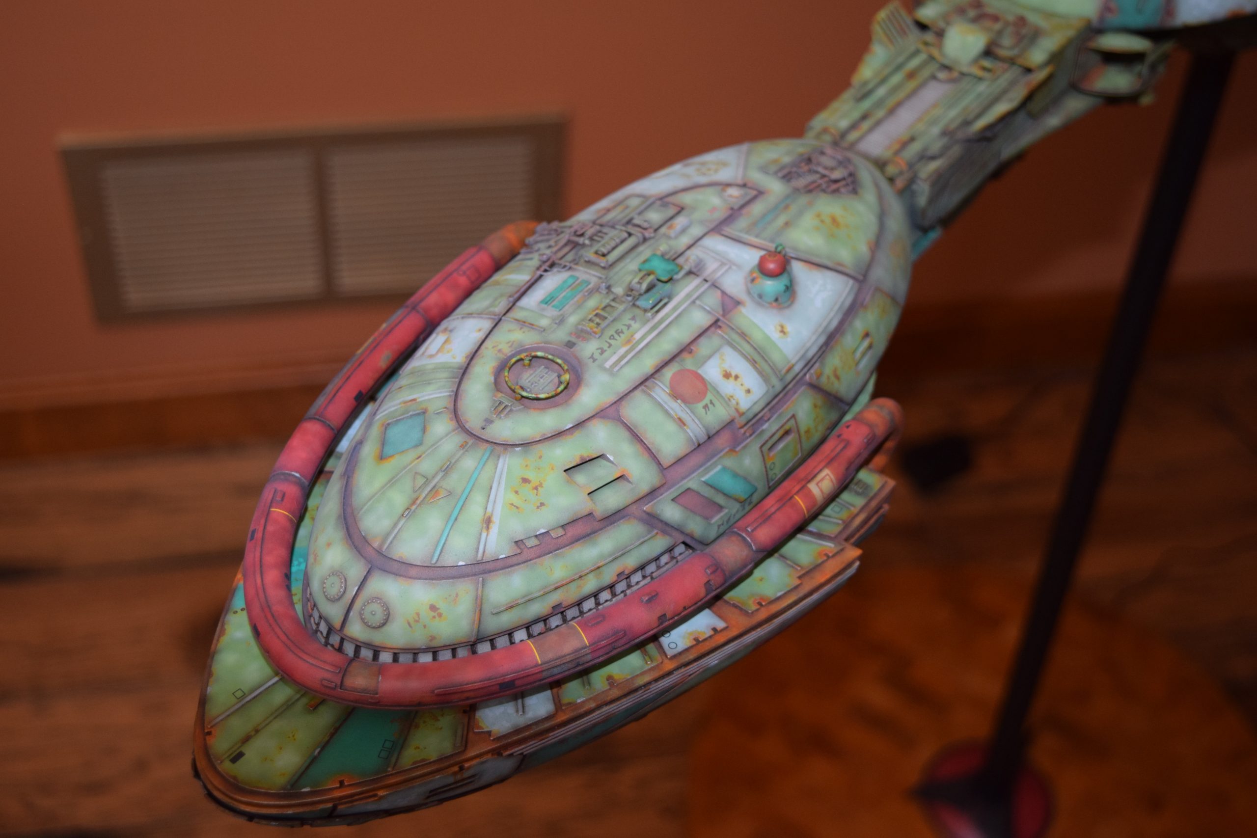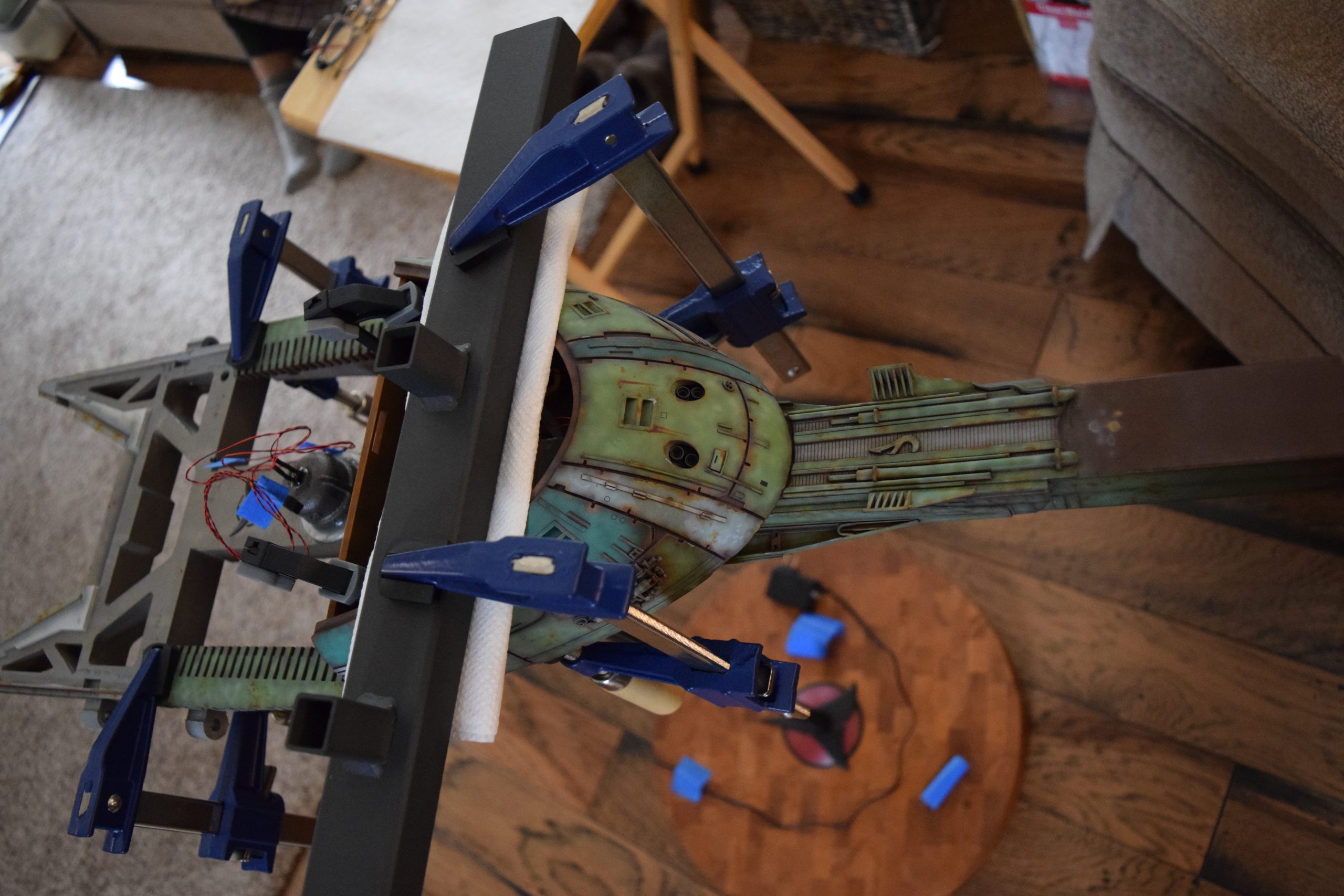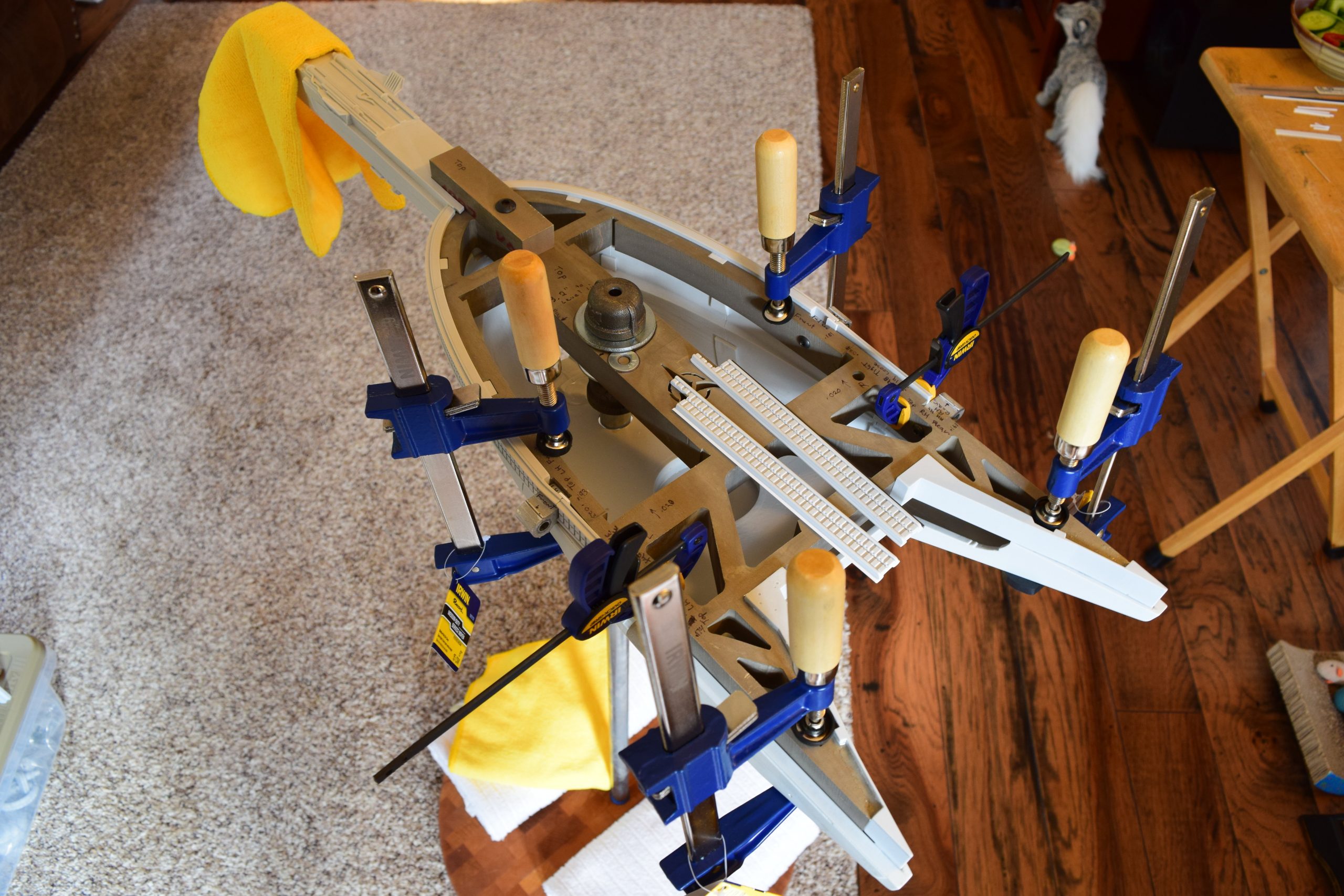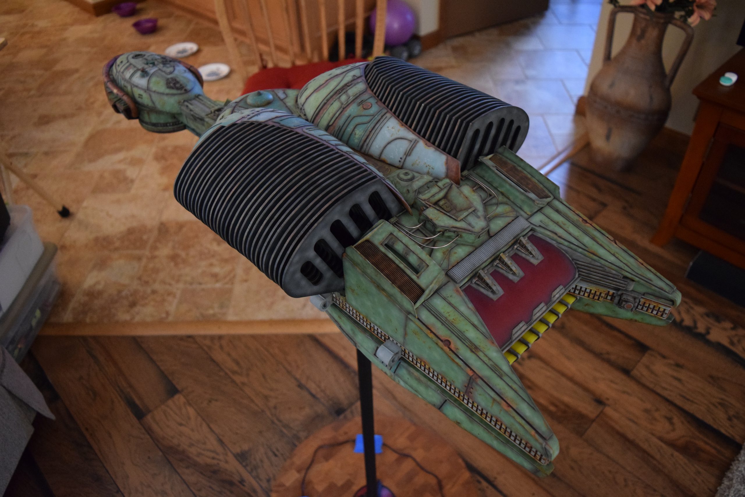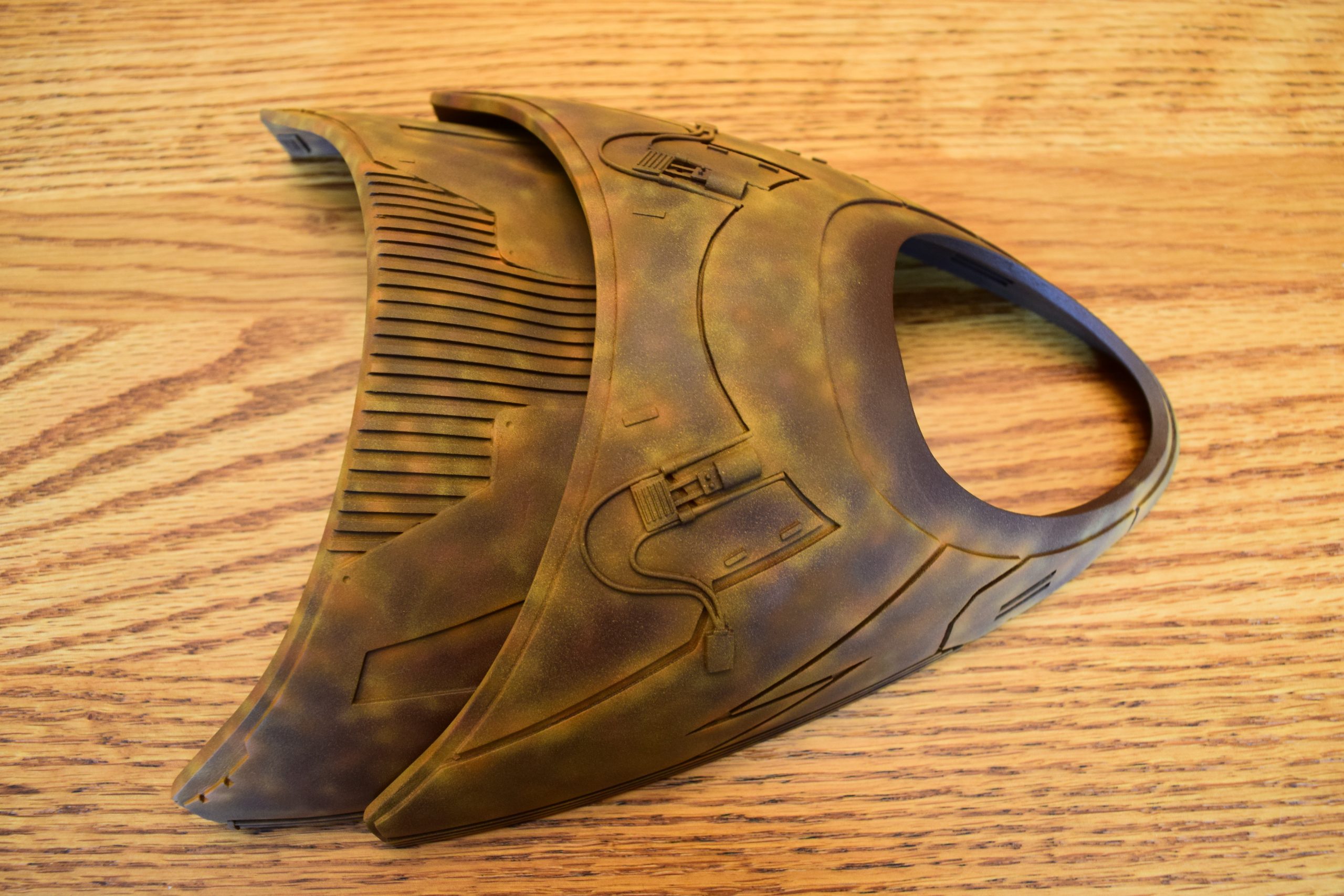 I built the armature (mainly just adding the wing hinge pieces to the wing armature plates – and to the main body armature), then added the detail pieces around the perimeter of the main body armature. From references, I was able to learn the wing angle positions for cruise (slightly angled upward) and attack (angled downward). Using a template with these angles, I positioned the wings at these positions and added identifying strips on the hinges, such that they would align at the corresponding angles – for use when displaying the wings at these different positions.