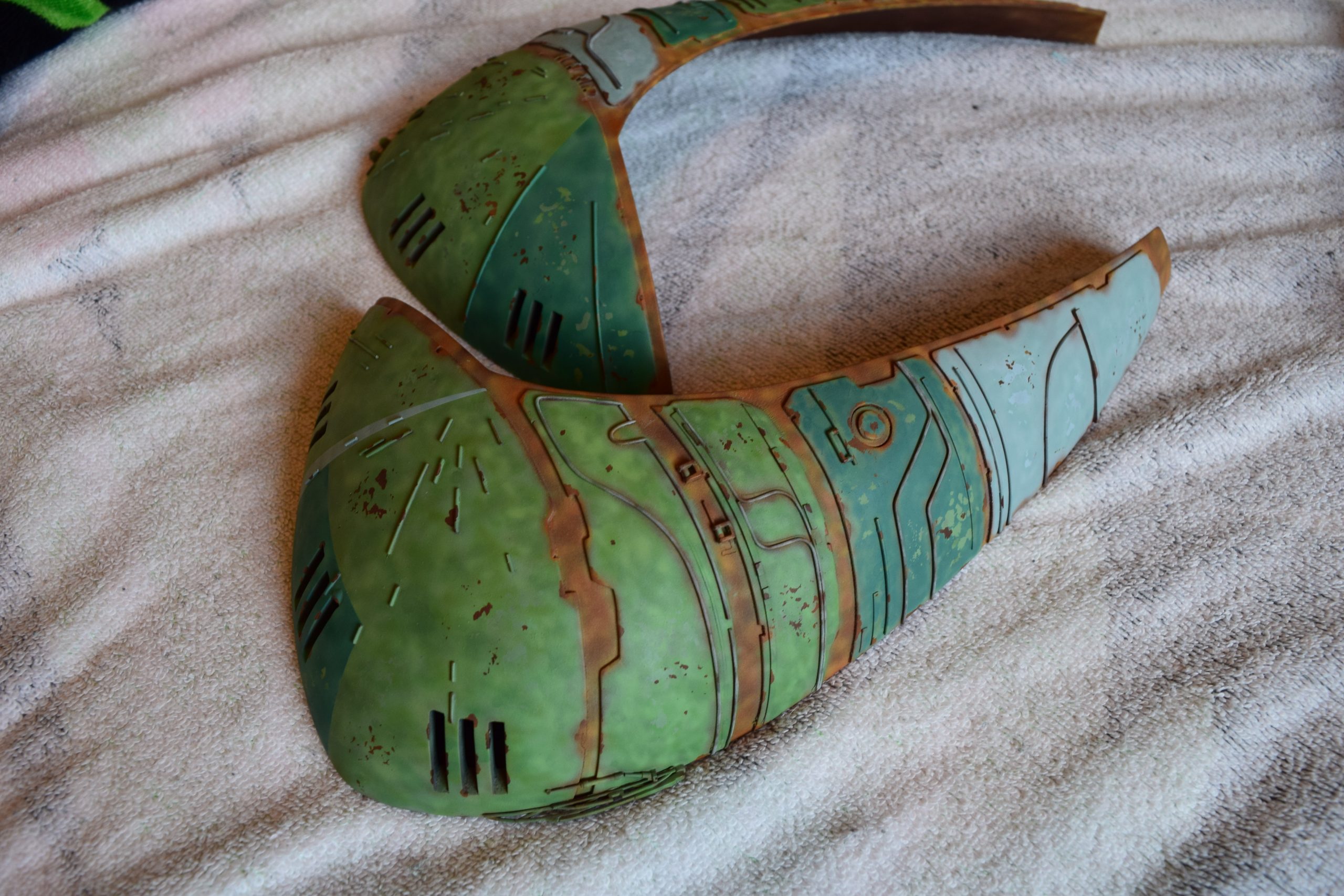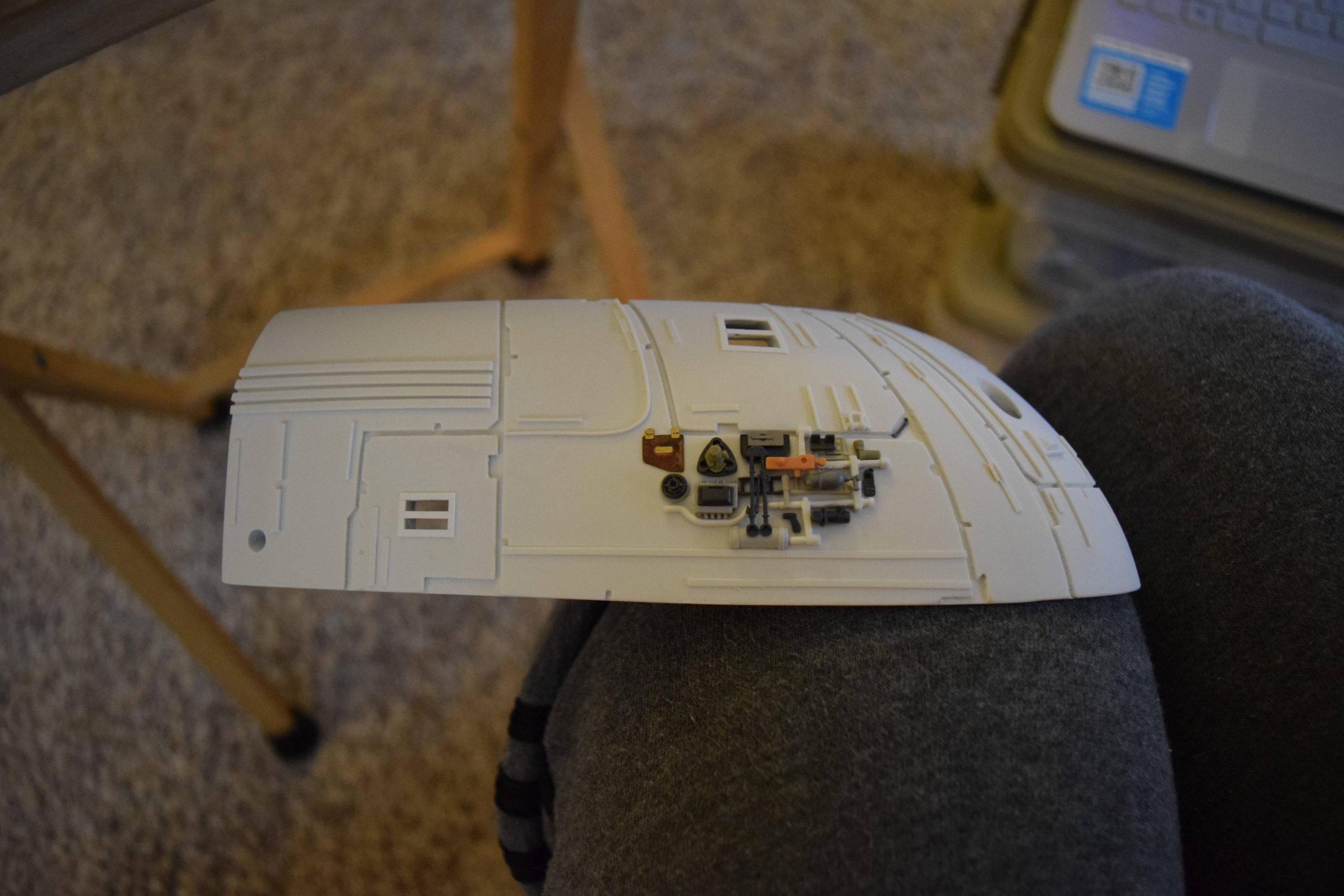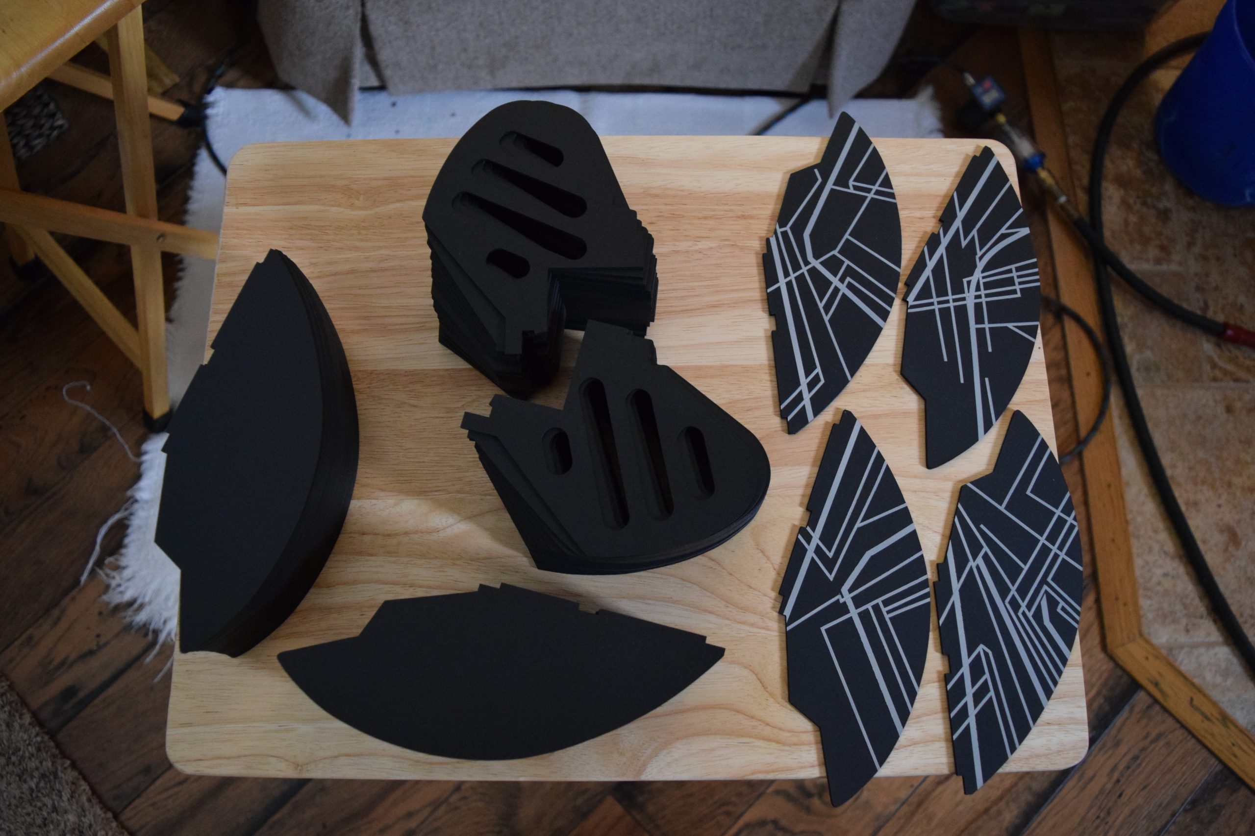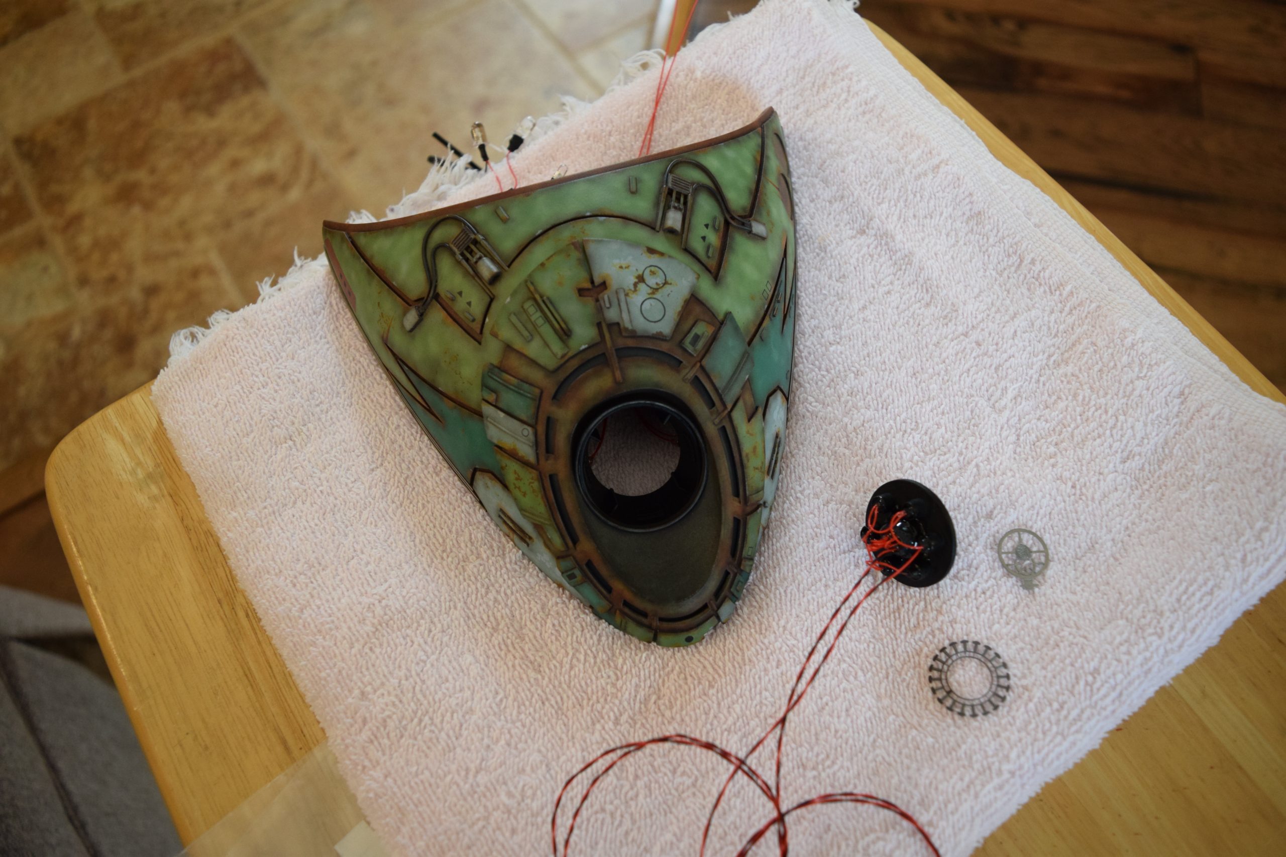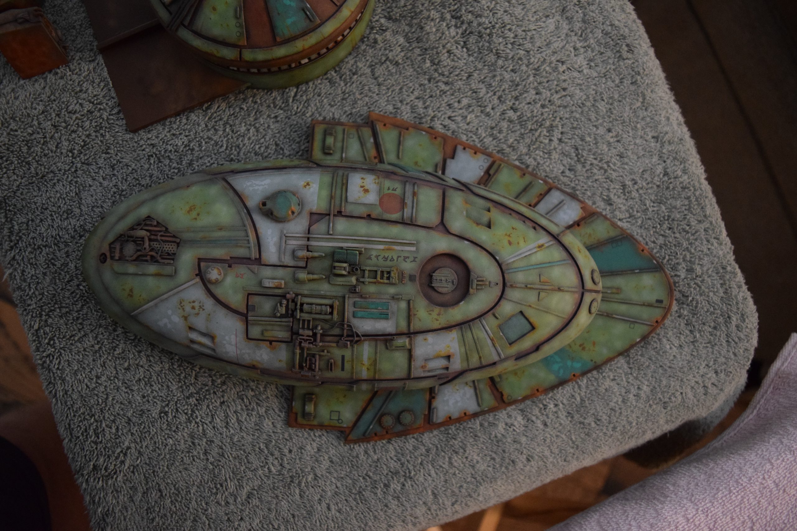 I built the armature (mainly just adding the wing hinge pieces to the wing armature plates – and to the main body armature), then added the detail pieces around the perimeter of the main body armature. From references, I was able to learn the wing angle positions for cruise (slightly angled upward) and attack (angled downward). Using a template with these angles, I positioned the wings at these positions and added identifying strips on the hinges, such that they would align at the corresponding angles – for use when displaying the wings at these different positions.