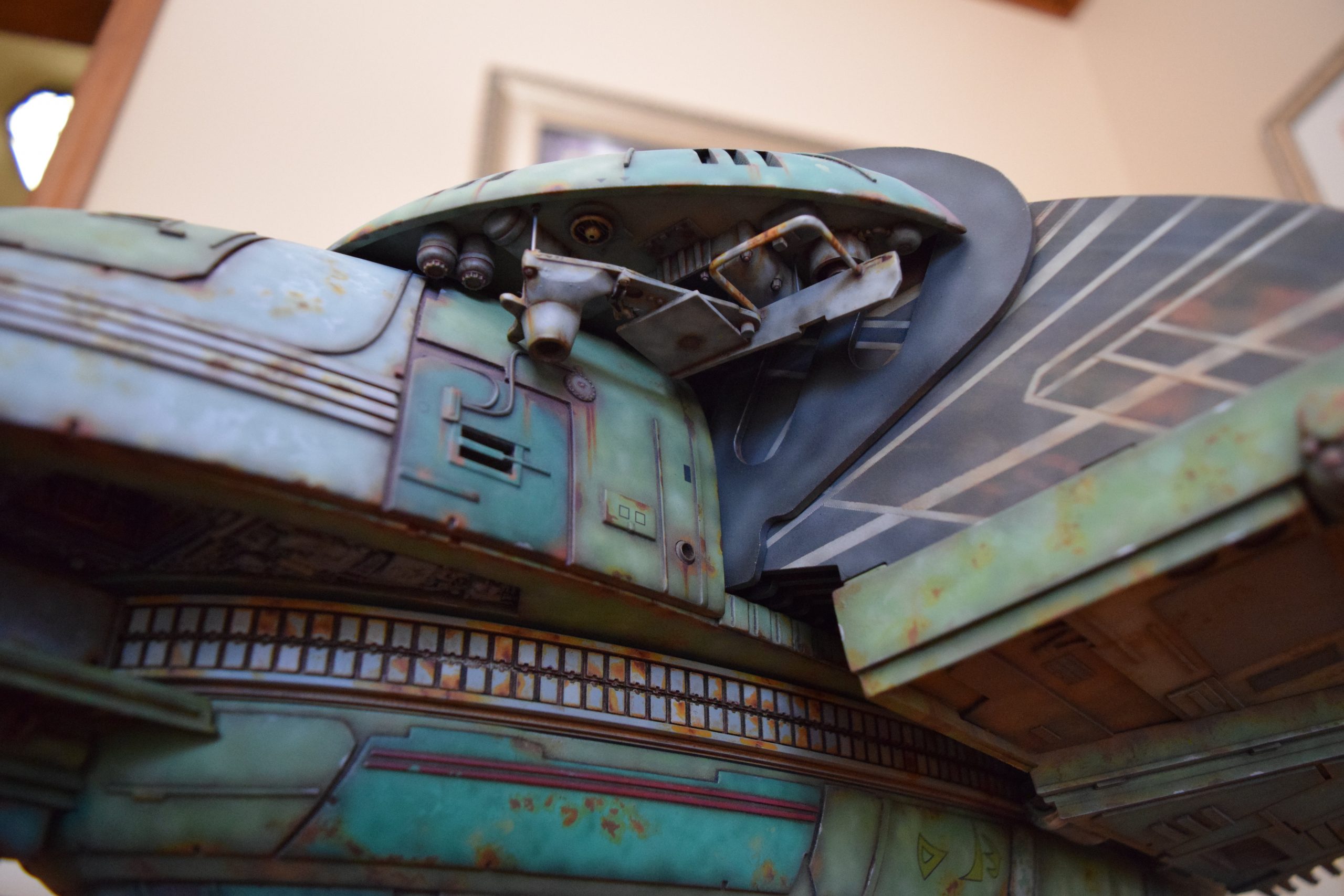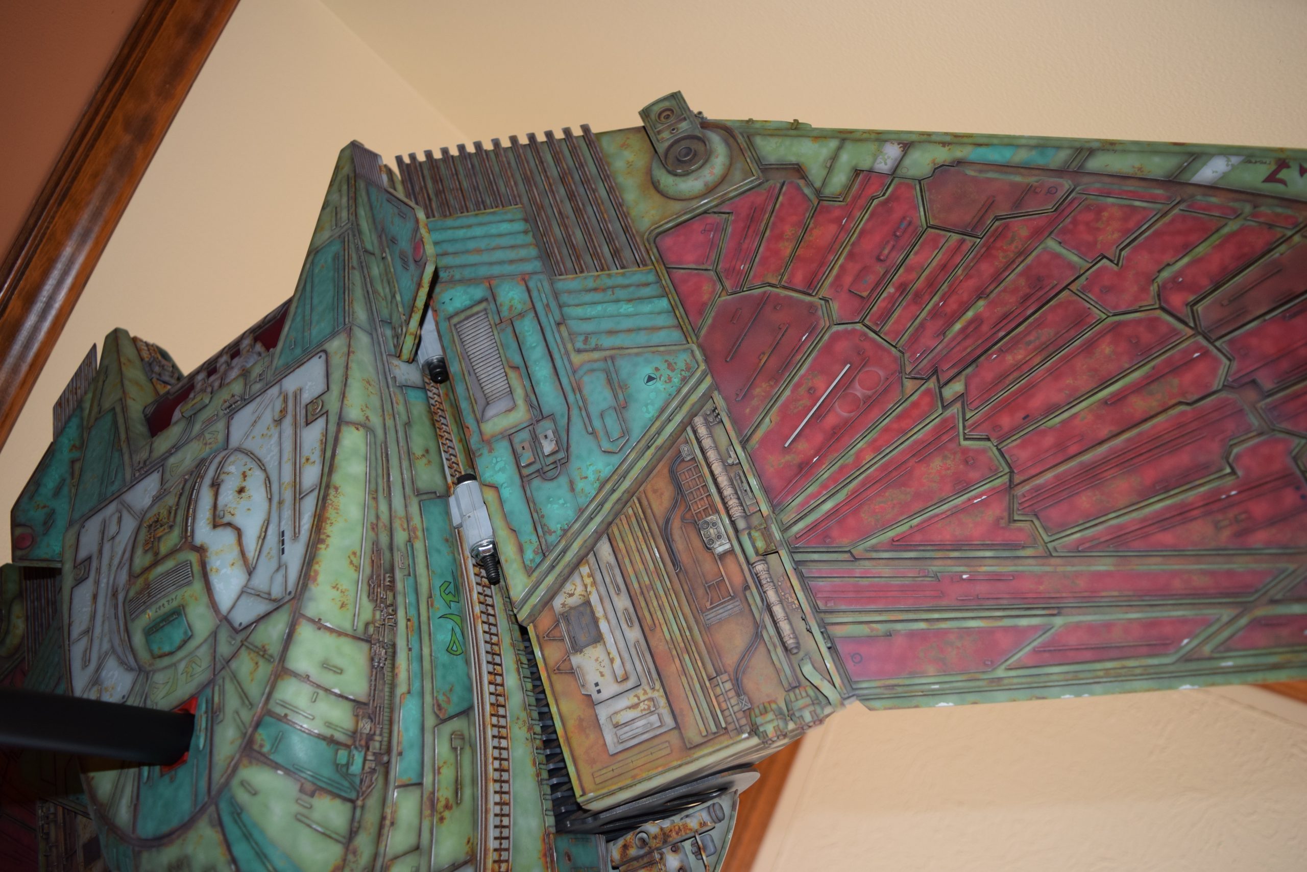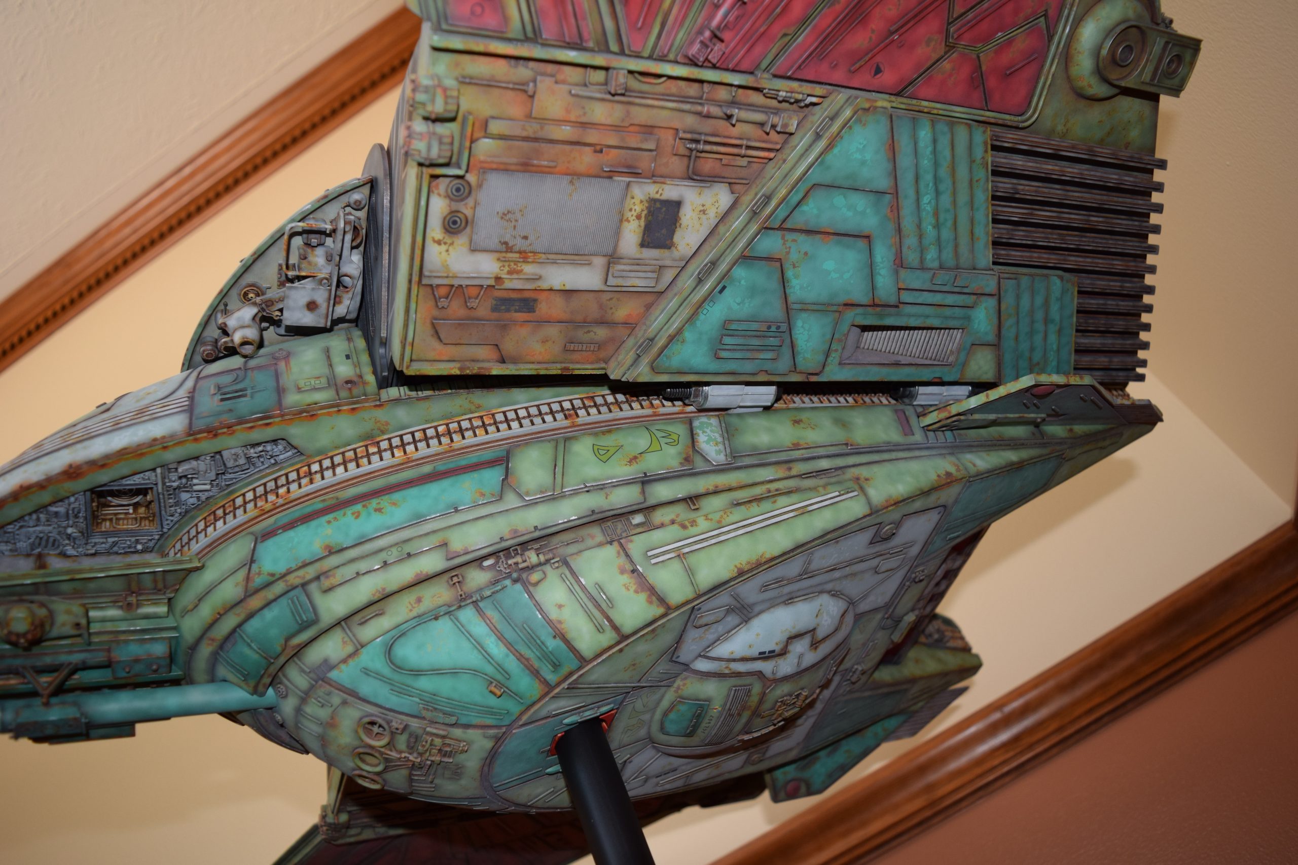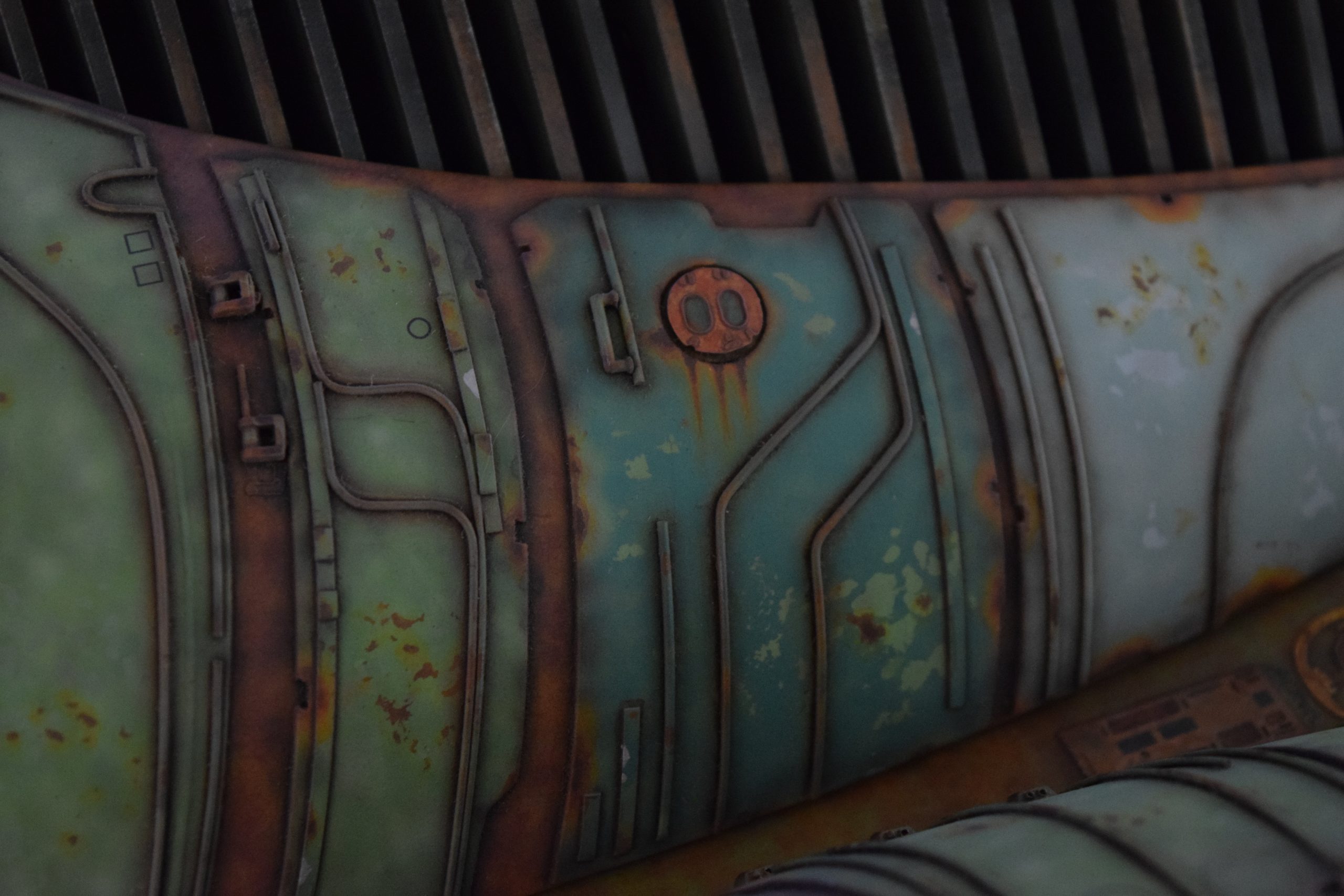 Then came painting of the primary BOP colors. For the colors, I studied many references and available pictures. I ended up using several Polly Scale, Model Masters, and Tamiya paint colors that I felt were a close match. I did some custom mixing of colors to create faded, shading, weathered finishes on the panels of the hull, head, wings, etc. I used a layered technique, as I like to think of a single color as having many shades / variations due to being worn / exposed to the elements, etc. For any given color (Pale Green – for example – involved layering as many as 3 to 5 variations for “texture”). For other visual interest / texture, I used the latex to create panels that have underlying colors of different hues. As an example: light gray – then latex – then darker grey – peel up latex to review light grey paint exposed from dark grey paint peeling off. bare metal chips were also included. For the larger areas of rust (wide “trenches” between areas of panels – or heavily rusted areas – I airbrushed the primary colors up to those areas – stopping short to keep the rusted areas prominent.