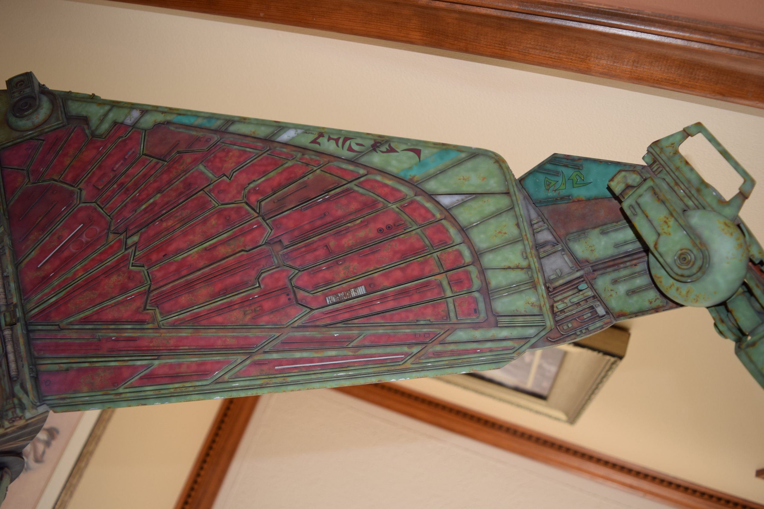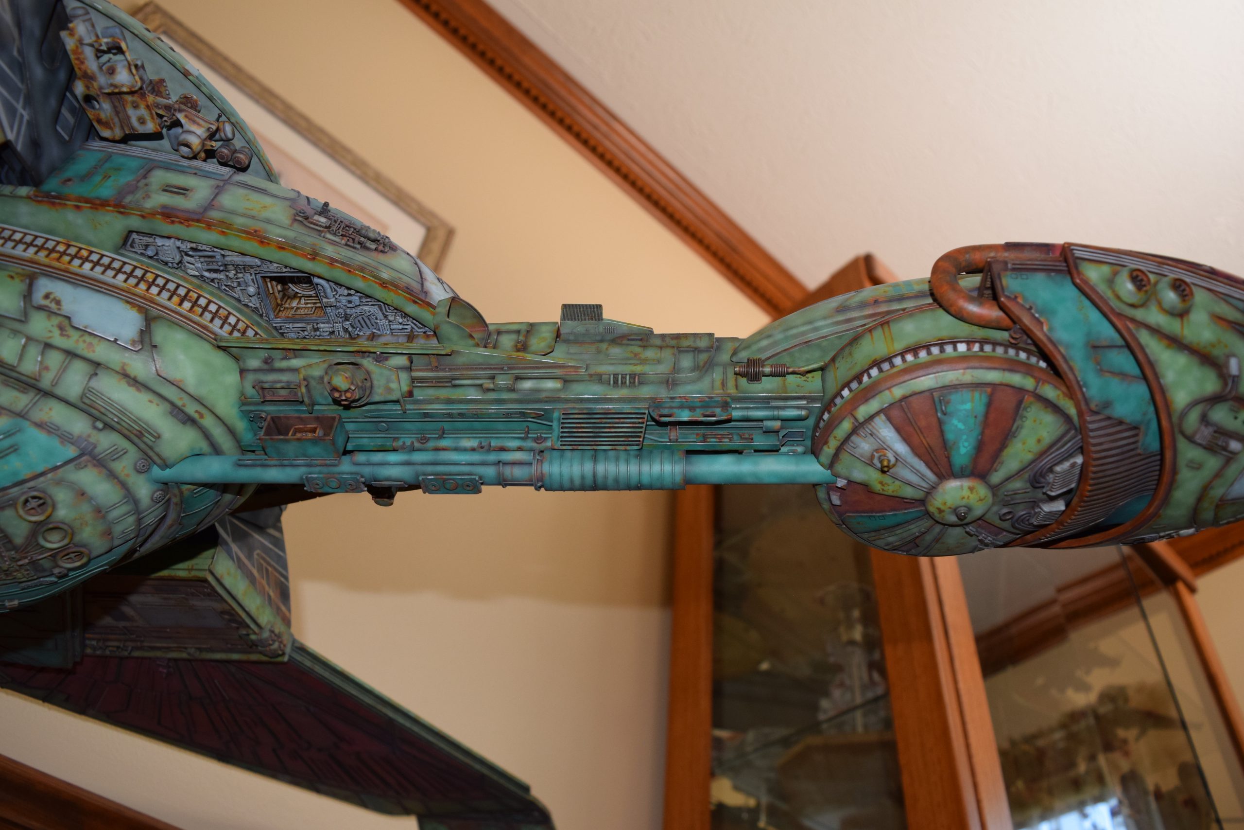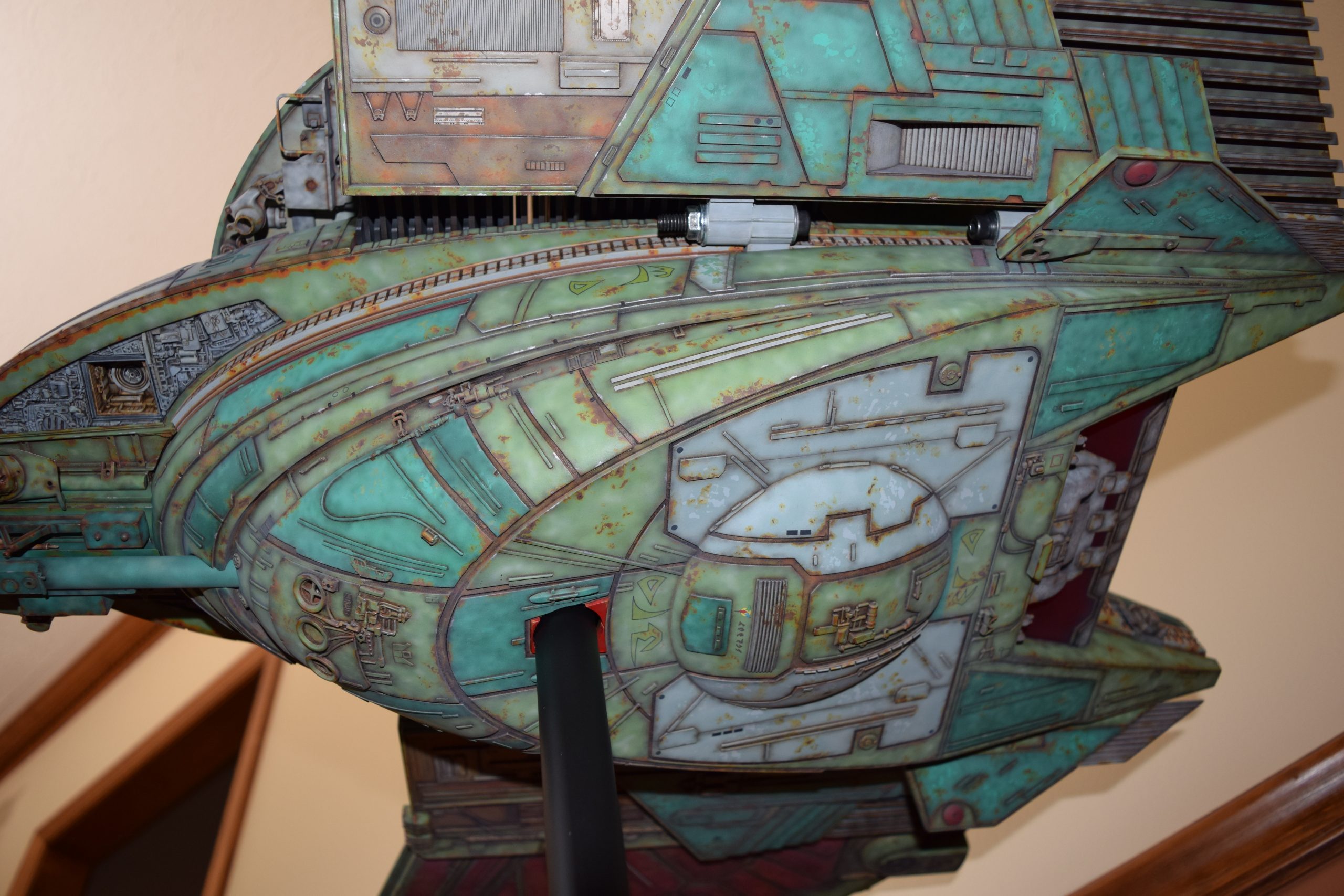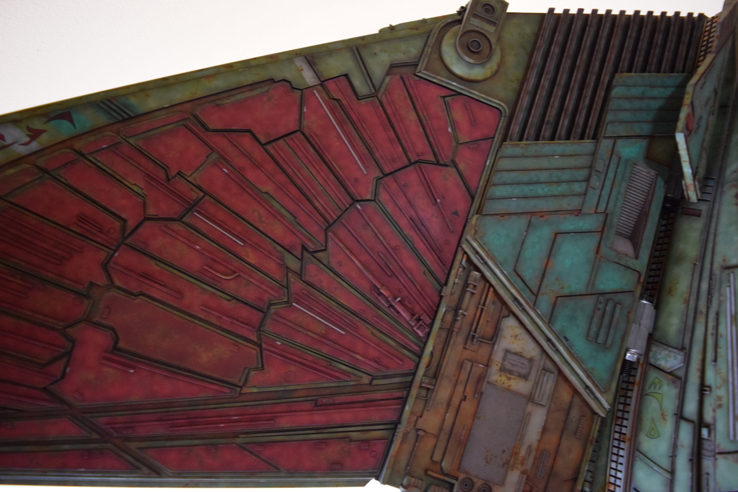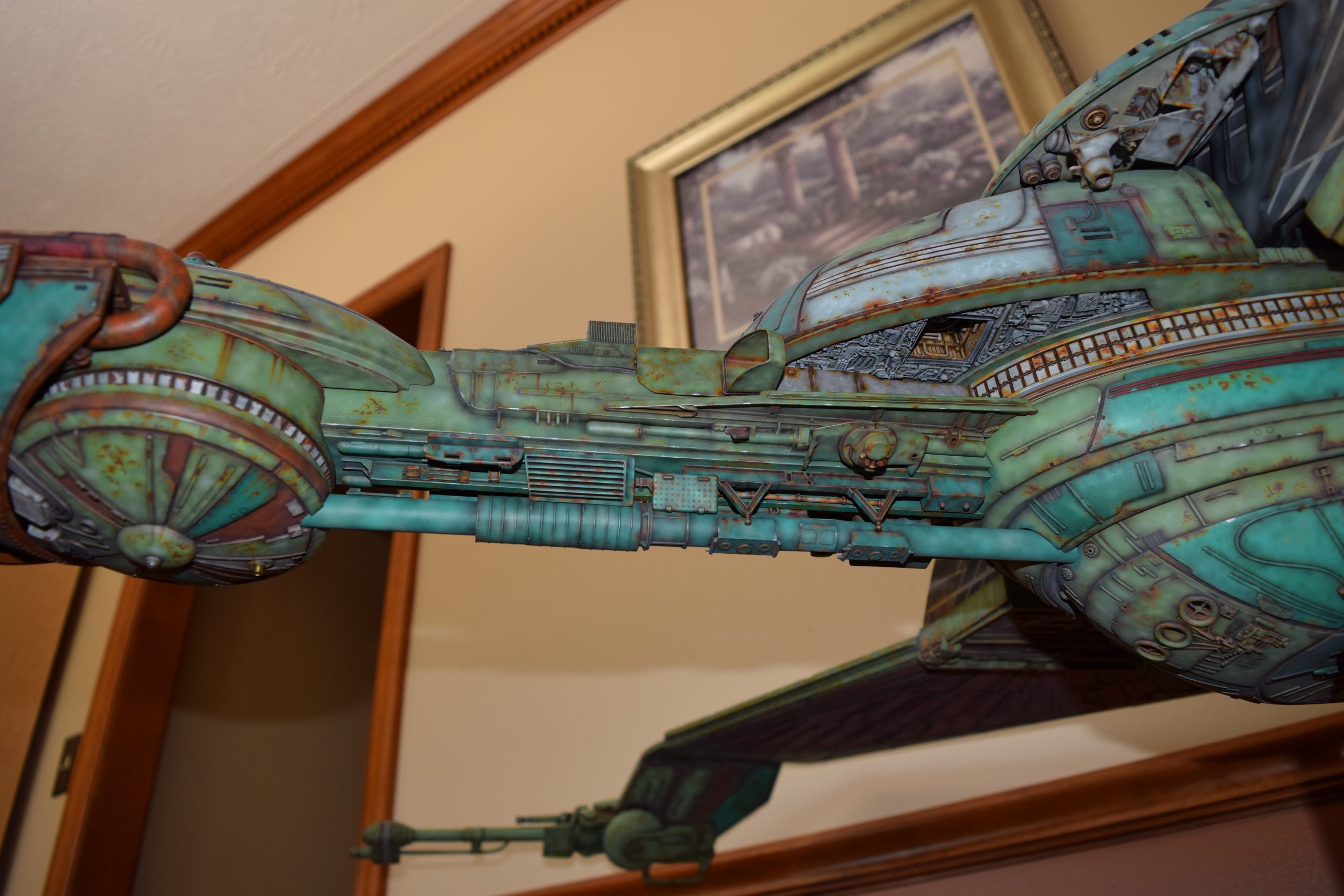 Then came painting of the primary BOP colors. For the colors, I studied many references and available pictures. I ended up using several Polly Scale, Model Masters, and Tamiya paint colors that I felt were a close match. I did some custom mixing of colors to create faded, shading, weathered finishes on the panels of the hull, head, wings, etc. I used a layered technique, as I like to think of a single color as having many shades / variations due to being worn / exposed to the elements, etc. For any given color (Pale Green – for example – involved layering as many as 3 to 5 variations for “texture”). For other visual interest / texture, I used the latex to create panels that have underlying colors of different hues. As an example: light gray – then latex – then darker grey – peel up latex to review light grey paint exposed from dark grey paint peeling off. bare metal chips were also included. For the larger areas of rust (wide “trenches” between areas of panels – or heavily rusted areas – I airbrushed the primary colors up to those areas – stopping short to keep the rusted areas prominent.