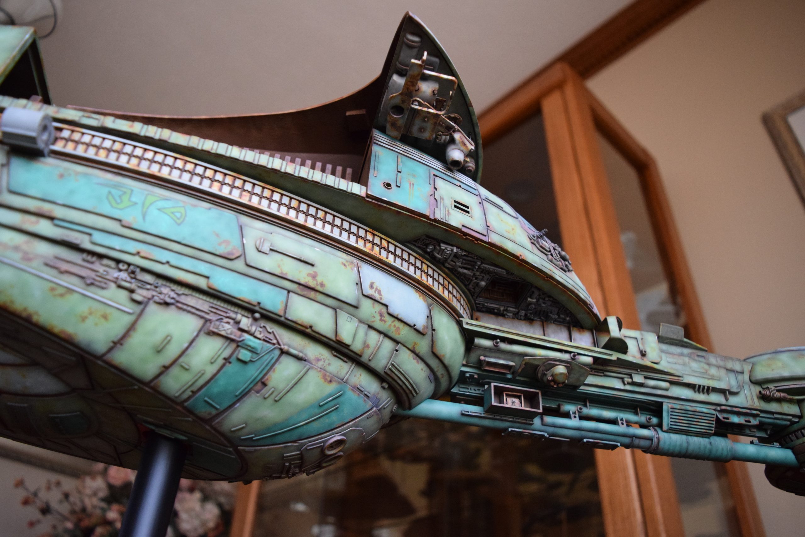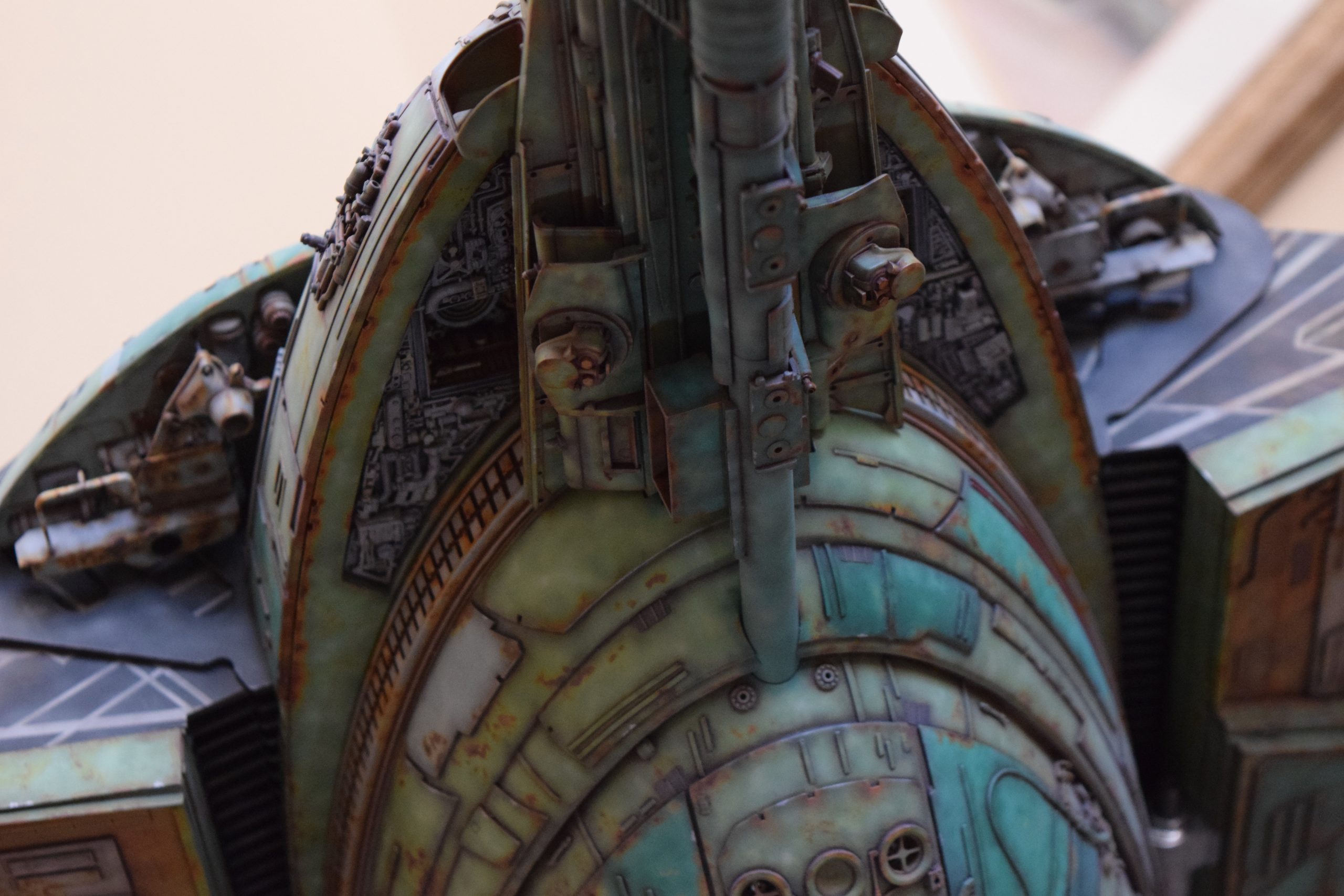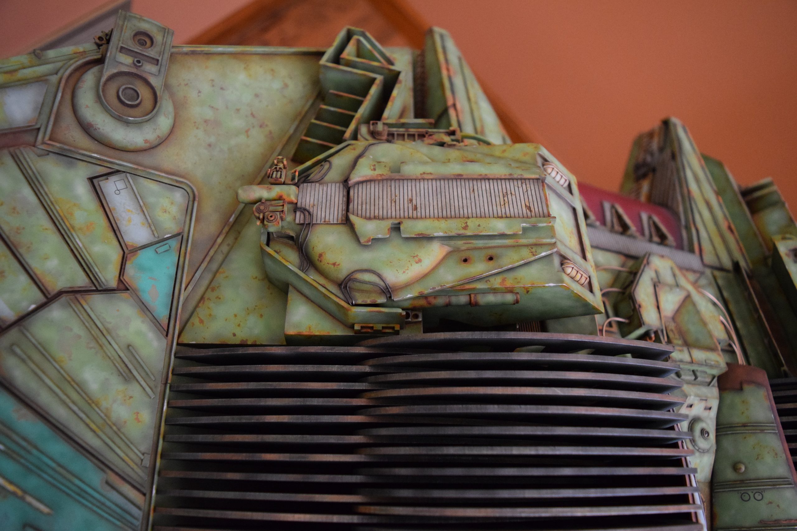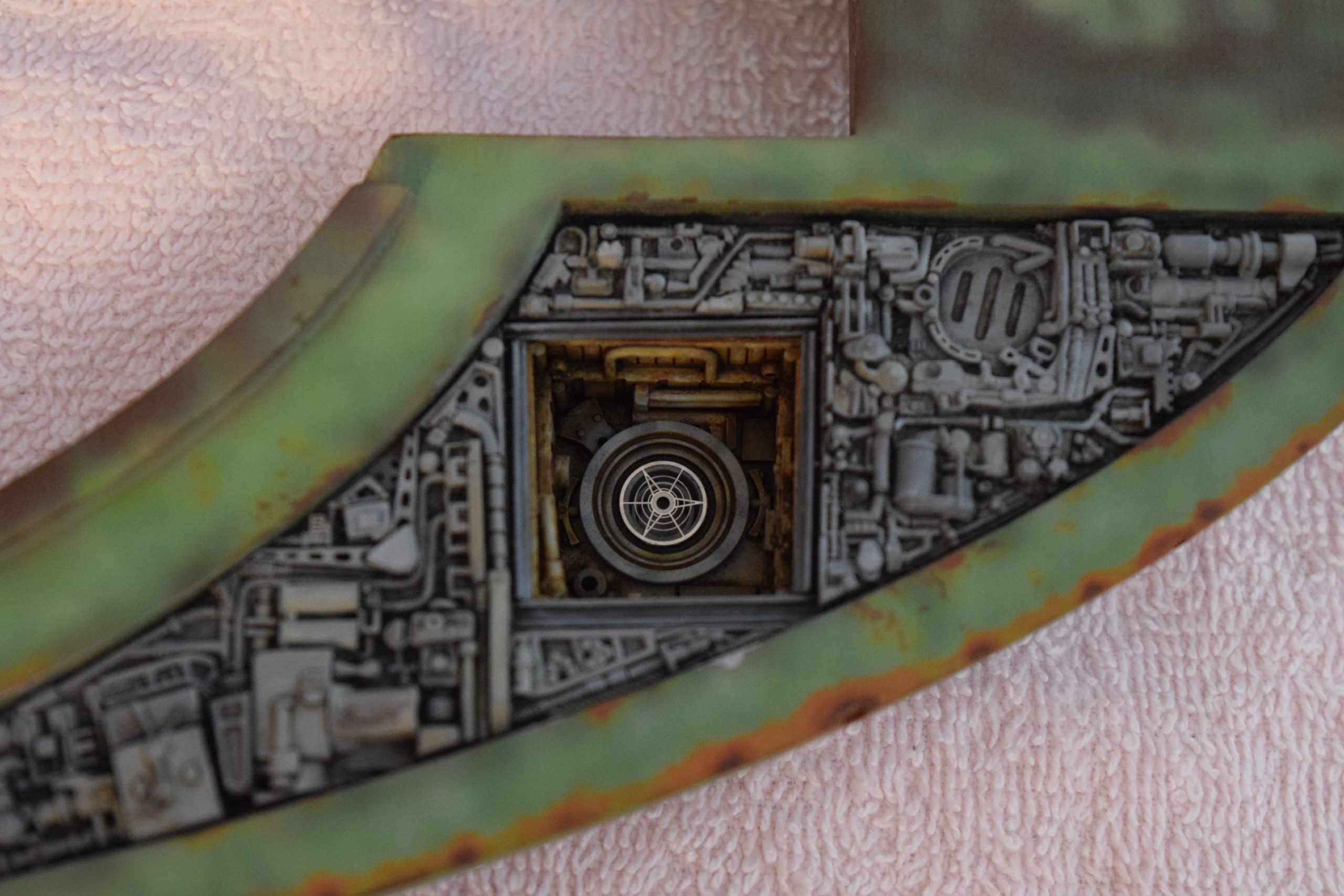 Then came painting of the primary BOP colors. For the colors, I studied many references and available pictures. I ended up using several Polly Scale, Model Masters, and Tamiya paint colors that I felt were a close match. I did some custom mixing of colors to create faded, shading, weathered finishes on the panels of the hull, head, wings, etc. I used a layered technique, as I like to think of a single color as having many shades / variations due to being worn / exposed to the elements, etc. For any given color (Pale Green – for example – involved layering as many as 3 to 5 variations for “texture”). For other visual interest / texture, I used the latex to create panels that have underlying colors of different hues. As an example: light gray – then latex – then darker grey – peel up latex to review light grey paint exposed from dark grey paint peeling off. bare metal chips were also included. For the larger areas of rust (wide “trenches” between areas of panels – or heavily rusted areas – I airbrushed the primary colors up to those areas – stopping short to keep the rusted areas prominent.