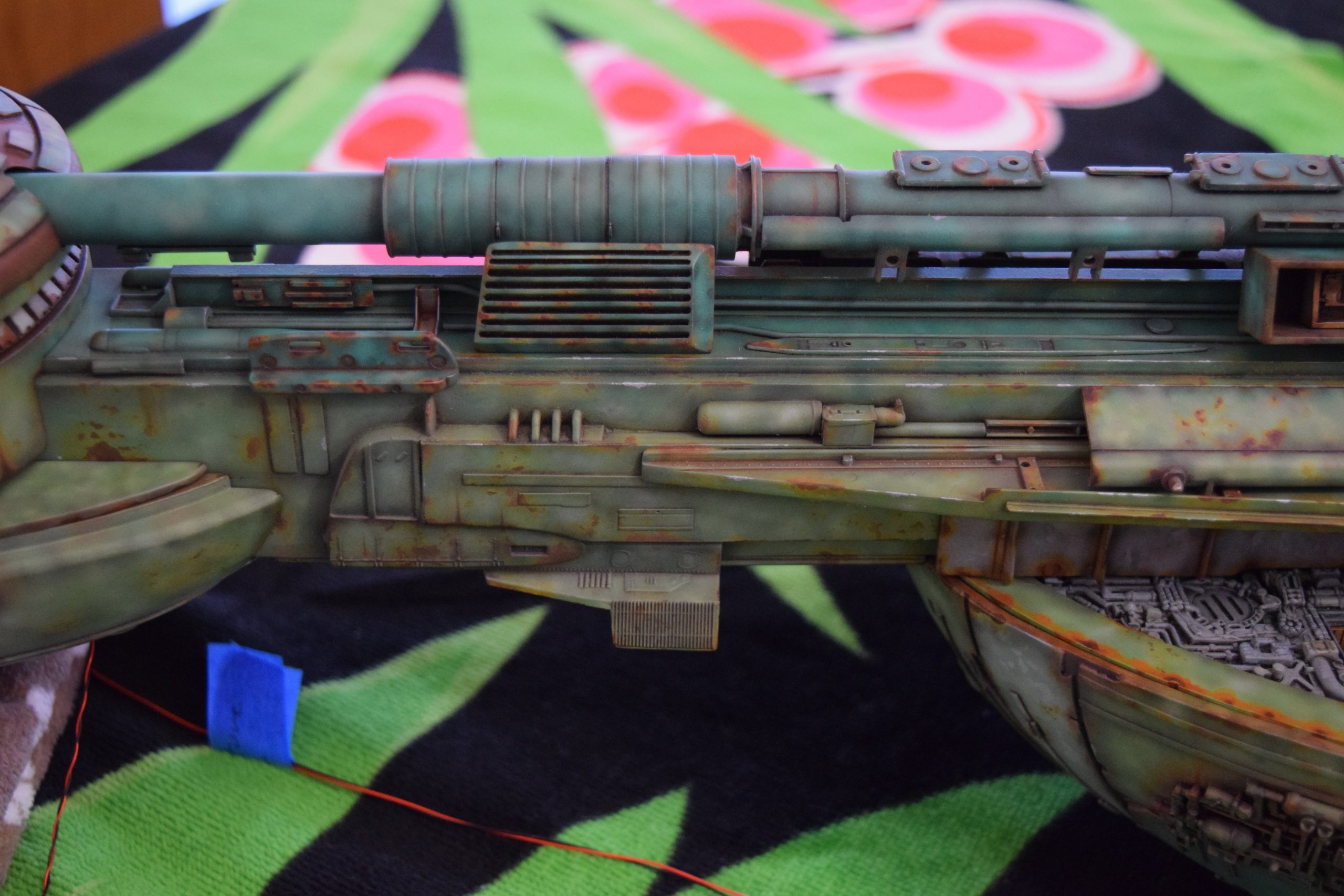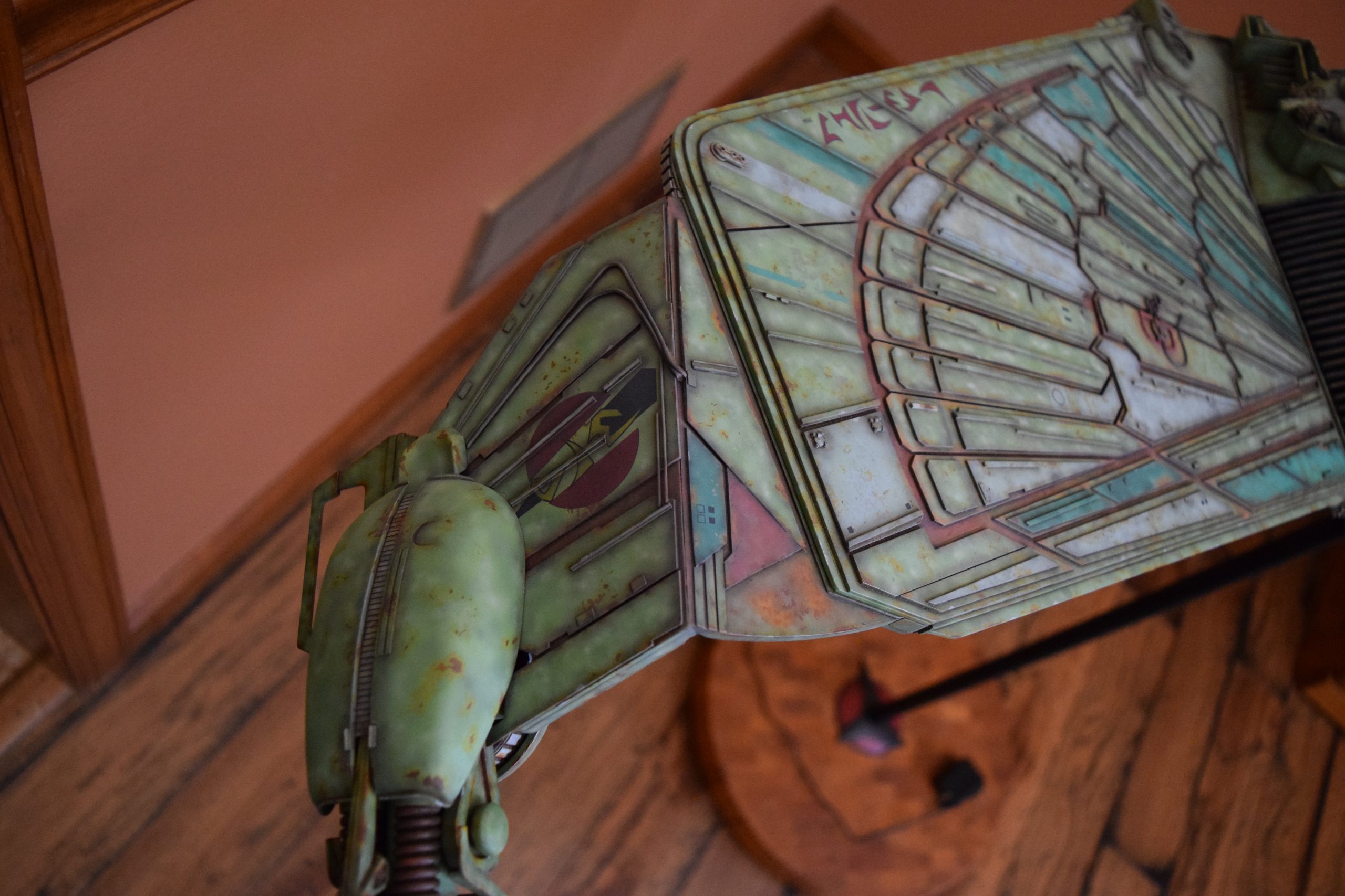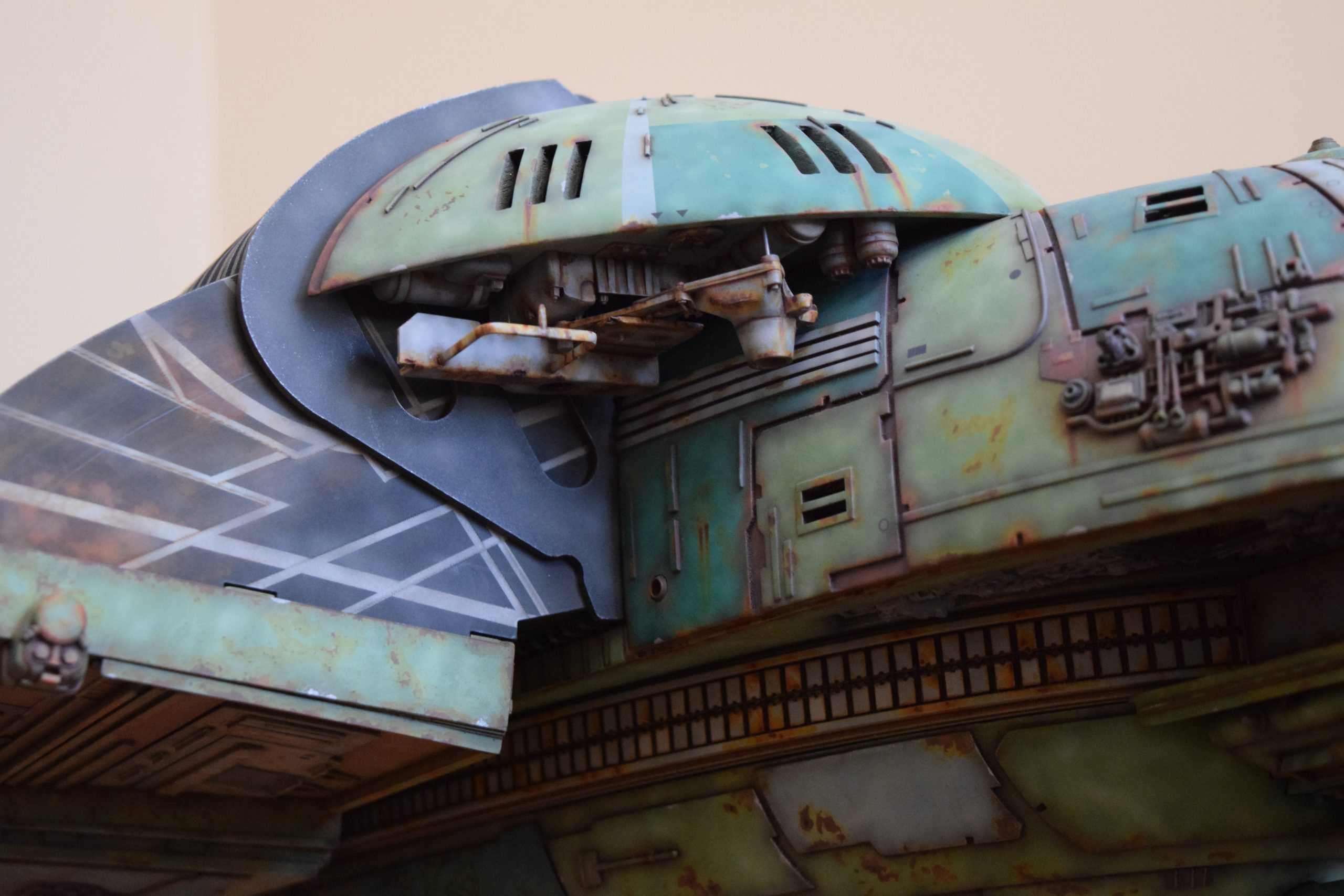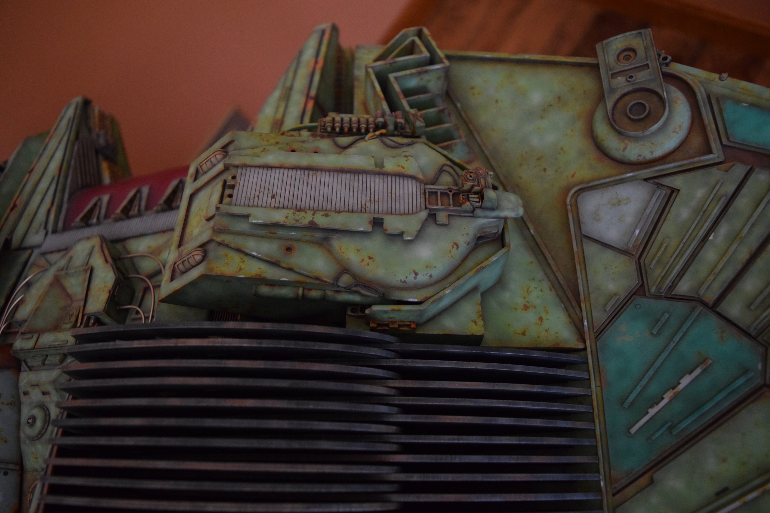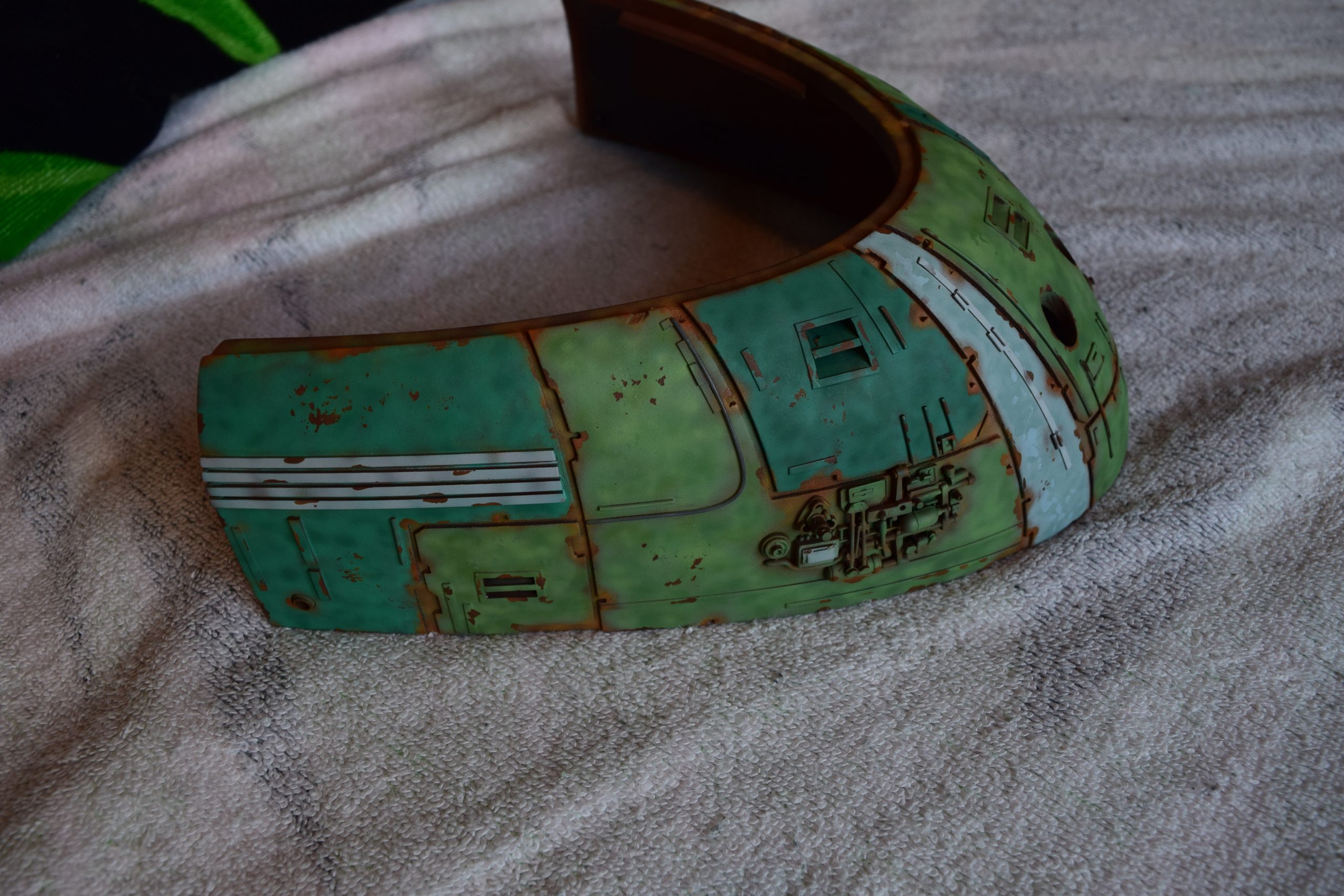 Then came painting of the primary BOP colors. For the colors, I studied many references and available pictures. I ended up using several Polly Scale, Model Masters, and Tamiya paint colors that I felt were a close match. I did some custom mixing of colors to create faded, shading, weathered finishes on the panels of the hull, head, wings, etc. I used a layered technique, as I like to think of a single color as having many shades / variations due to being worn / exposed to the elements, etc. For any given color (Pale Green – for example – involved layering as many as 3 to 5 variations for “texture”). For other visual interest / texture, I used the latex to create panels that have underlying colors of different hues. As an example: light gray – then latex – then darker grey – peel up latex to review light grey paint exposed from dark grey paint peeling off. bare metal chips were also included. For the larger areas of rust (wide “trenches” between areas of panels – or heavily rusted areas – I airbrushed the primary colors up to those areas – stopping short to keep the rusted areas prominent.