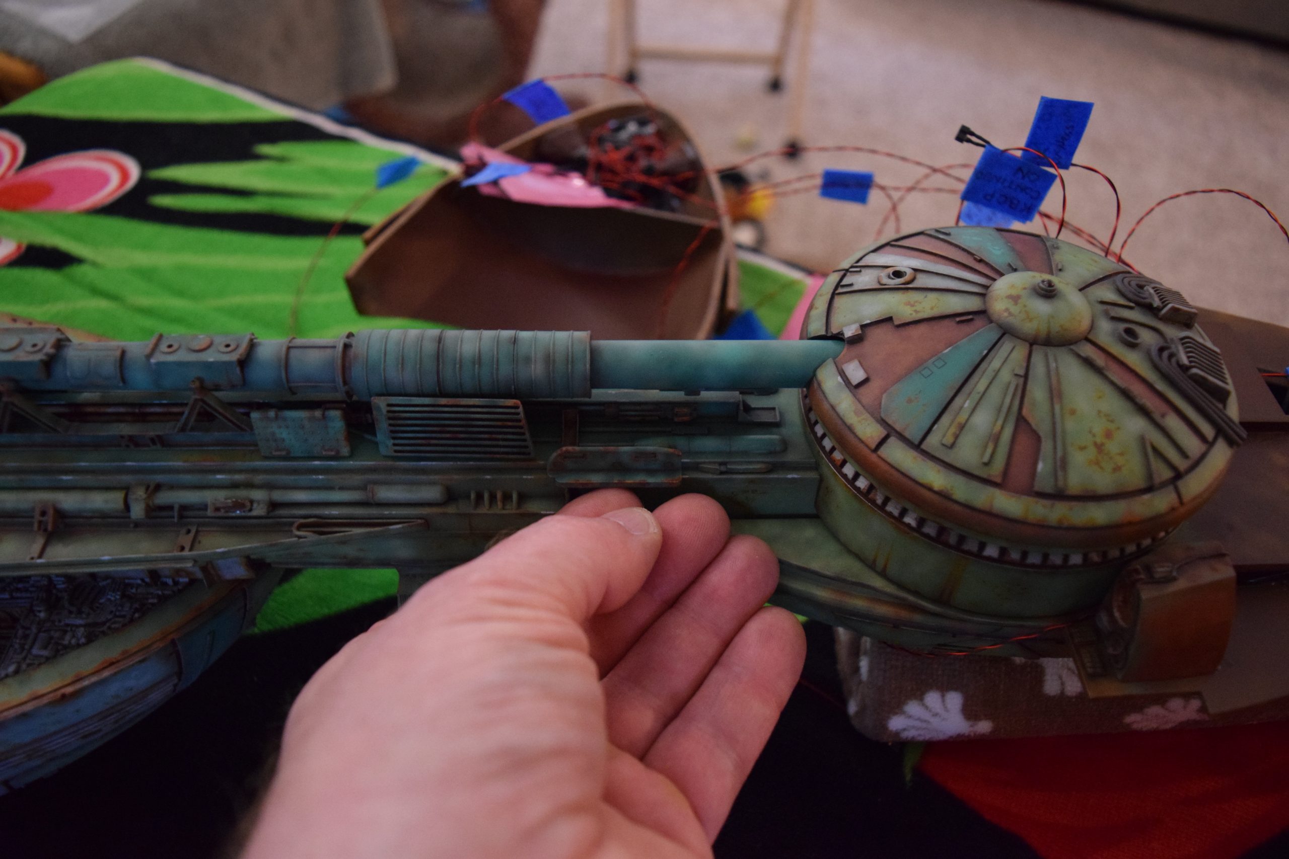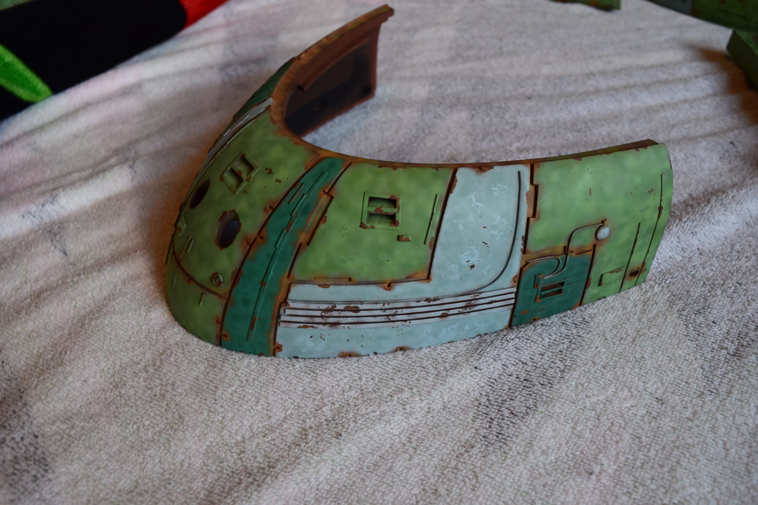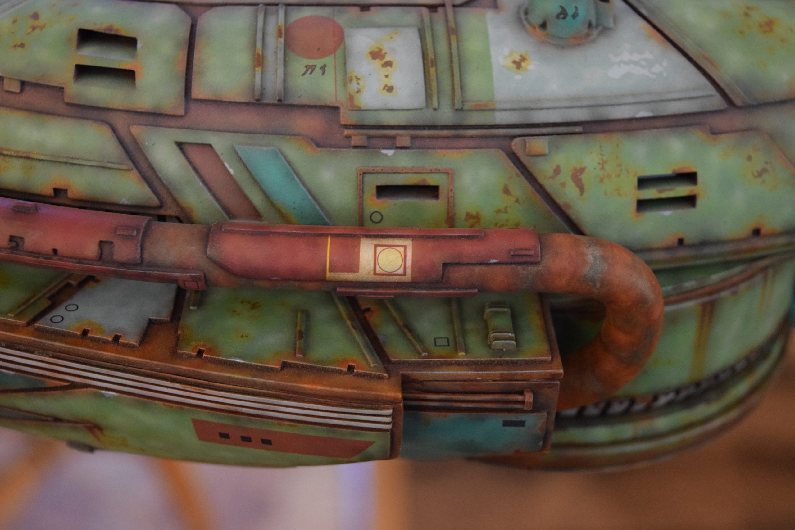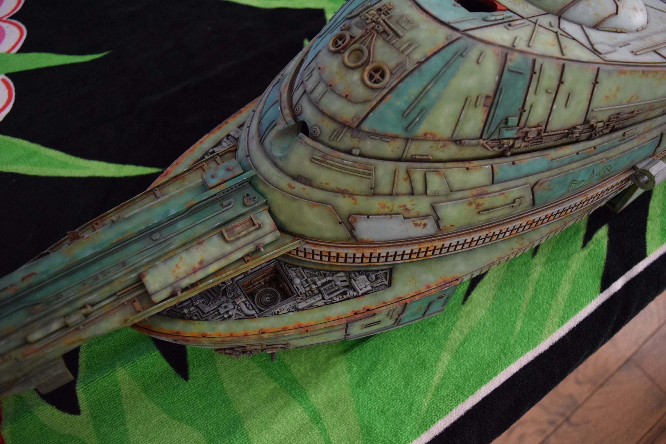 Then came painting of the primary BOP colors. For the colors, I studied many references and available pictures. I ended up using several Polly Scale, Model Masters, and Tamiya paint colors that I felt were a close match. I did some custom mixing of colors to create faded, shading, weathered finishes on the panels of the hull, head, wings, etc. I used a layered technique, as I like to think of a single color as having many shades / variations due to being worn / exposed to the elements, etc. For any given color (Pale Green – for example – involved layering as many as 3 to 5 variations for “texture”). For other visual interest / texture, I used the latex to create panels that have underlying colors of different hues. As an example: light gray – then latex – then darker grey – peel up latex to review light grey paint exposed from dark grey paint peeling off. bare metal chips were also included. For the larger areas of rust (wide “trenches” between areas of panels – or heavily rusted areas – I airbrushed the primary colors up to those areas – stopping short to keep the rusted areas prominent.