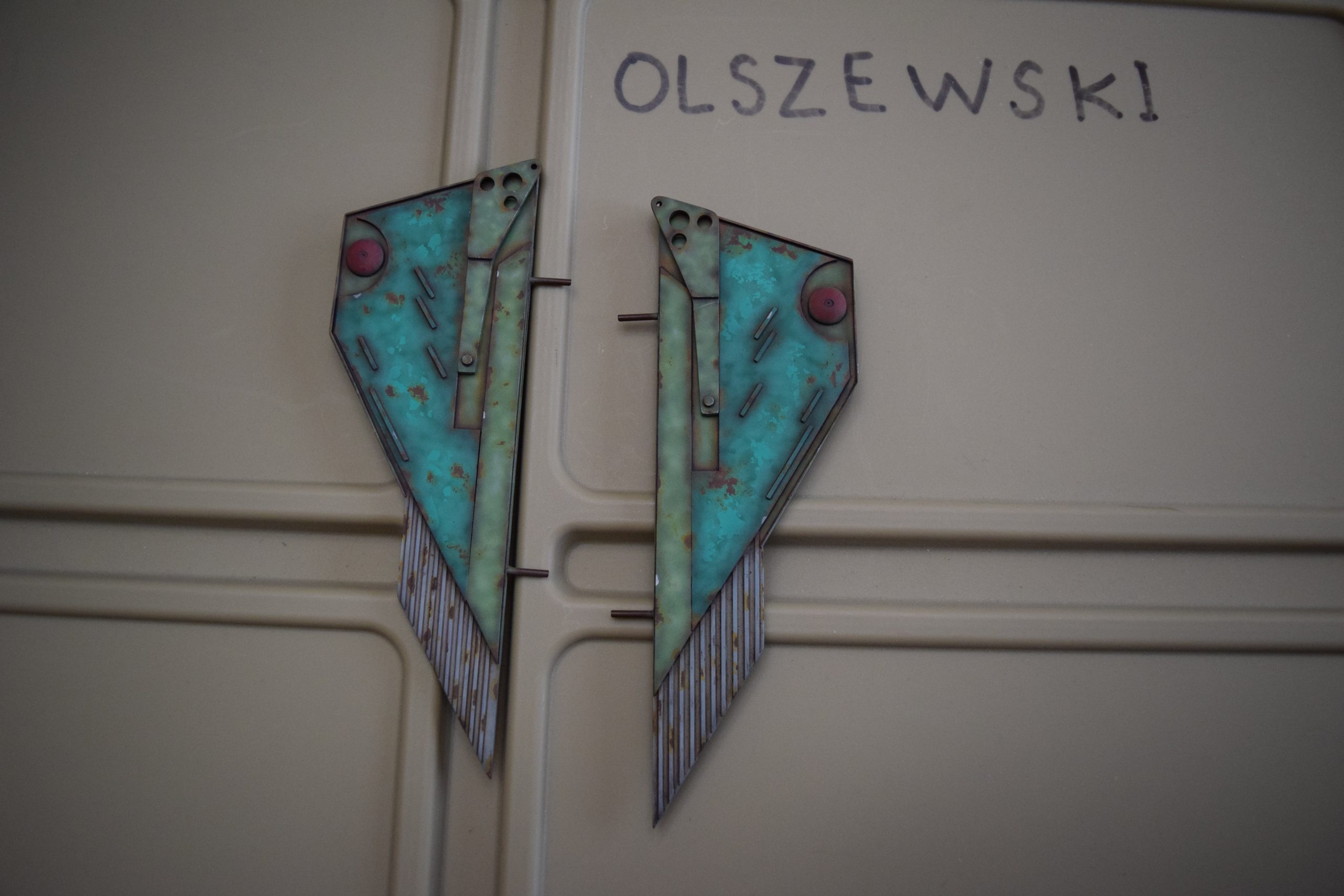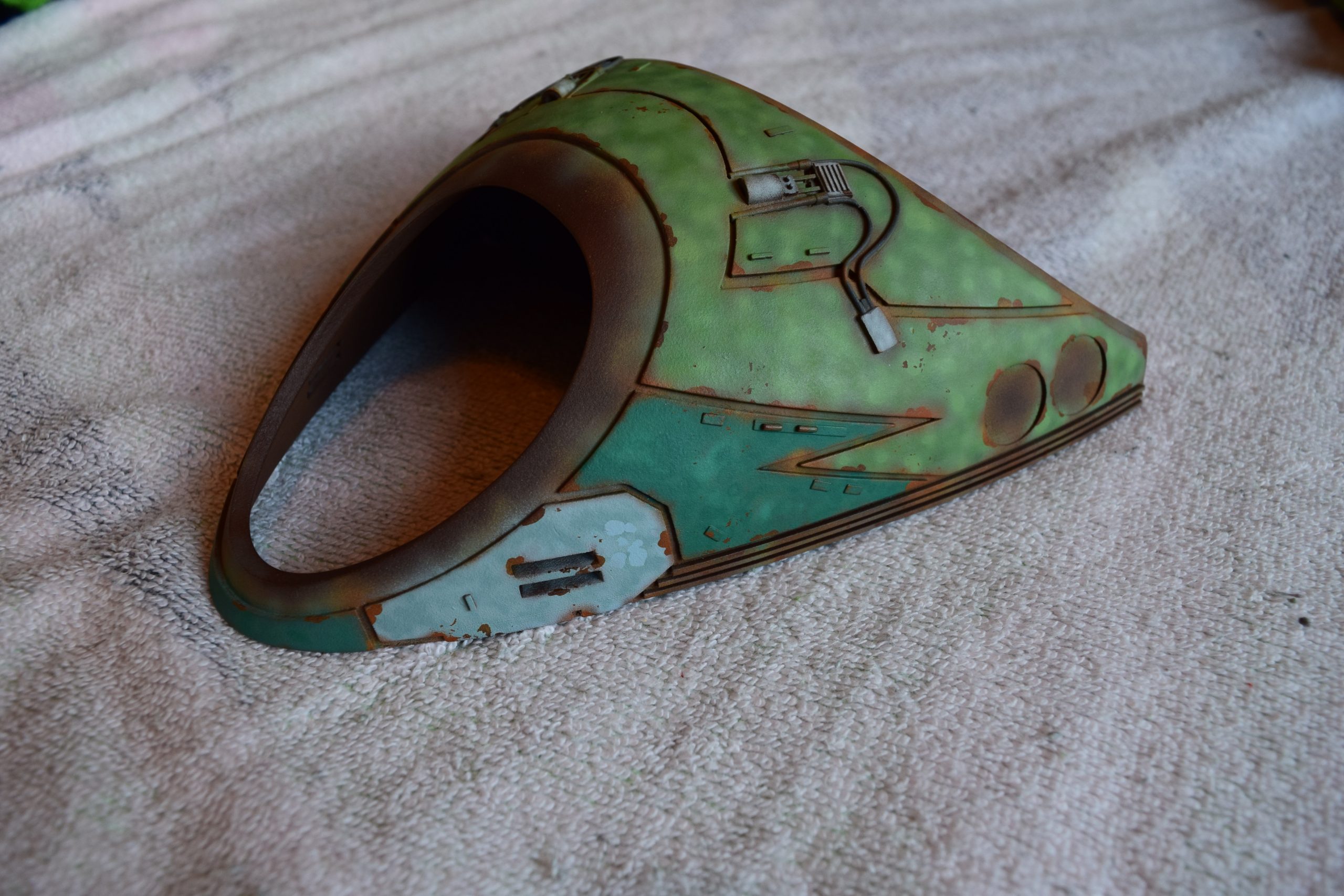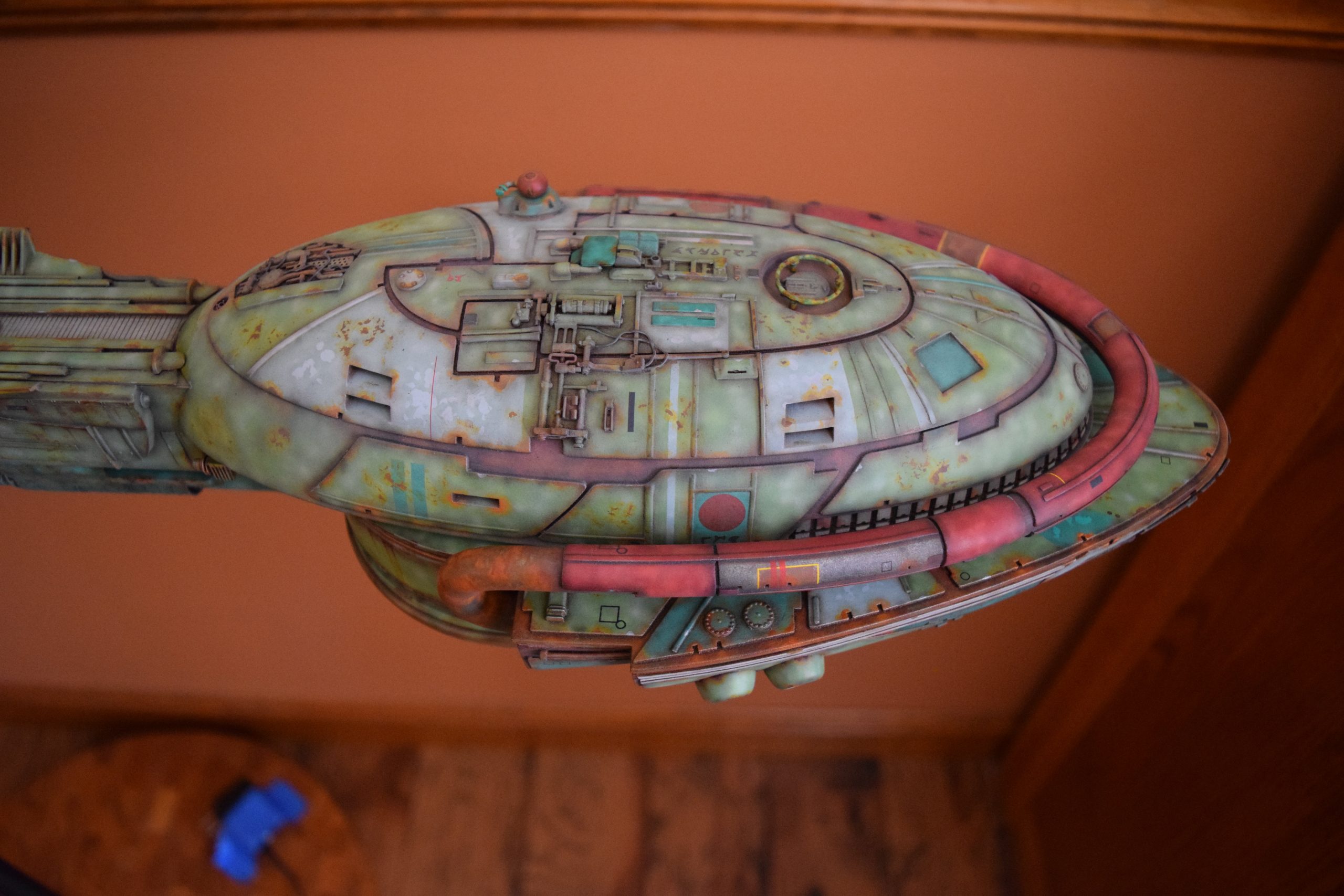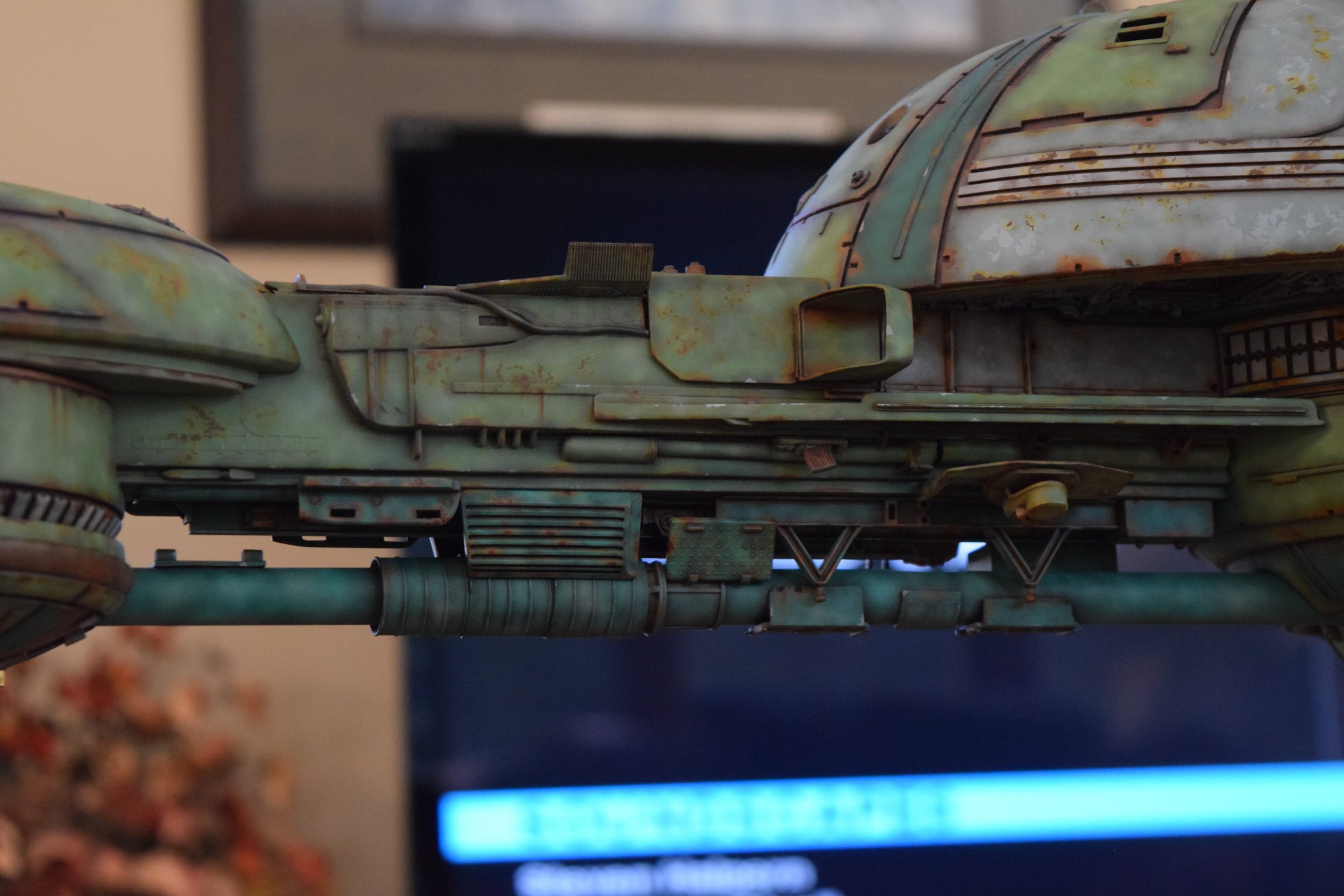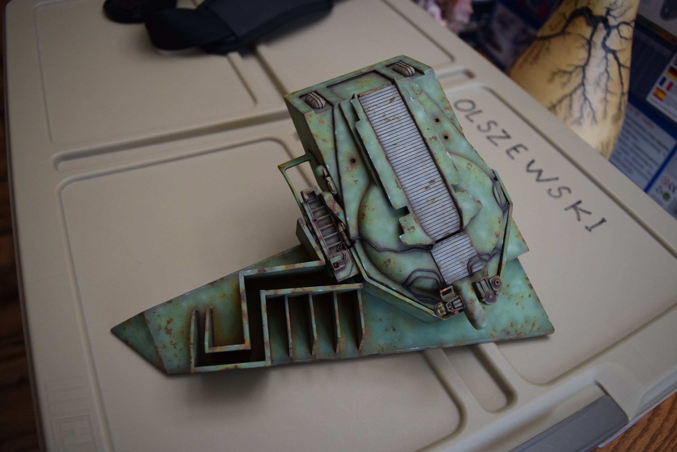 Then came painting of the primary BOP colors. For the colors, I studied many references and available pictures. I ended up using several Polly Scale, Model Masters, and Tamiya paint colors that I felt were a close match. I did some custom mixing of colors to create faded, shading, weathered finishes on the panels of the hull, head, wings, etc. I used a layered technique, as I like to think of a single color as having many shades / variations due to being worn / exposed to the elements, etc. For any given color (Pale Green – for example – involved layering as many as 3 to 5 variations for “texture”). For other visual interest / texture, I used the latex to create panels that have underlying colors of different hues. As an example: light gray – then latex – then darker grey – peel up latex to review light grey paint exposed from dark grey paint peeling off. bare metal chips were also included. For the larger areas of rust (wide “trenches” between areas of panels – or heavily rusted areas – I airbrushed the primary colors up to those areas – stopping short to keep the rusted areas prominent.