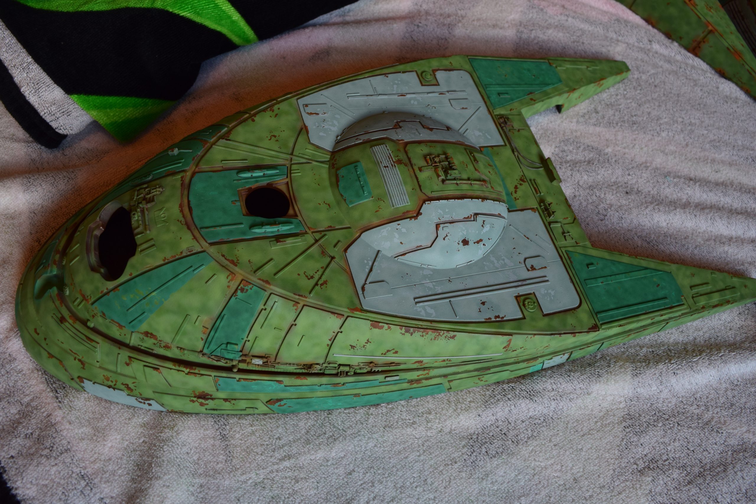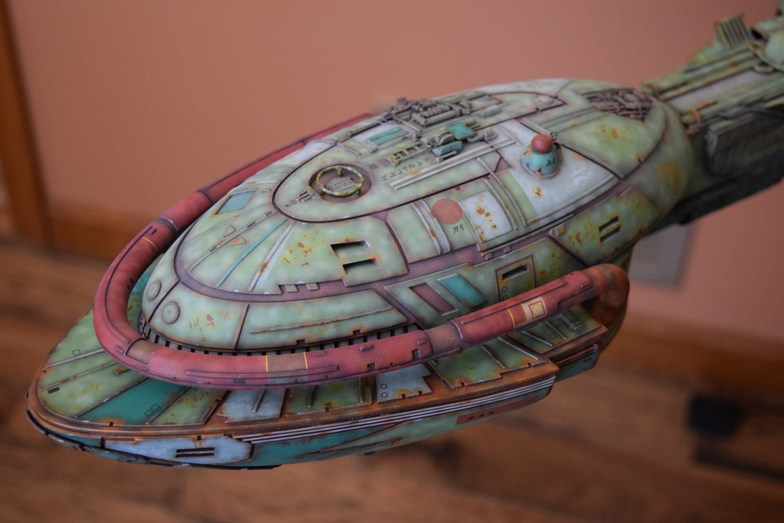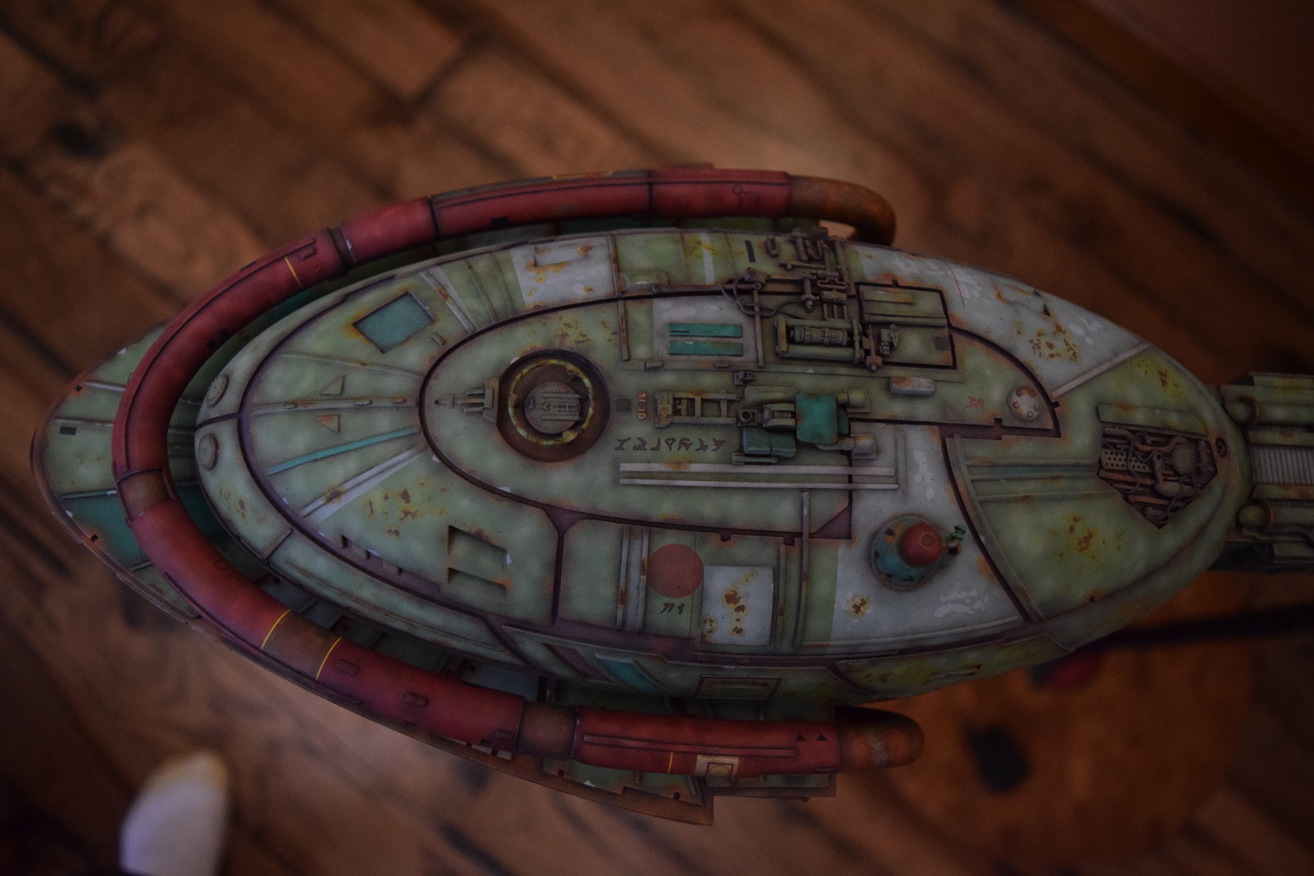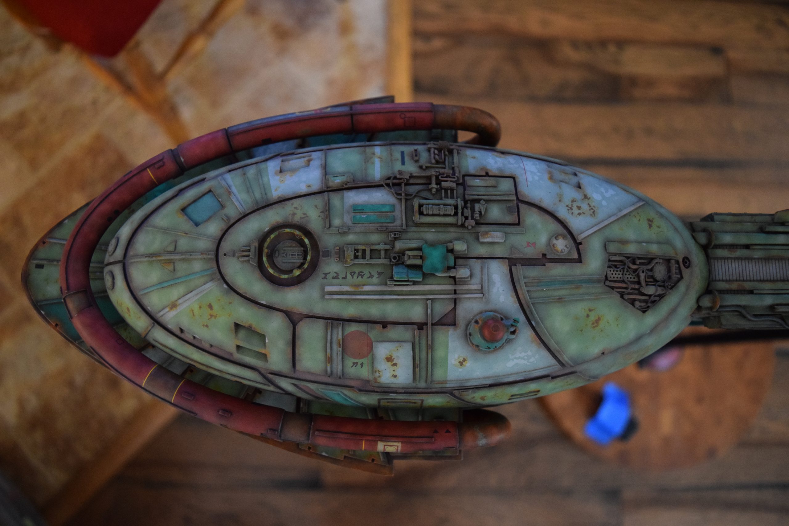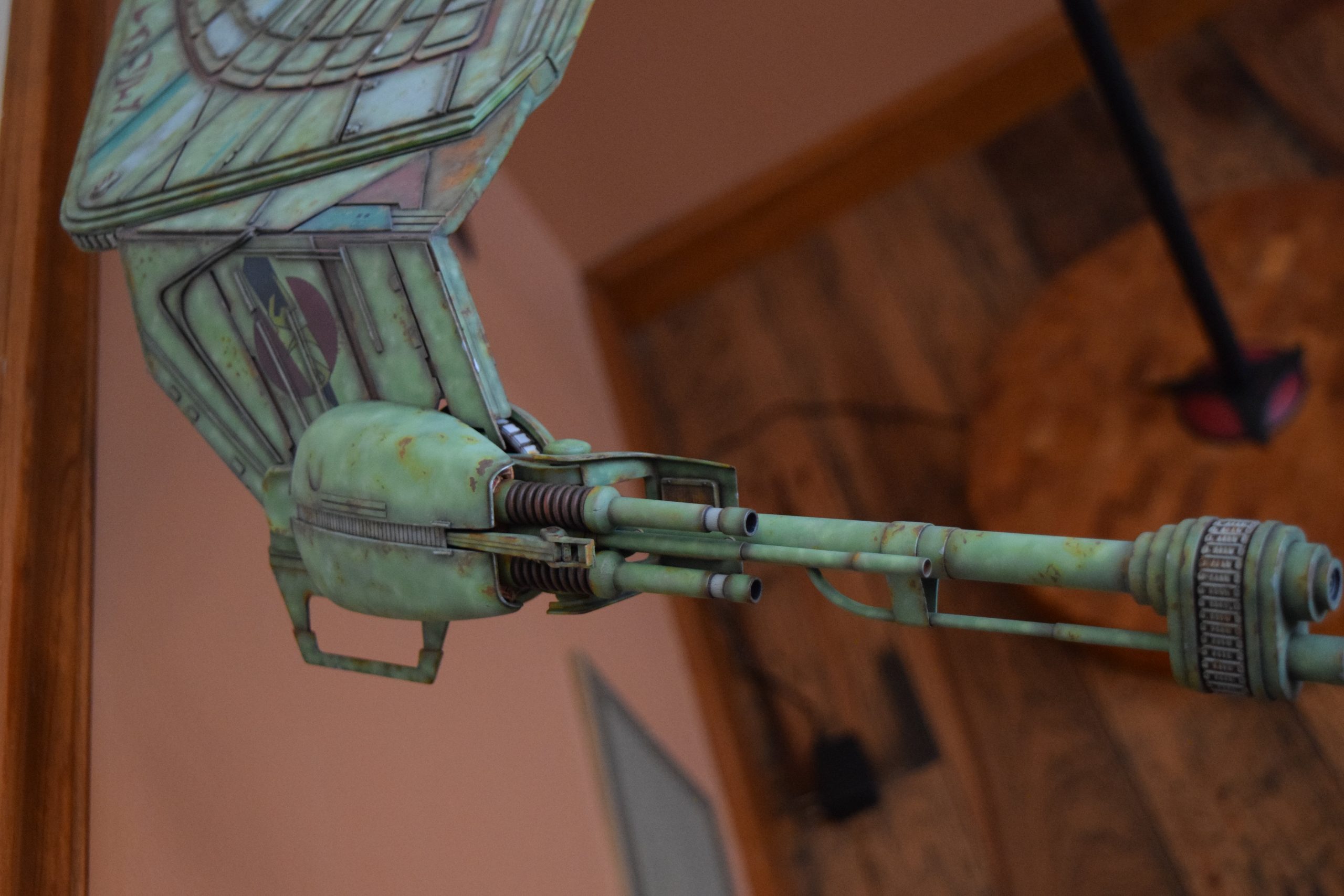After all parts had all the primary colors (layers of colors), light green, dark green, grey, red, etc., I sprayed all parts with future clear coat (acrylic) to project the paint finish for the additional weathering steps to come. Before weathering, I applied the kit decals, and supplemented this with some additional decals (Klingon markings). I sealed the decals with future clear coat.