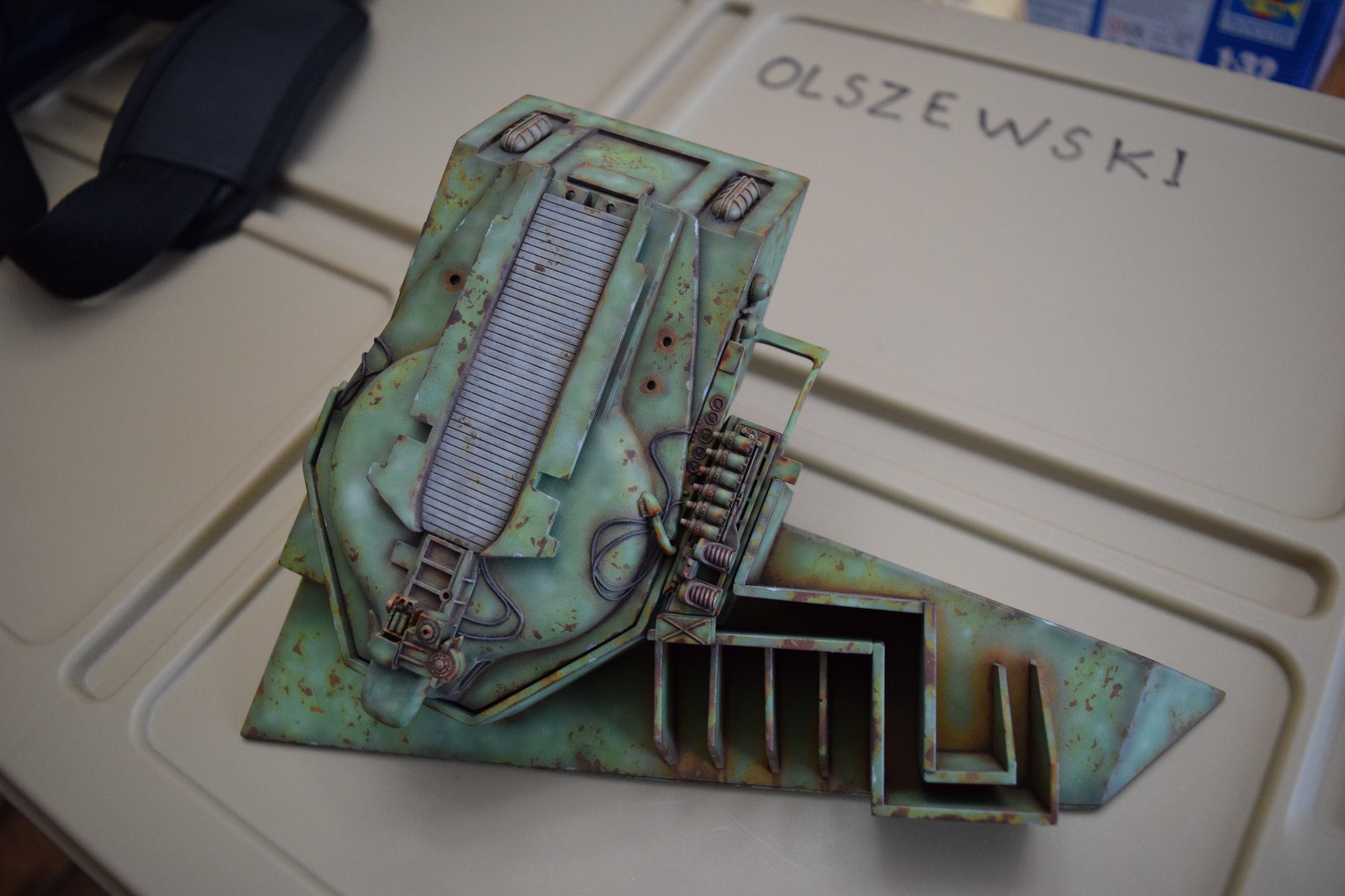 Additional weathering involved: More rust application using LifeColor rust pigments / filters (5 different rust colors – blending) in all of the areas with exposed rust, some AK “crusted rust” (3 different rust colors – again blended) – in very select areas. dry-brushing various lighter shades of select colors – and metallics – for worn panel edges, etc. Oil washes / pigment washes to bring depth to panel lines, edges, hardware areas, etc. Outlining panels with “smoke” filter to “dirty up” panels and hardware areas, etc. The final step in the finish was to apply the clear flat (matte) coat to dull down the weathered finish on all of the parts / sub-assemblies.
