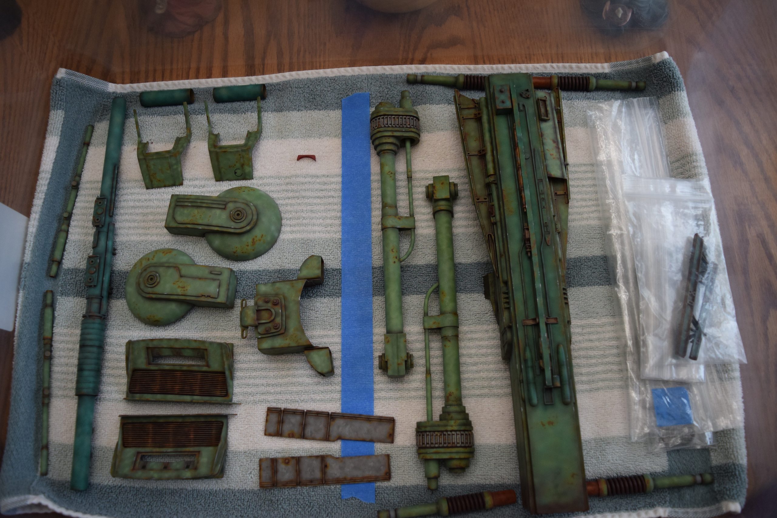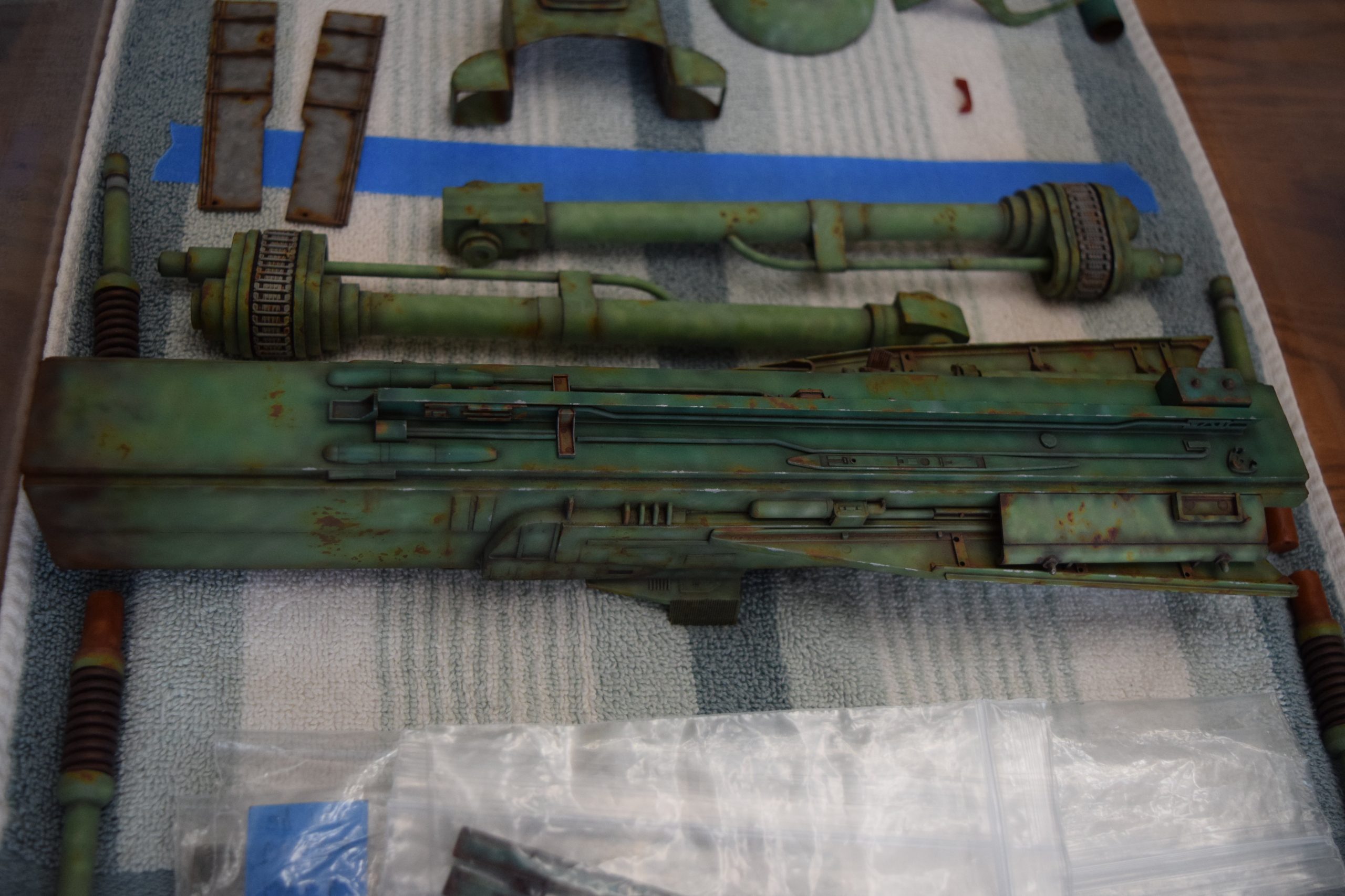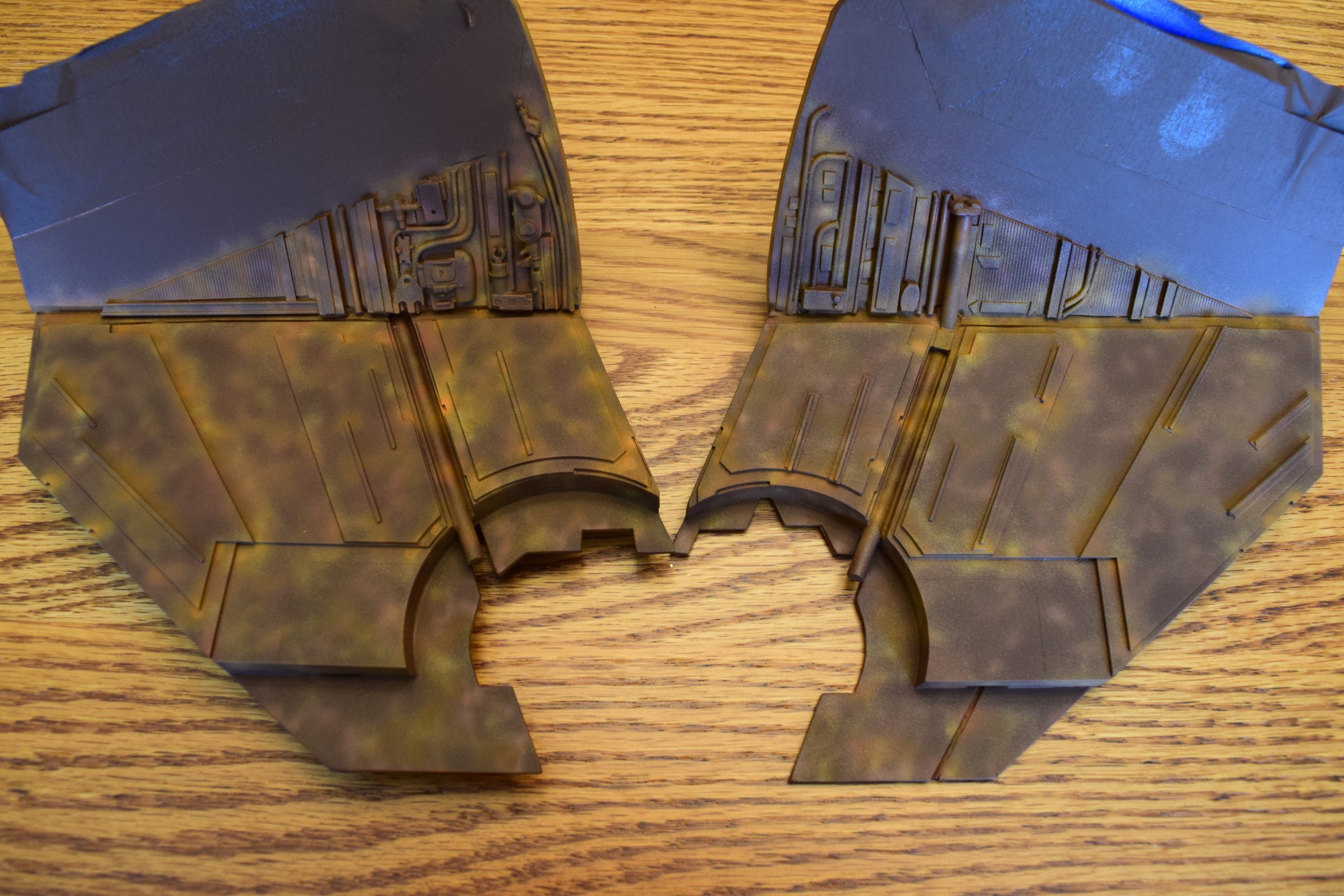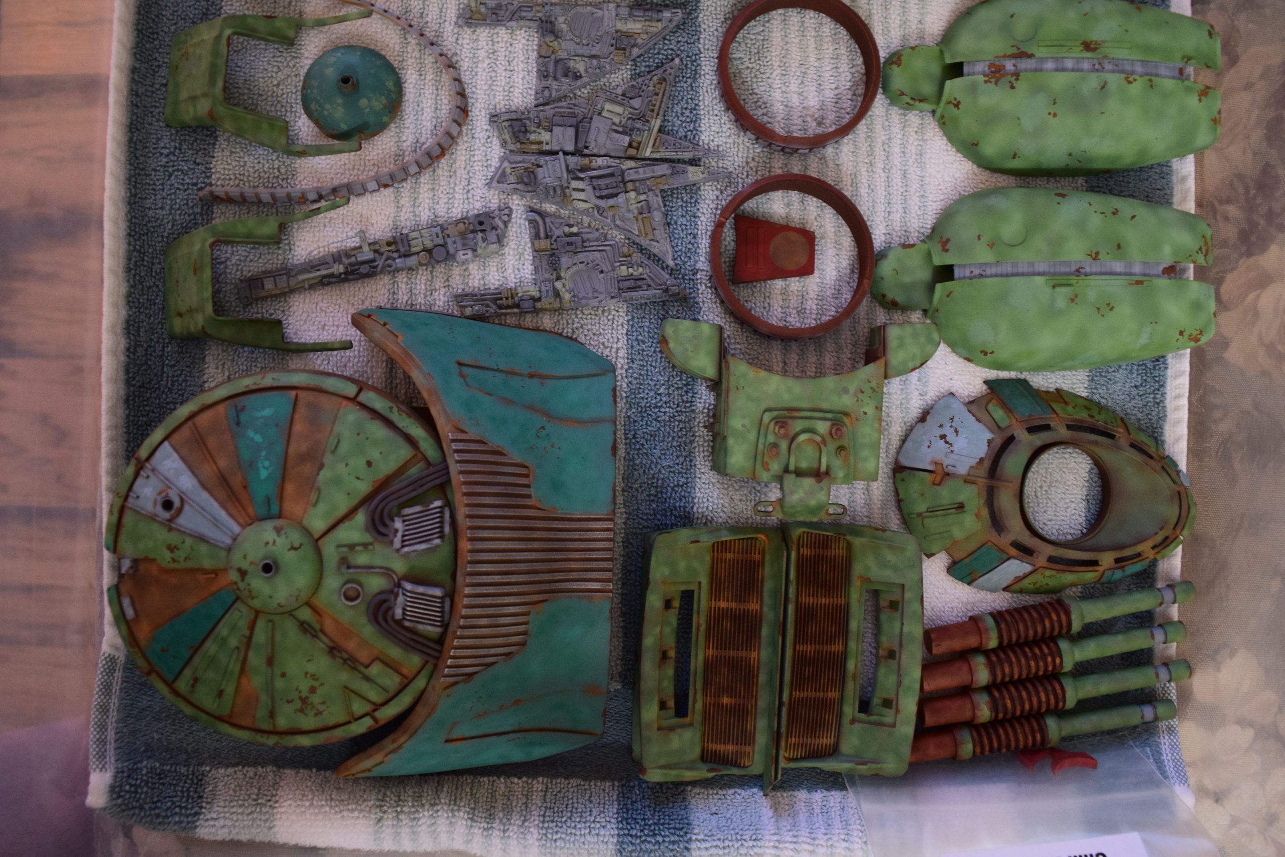 Next came the rust primer. For this, I used enamels (5 different shades of tan to red-brown rust) and applied this to all of the parts. I wanted to use enamels, as I planned to use latex for paint chips that rusted – and I planned to use acrylic paints for the finished BOP colors. Once the rust primer colors were applied, I applied latex on panel corners and select areas that would be prone to paint chipping.