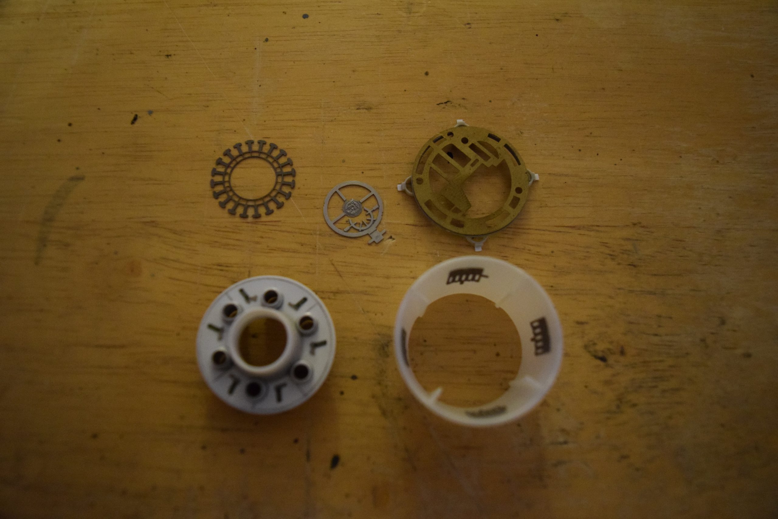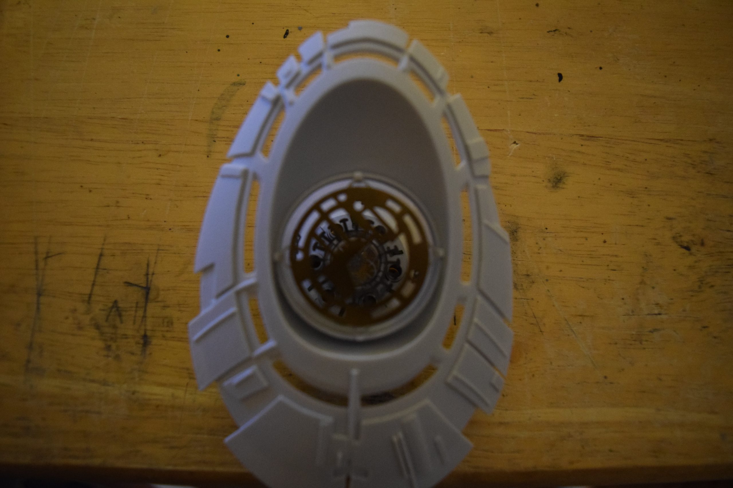 I built sub-assemblies prior to painting and weathering. I pillaged my spare parts “greeblies” to add details (supplementing kit detail parts) on the head, main hull, and underside of the wings, etc. I used available references to identify locations for kit detail placement. I did some add-libbing of additional details in selected areas that I liked (I’m not exactly a “stickler” to attempt duplicating exactly what the movie model had). To that end, I did fabricate a structure for the photon torpedo “port” in the lower part of the head. this would not only house the lighting effect for the photon torpedo, it also included some additional photo-etch details (from the spare parts bin) behind the kit supplied photo-etch photon torpedo emitter plate – to give this area some depth. Also, I scratch built / detailed recesses for the ventral impulse engines in the underside of the main hull. Finally, I used magnets to enable certain parts (wing hinge blocks, winglets, wing-tip gun pod covers, wing “generators”) to have the ability to be removed / installed easily – to allow the model to be transportable. Plus this helps when positioning the wings in either cruise or attack modes – to make access to the hinges easier.