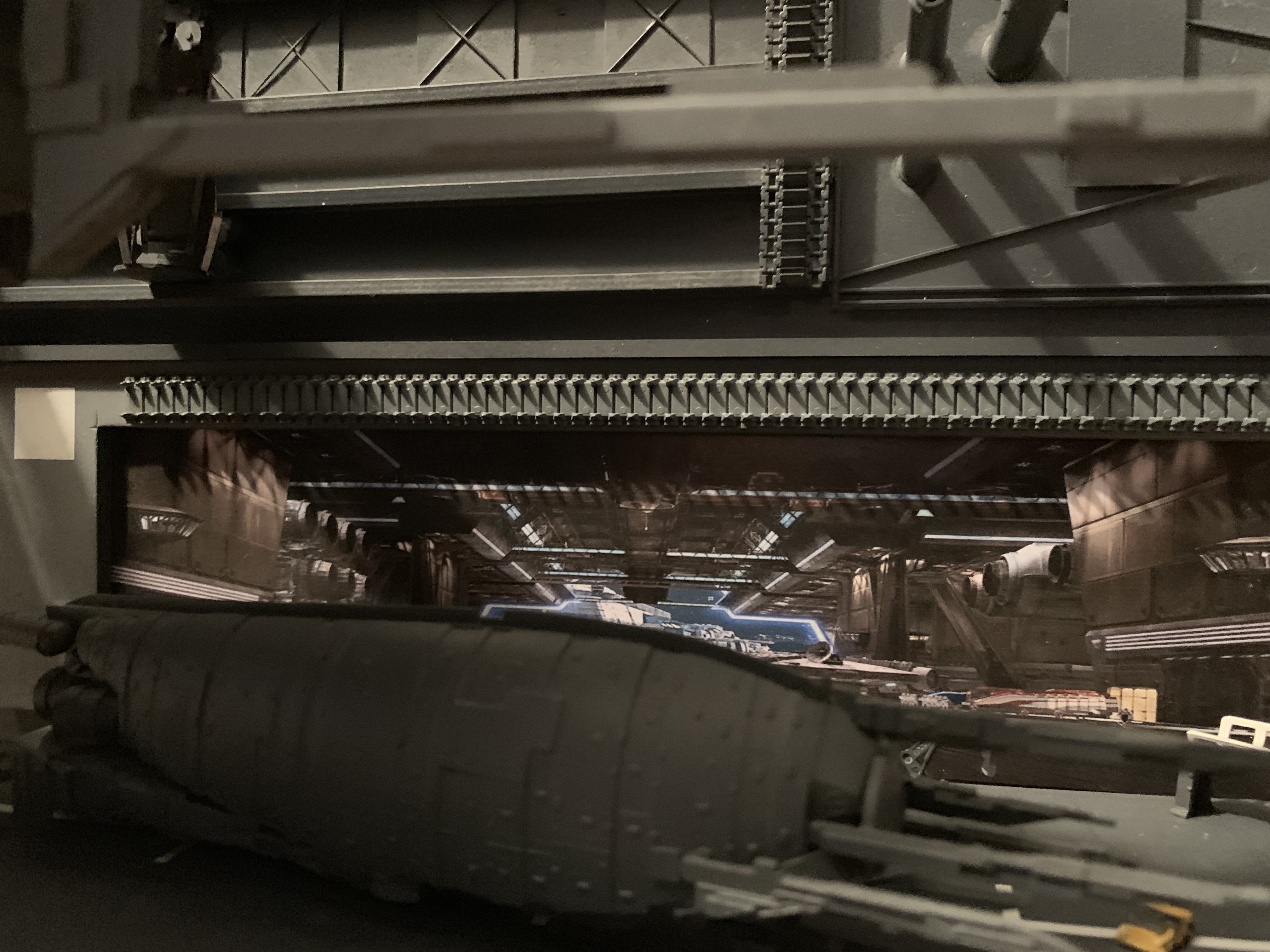 In this diorama, we see the Conestoga docked at Generosity Station. There are hard contacts at both the engineering end, via a massive service arm, and at a couple of the cargo doors forward on the port side. The service arms conceal the support rods that hold the Conestoga in place. The smaller armed and armored cargo ship sits on the external landing pad. This was kit-bashed from a Halcyon Sulaco kit and an MPC Star Wars Rebel Transport from the Rebel Base kit.