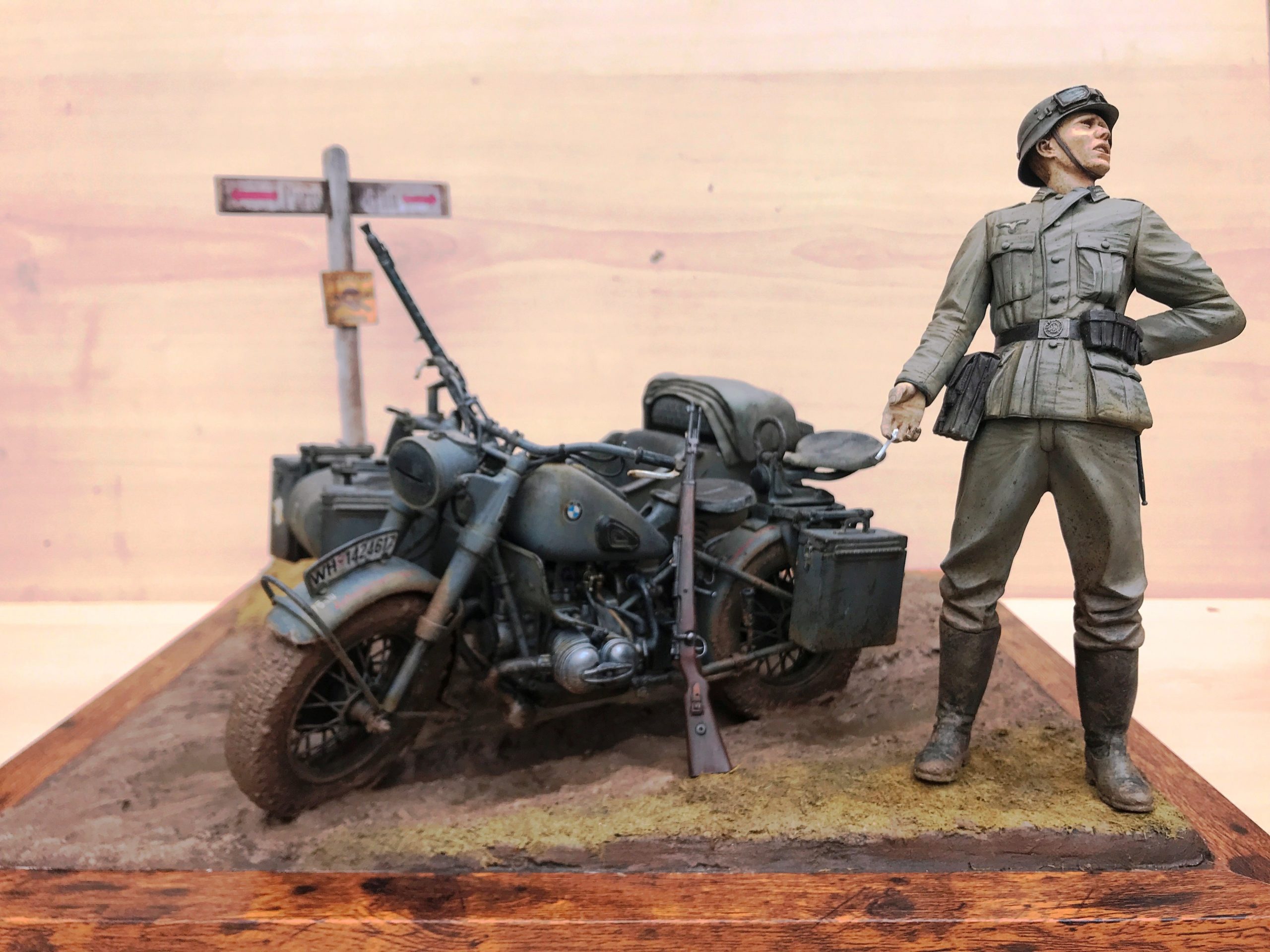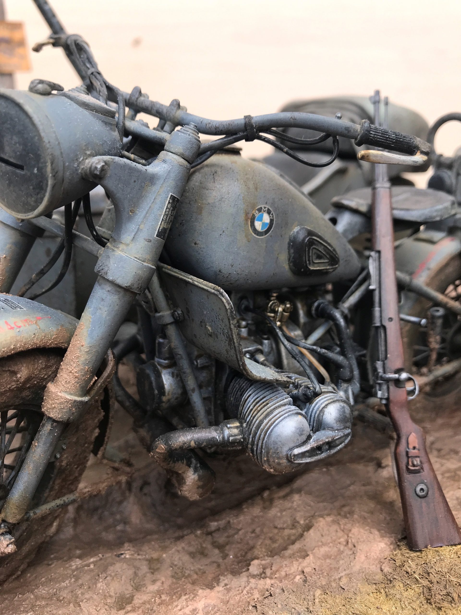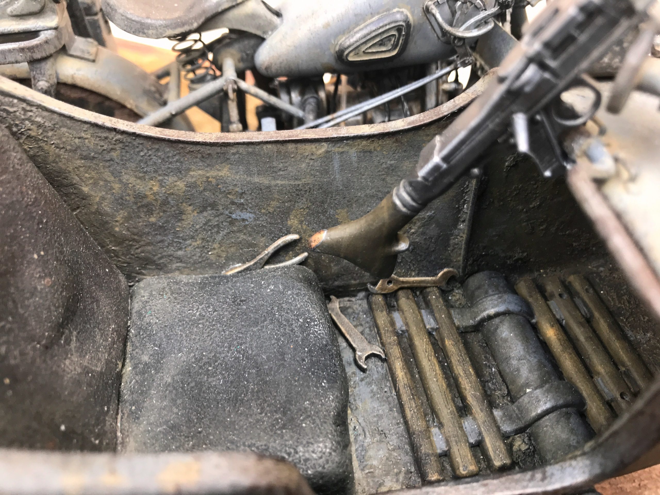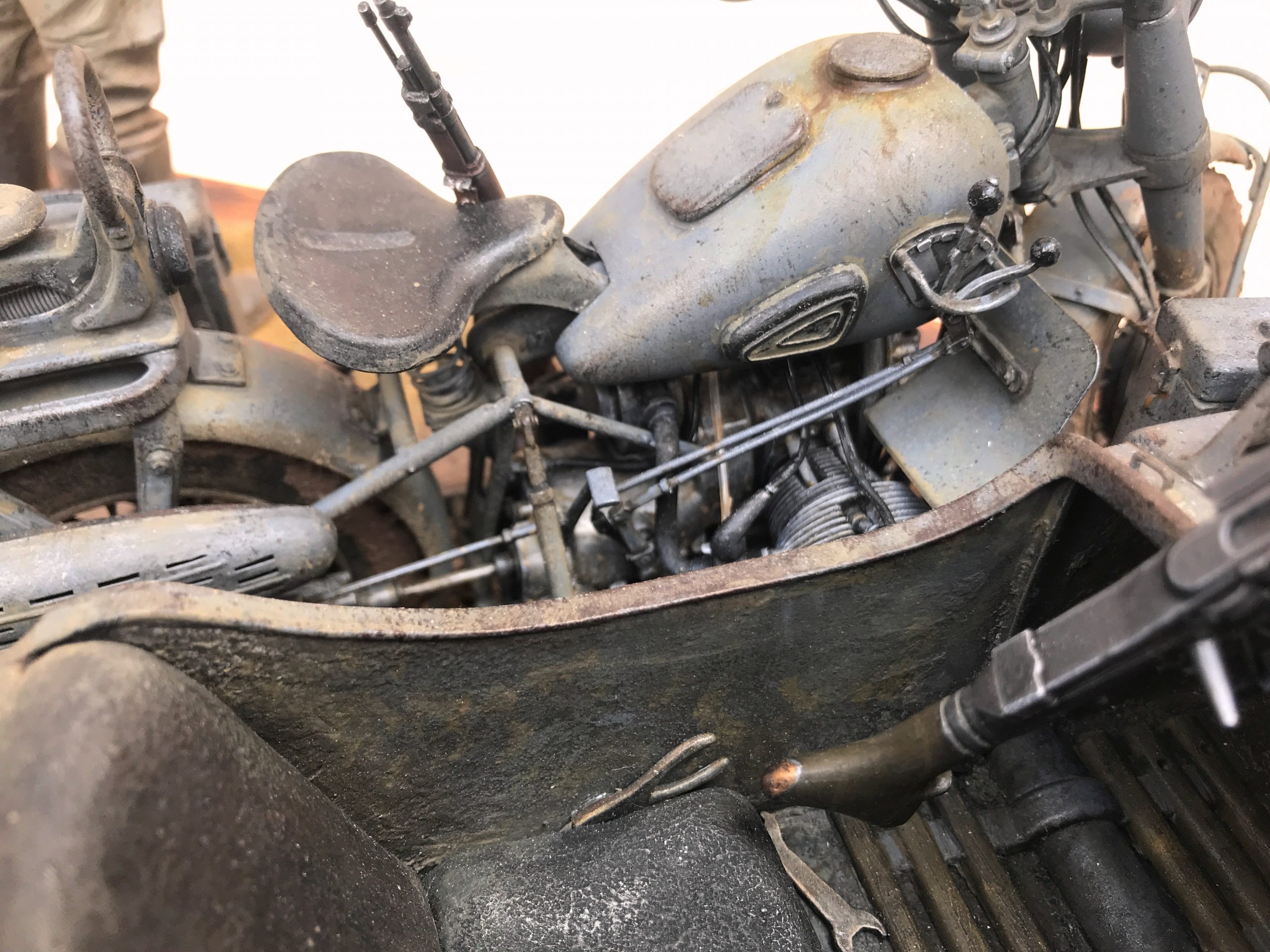 The bike and sidecar is the Italeri 1/9th scale BMW, the figure is from an English company Reedees Miniatures. The BMW is not a great kit, there’s a huge amount of cleaning up to do and gaps that need careful filling but once done it’s good, with plenty of detail.