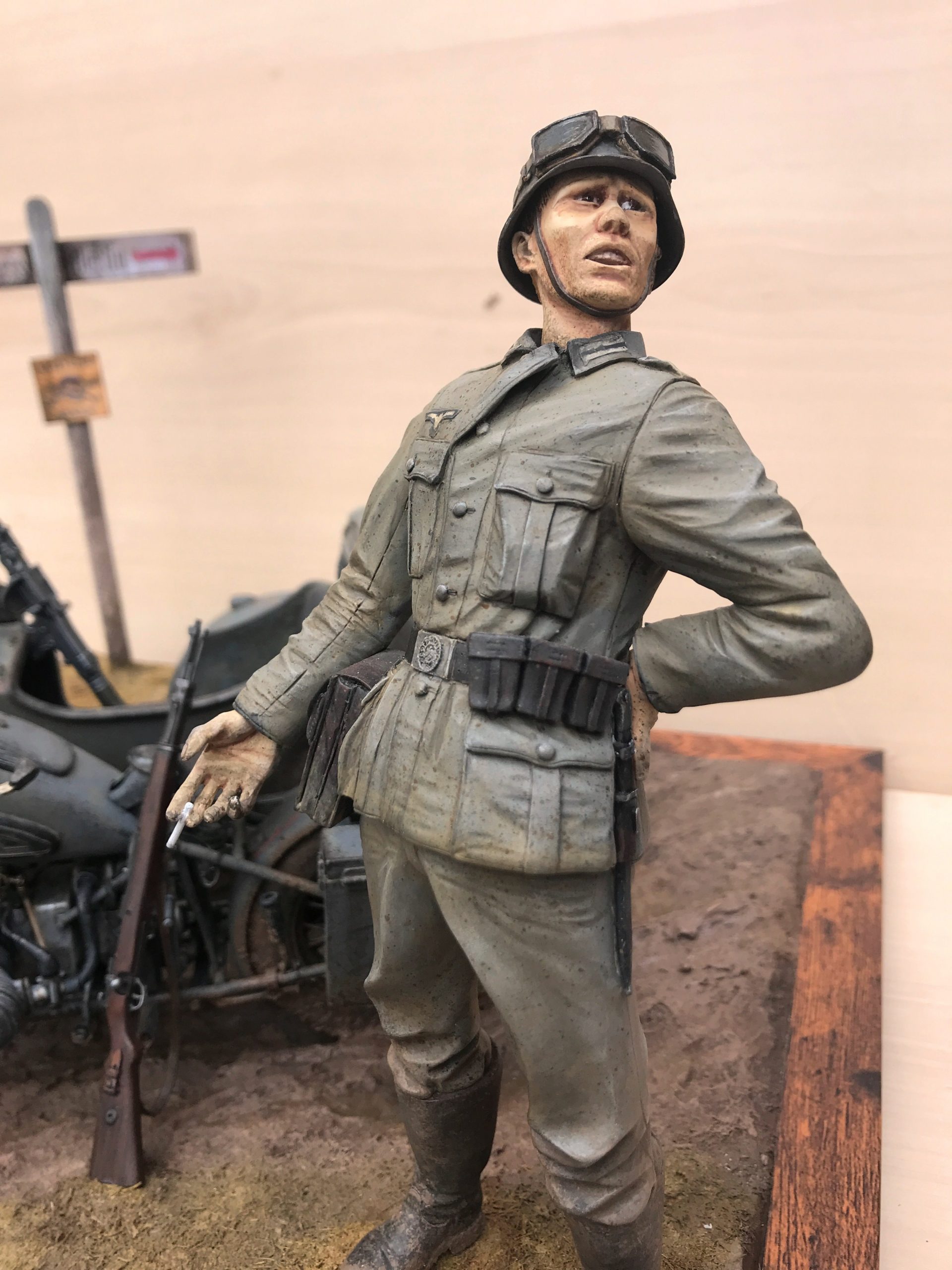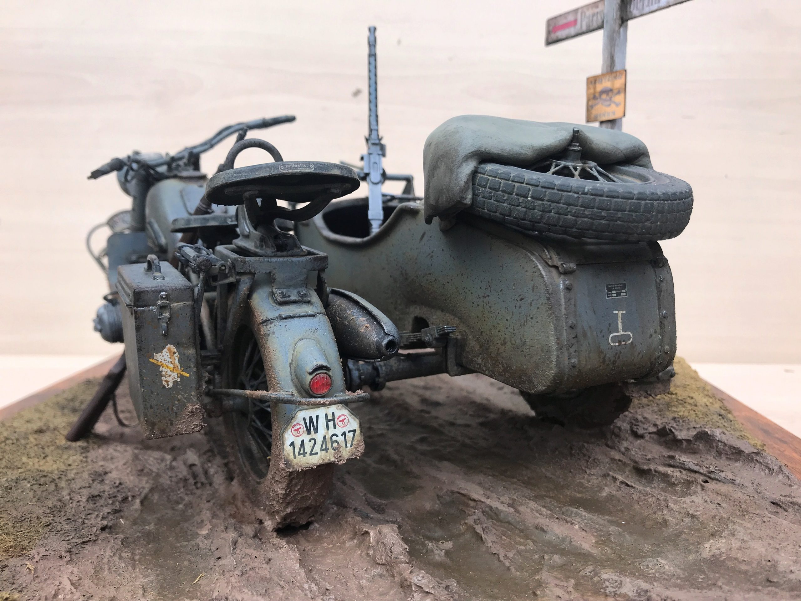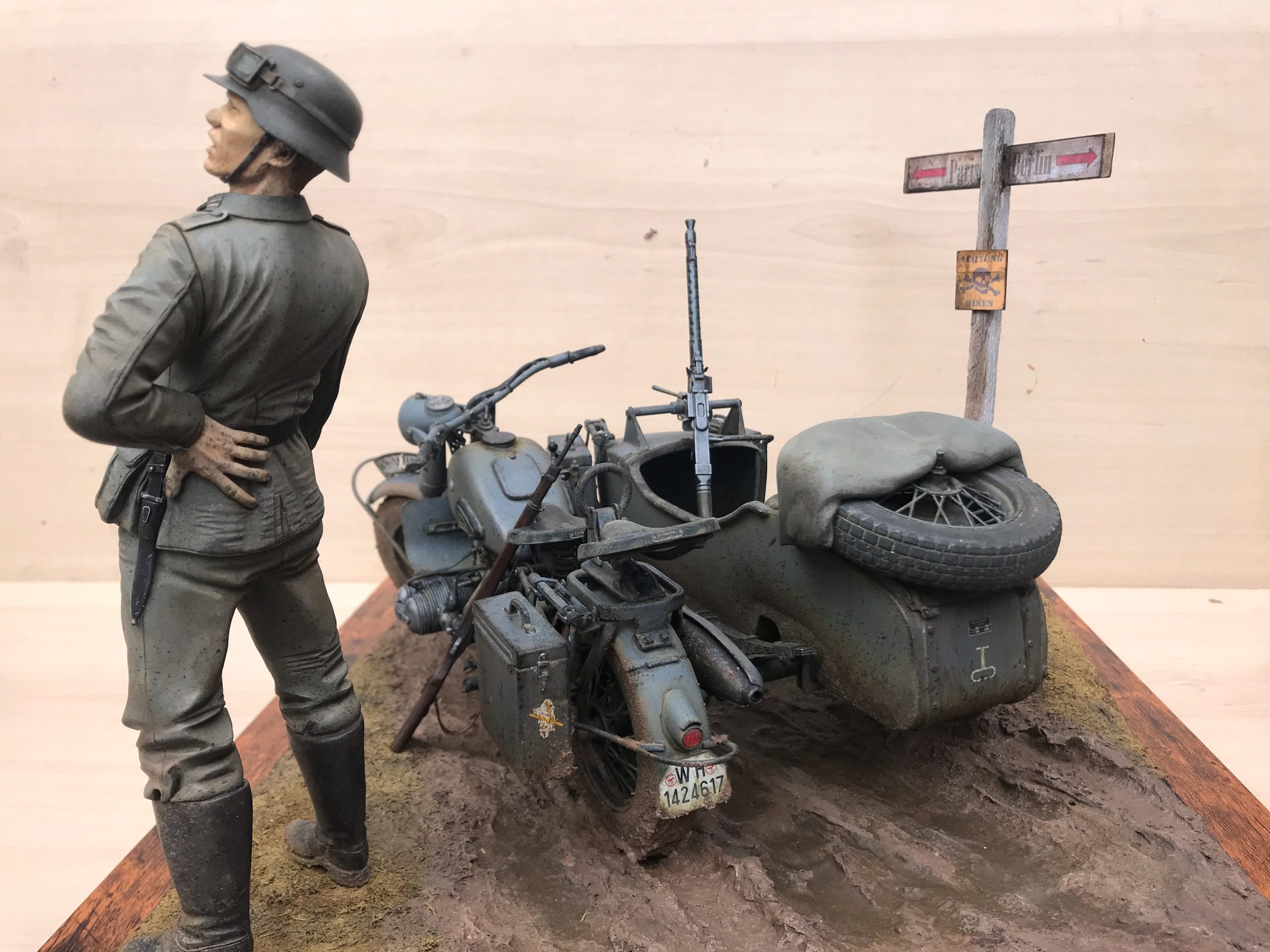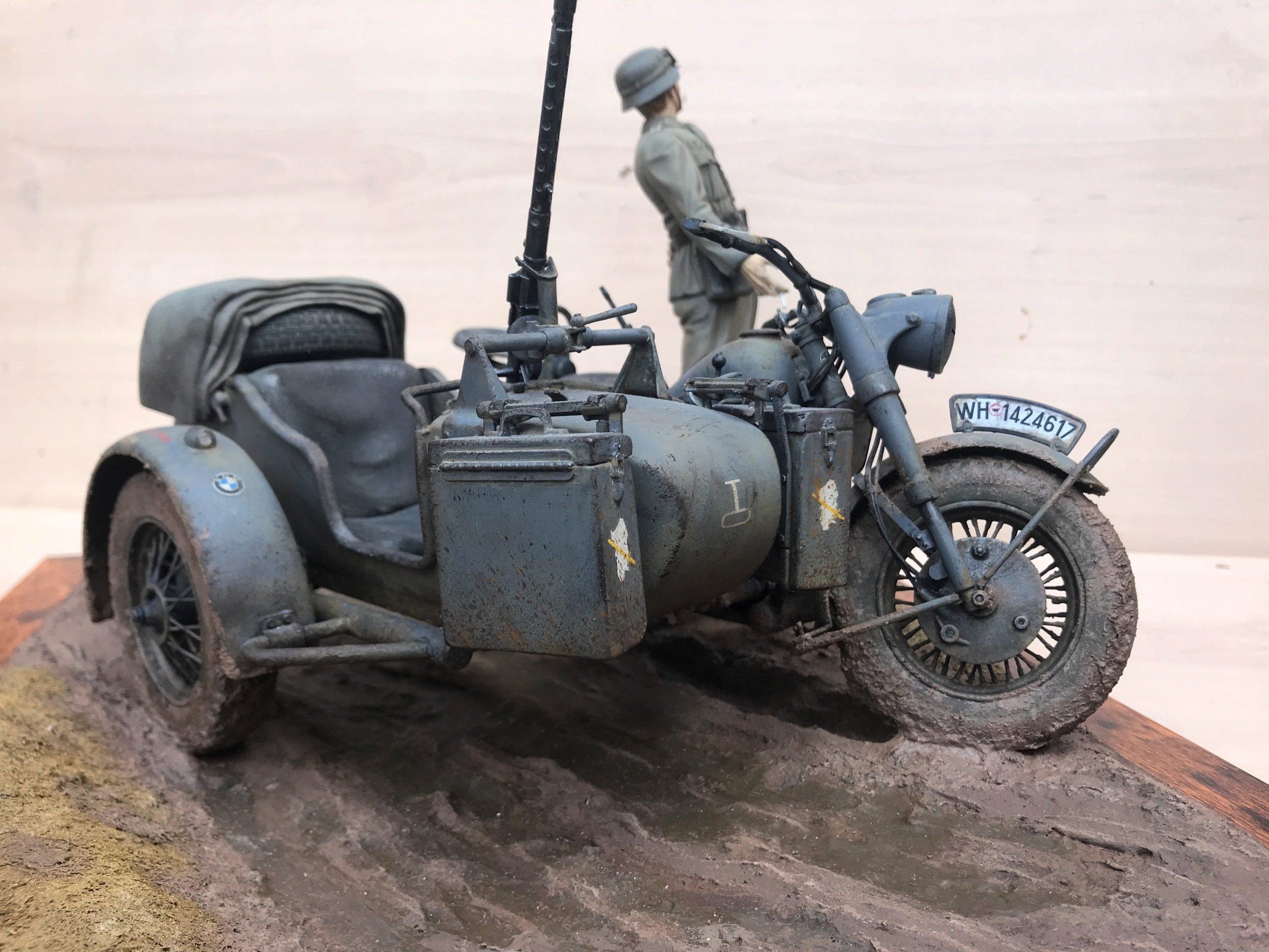 The bike and sidecar is the Italeri 1/9th scale BMW, the figure is from an English company Reedees Miniatures. The BMW is not a great kit, there’s a huge amount of cleaning up to do and gaps that need careful filling but once done it’s good, with plenty of detail.